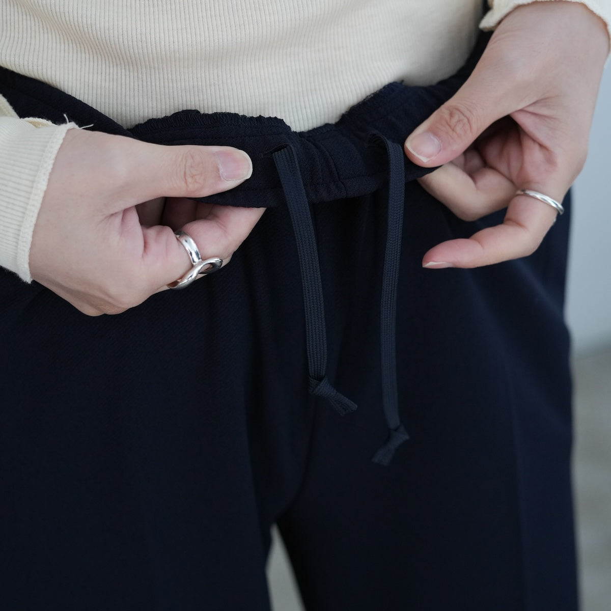 リラックス感のある穿き心地に、センタークリースで美しさを添えたセミフレアギャザーパンツです。