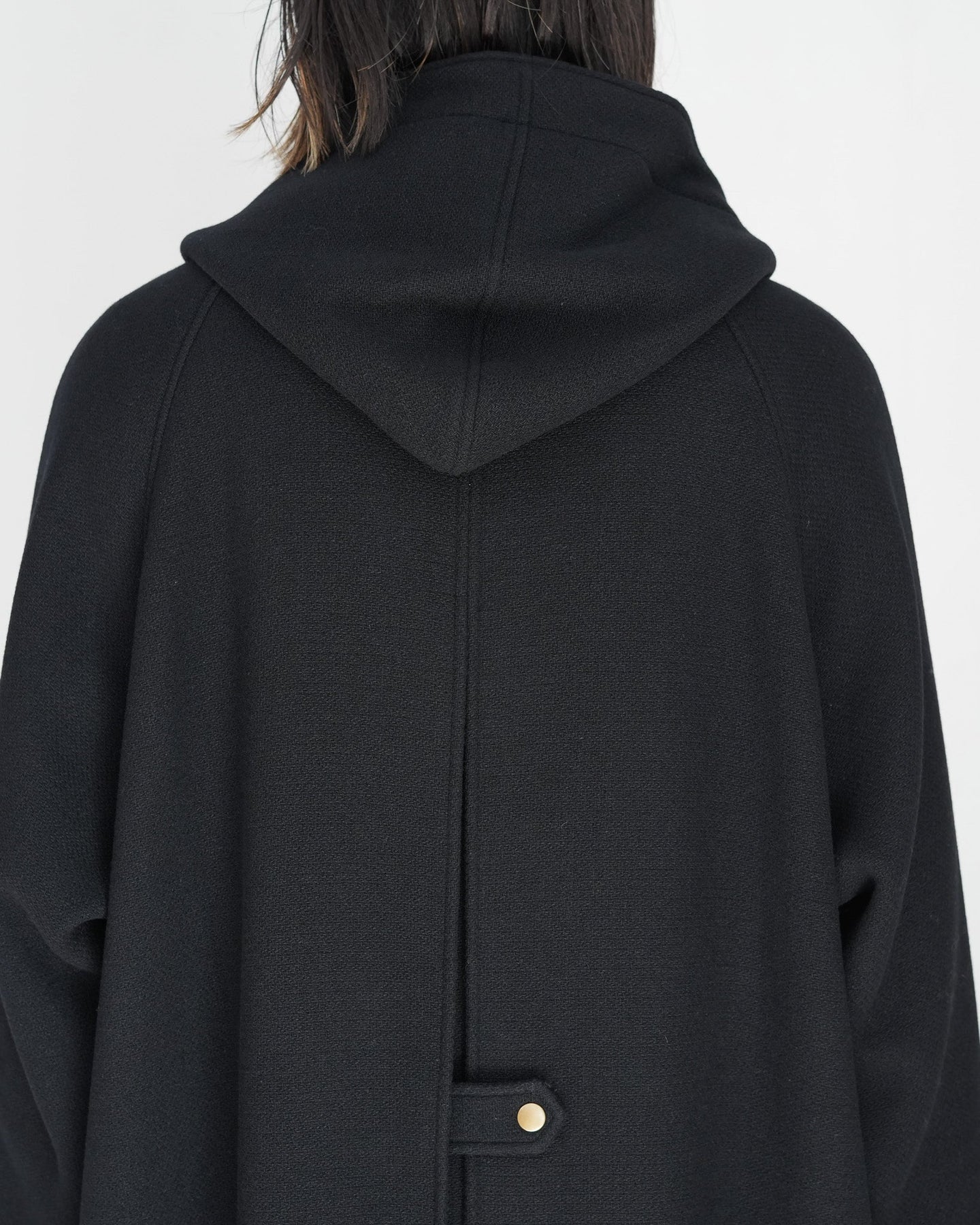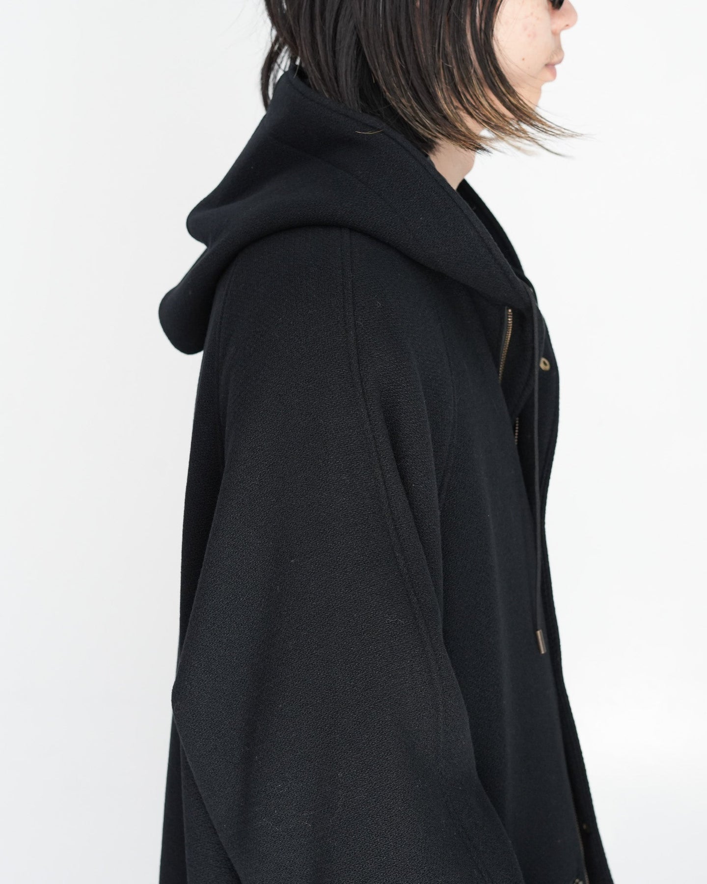 素材にはウールのしなやかさと麻のハリコシに、ワッシャー加工でやわらかい風合いを加えた生地を採用。緯糸のスラブ感が強調された生地感は膨らみがあり、陰影豊かな奥深い表情が特徴的です。