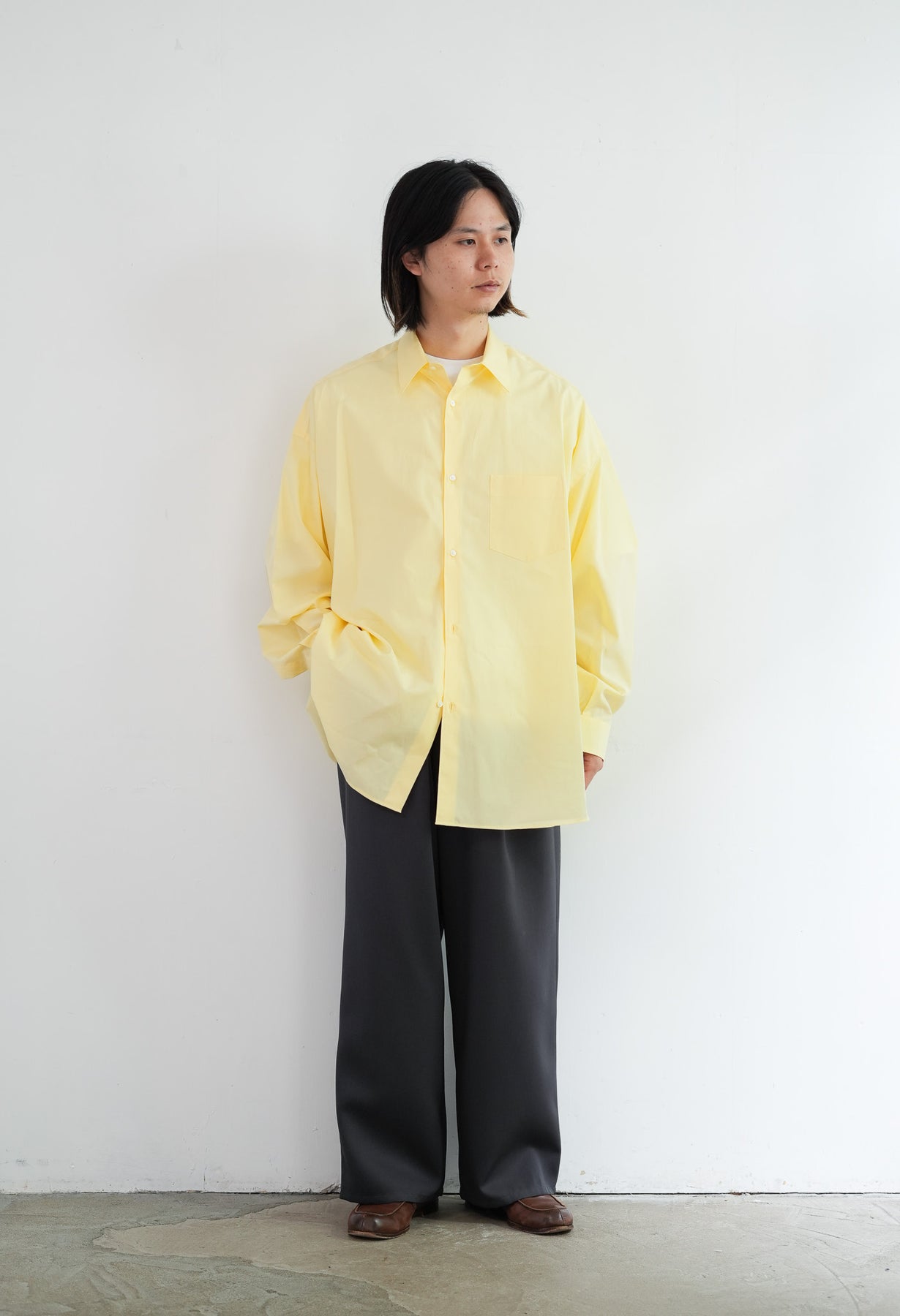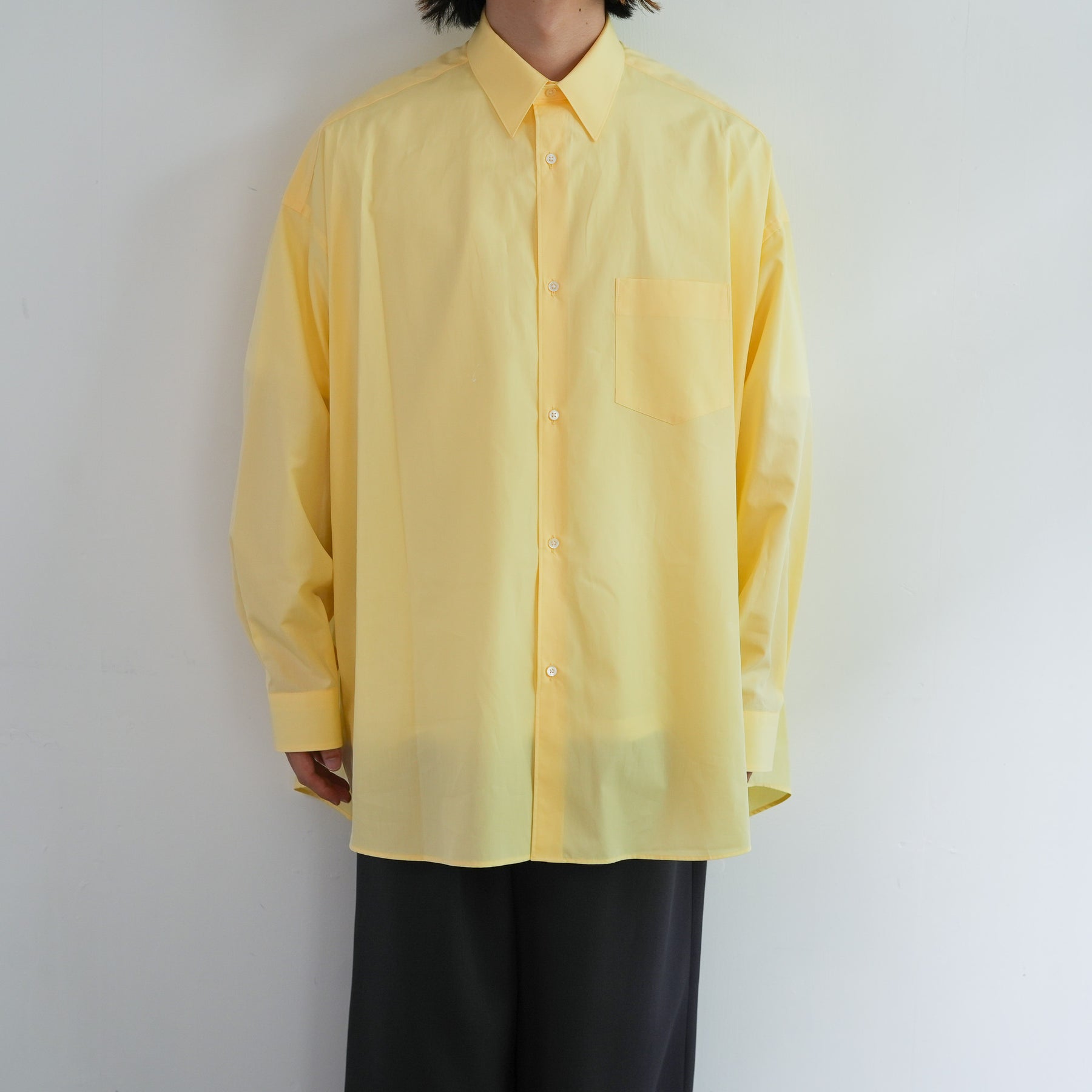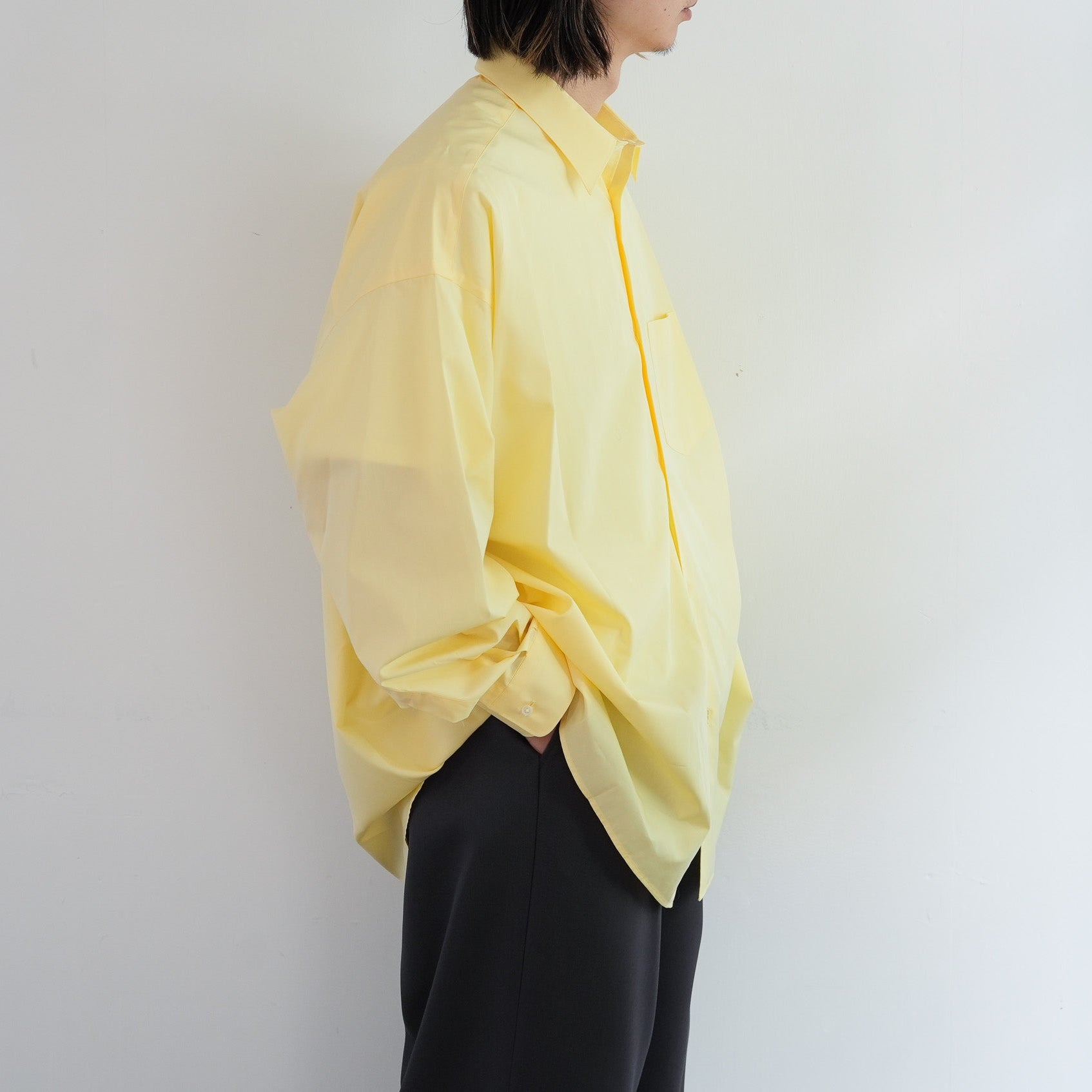 1918年創業、スイスの老舗ファブリックメーカーALUMOとのダブルネームで仕立てた特別なシャツ。世界中のテーラーやメゾンに支持される最高峰の生地は、世界でも0.3%しか到達しない超希少なコットンを使用し、澄んだスイスの軟水で丁寧に仕上げることで、柔らかくもしっかりとしたハリのある極上の風合いに。そのALUMOファブリックを、Graphpaper 定番のオーバーサイズレギュラーカラーシャツに落とし込みました。ドロップショルダーとボリュームのあるボックスシルエットが特徴でオーセンティックな襟型はそのままに、素材が持つしなやかさと程よいハリ感が着用時の心地よさを一段と引き立て日常に自然と馴染む仕上がりに。