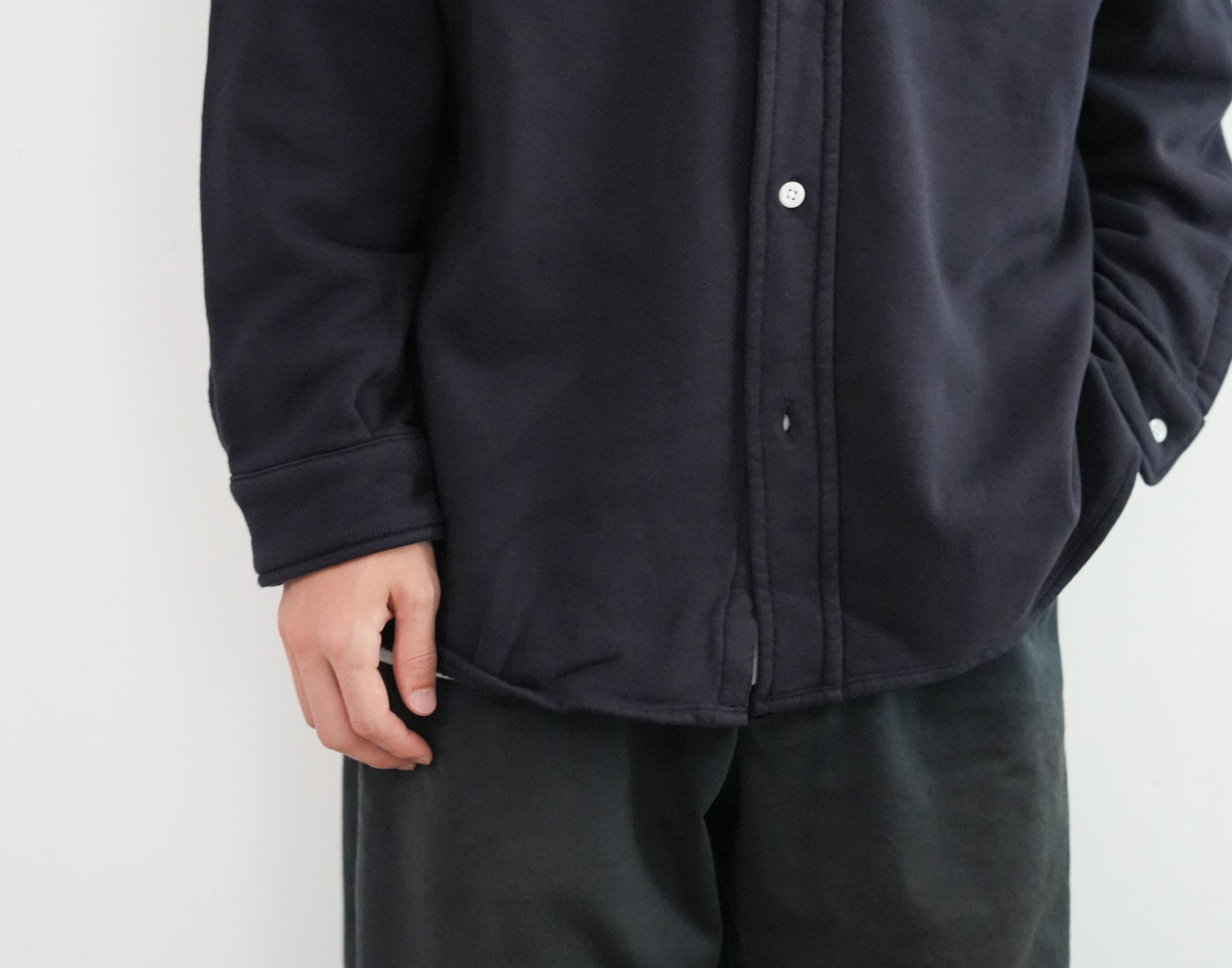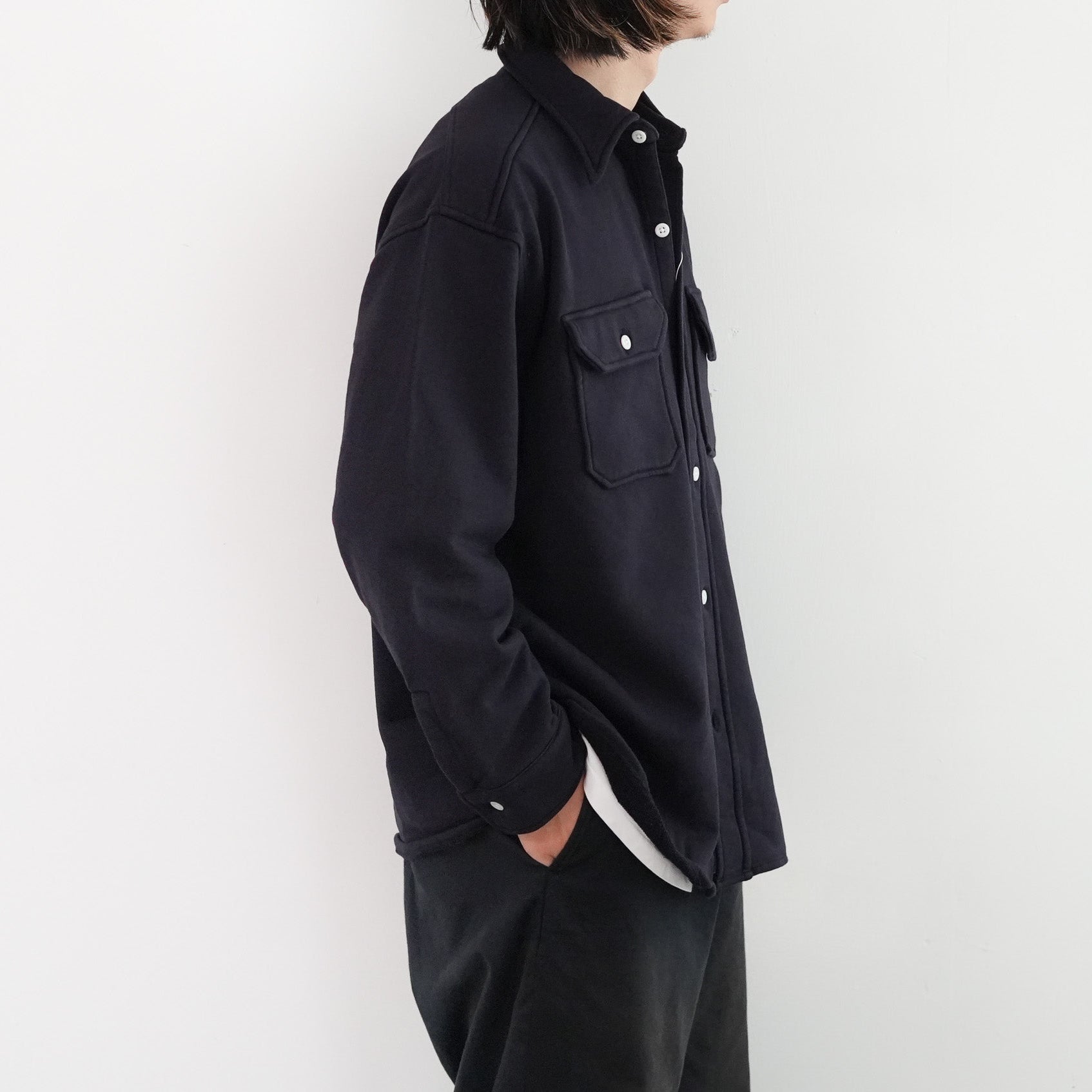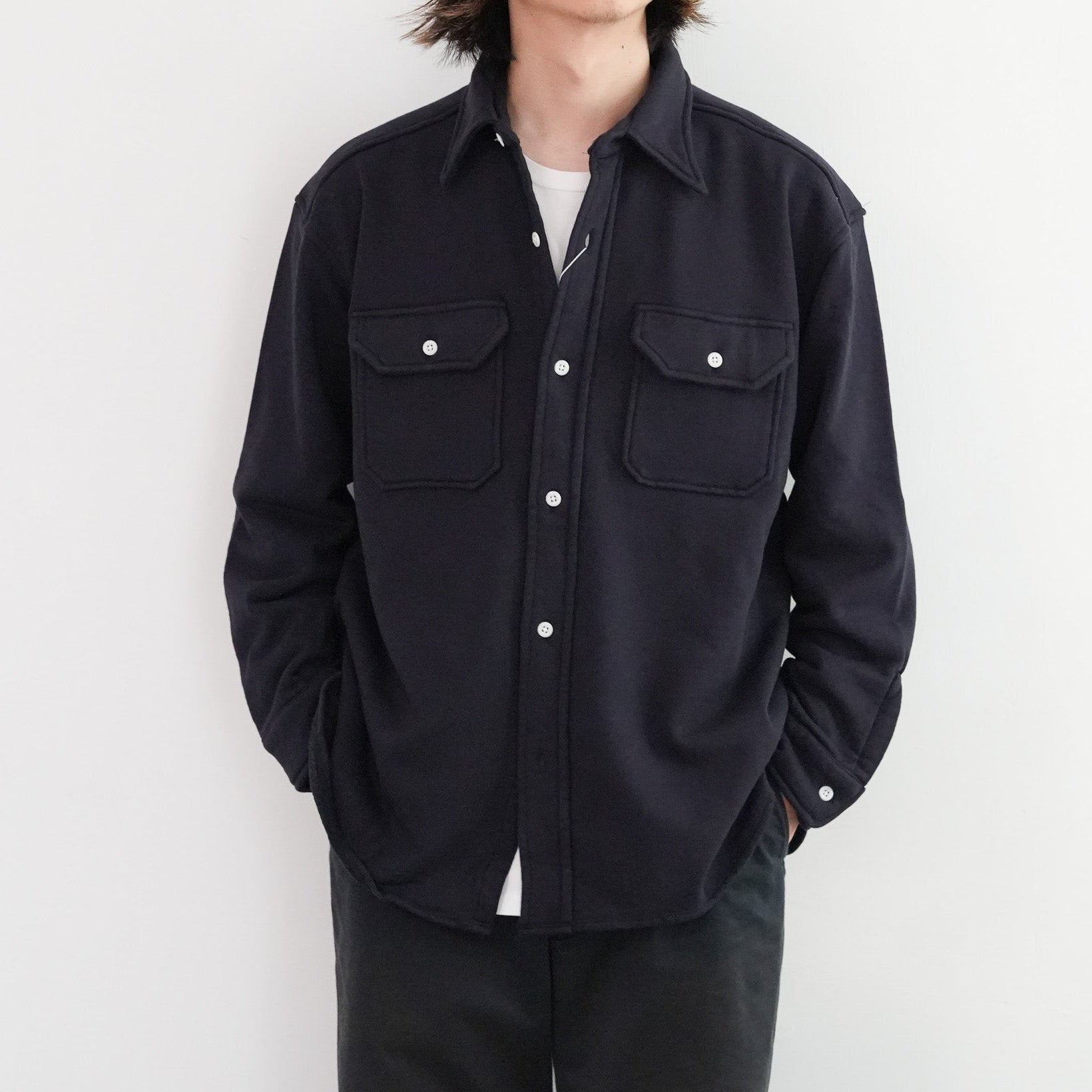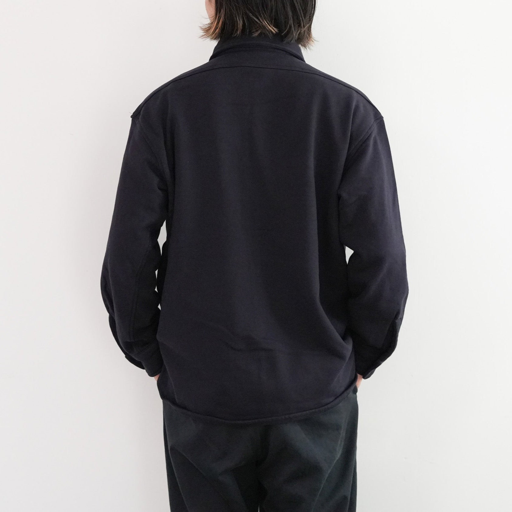 このシャツのリファレンスになったのは、1950年代のチェックのネルシャツ。すごく厚手の生地に、ステッチがグッと食い込み、ふっくらと立体感のある縫製仕様が特徴的でした。その雰囲気をだしたくてアイデアを練った結果、スエット生地でワークシャツをつくろうと思い当たりました。