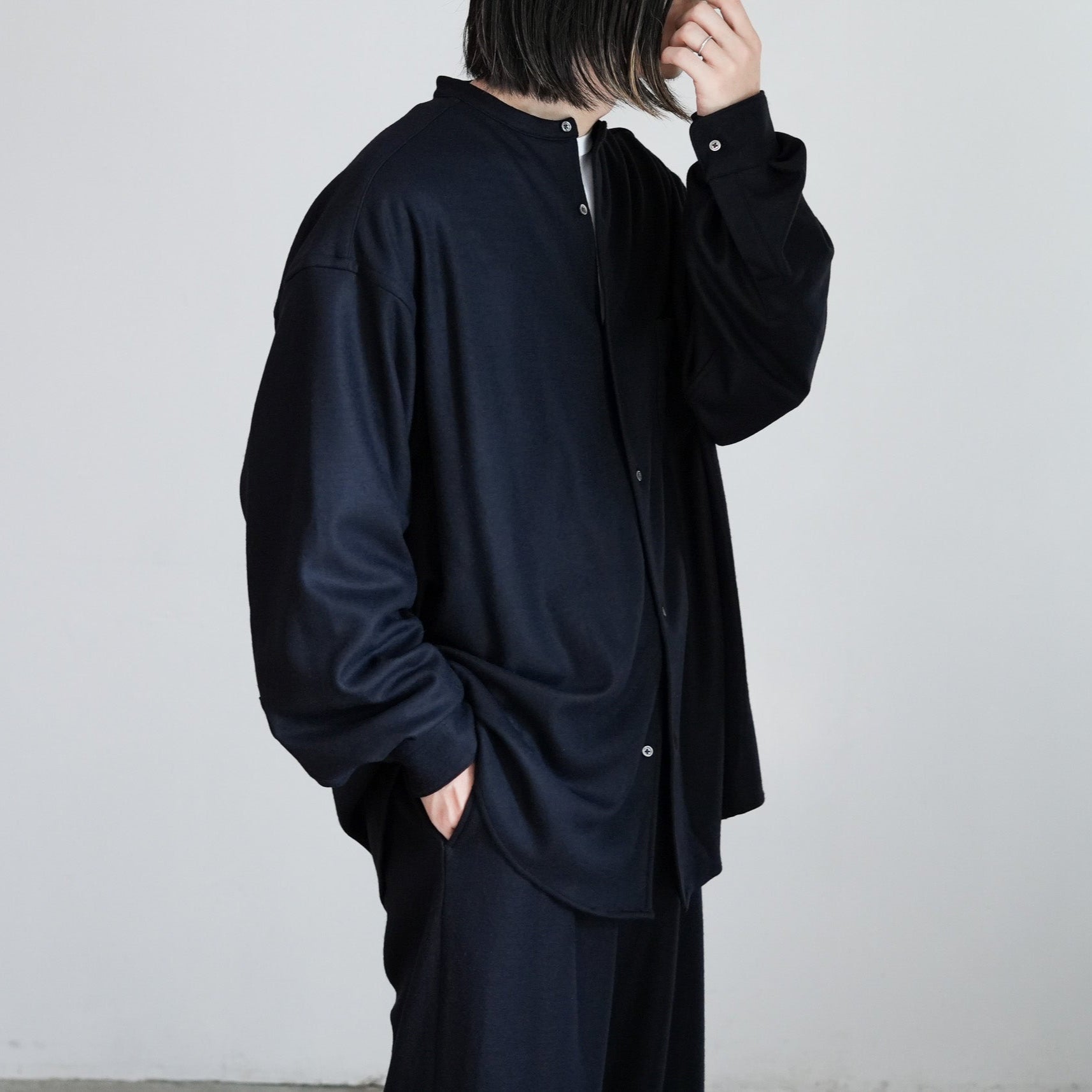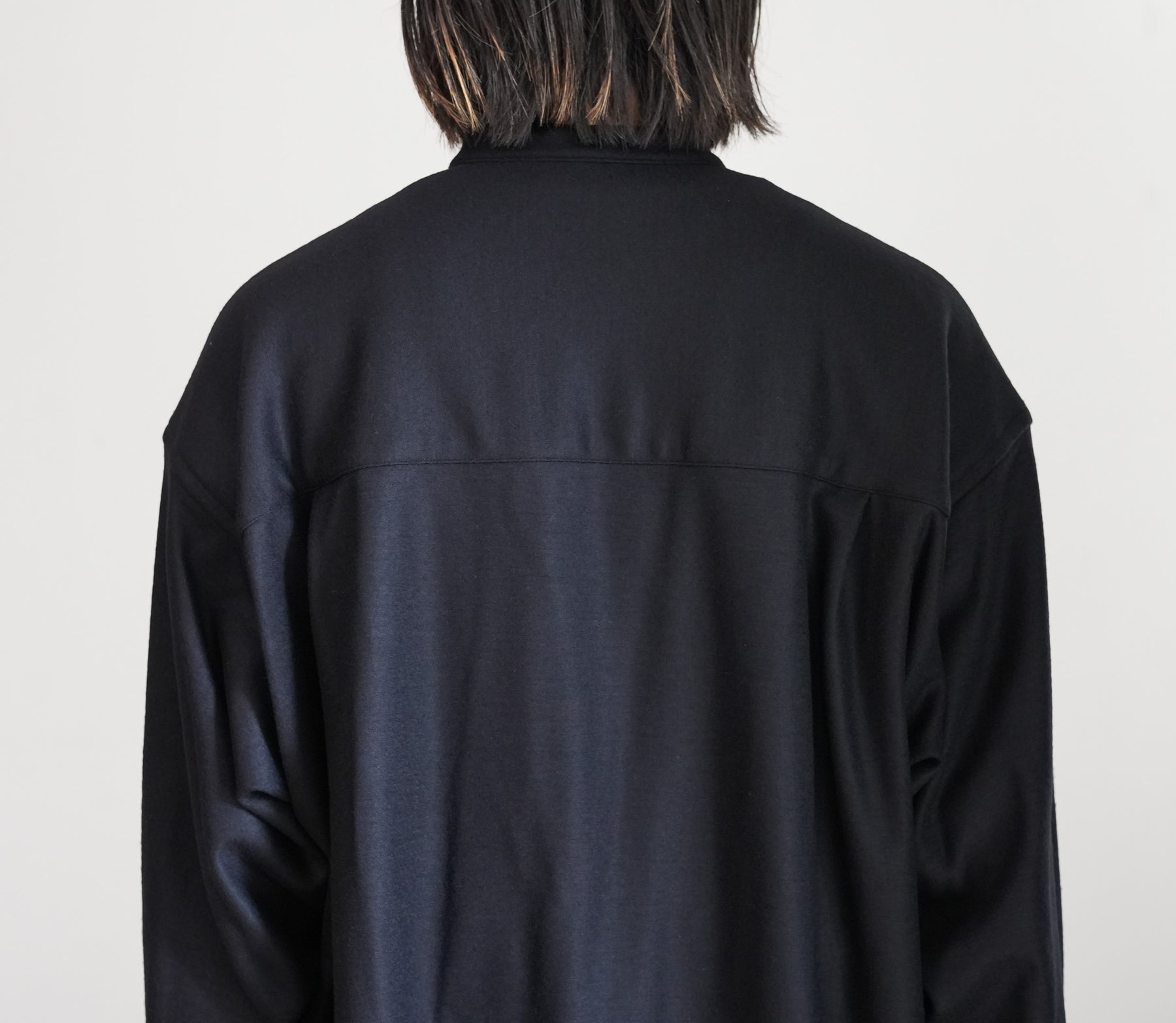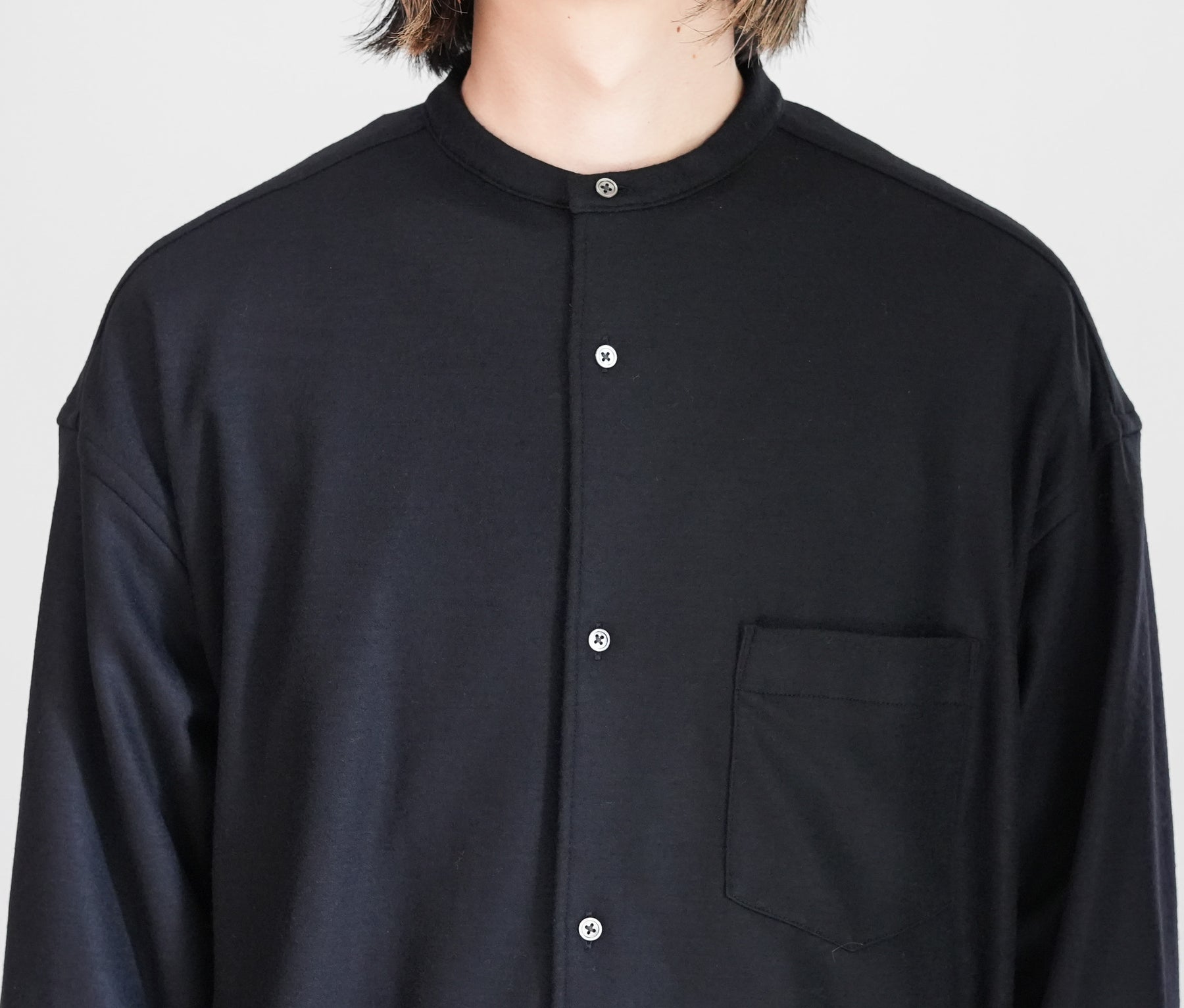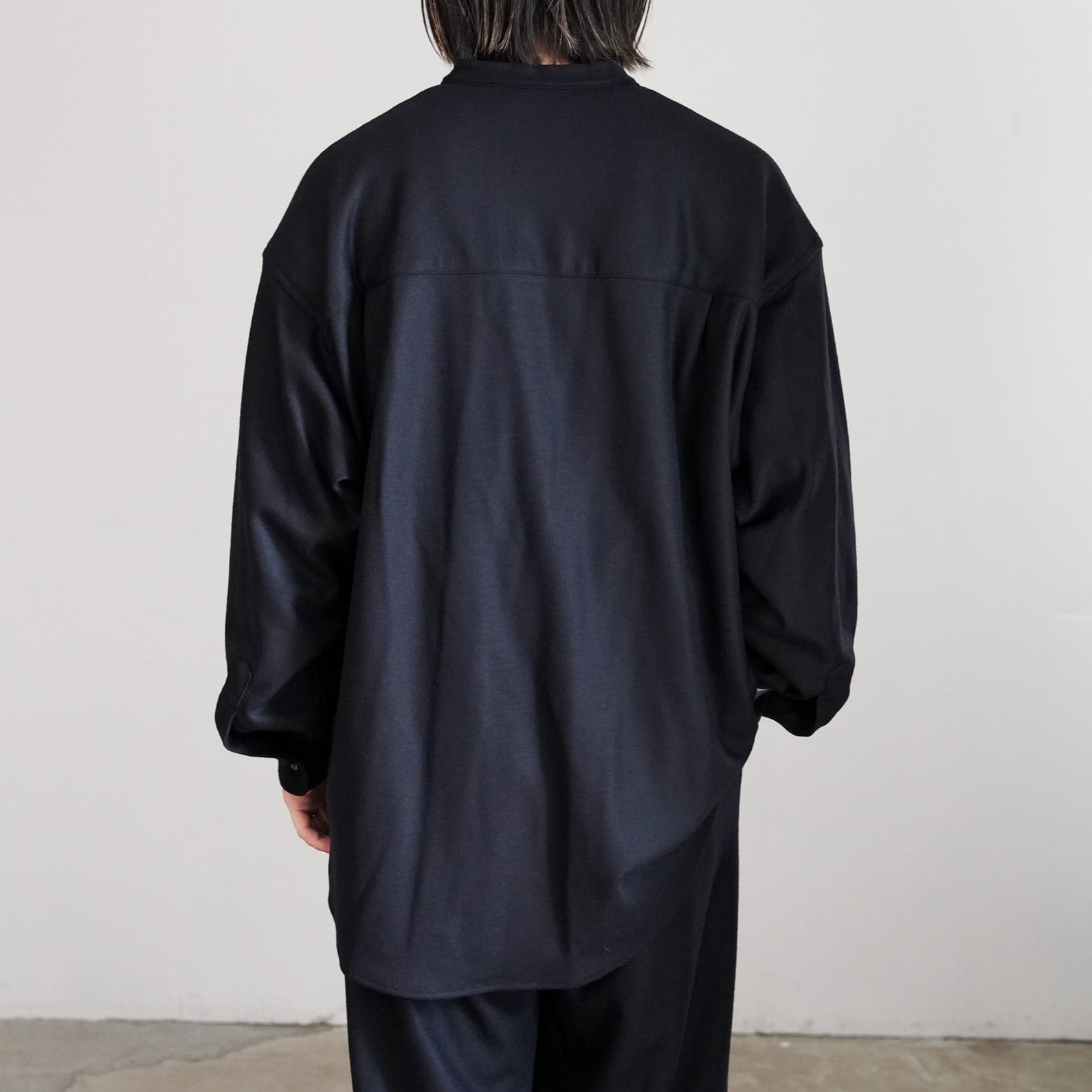 上質なウールスムースを高圧でミルド加工し、フランネルのような表情に仕上げたバンドカラーシャツ。圧縮による適度なハリと柔らかさを備え、スケールオフ加工でハンドウォッシャブルも可能。上品な光沢としなやかなドレープが魅力。冬に最適なウォーム感のあるオーバーサイズフィットで、日常から上質を感じられる一着に。