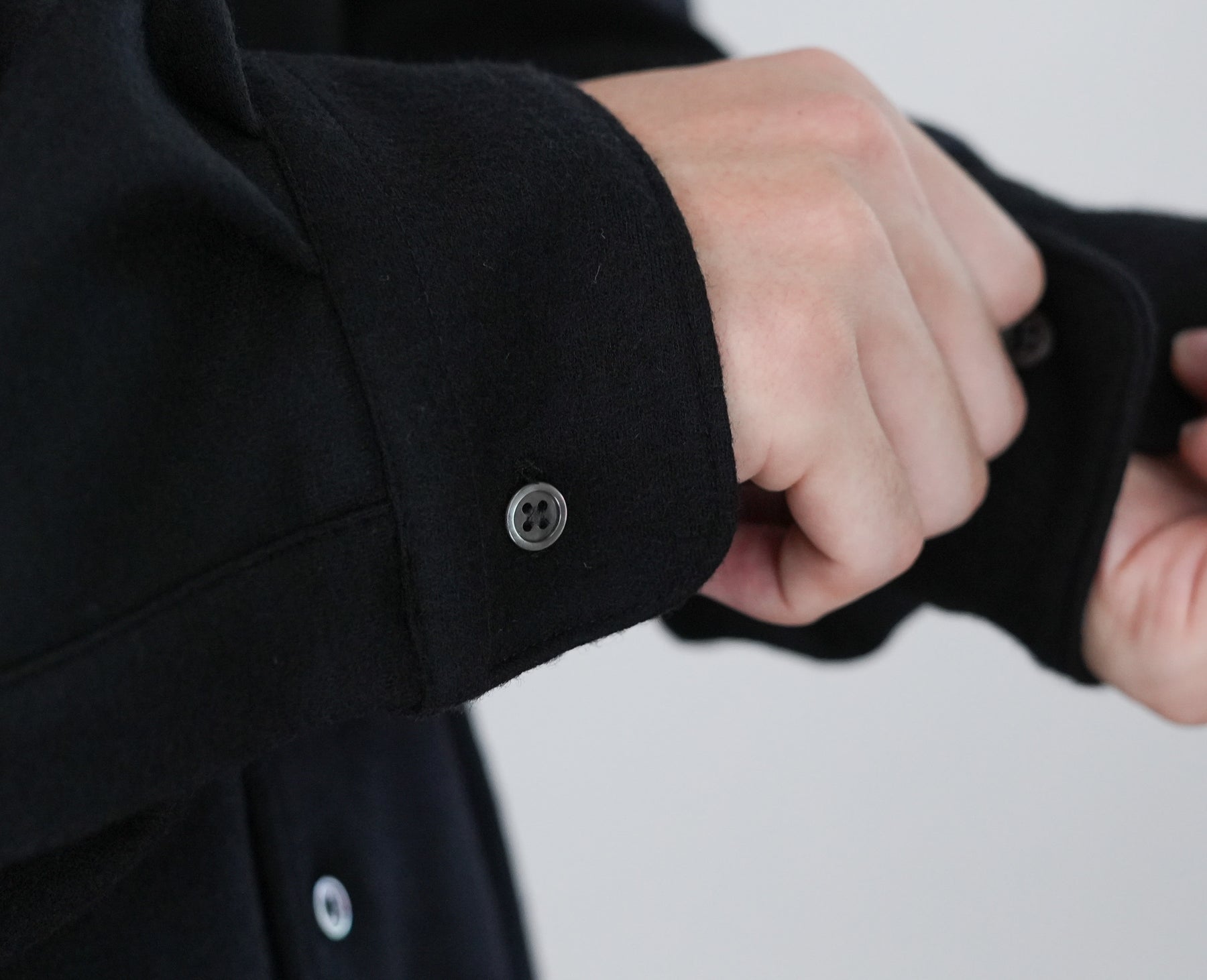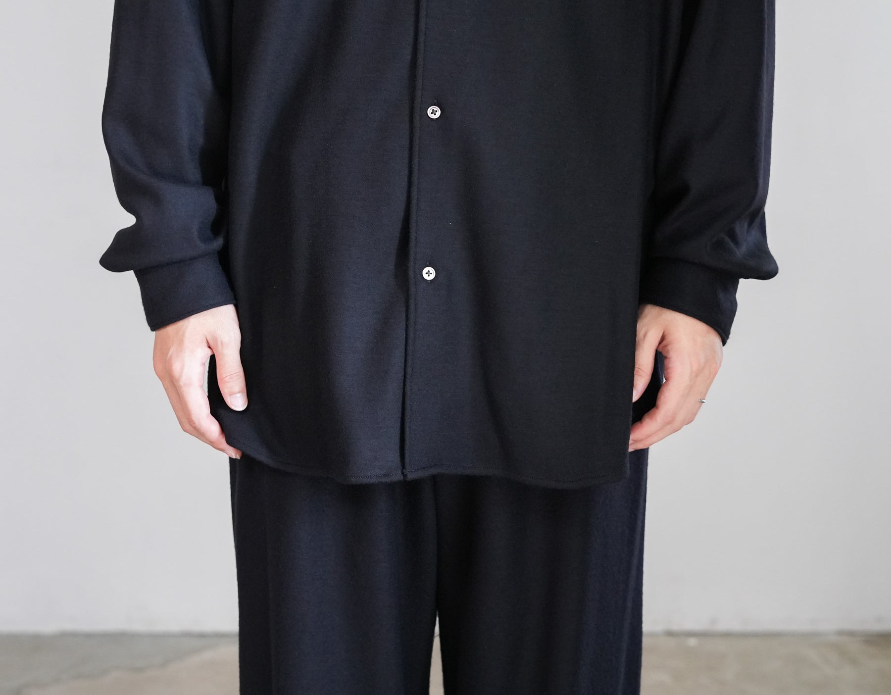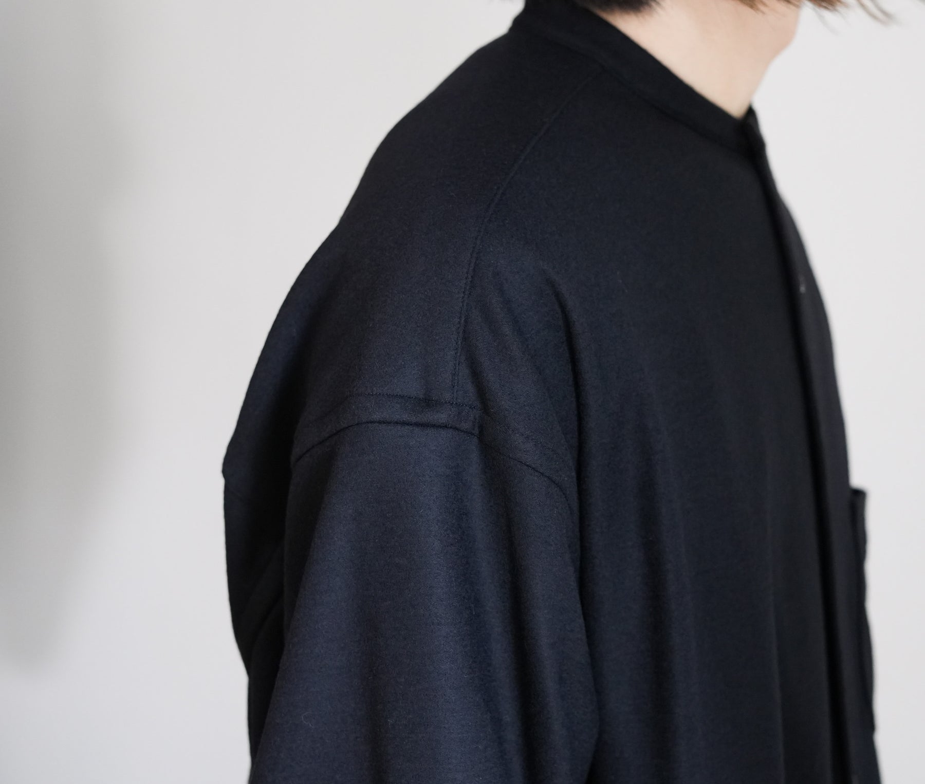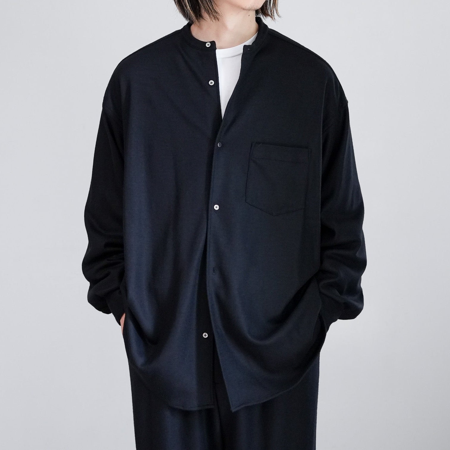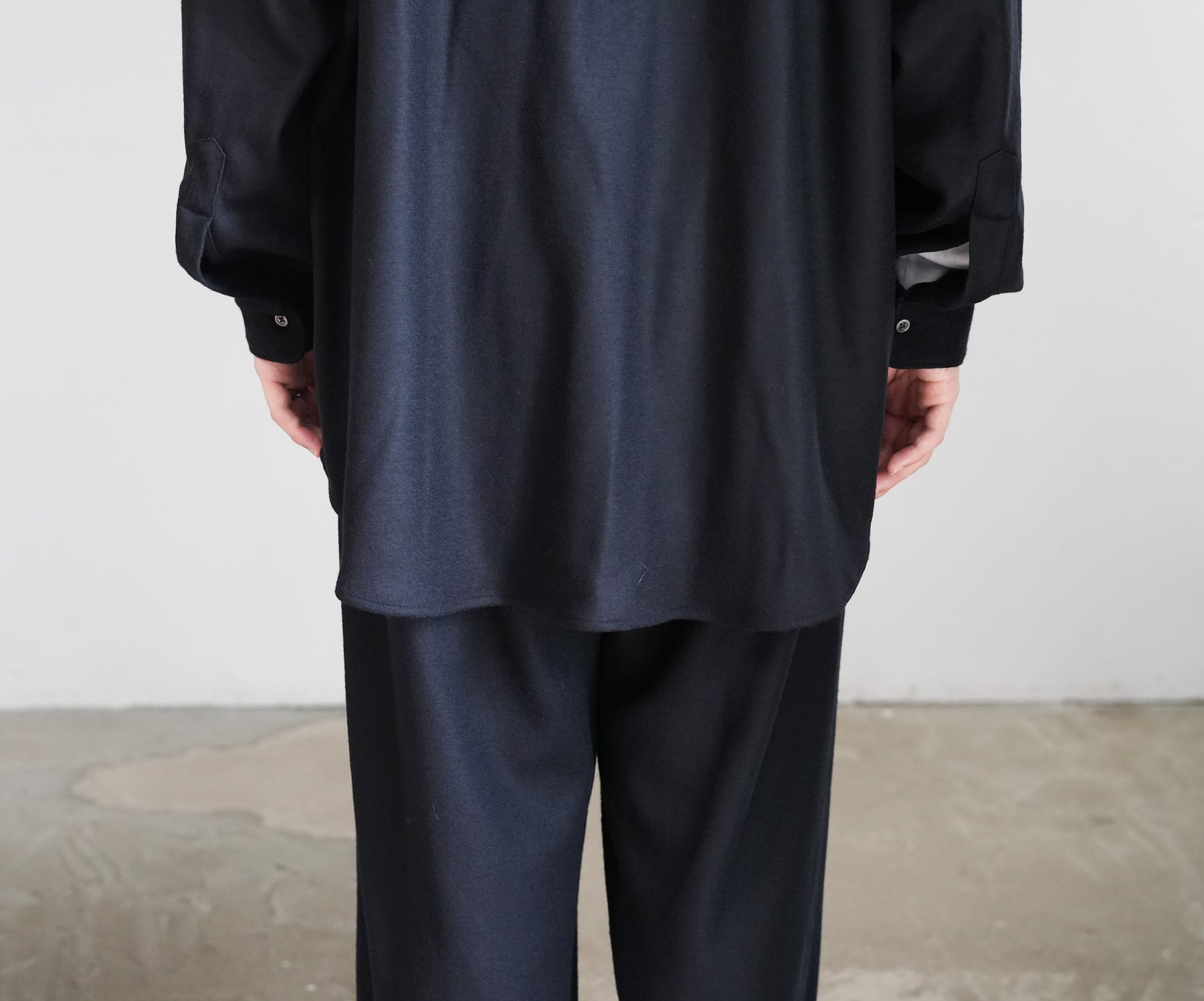 上質なウールスムースを高圧でミルド加工し、フランネルのような表情に仕上げたバンドカラーシャツ。圧縮による適度なハリと柔らかさを備え、スケールオフ加工でハンドウォッシャブルも可能。上品な光沢としなやかなドレープが魅力。冬に最適なウォーム感のあるオーバーサイズフィットで、日常から上質を感じられる一着に。