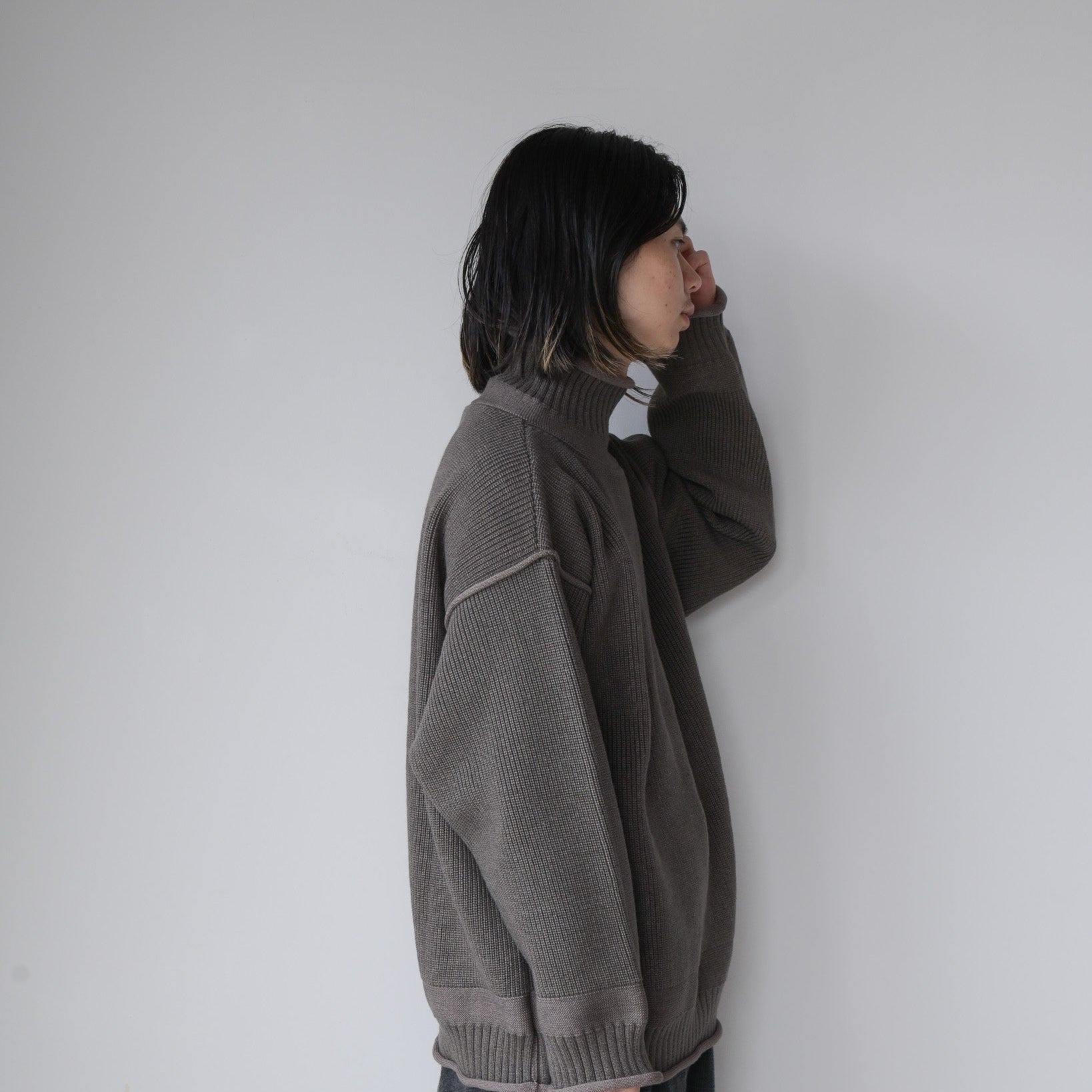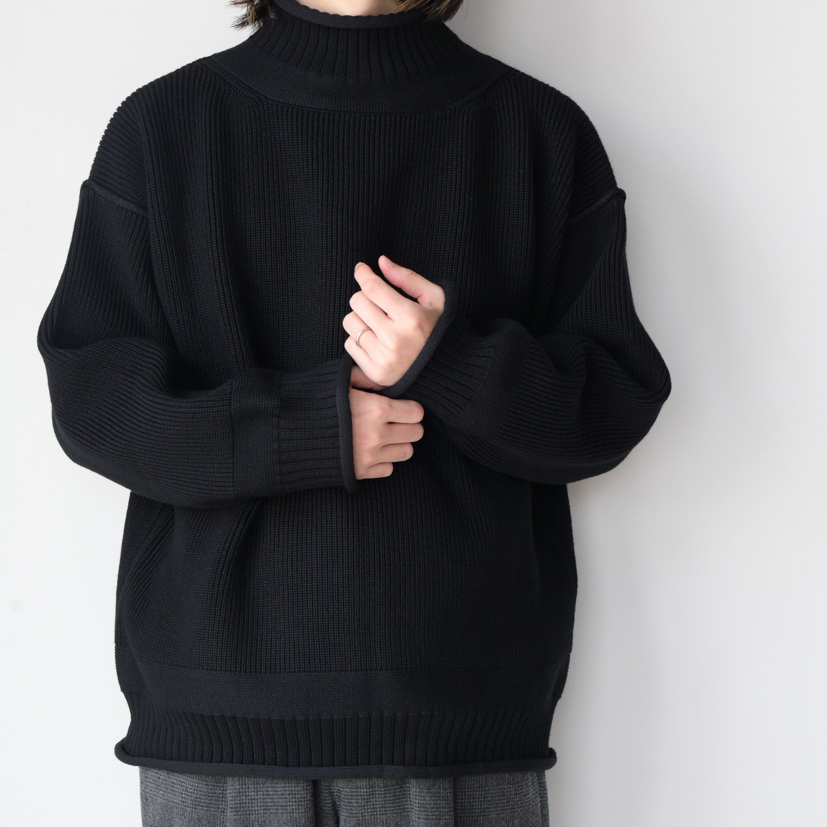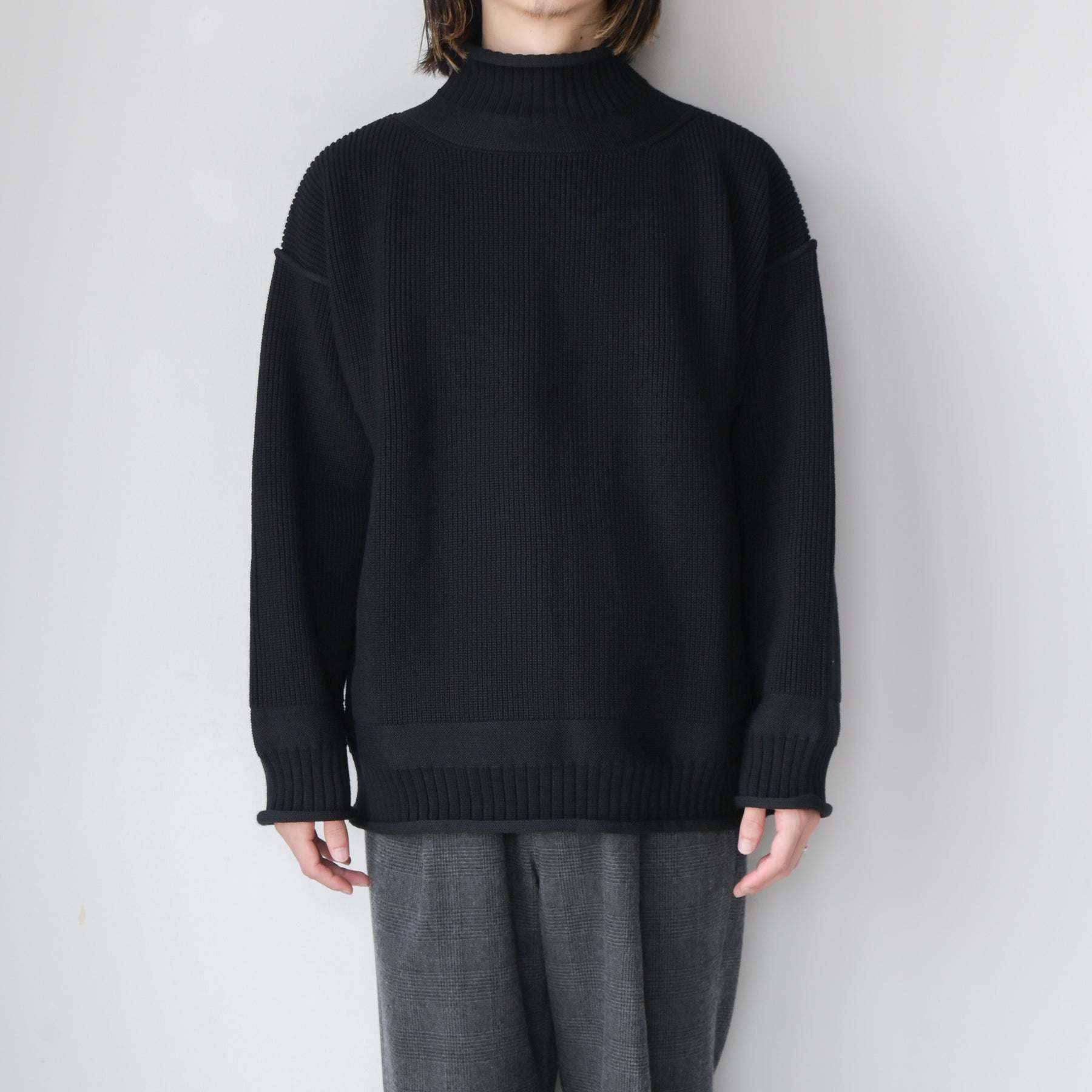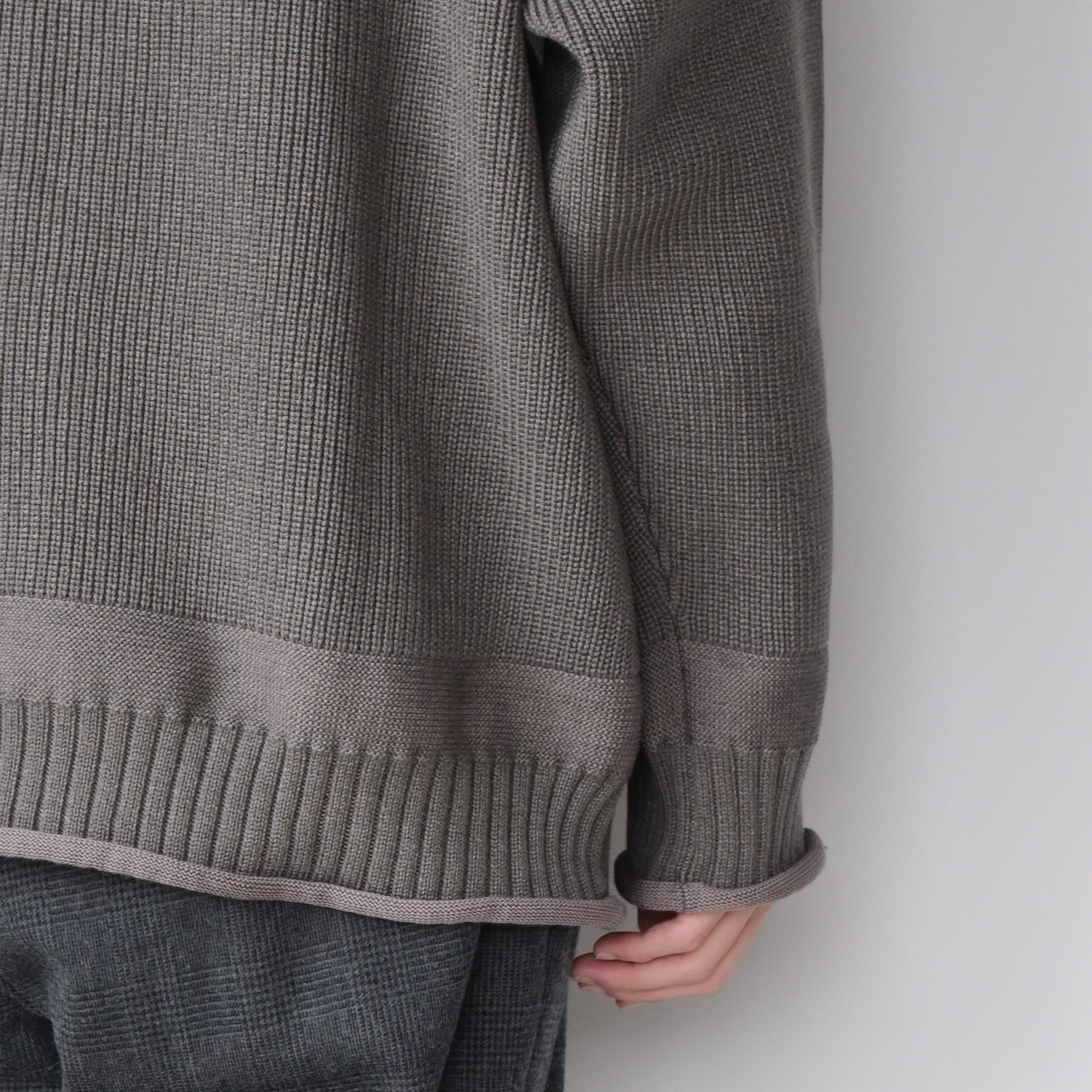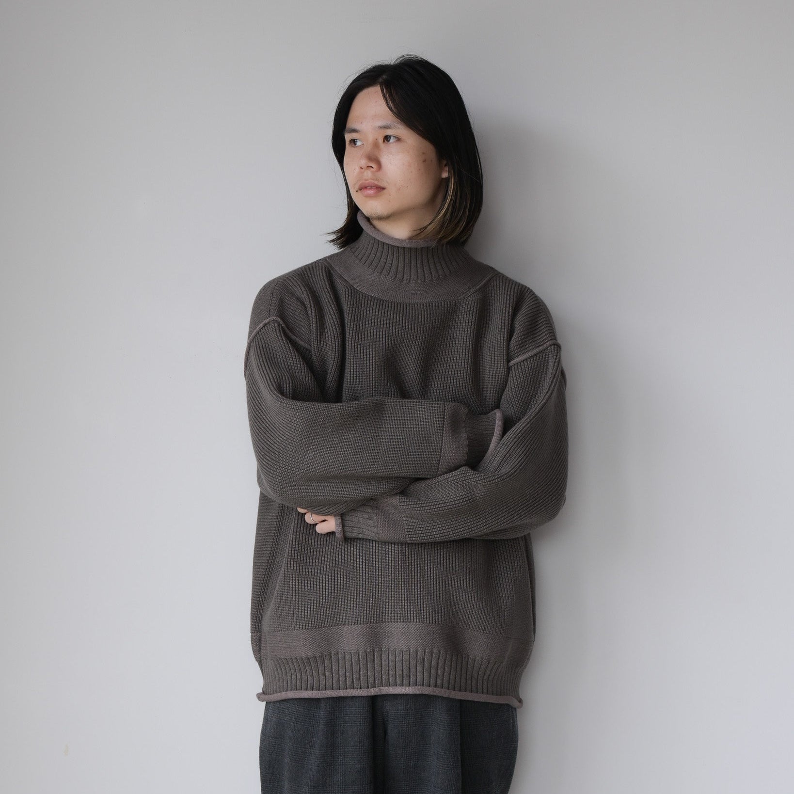ガンジーセーターを現代的にアレンジしたハイネックのプルオーバーニットです。しっかりとした肉感の7G畦編みで編み上げたこのニットは、ゆったりとしたシルエットが特徴的で存在感があります。衿周り、袖口、裾において異なる編み地が施され、独自のデザインが際立っています。さらに、衿、袖口、裾のカーリング編み出しはアームホールにも施されており、他にはない魅力的なニットに仕上がっています。