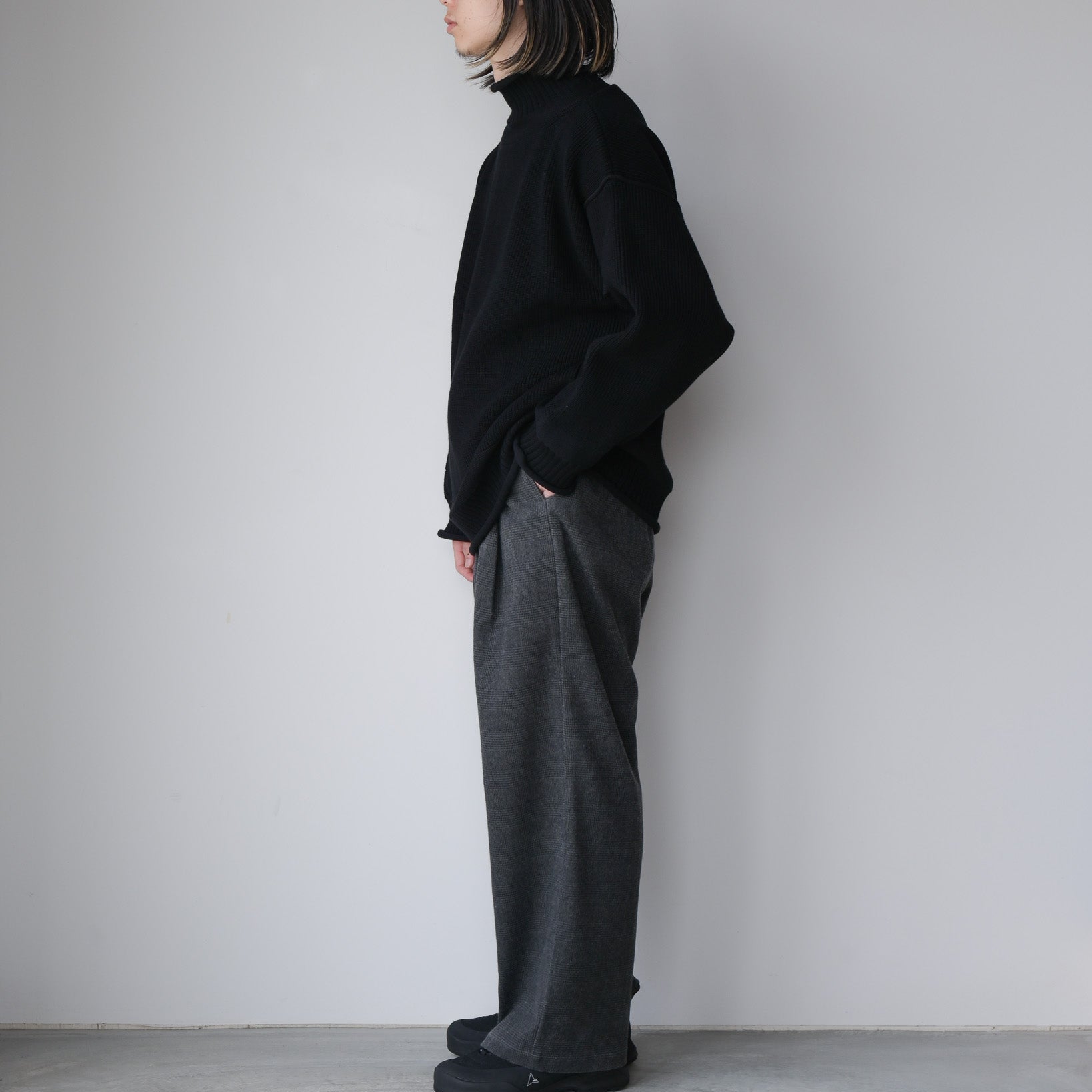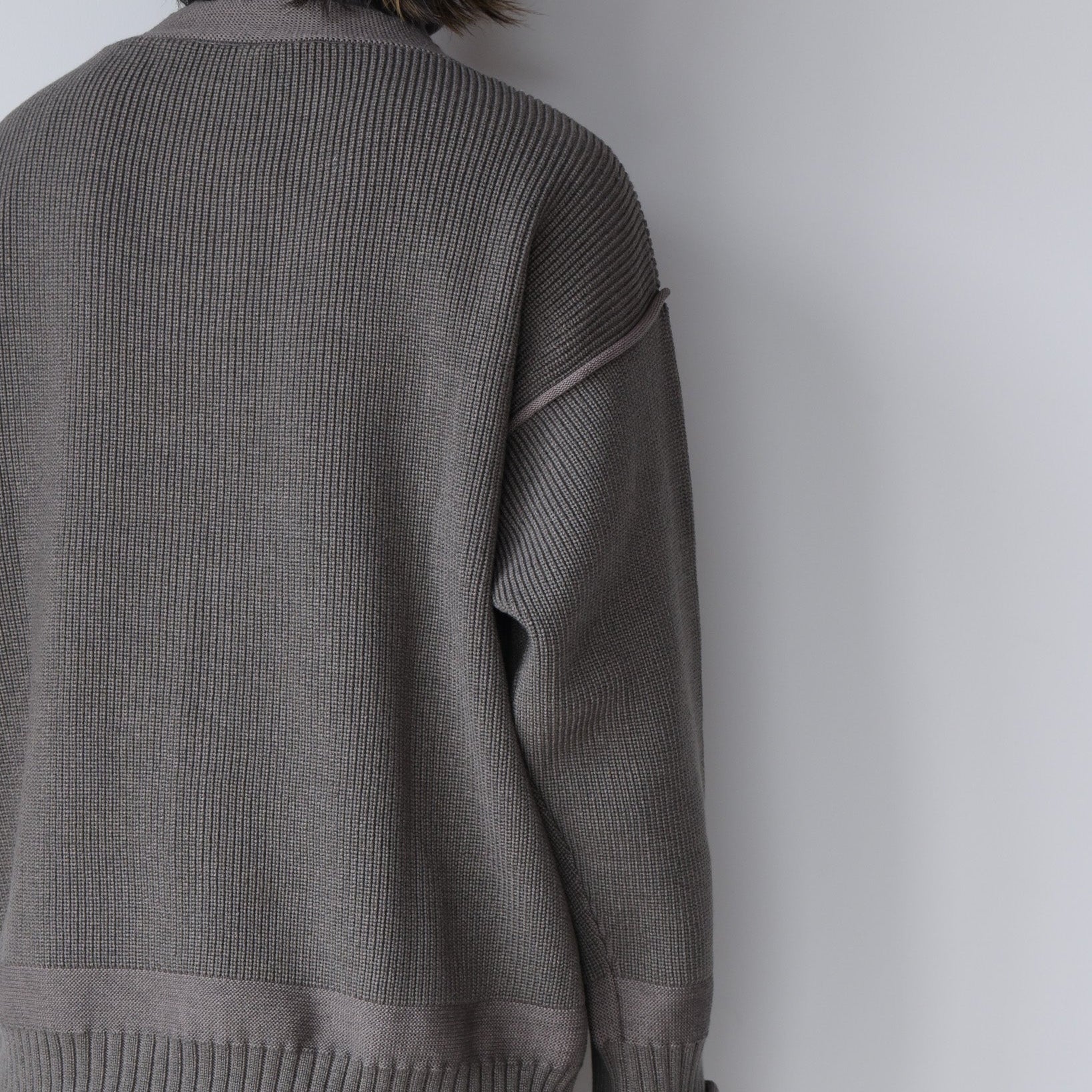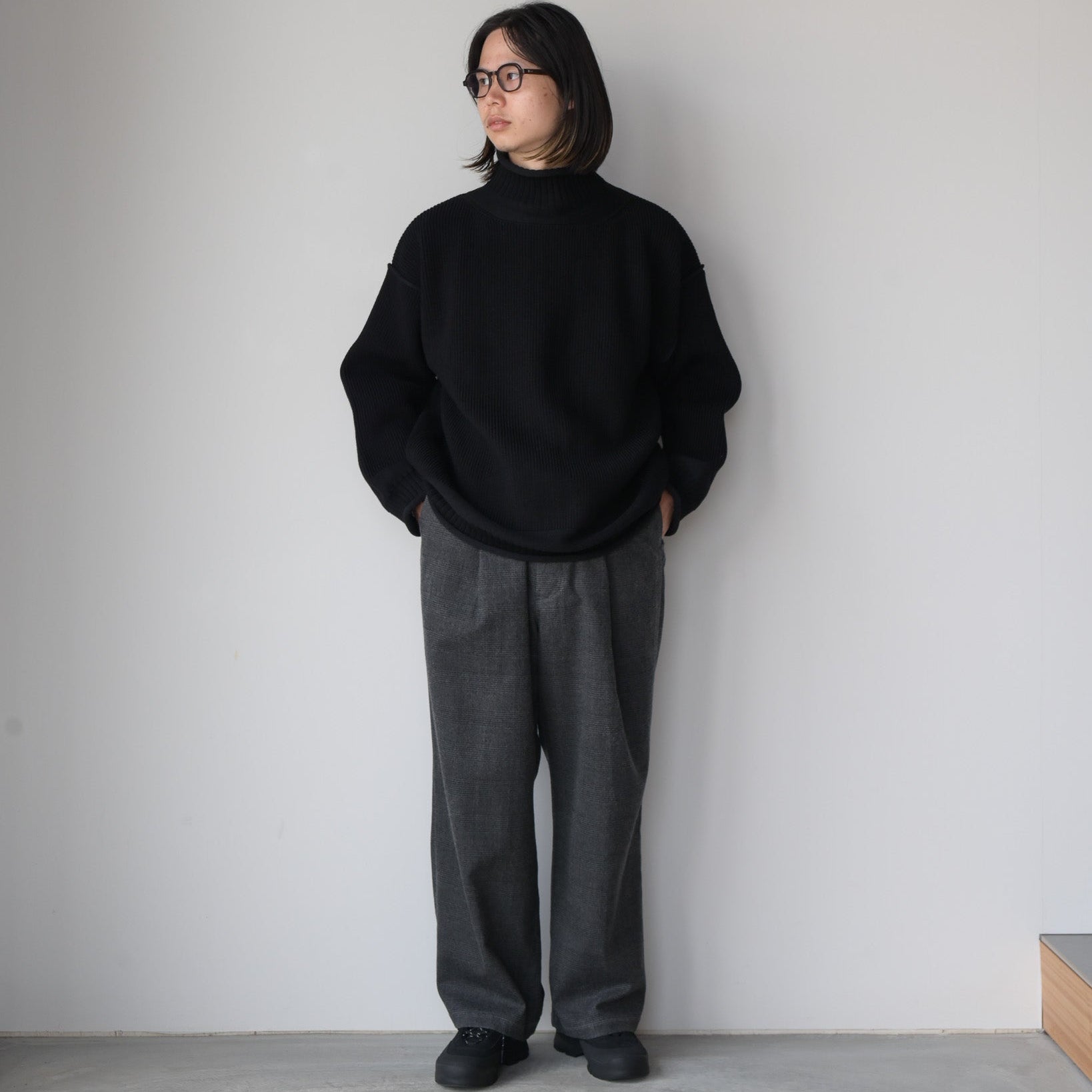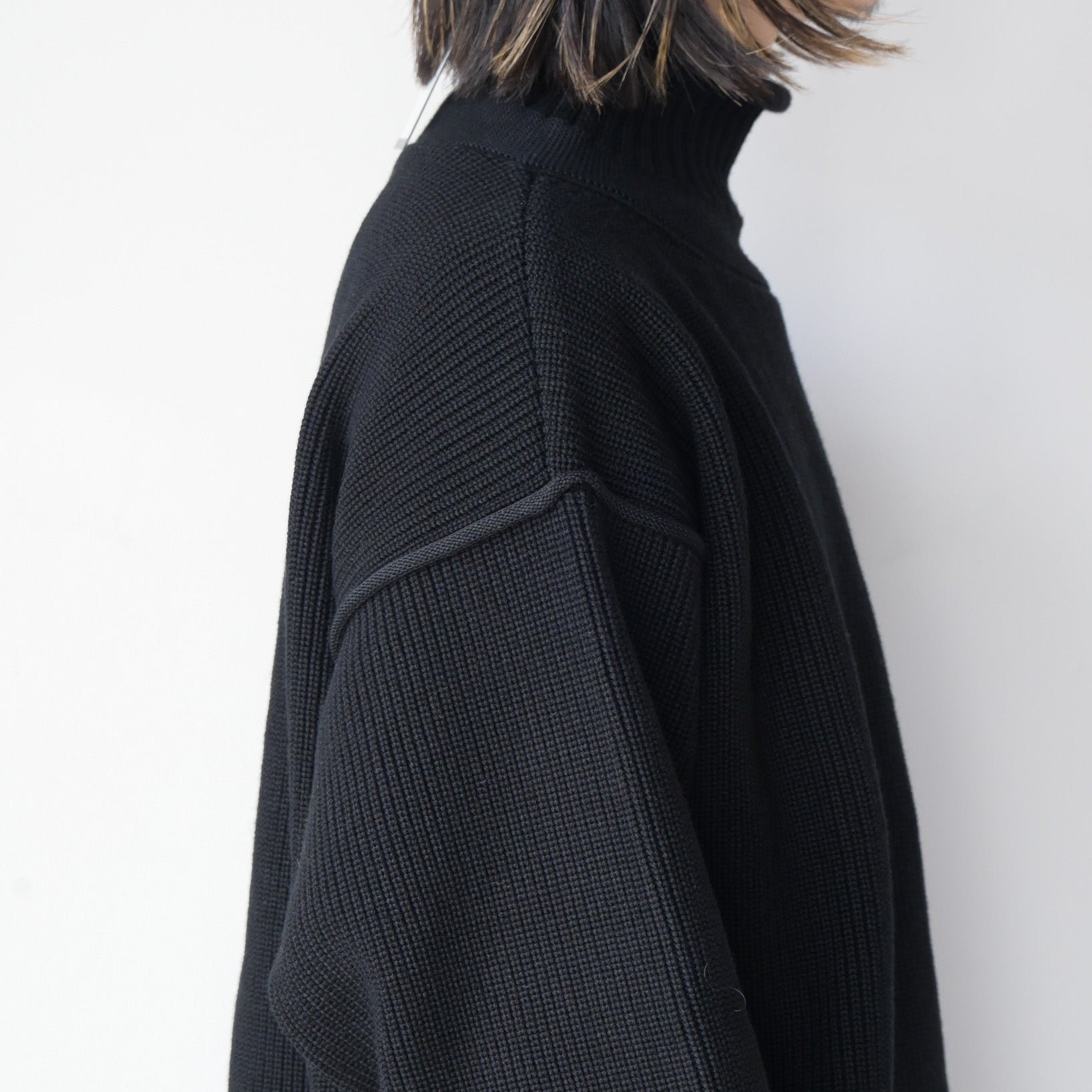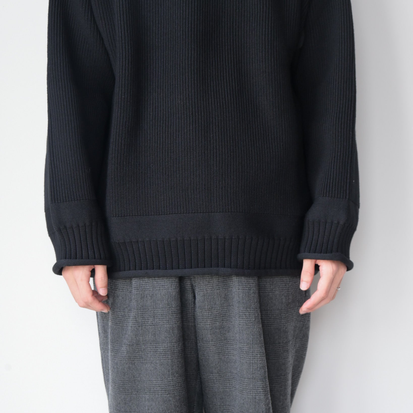 ガンジーセーターを現代的にアレンジしたハイネックのプルオーバーニットです。しっかりとした肉感の7G畦編みで編み上げたこのニットは、ゆったりとしたシルエットが特徴的で存在感があります。衿周り、袖口、裾において異なる編み地が施され、独自のデザインが際立っています。さらに、衿、袖口、裾のカーリング編み出しはアームホールにも施されており、他にはない魅力的なニットに仕上がっています。