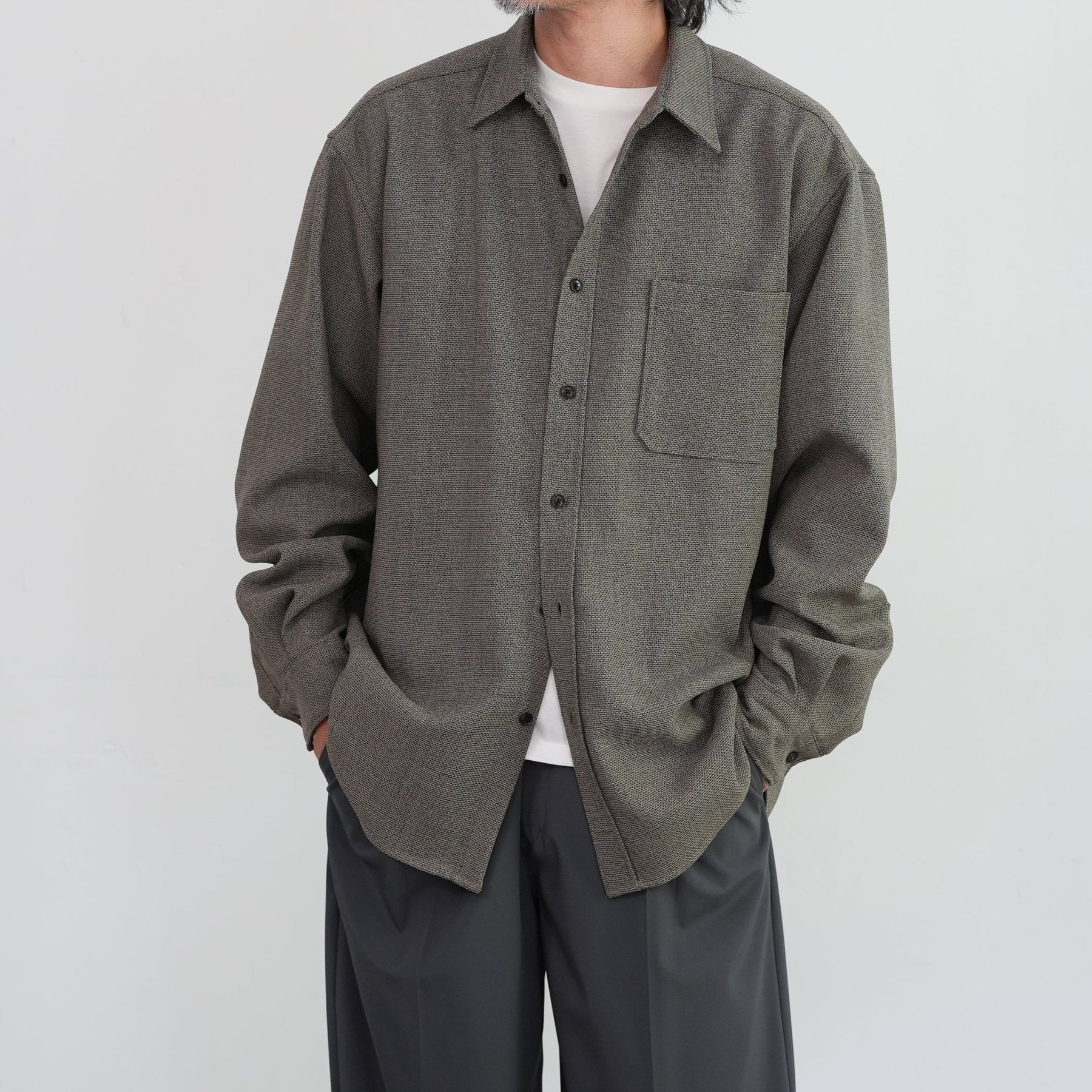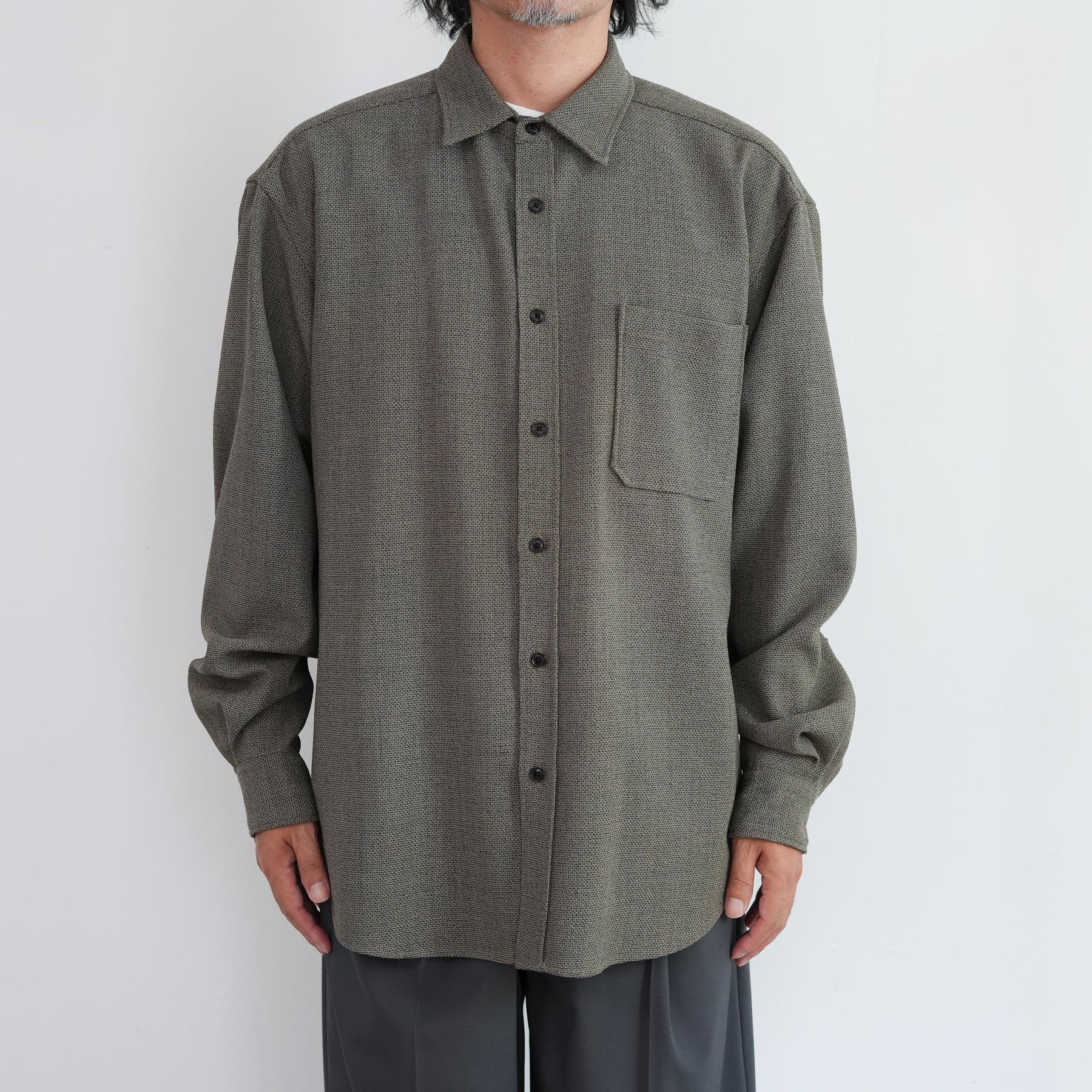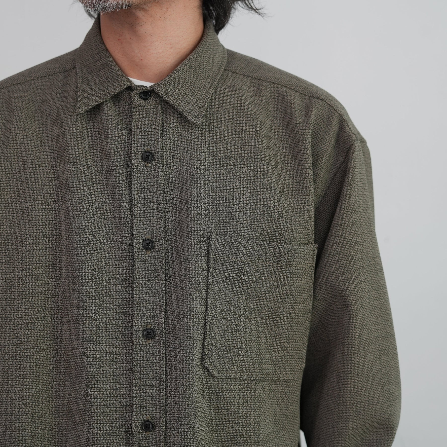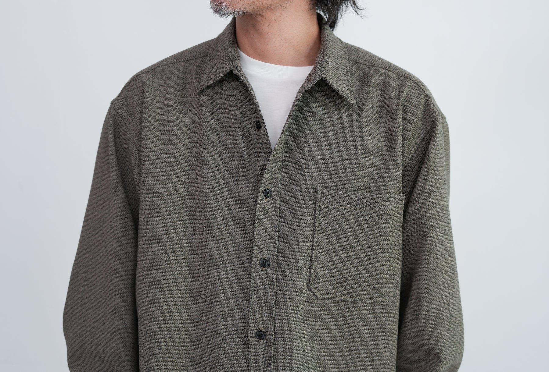 ゆったりとしたボックスシルエットのレギュラーシャツです。KHAKI、BROWNの糸を交織した奥行きのある色合いのウールカラミ素材は肉感、弾力がありウール独特のシャリ感のある新鮮な表情の素材です。