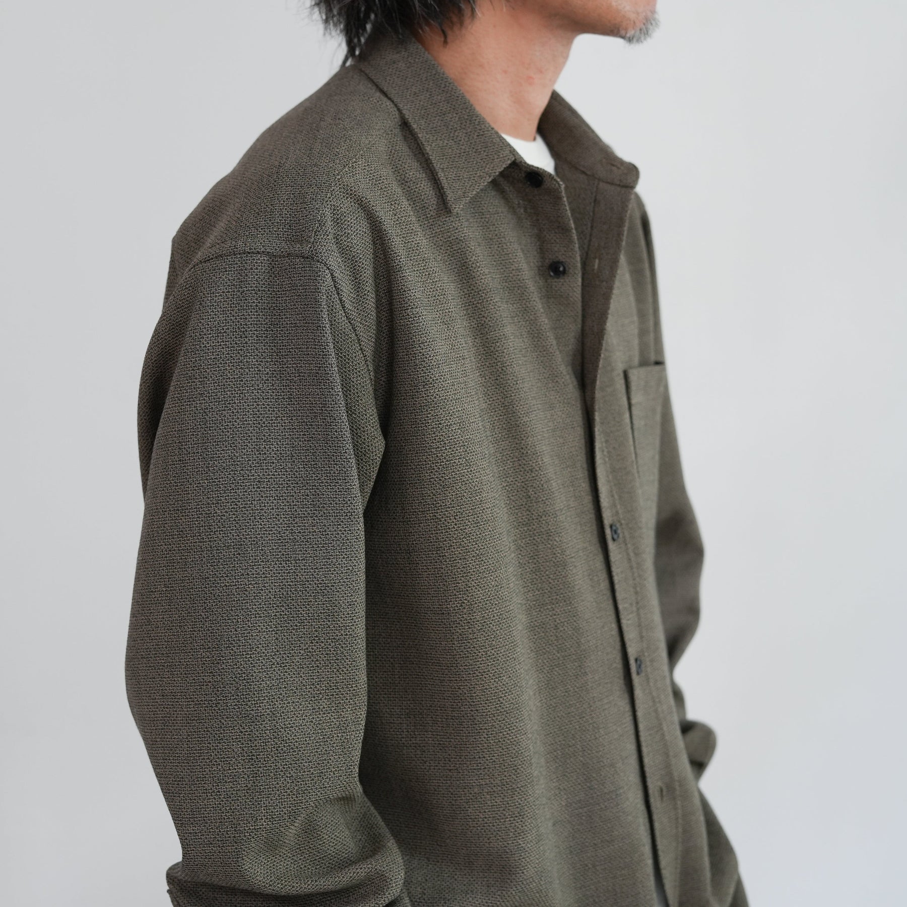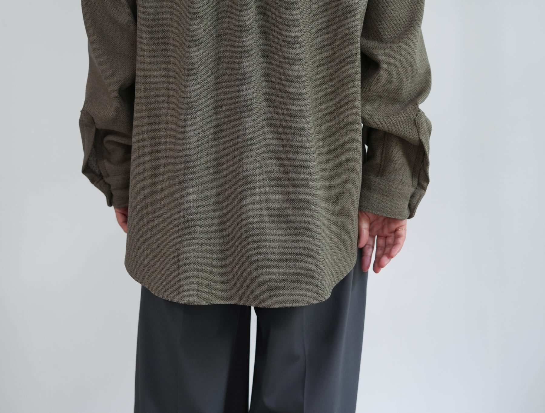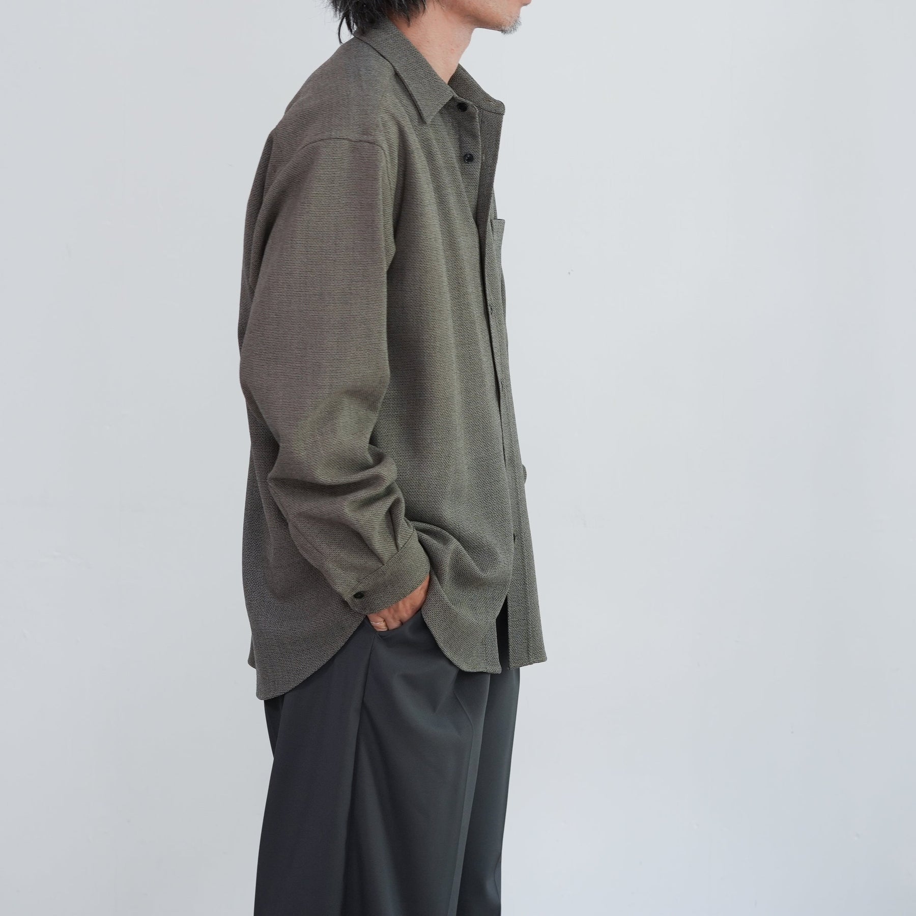 ゆったりとしたボックスシルエットのレギュラーシャツです。KHAKI、BROWNの糸を交織した奥行きのある色合いのウールカラミ素材は肉感、弾力がありウール独特のシャリ感のある新鮮な表情の素材です。