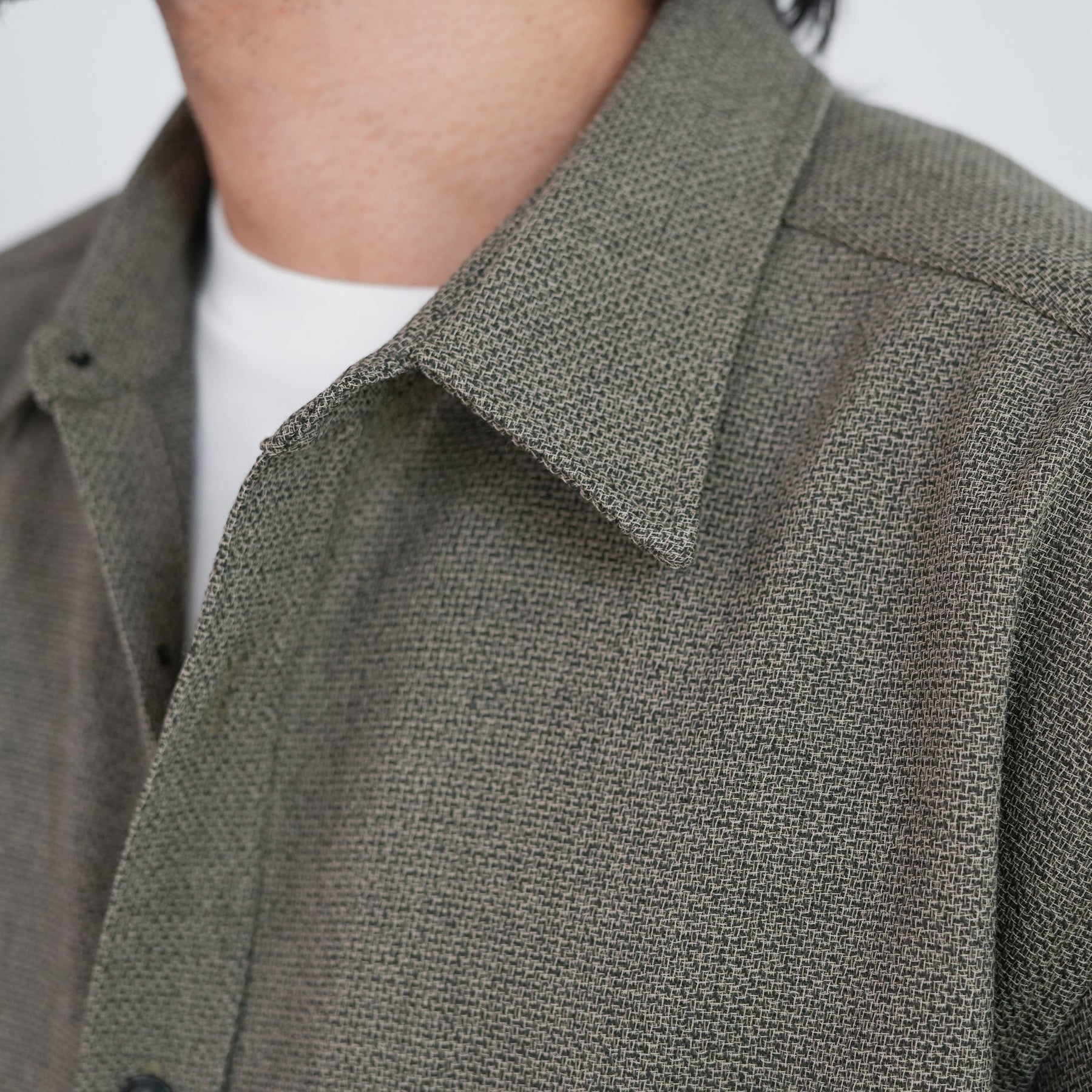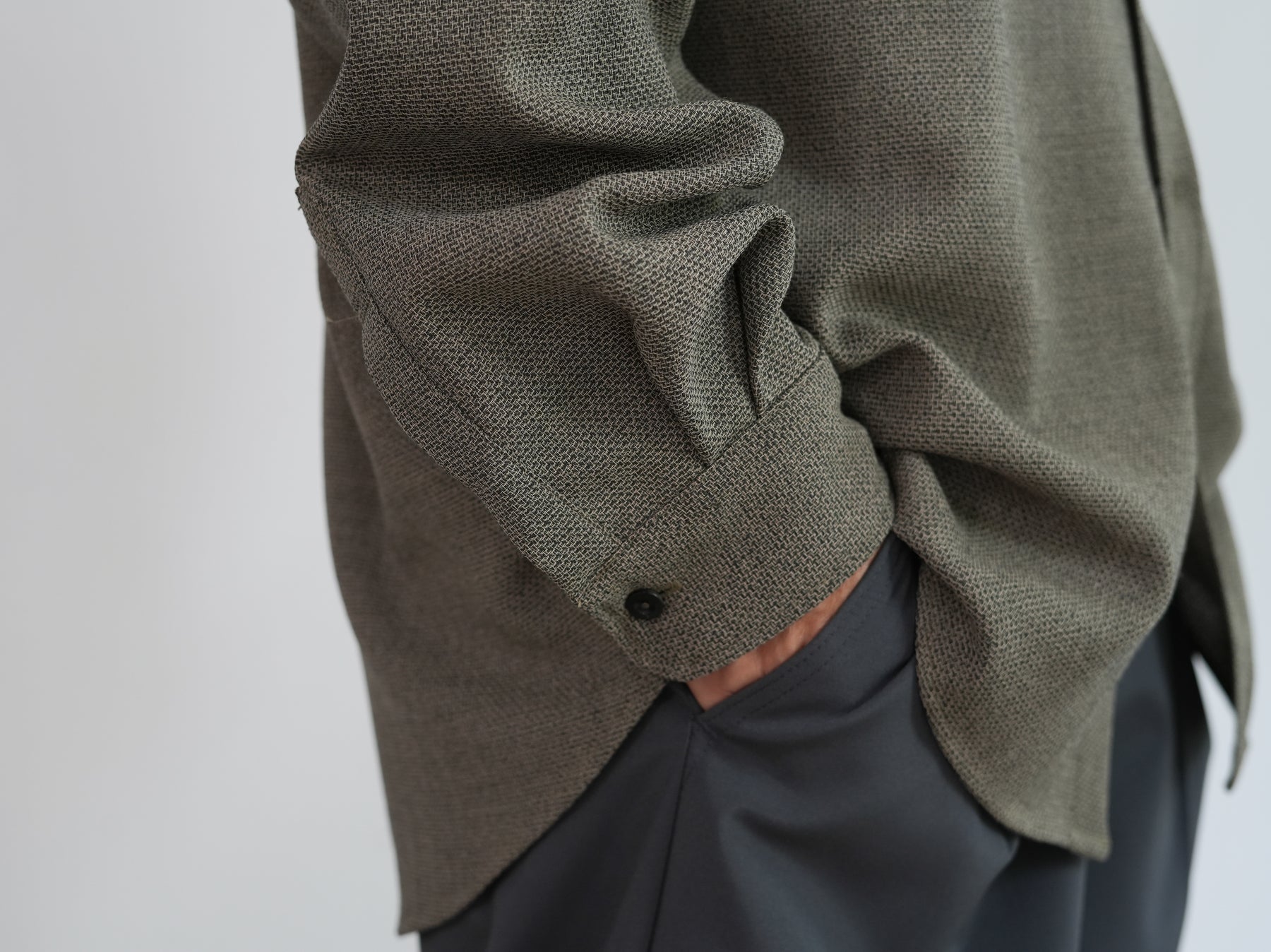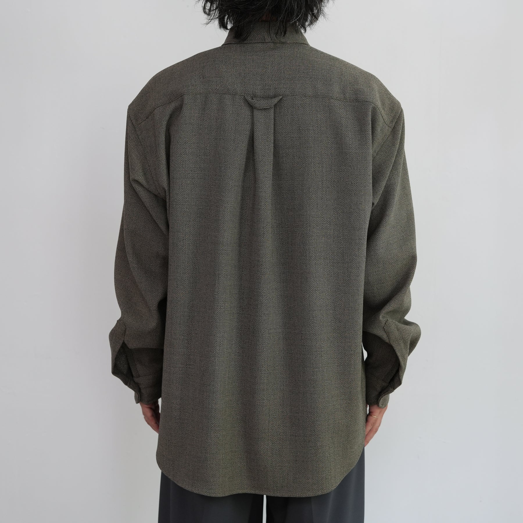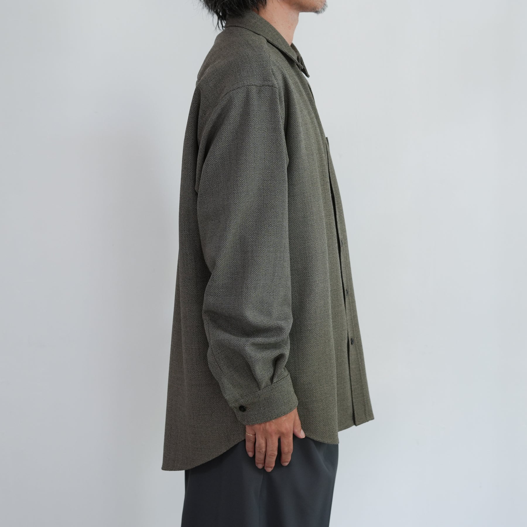 ゆったりとしたボックスシルエットのレギュラーシャツです。KHAKI、BROWNの糸を交織した奥行きのある色合いのウールカラミ素材は肉感、弾力がありウール独特のシャリ感のある新鮮な表情の素材です。