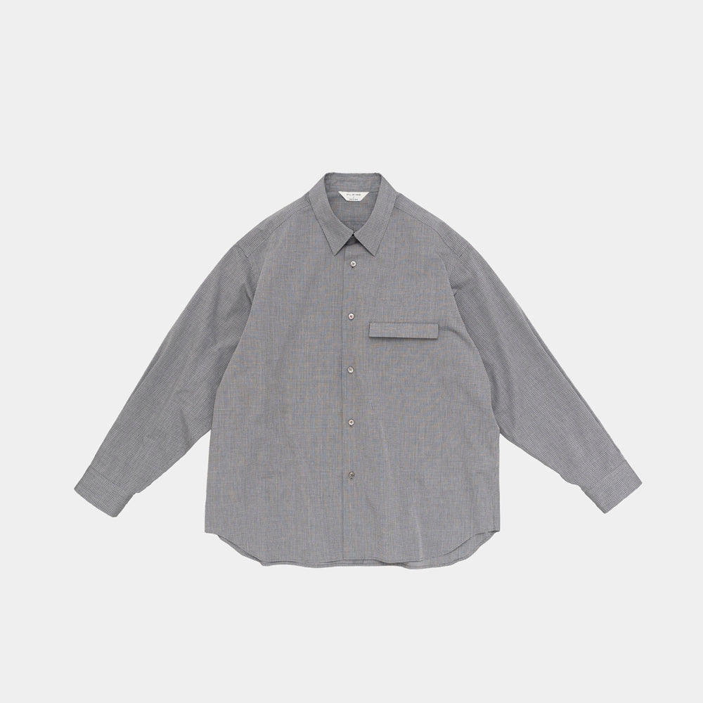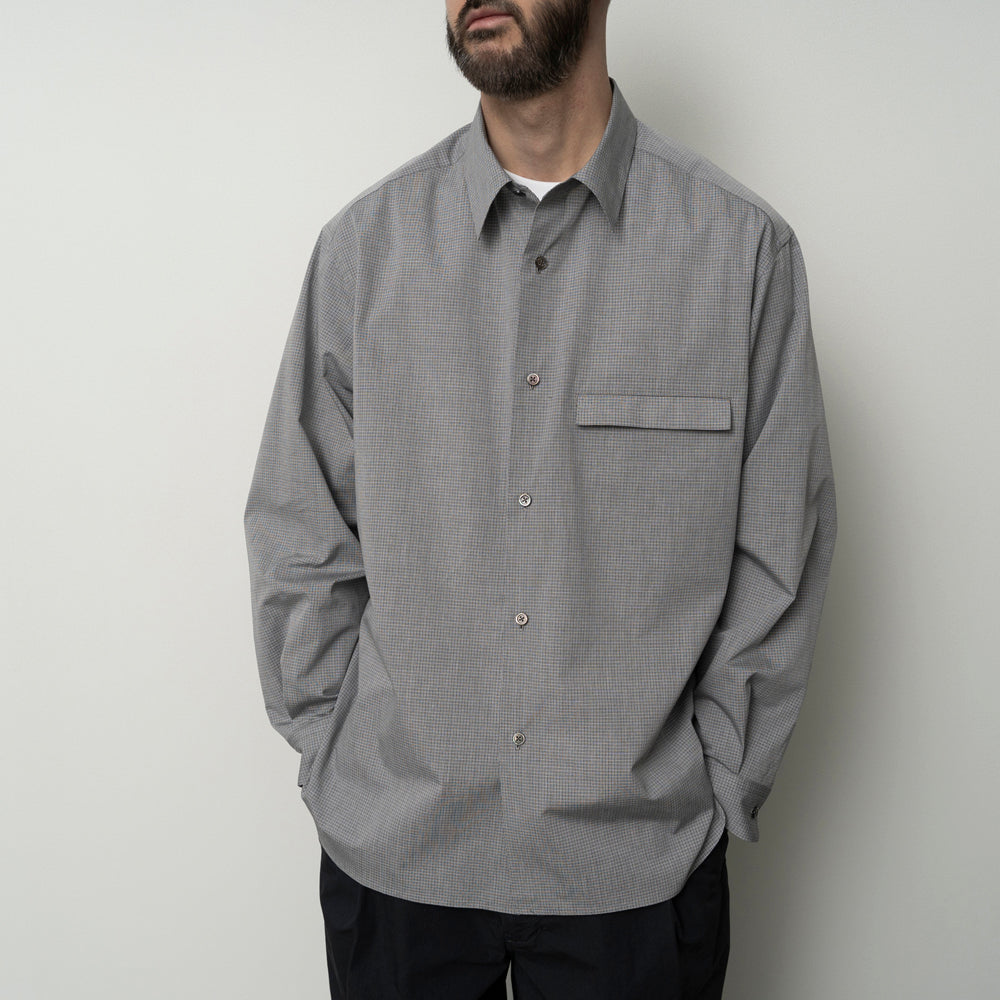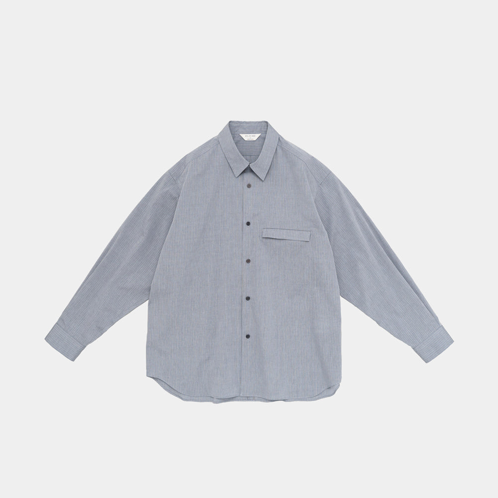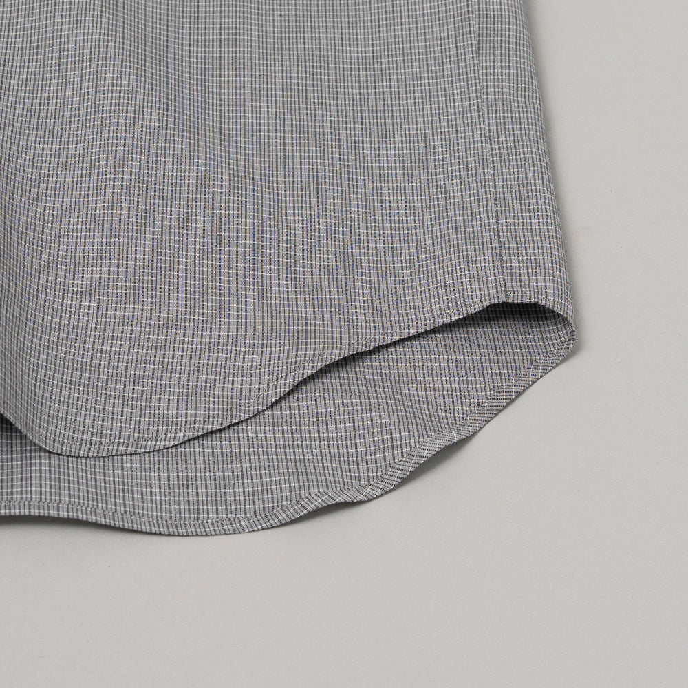 サイズ感はゆったり目で、緯糸に2色に糸を使用したチェック柄とブルーストライプはあえて濃いめのグレーを使用することで上から染めた様な印象になるようにしています。