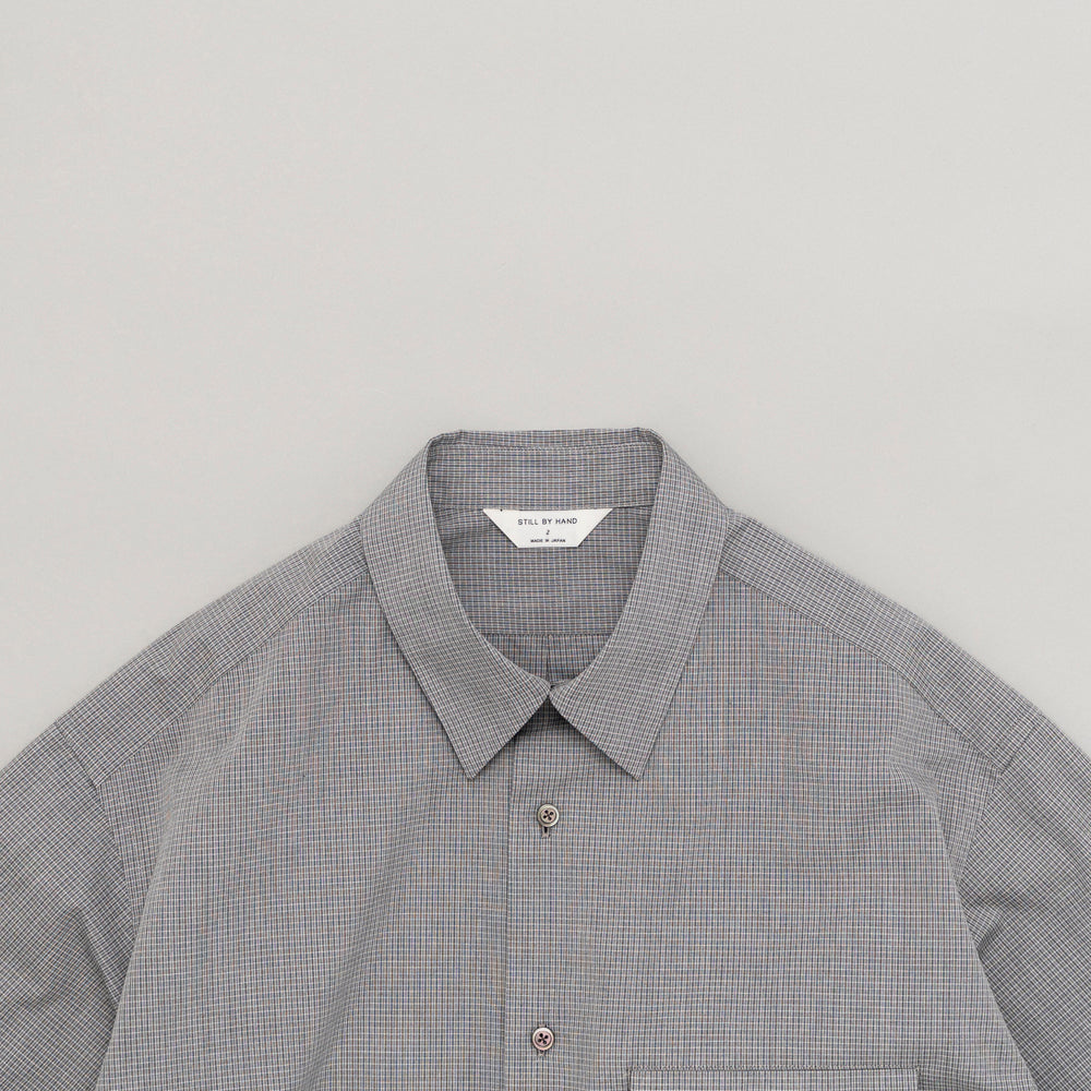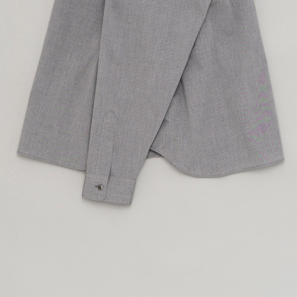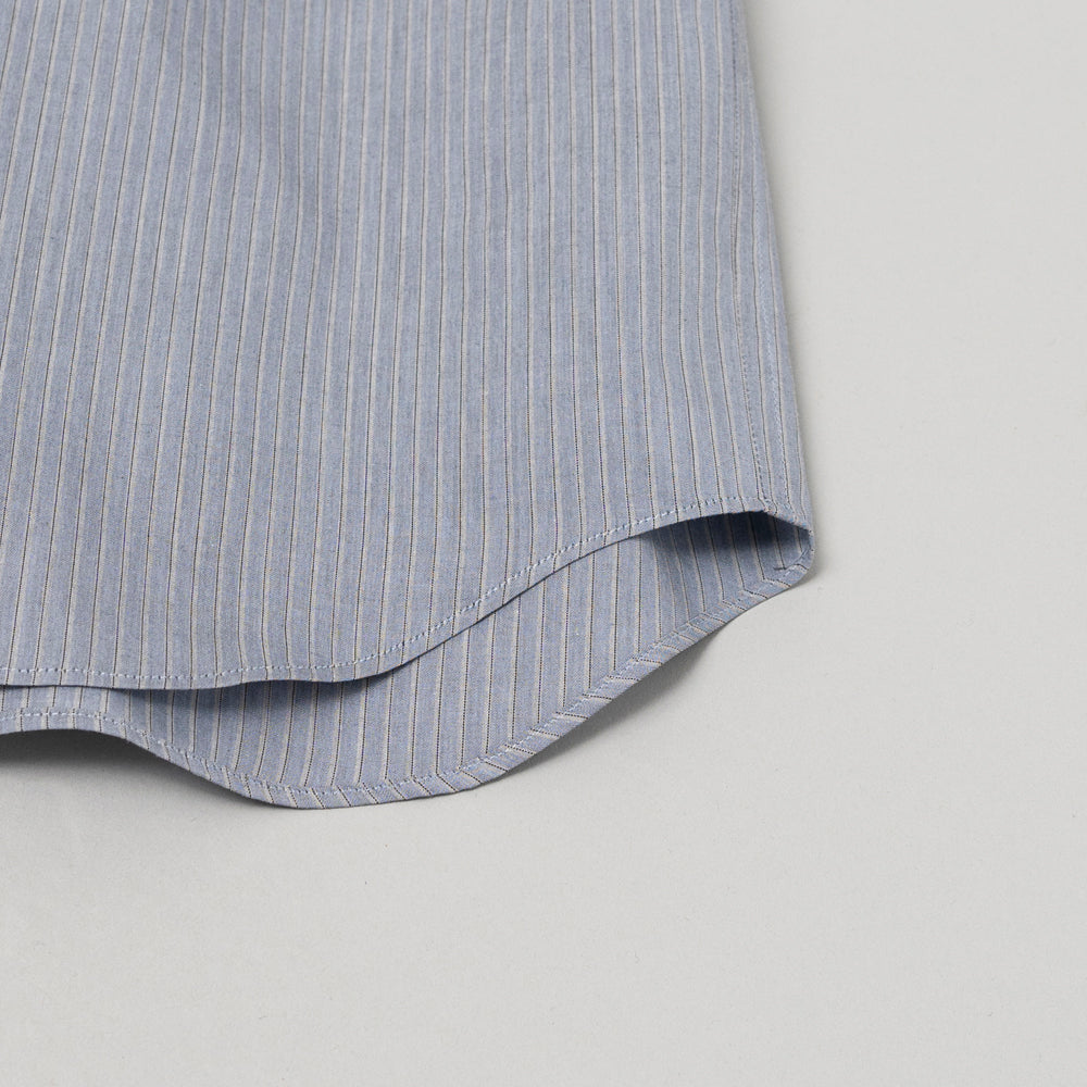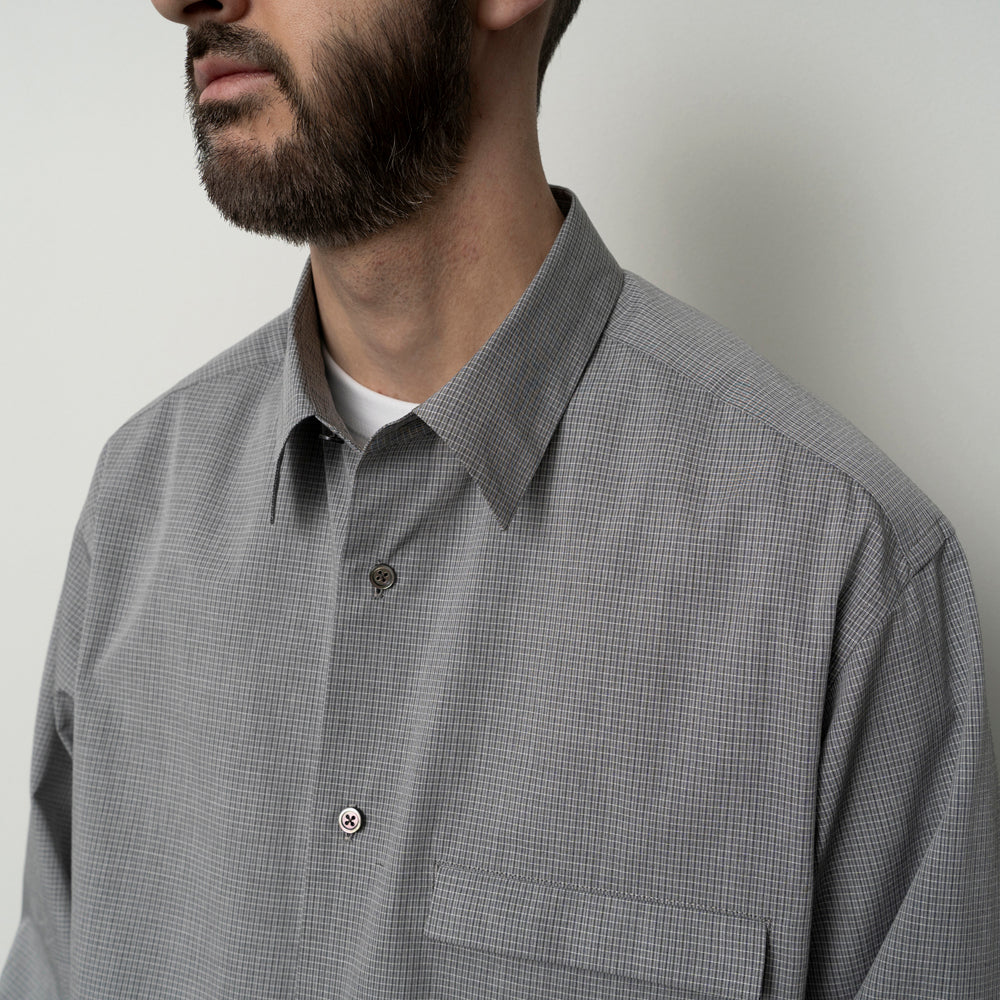 サイズ感はゆったり目で、緯糸に2色に糸を使用したチェック柄とブルーストライプはあえて濃いめのグレーを使用することで上から染めた様な印象になるようにしています。