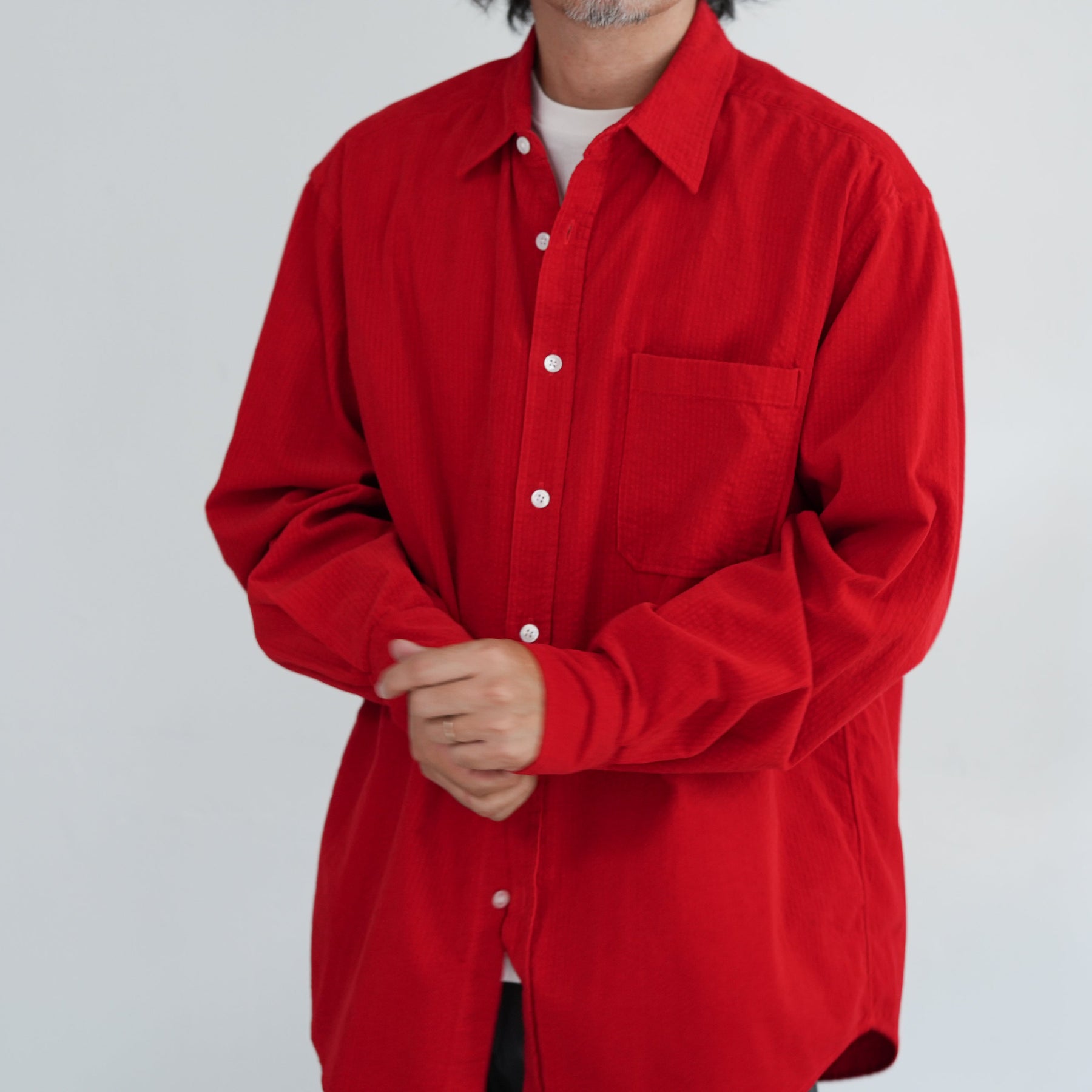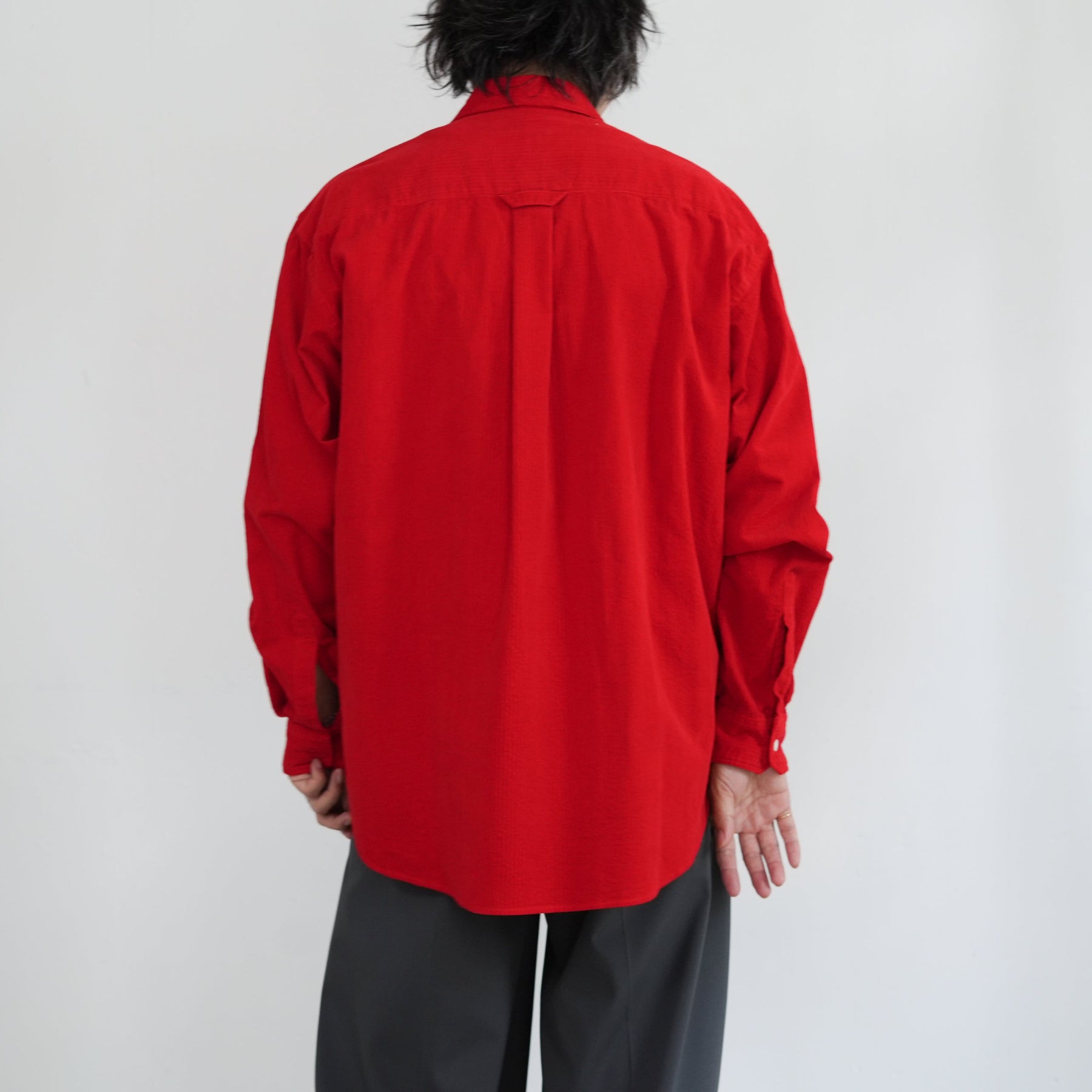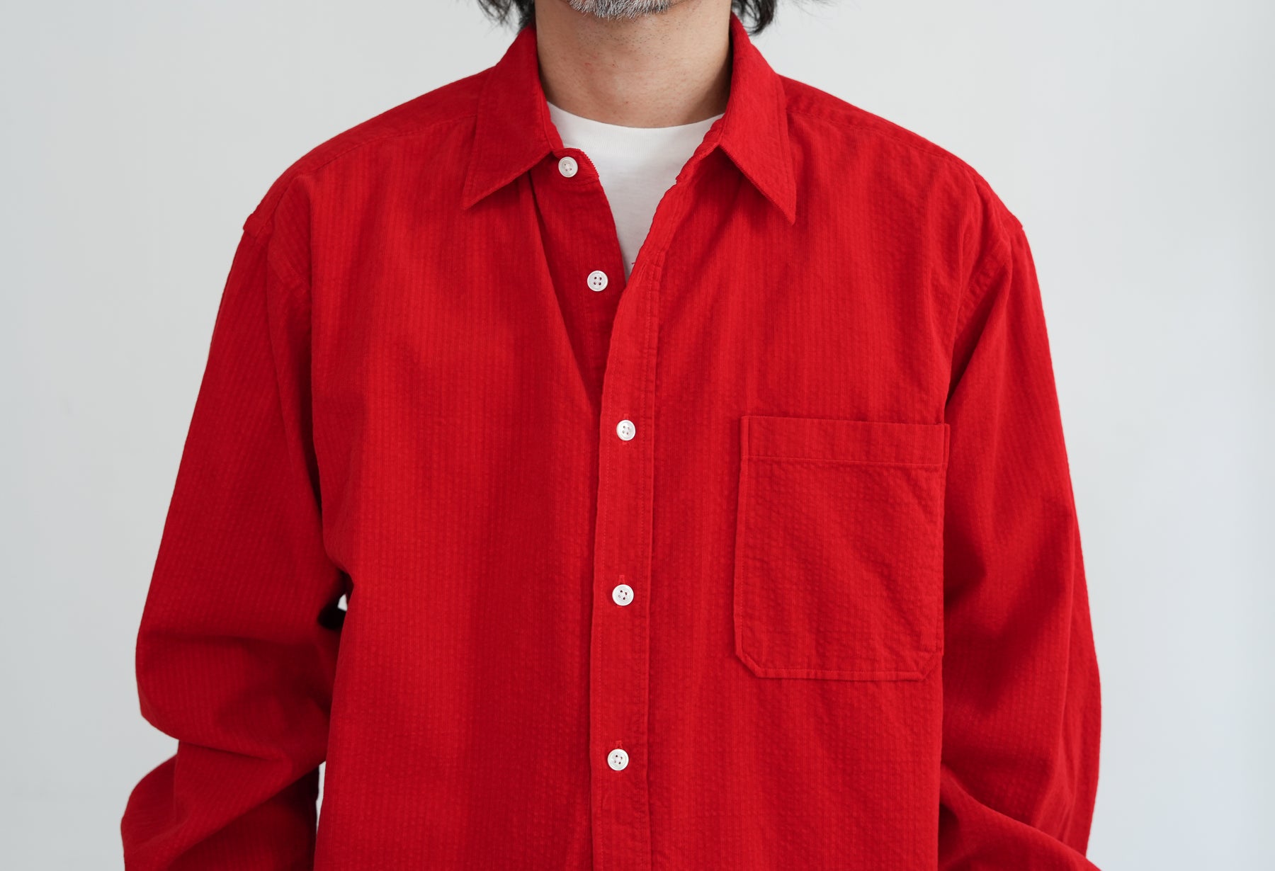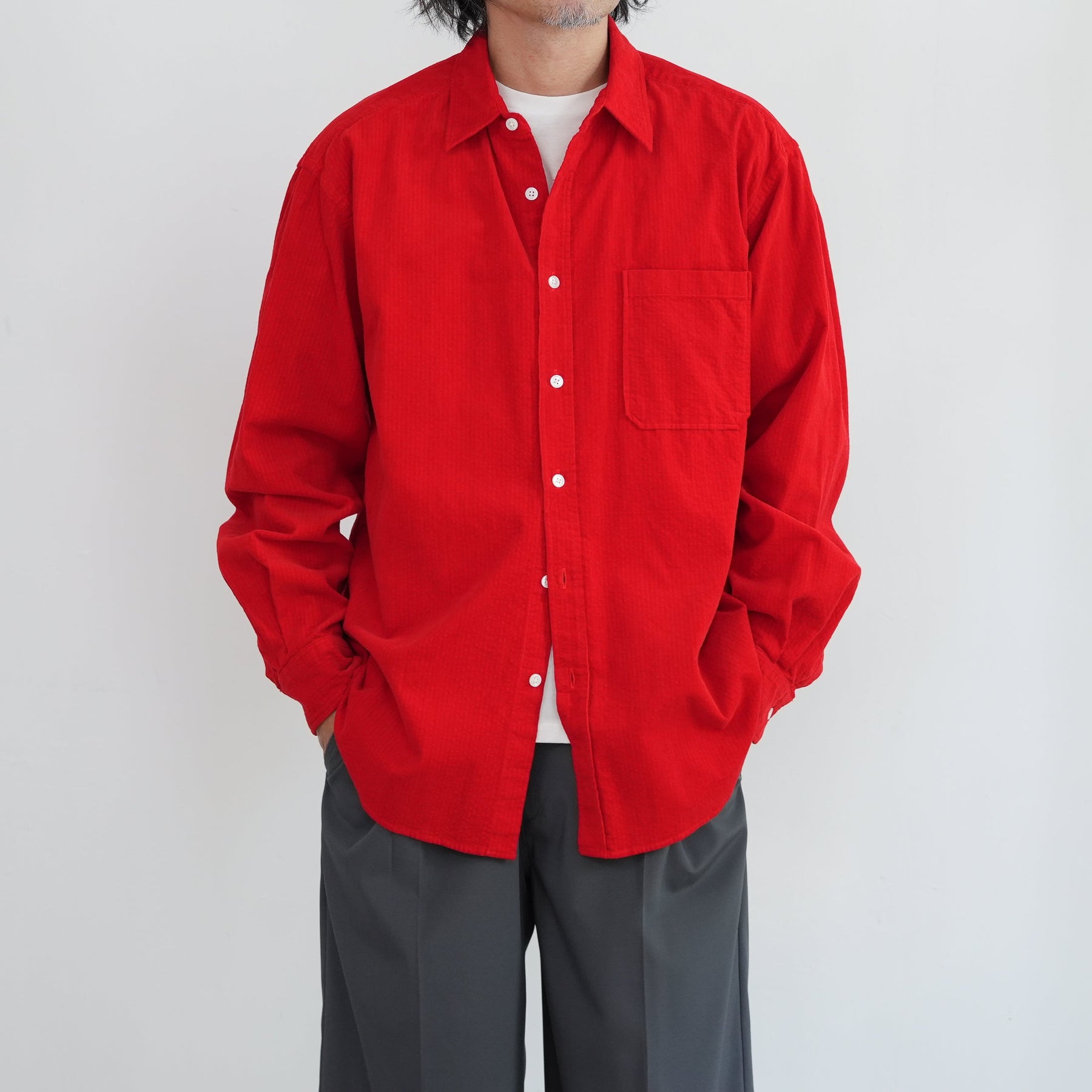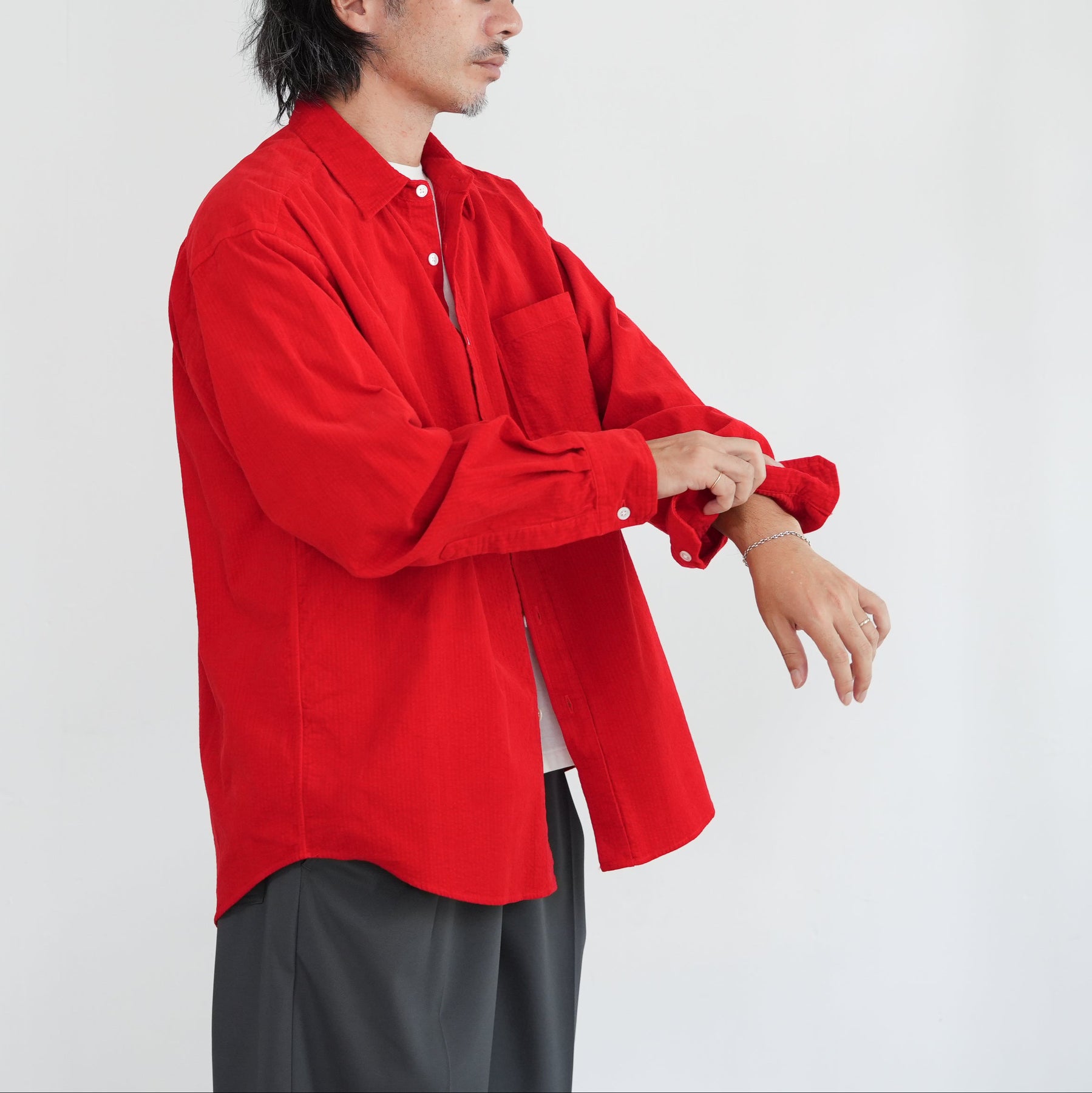 ゆったりとしたボックスシルエットのレギュラーシャツです。細畝のコーデュロイ素材にリップル加工を施し、横や斜めに入るランダムなシワ感、凹凸のある表面が印象的です。製品染めを行なったREDカラーはヴィンテージシャツの様なこなれ感とコーデュロイの程よい肉感を持ち合わせたシャツです。