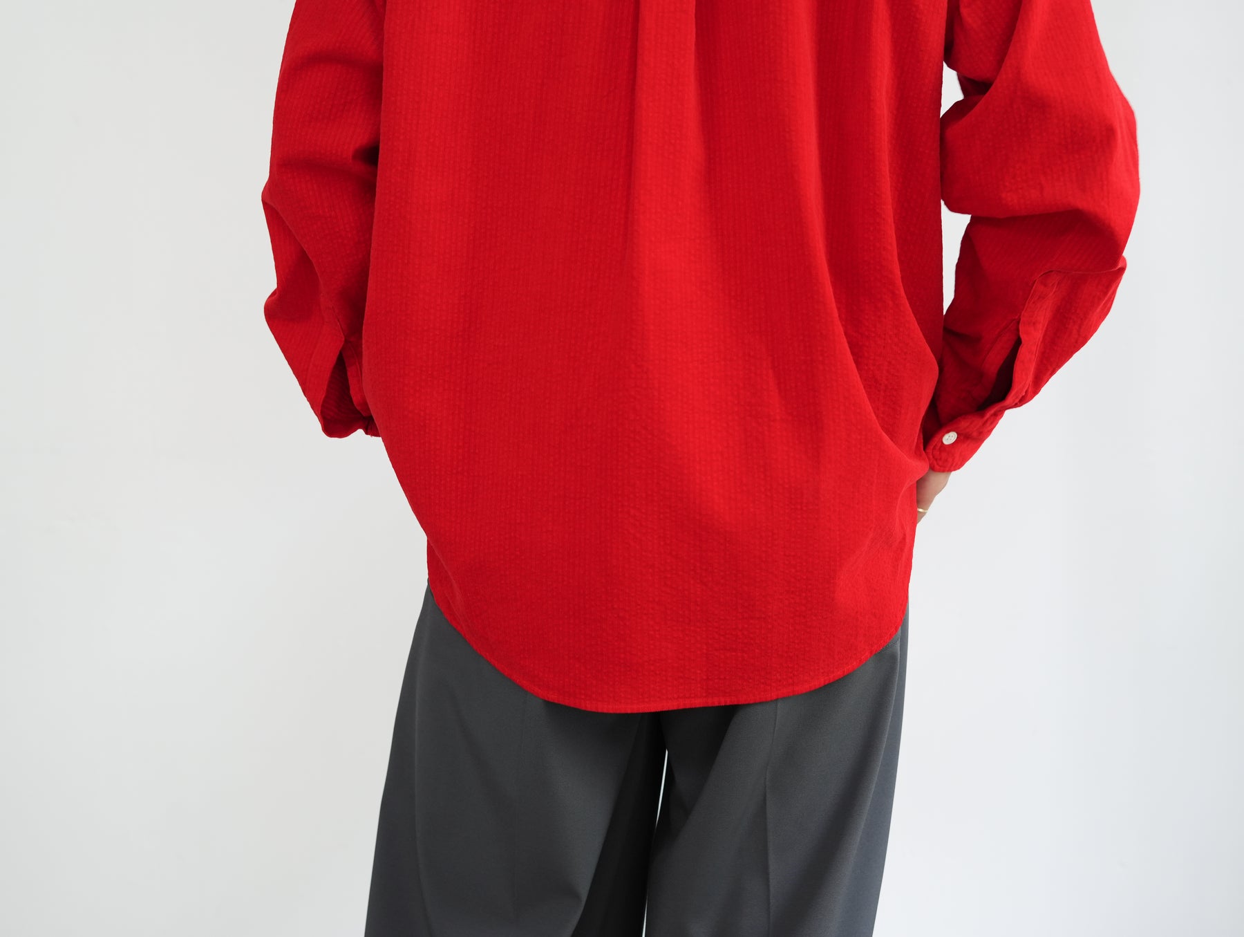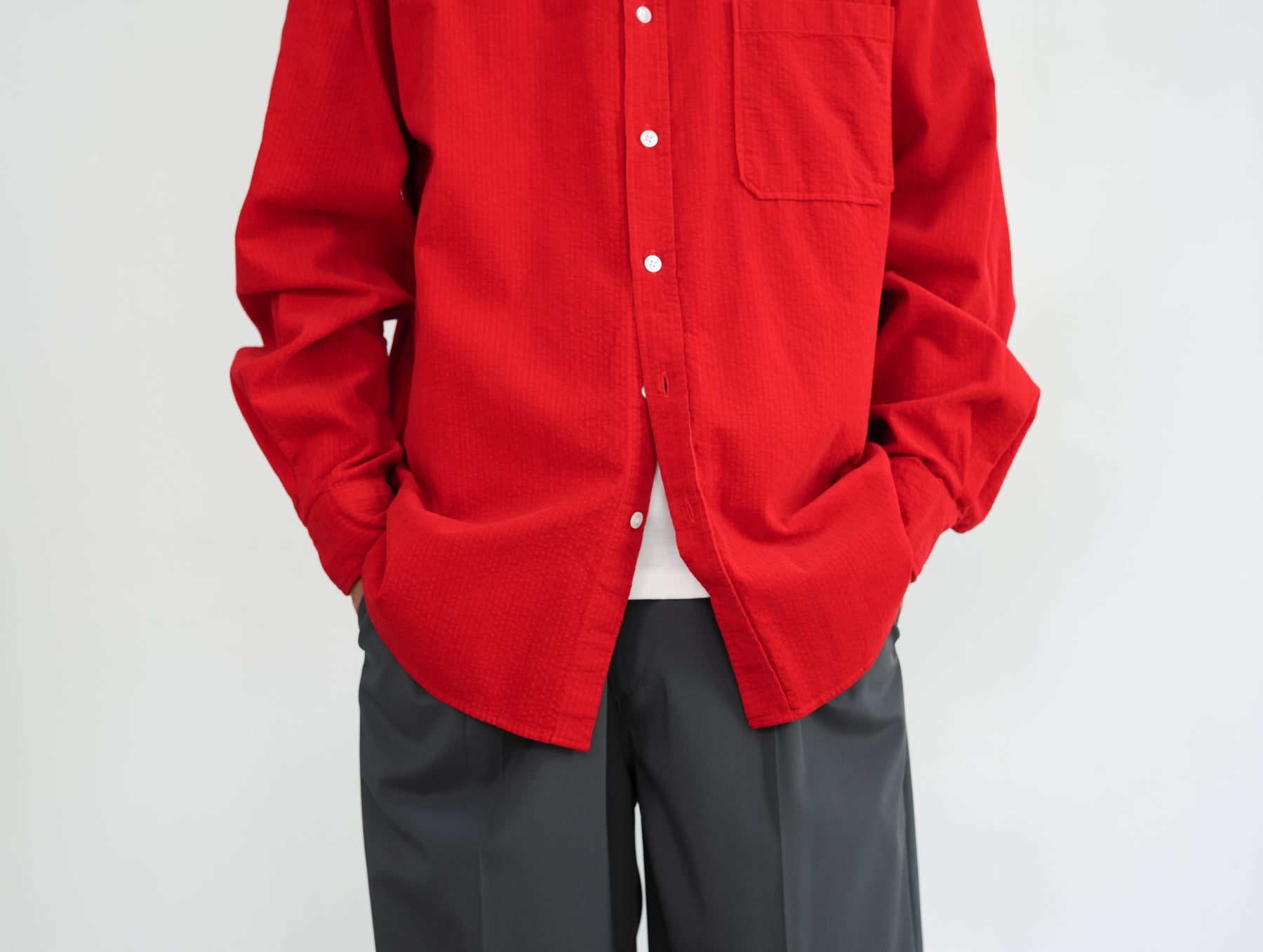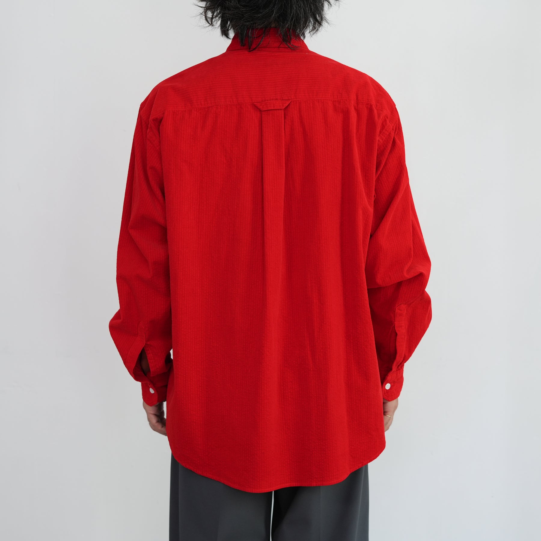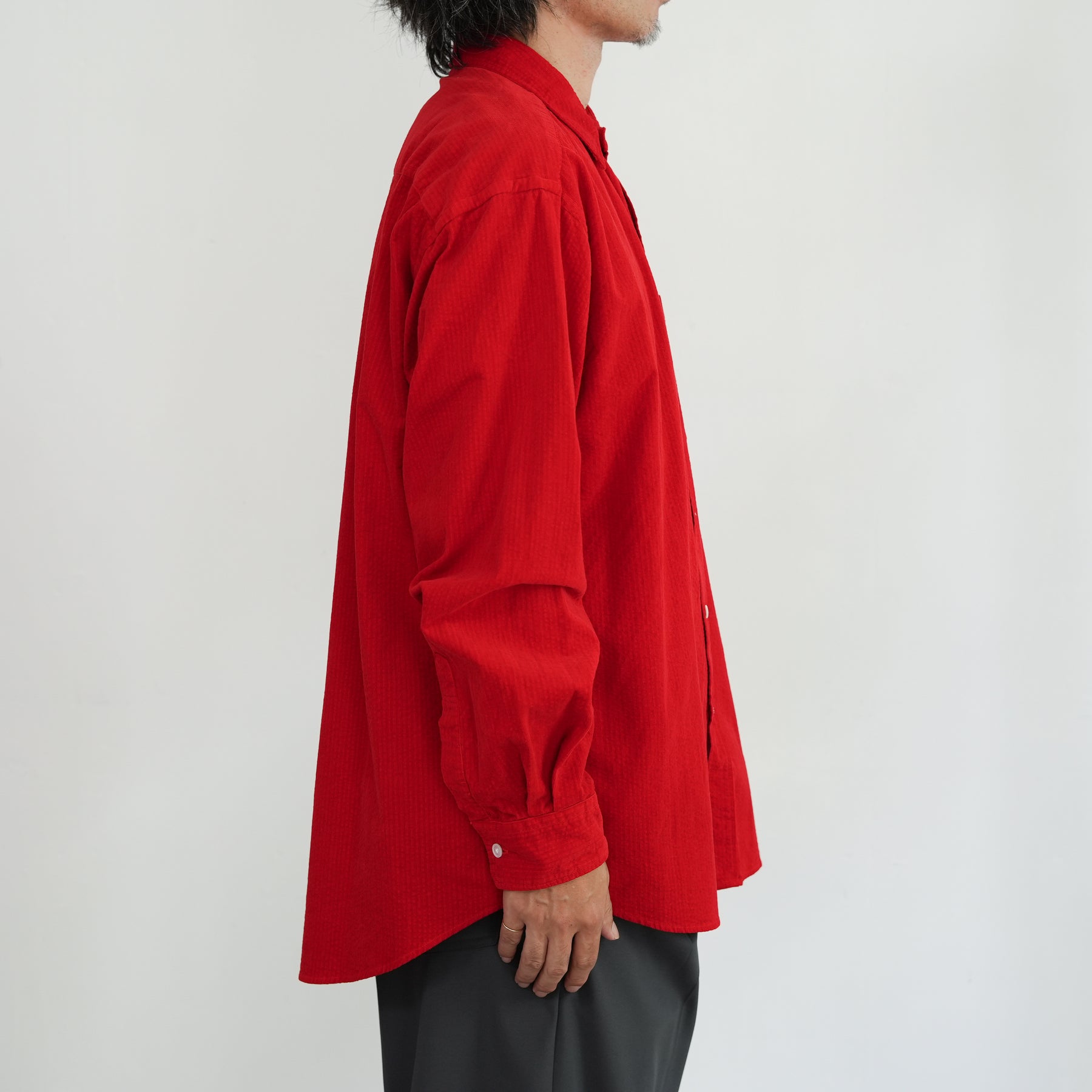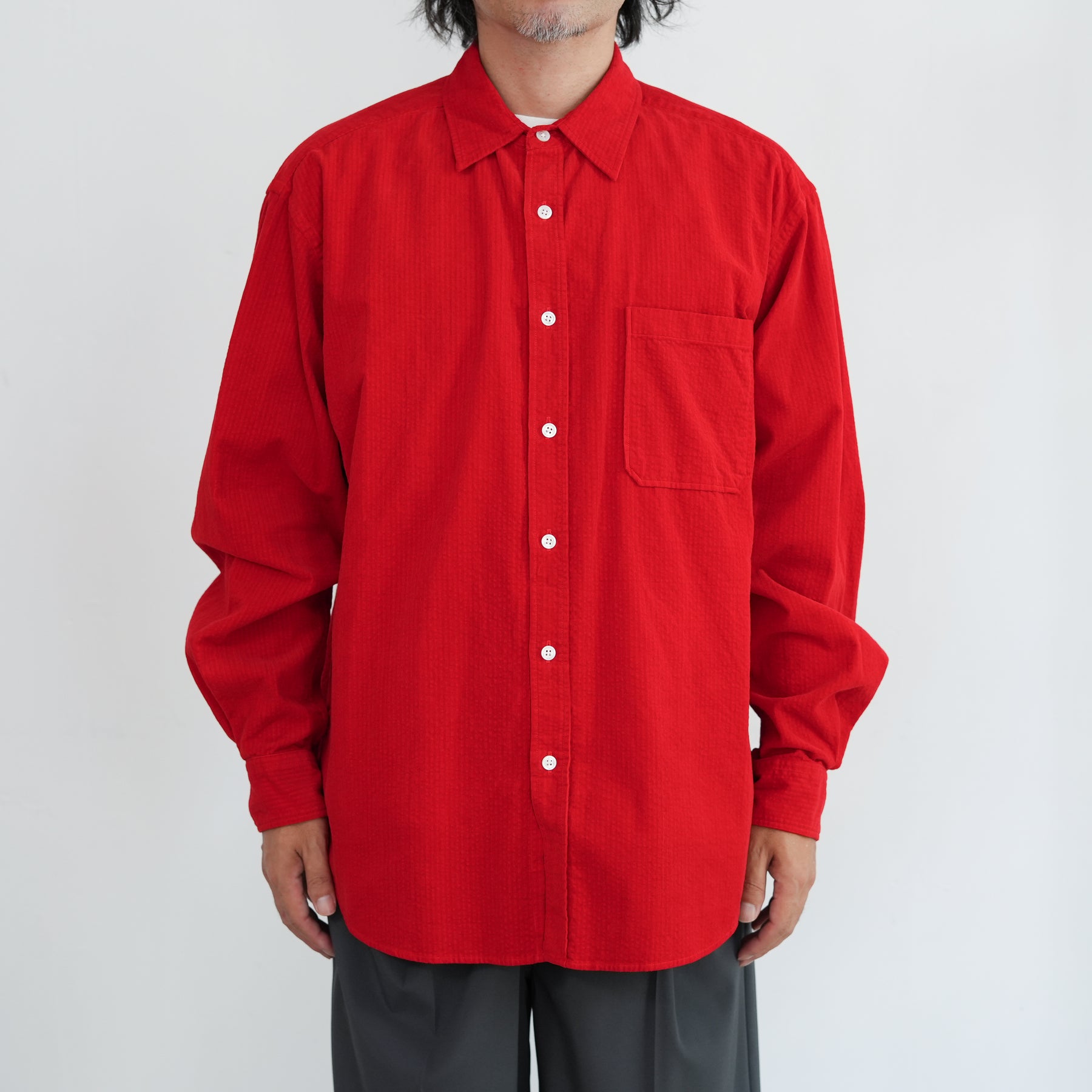 ゆったりとしたボックスシルエットのレギュラーシャツです。細畝のコーデュロイ素材にリップル加工を施し、横や斜めに入るランダムなシワ感、凹凸のある表面が印象的です。製品染めを行なったREDカラーはヴィンテージシャツの様なこなれ感とコーデュロイの程よい肉感を持ち合わせたシャツです。