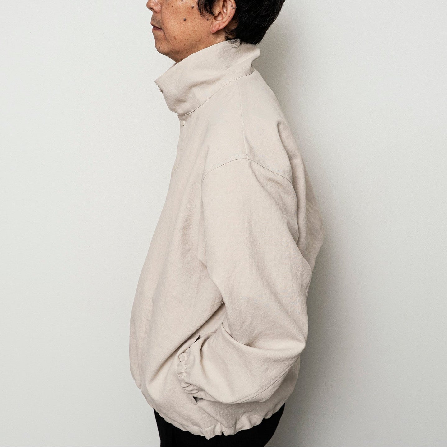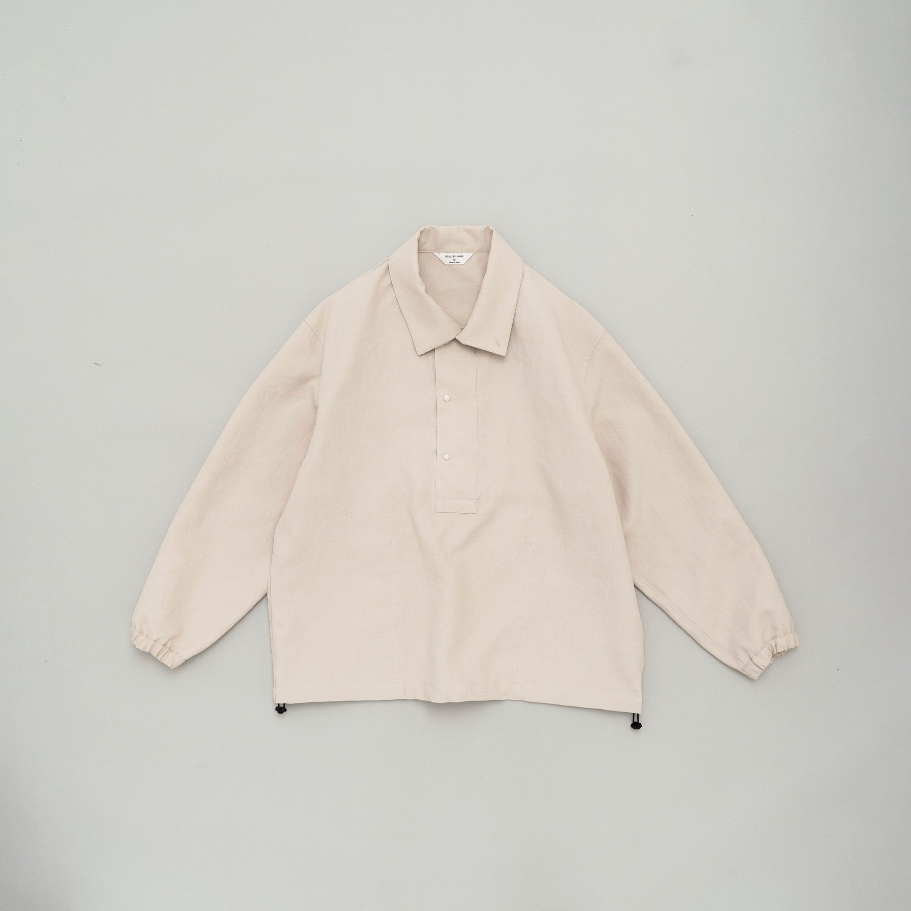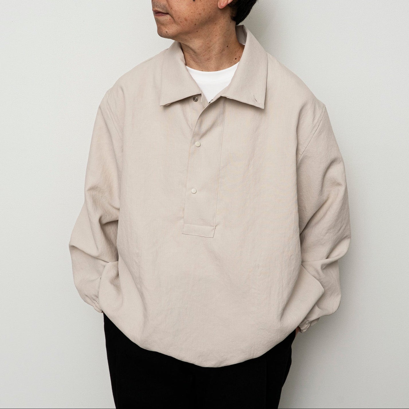 軽量に拘ったパッカブルタイプのアノラック。コットンライクに見えるタスラン糸を使用した素材で撥水性にも優れています。太目の前立てが特徴ですが、同色のドット釦を打つことでミニマムな印象です。スポーティー過ぎない雰囲気を意識して製作しました。