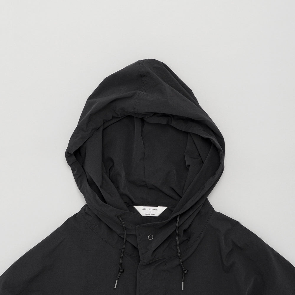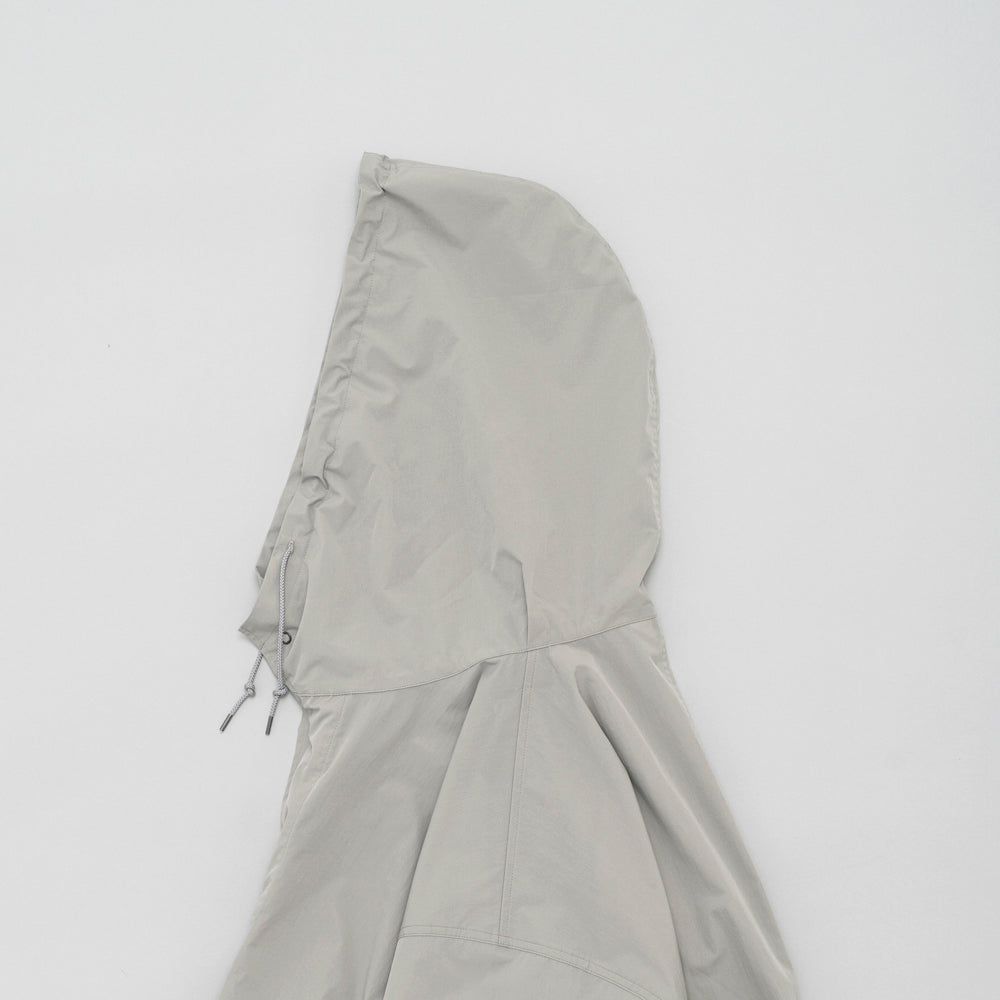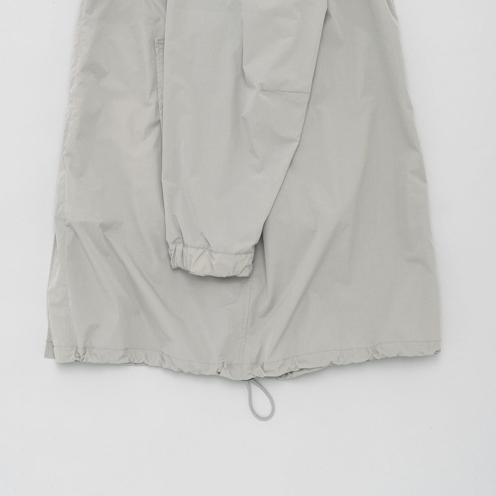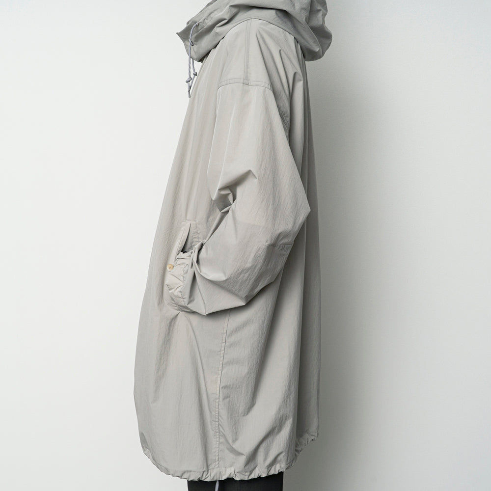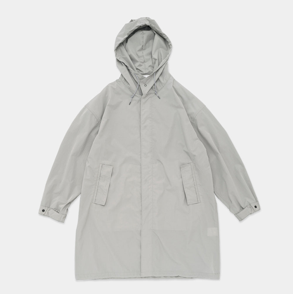 撥水性のあるナイロン素材を使用したフードコート。軍物のスノーパーカーのDETAILを参考にしたフード周りのバランスがポイント。生地で特殊加工をしており薄く軽いけどしっかりハリ感のある素材感です。素材の軽さを活かして丈は長めです。
