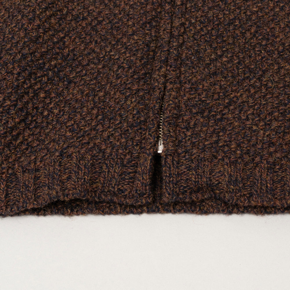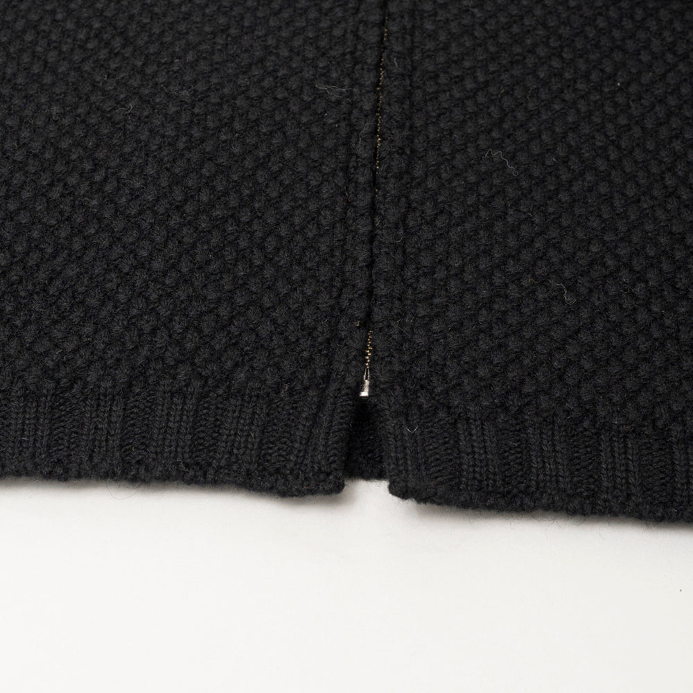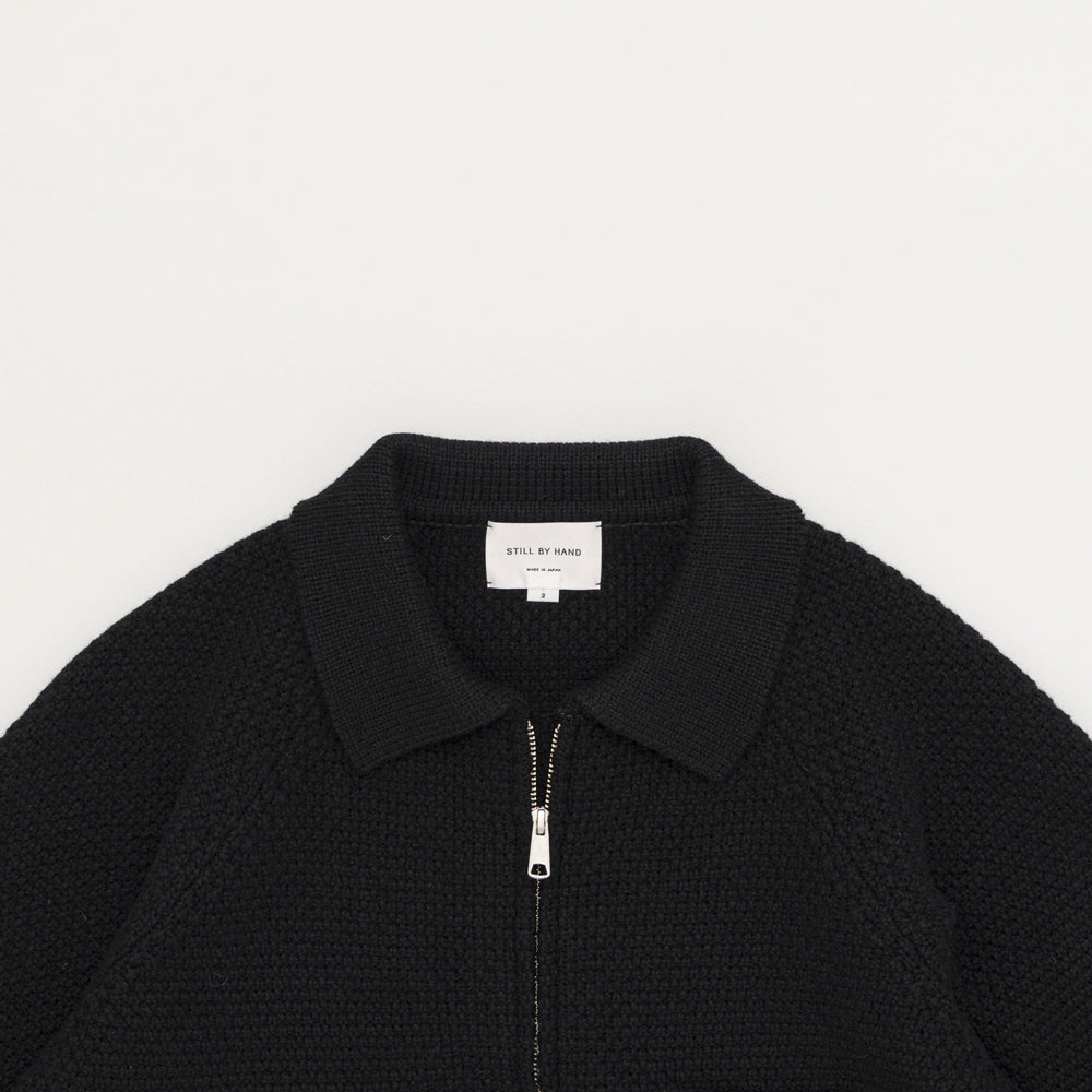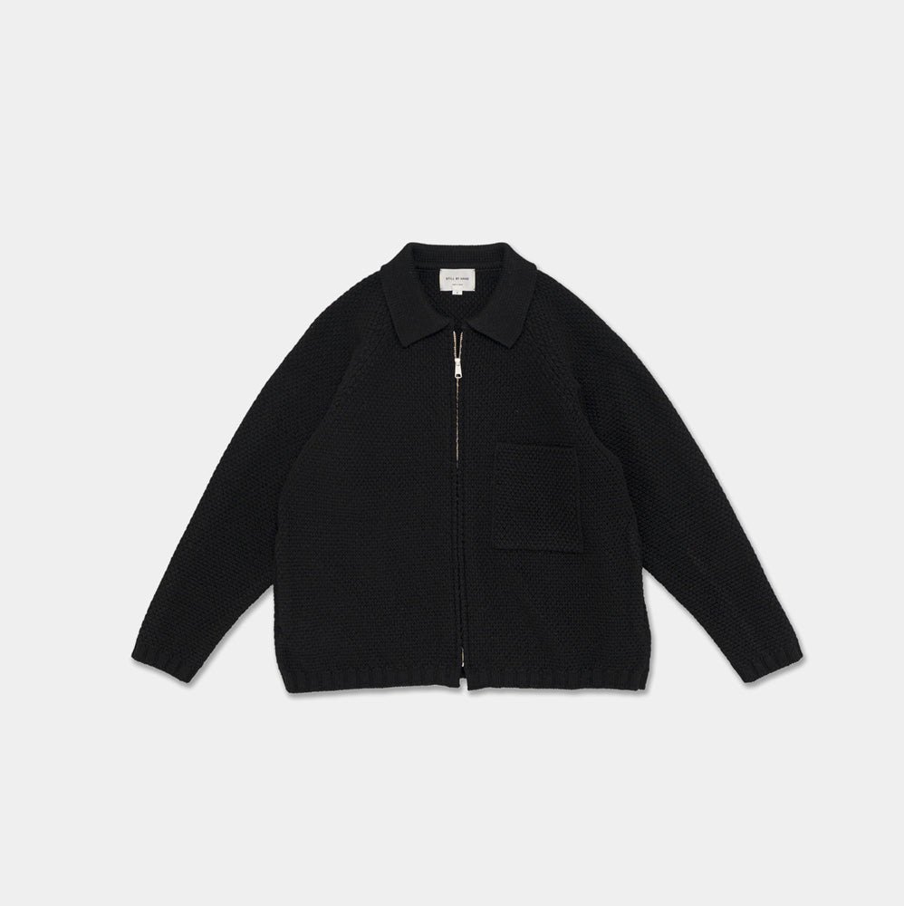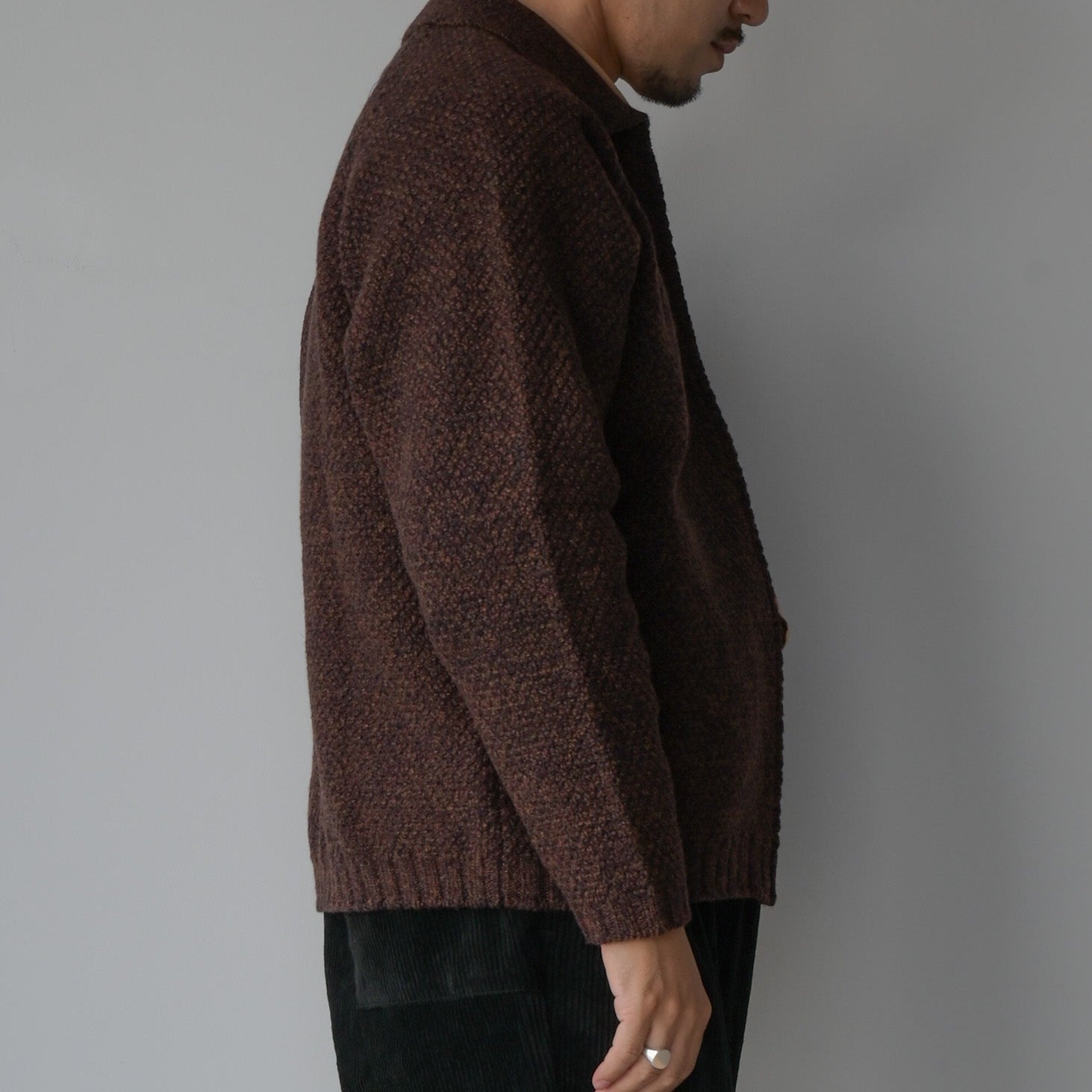 凹凸感のある編み地のショートブルゾンで胸ポケットに大きめのパッチポケットと脇にハンドウォーマーポケットをつけています。