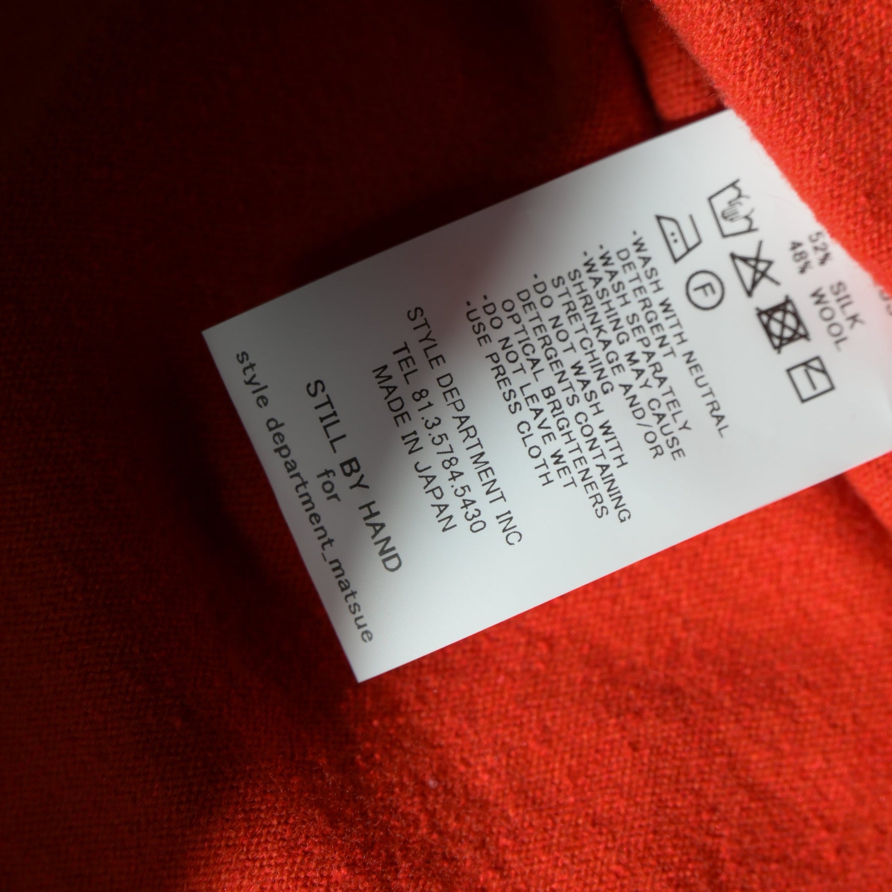 style department_mastue 一周年を記念して、STILL BY HNADにカラー別注しました。インラインにはないややオレンジよりの鮮やかなレッドです。秋冬のコーディネートのアクセントになり重宝します。サイズ感はインラインと同じで、大きすぎなく、女性の方でも着用いただけます。