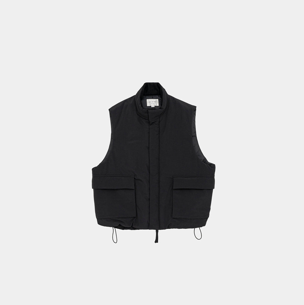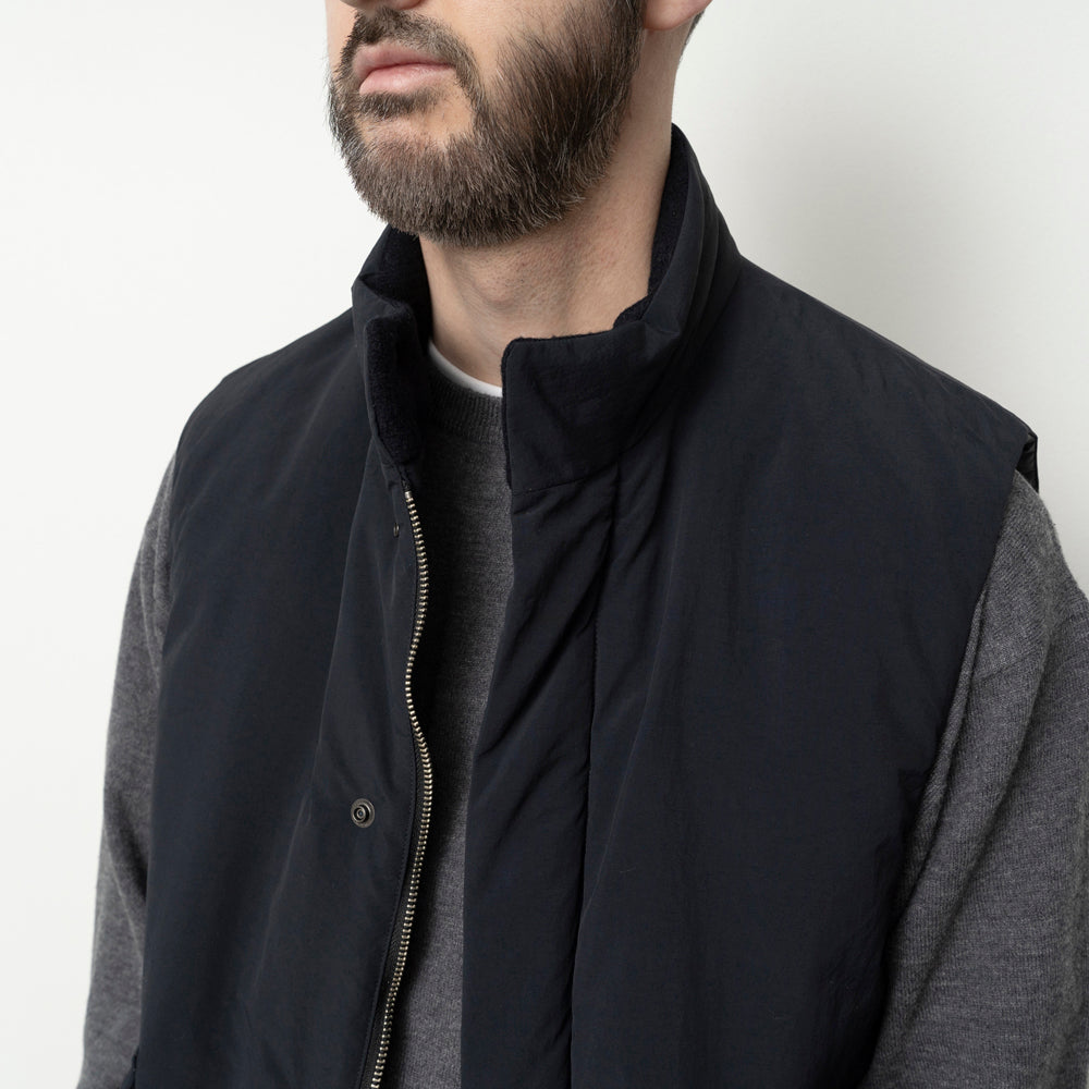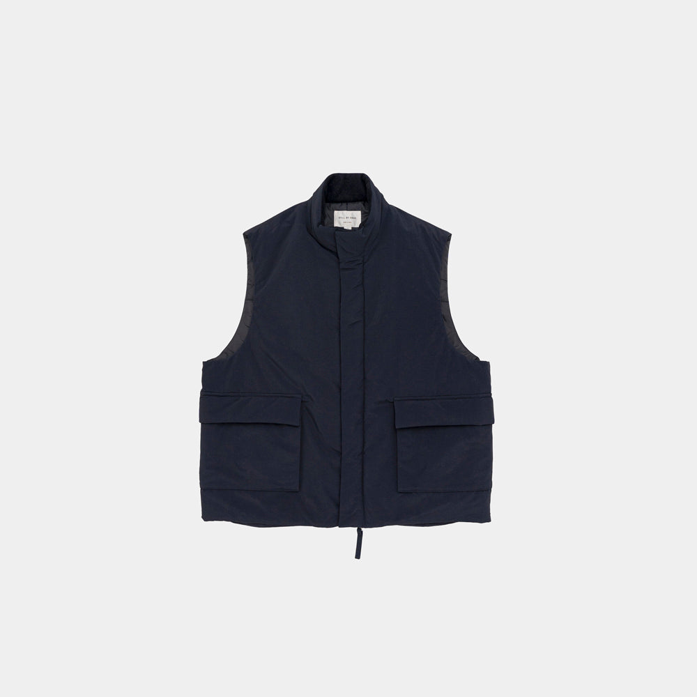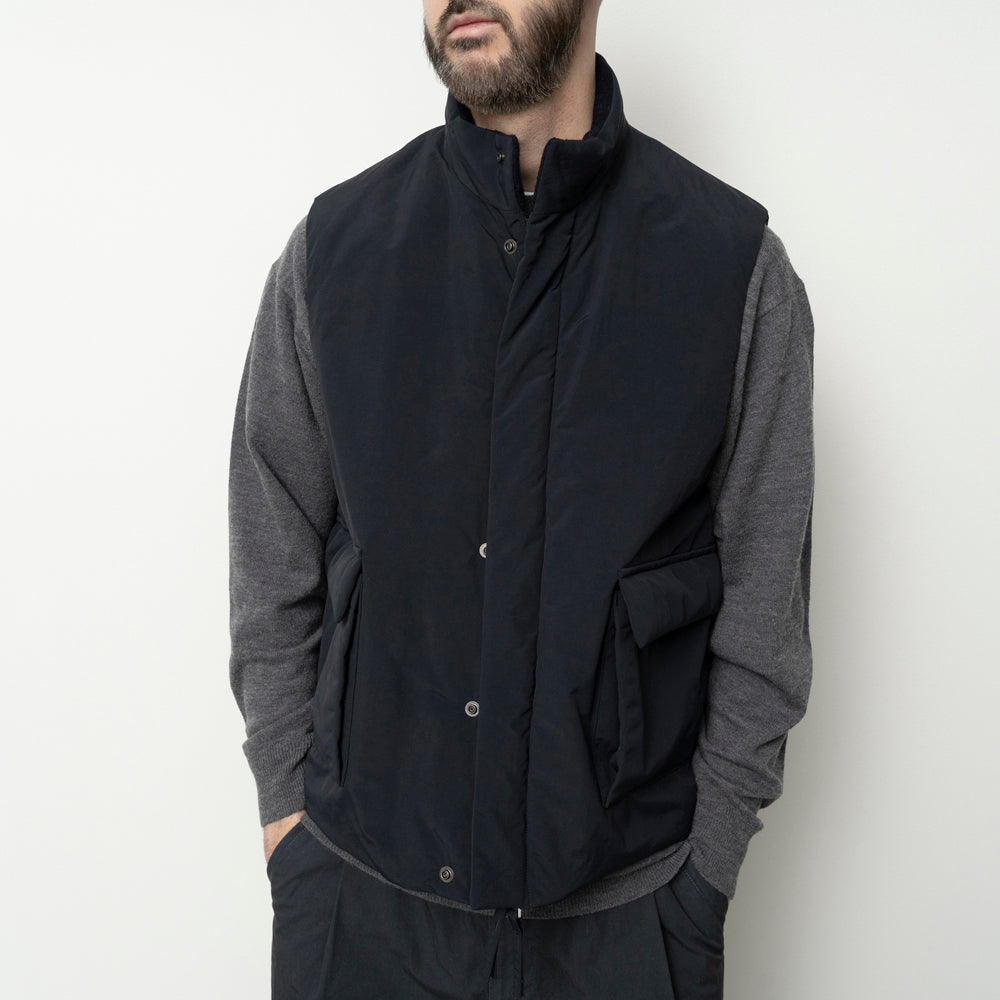 表地は表情のあるナイロン素材を採用し、スポーツ感を抑えた機能性中綿入りのアウターベスト。