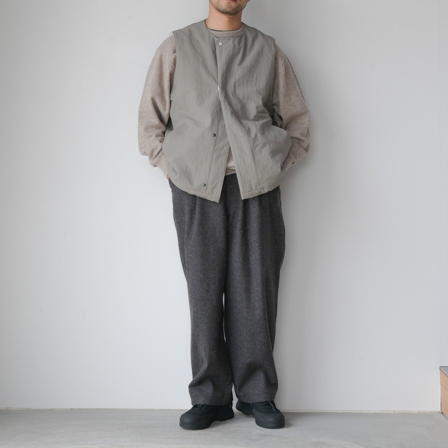 クルーネックのデザインで合わせやすいアウターベストに仕上がっています。