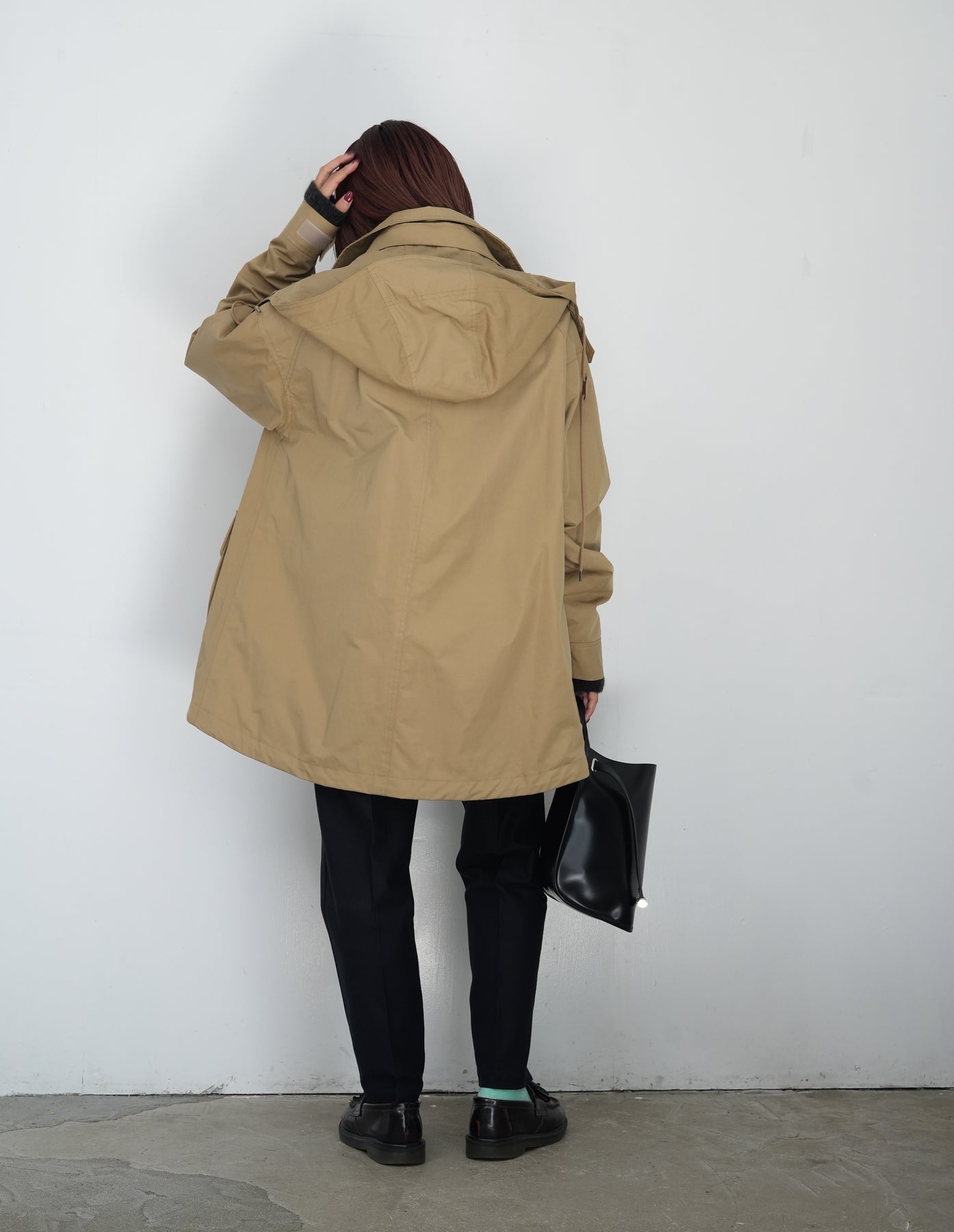 また前後に段差をつけた身丈の後ろ身頃はヒップが隠れる長さがあるので、