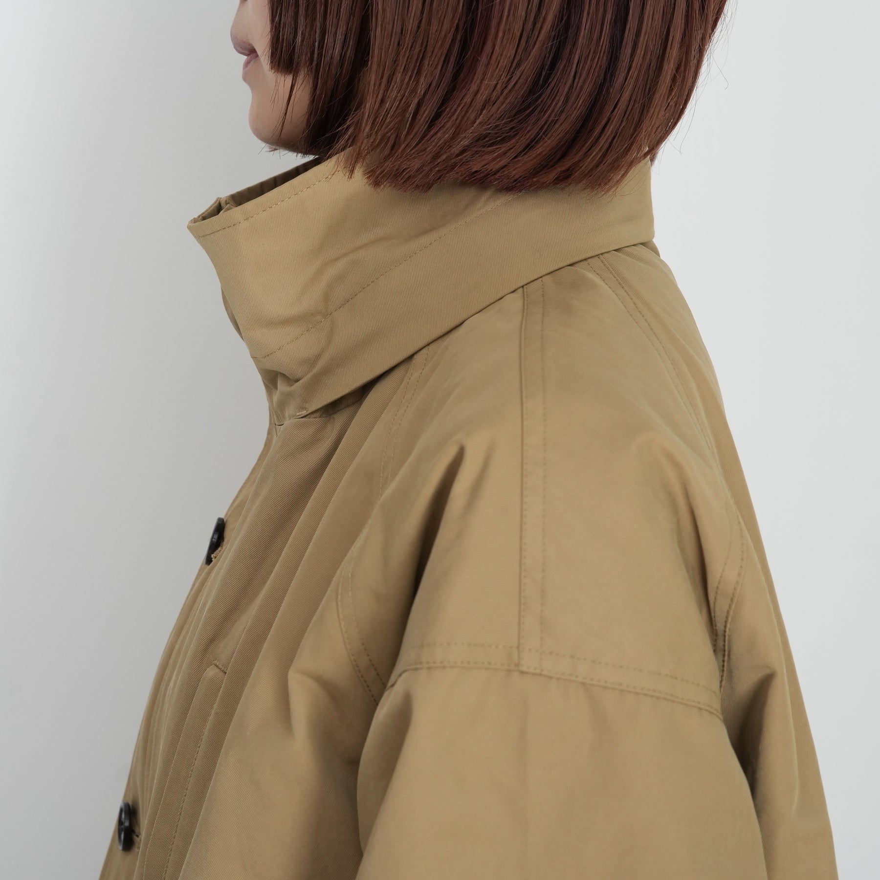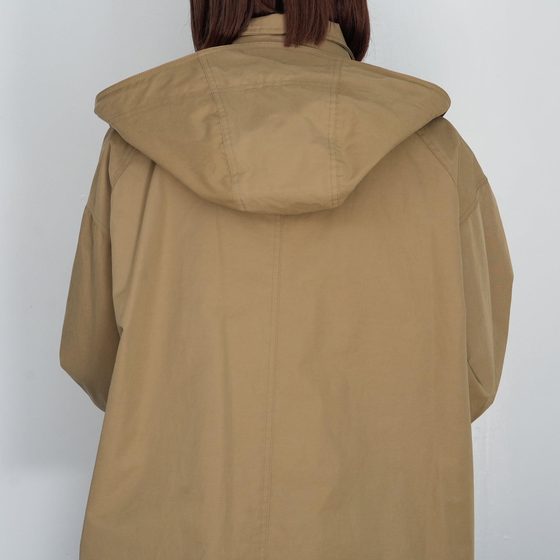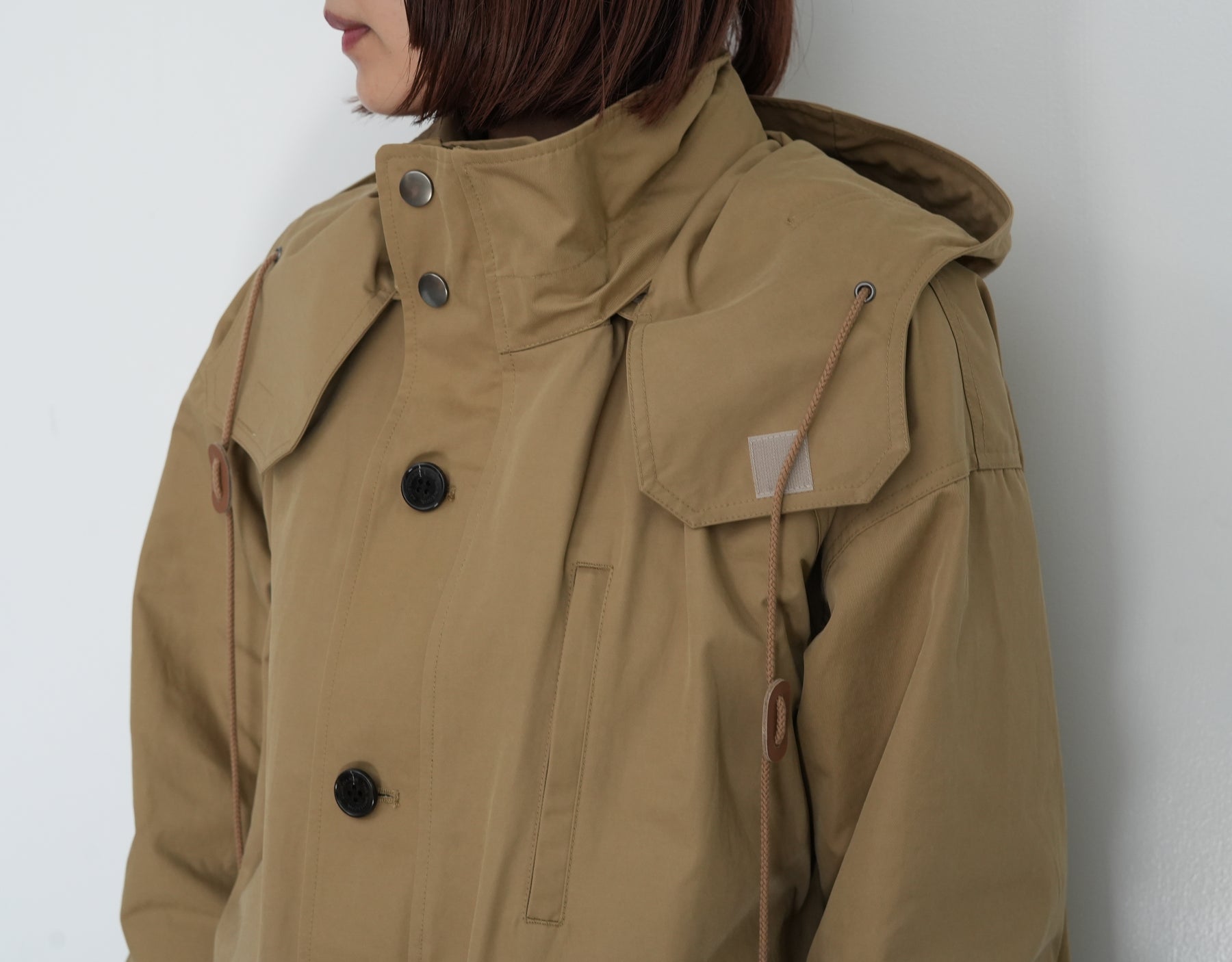 スタンドカラーの襟には取り外し可能なフードがついています。