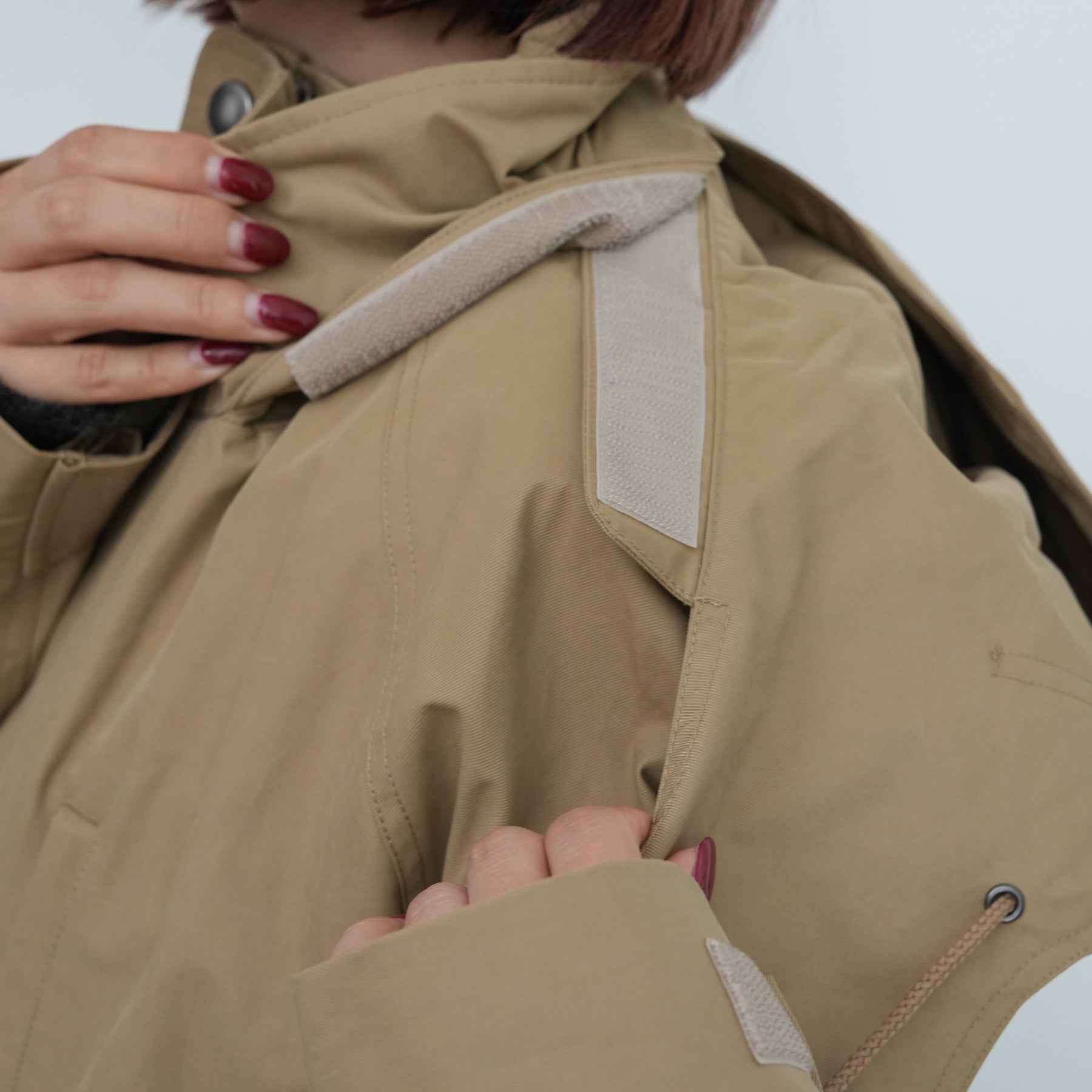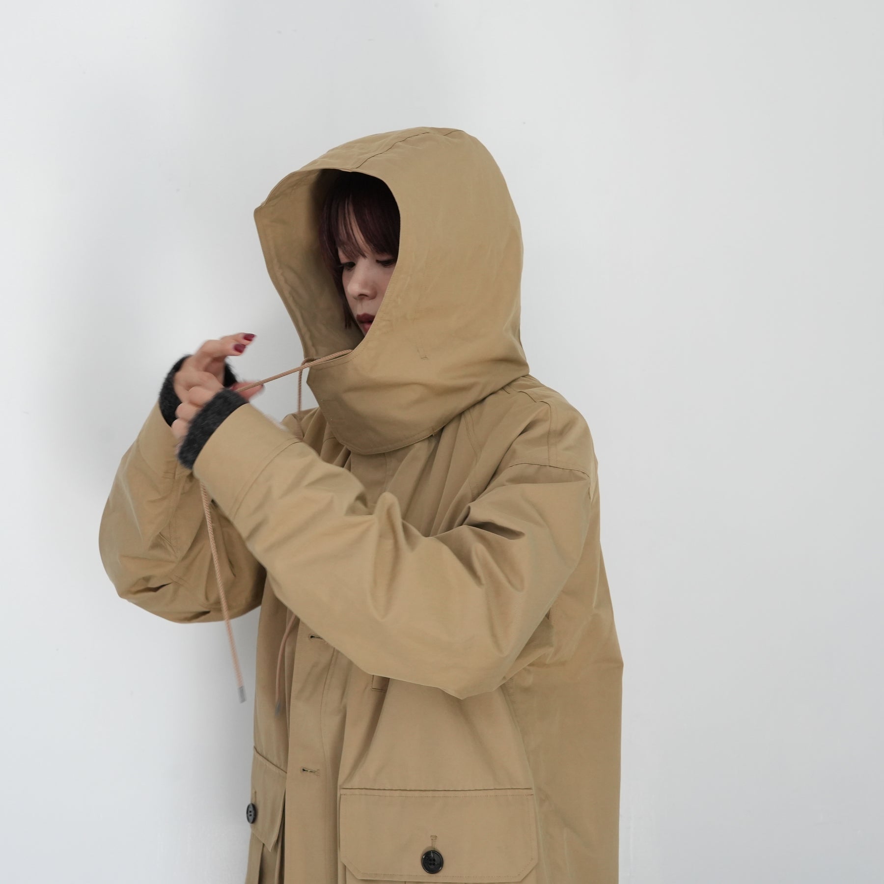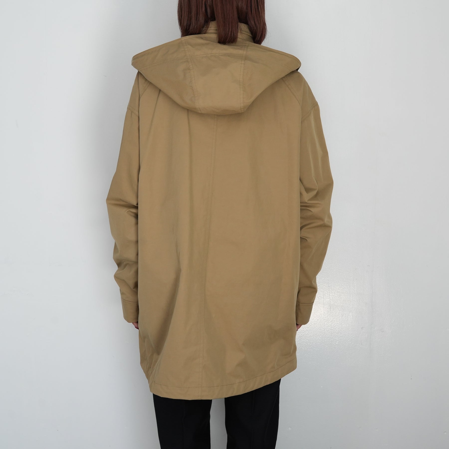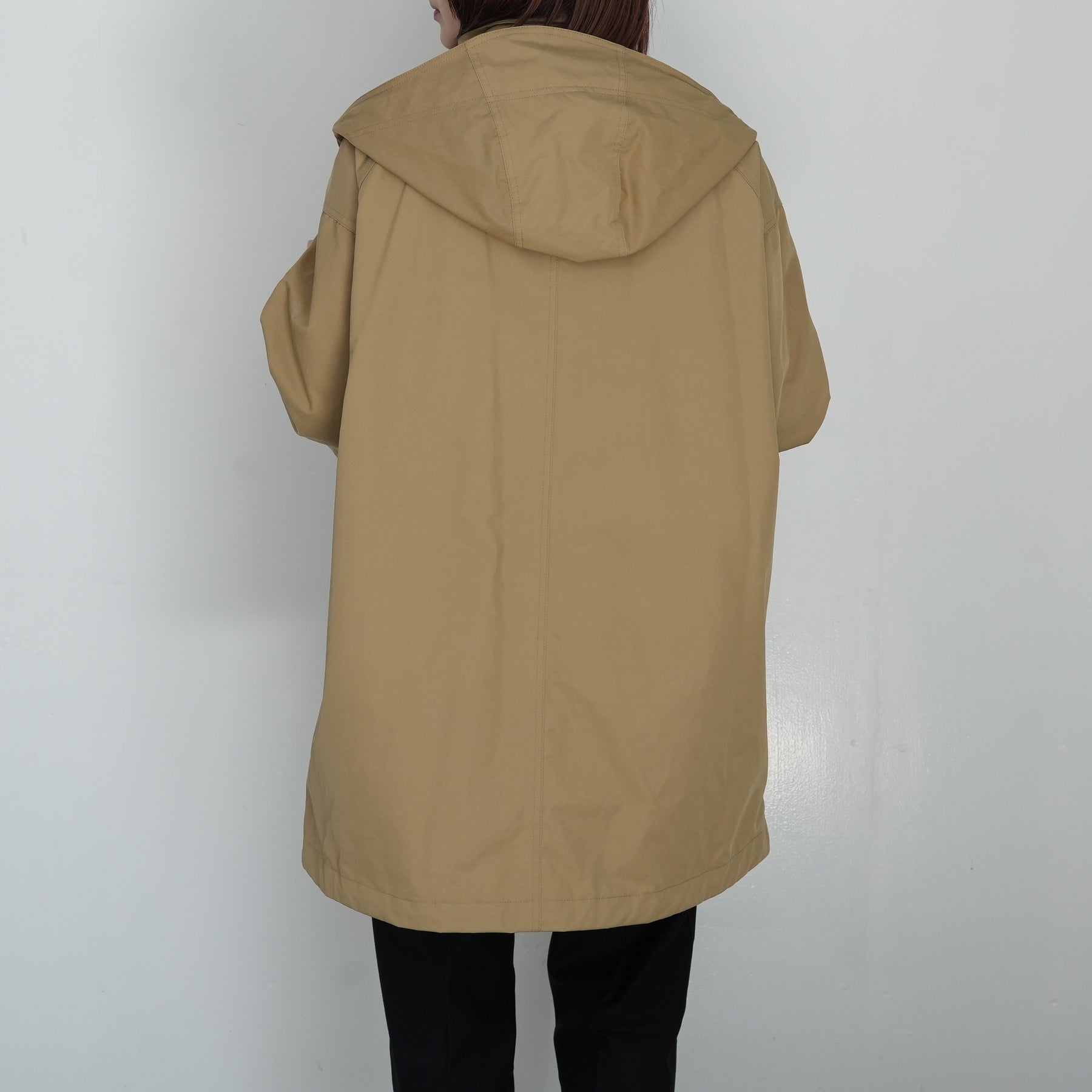 スタンドカラーの襟には取り外し可能なフードがついています。