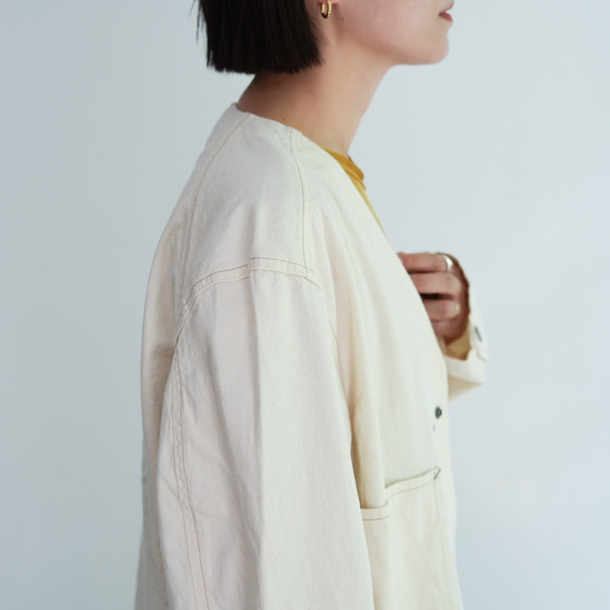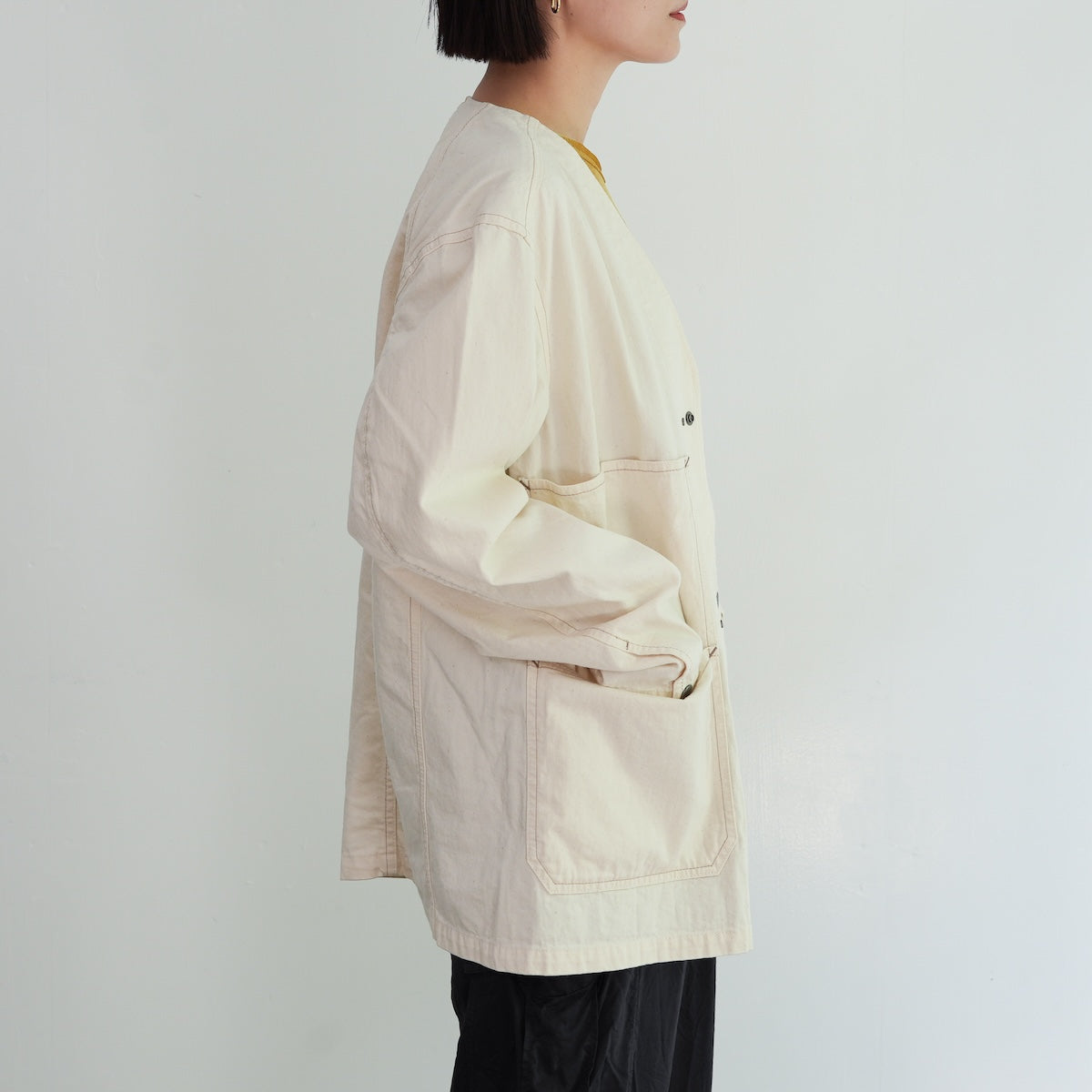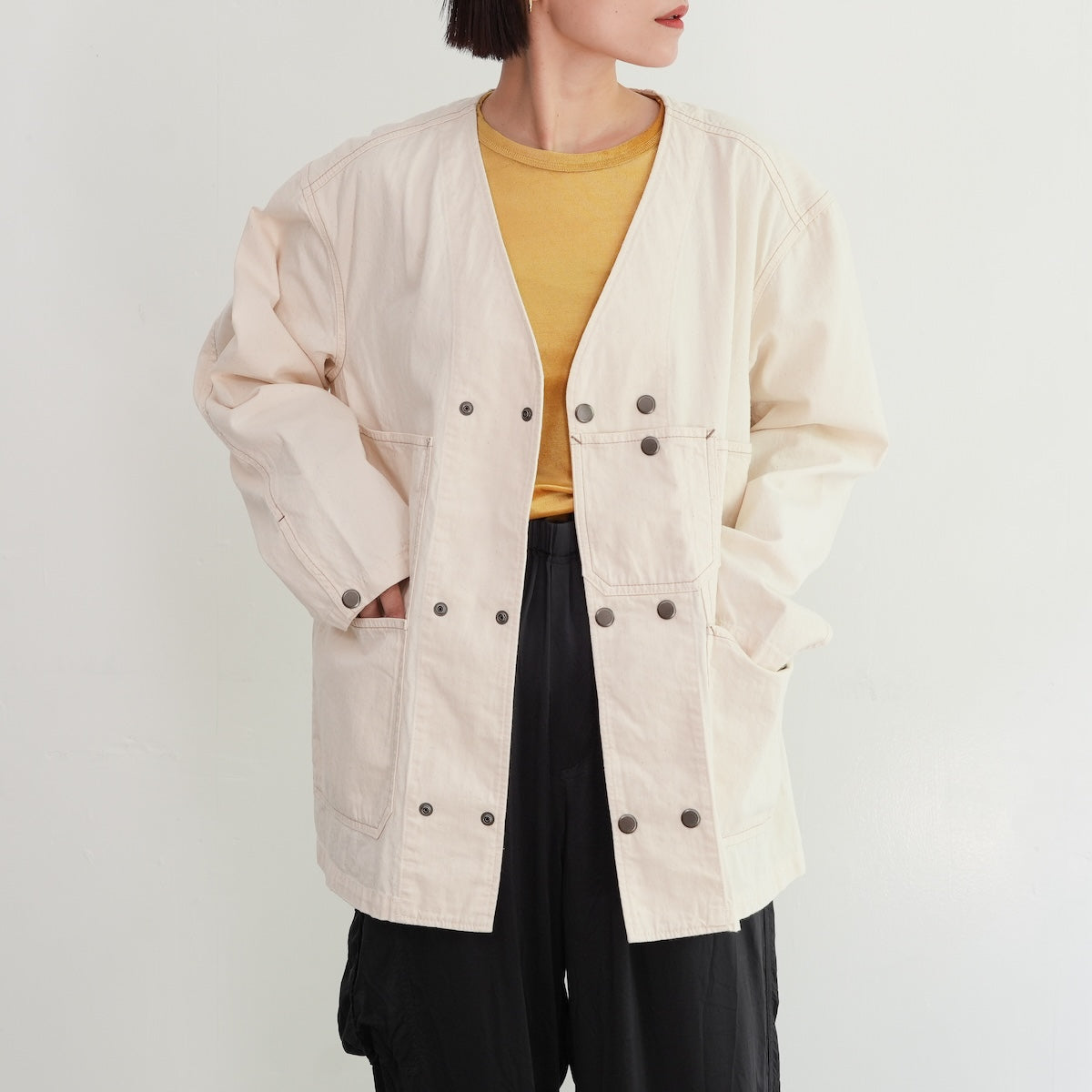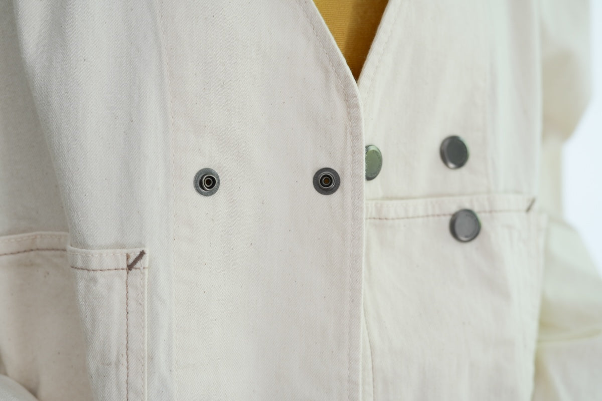 軽やかで柔らかなノーカラーのカバーオールジャケット。