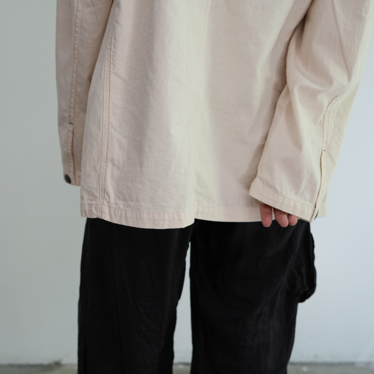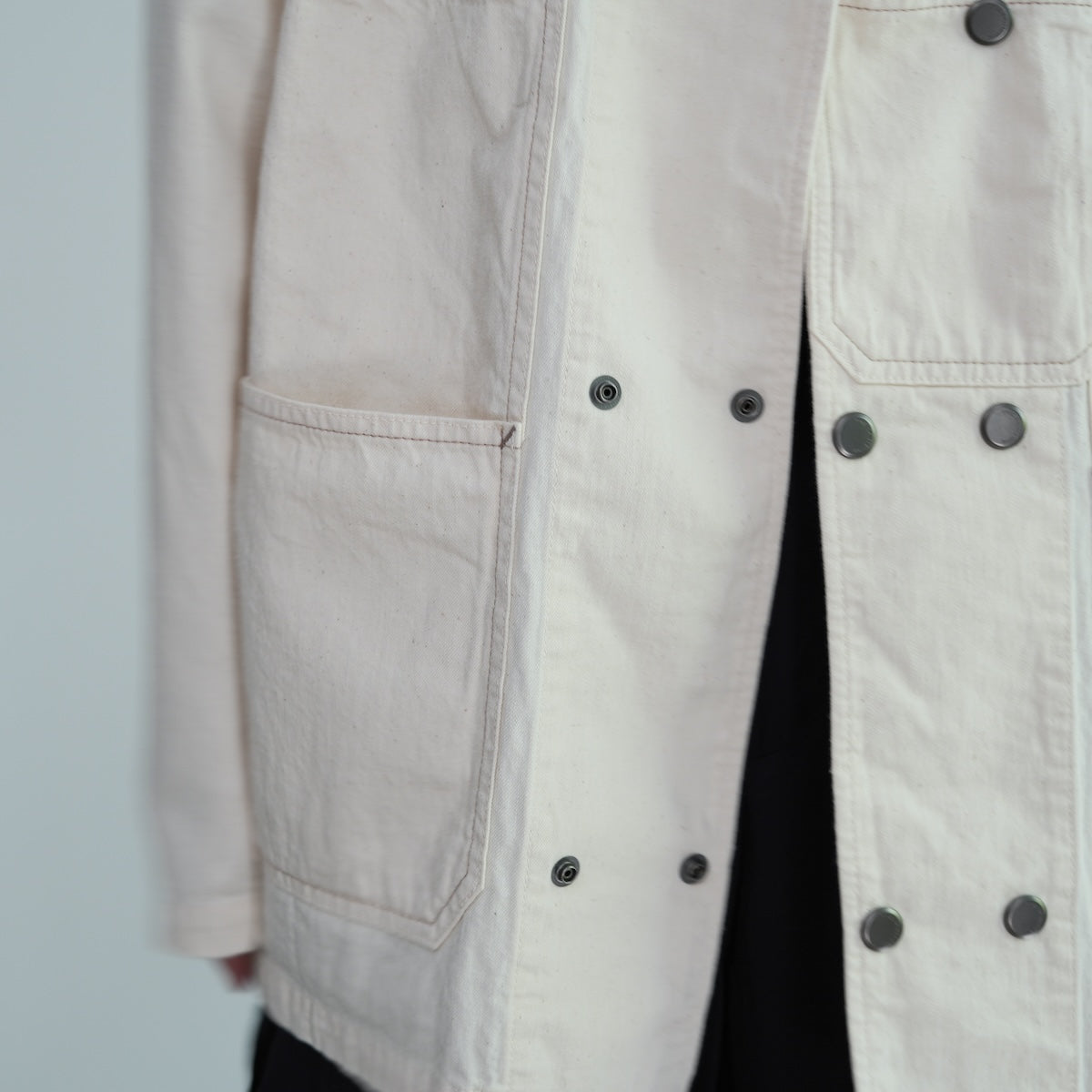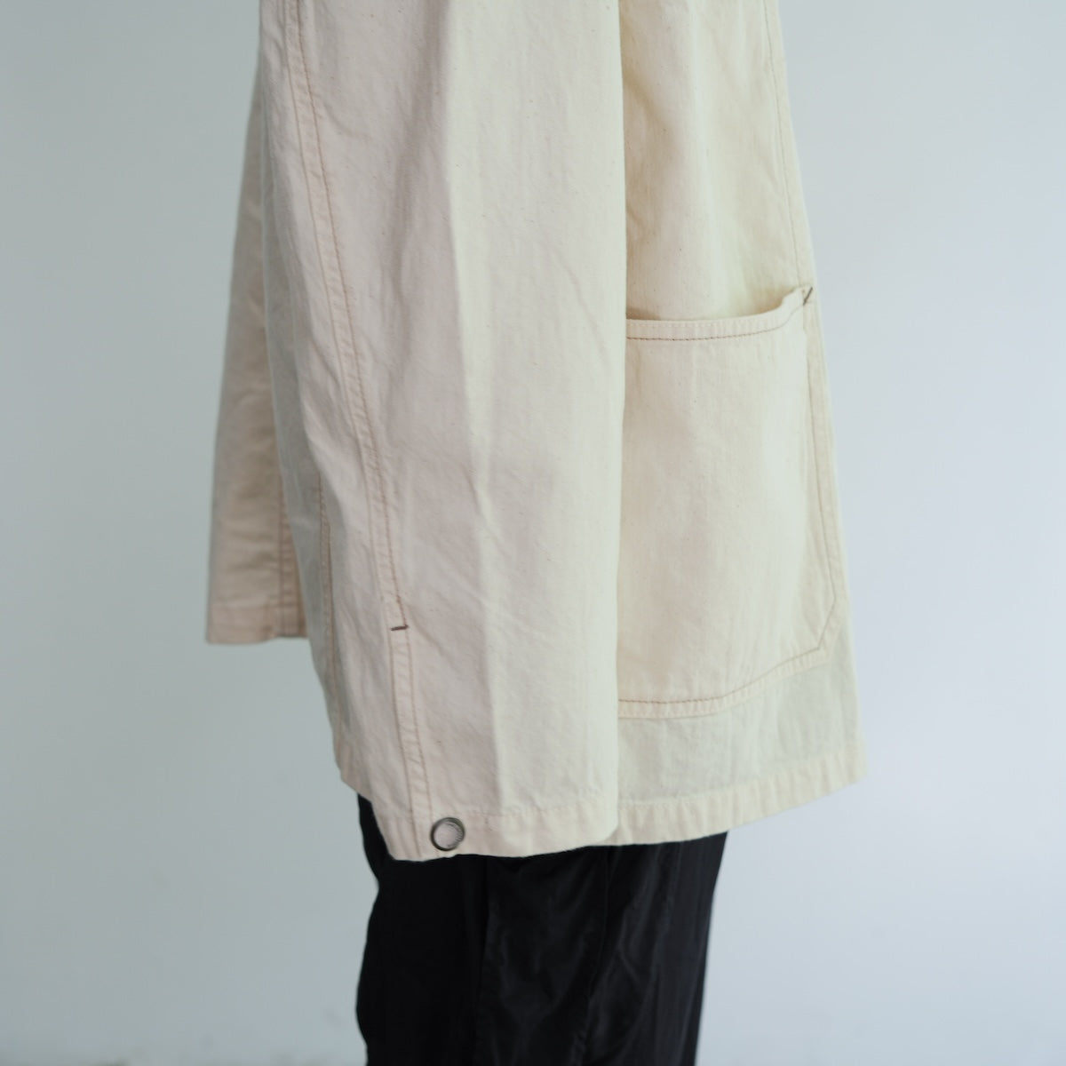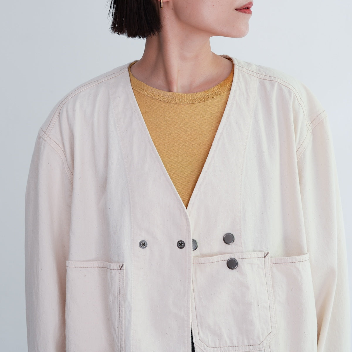 軽やかで柔らかなノーカラーのカバーオールジャケット。