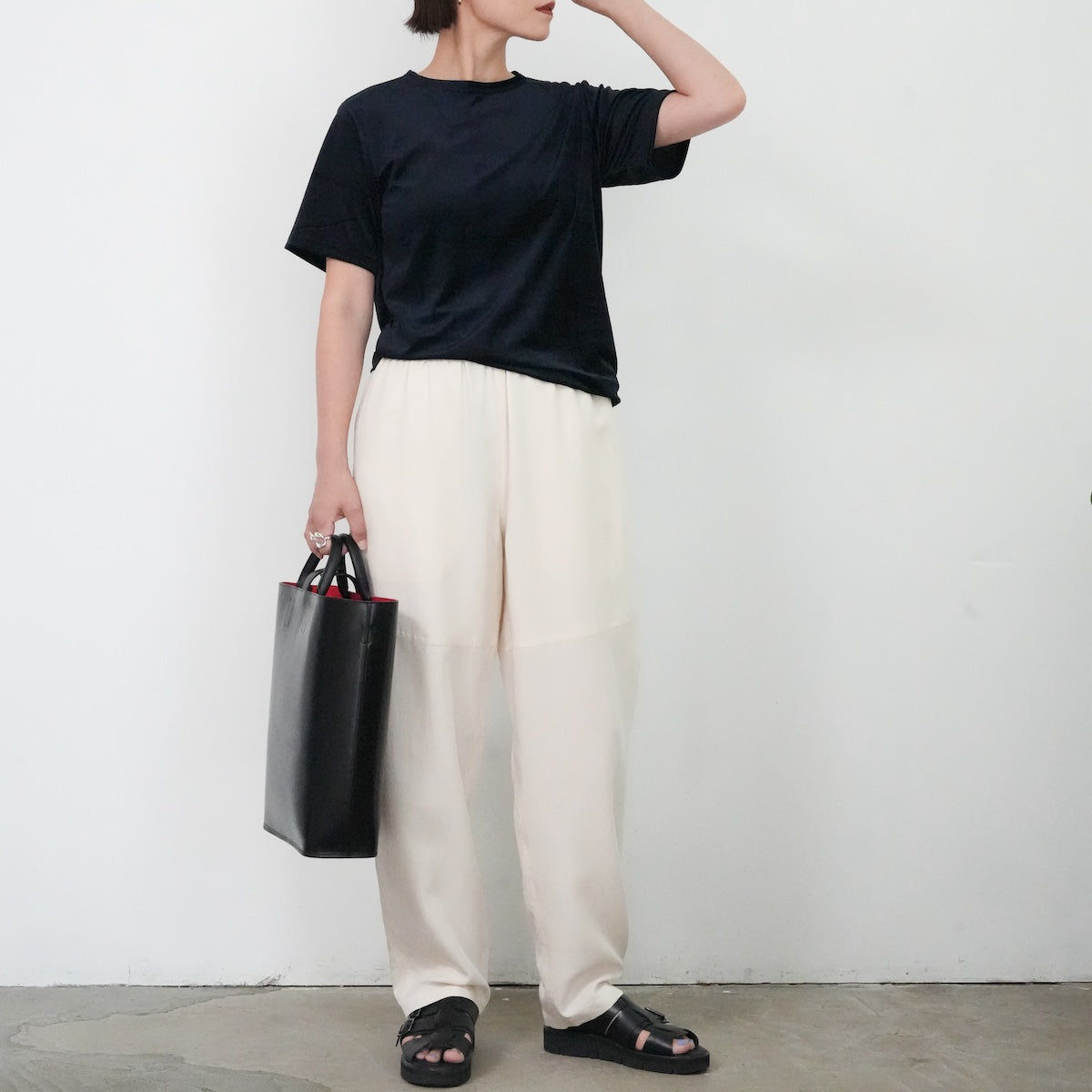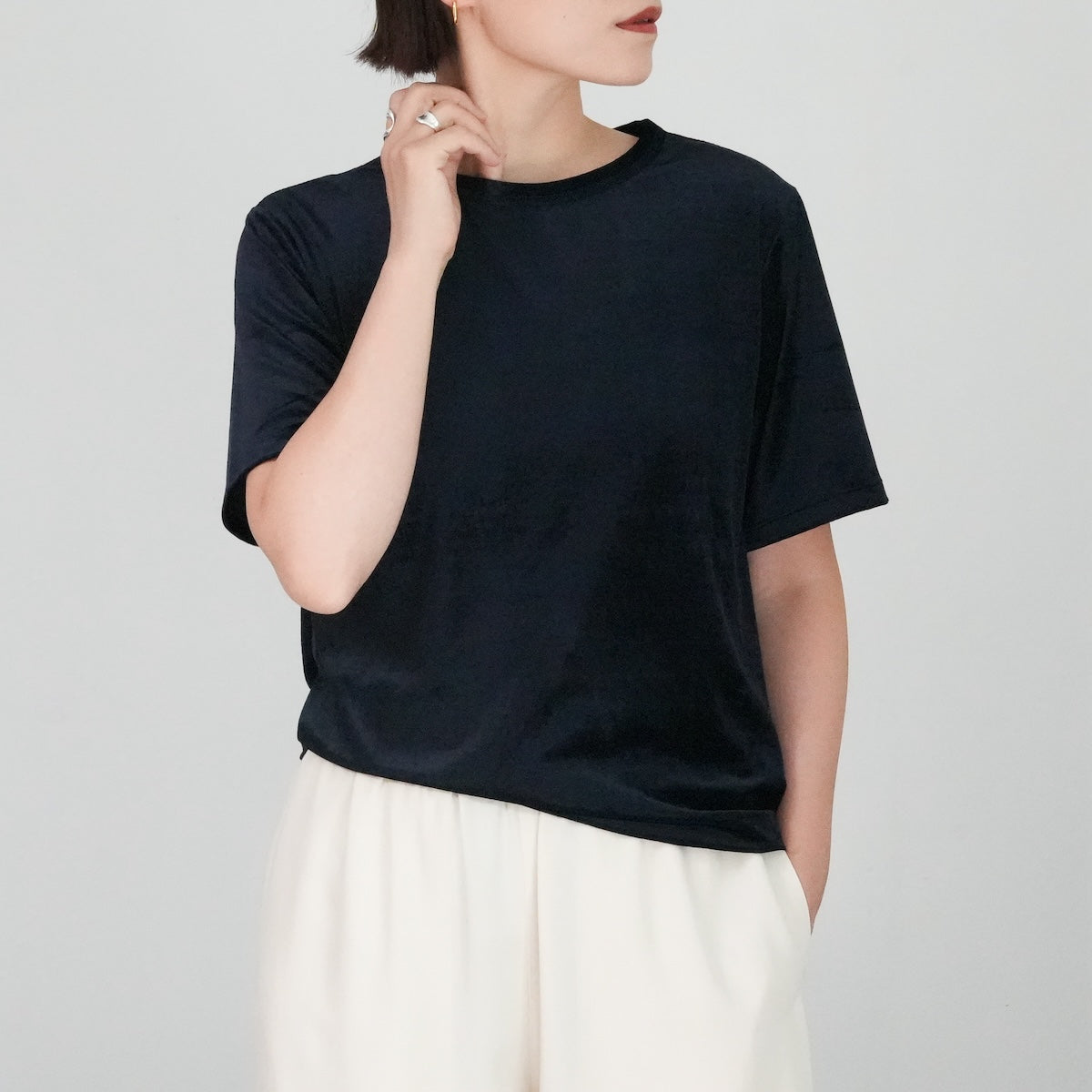 光沢感とドレープ性の高いトリアセテート素材のベロア生地を使用した半袖Tシャツ。 生地の表面が細いボーダーになっているのでメランジ調な見え方になり、大人っぽい上品な光沢感が特徴です。同素材のVELOUR LONG SLEEVE TEEとのレイヤードもオススメです。