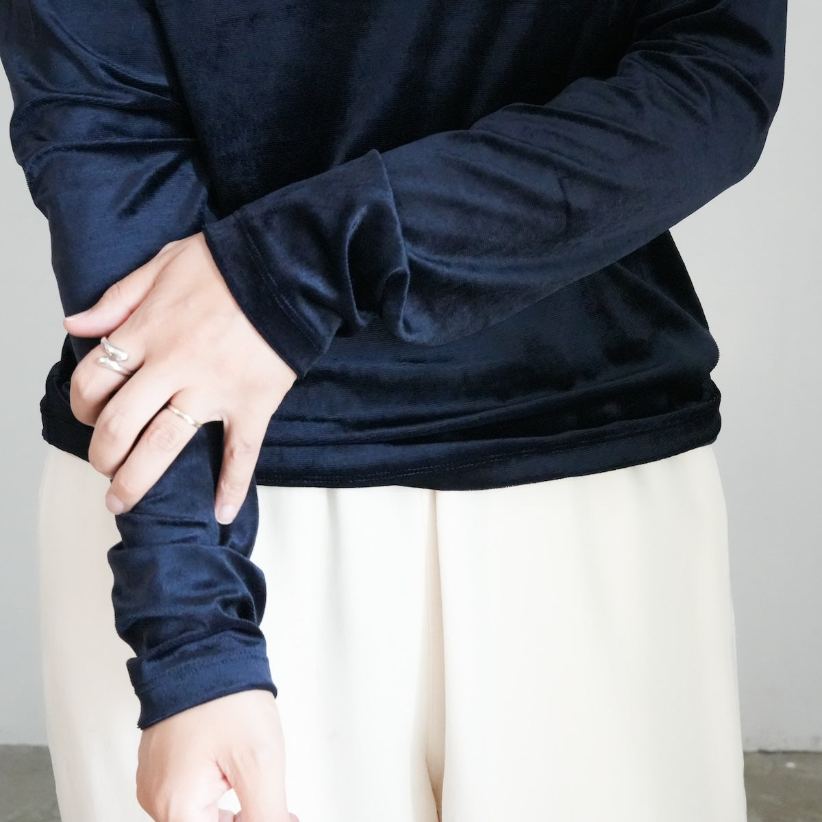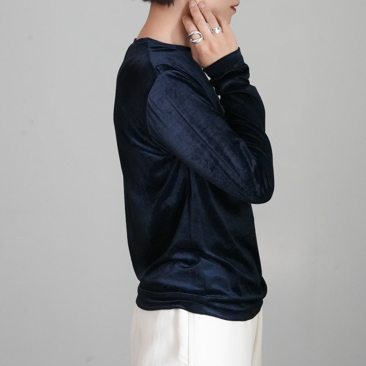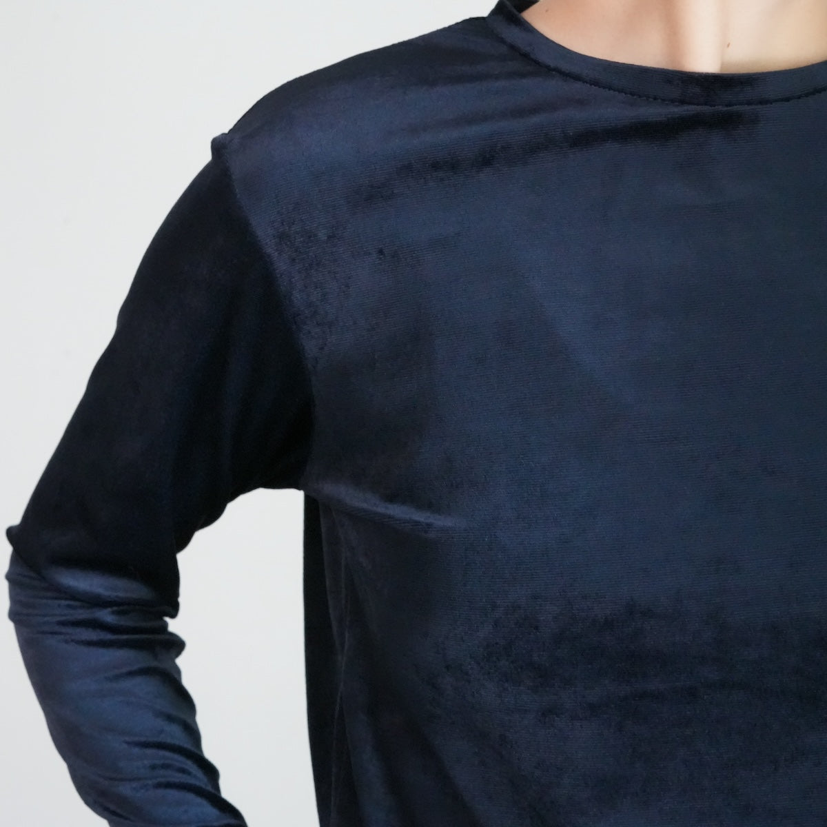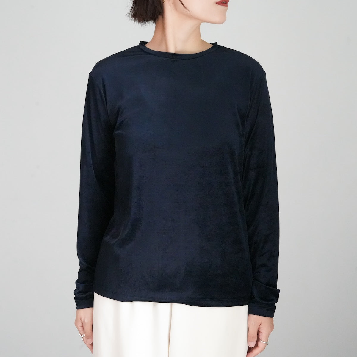 光沢感とドレープ性の高いトリアセテート素材のベロア生地を使用した長袖Tシャツ。