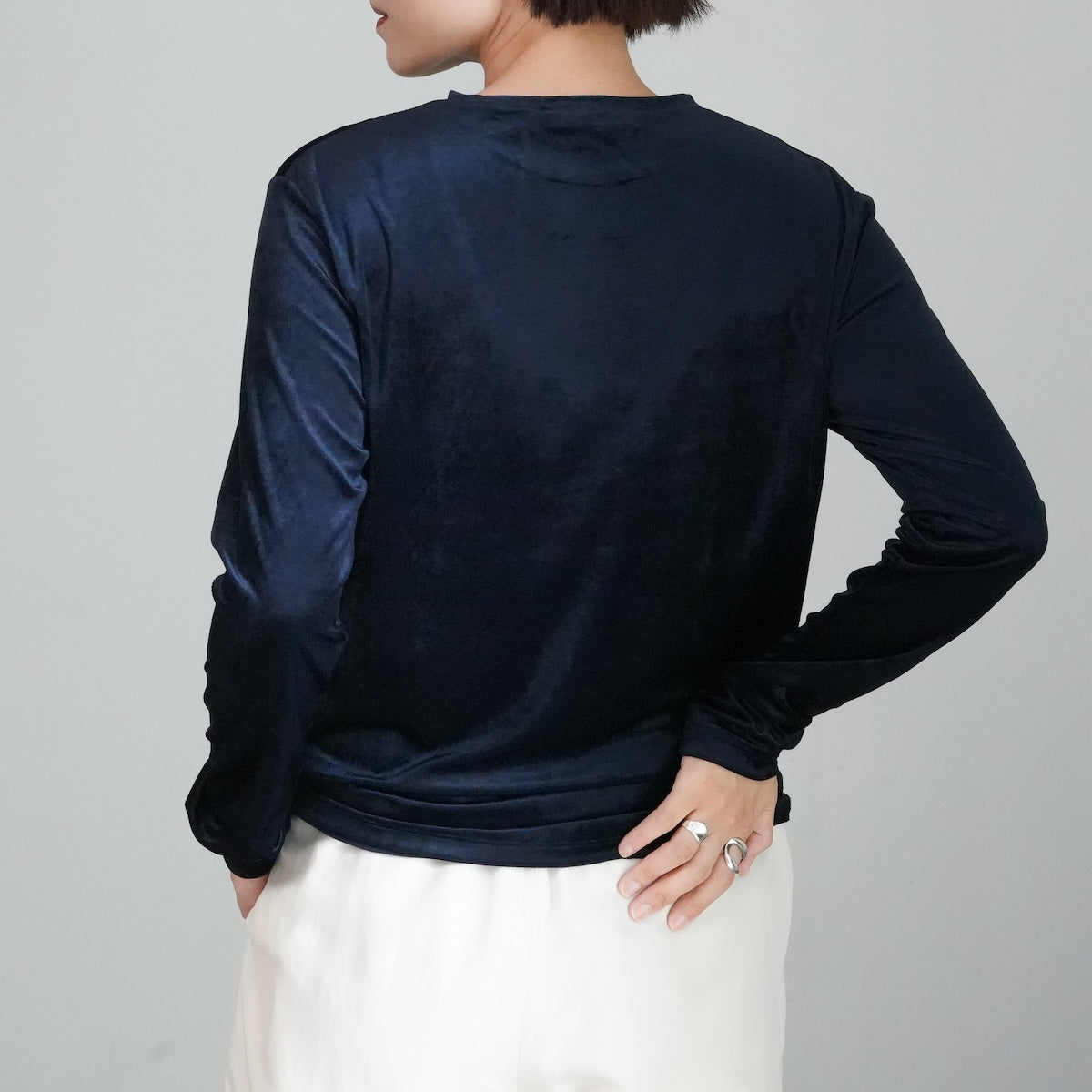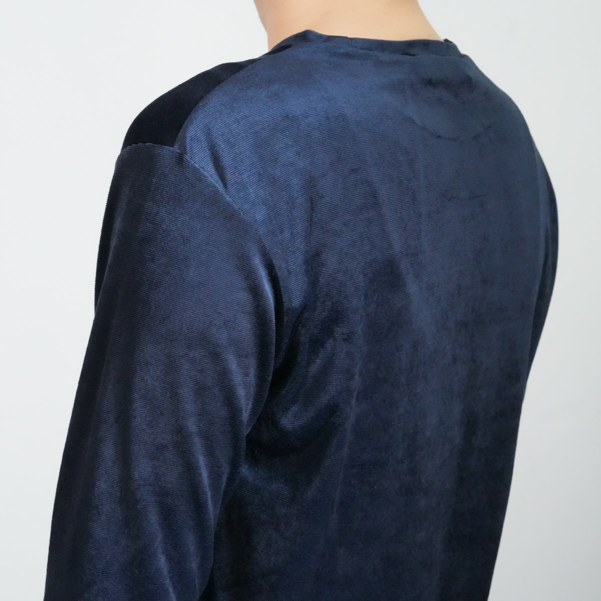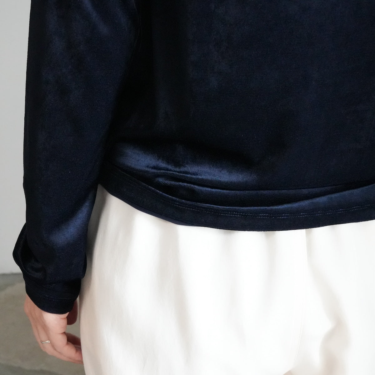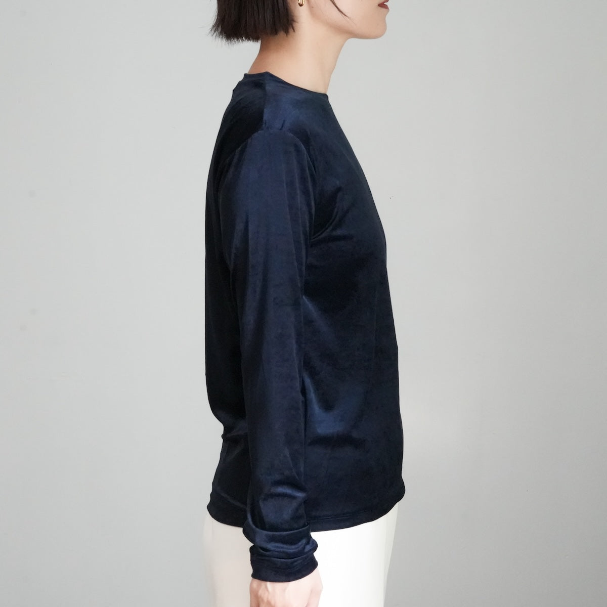 光沢感とドレープ性の高いトリアセテート素材のベロア生地を使用した長袖Tシャツ。