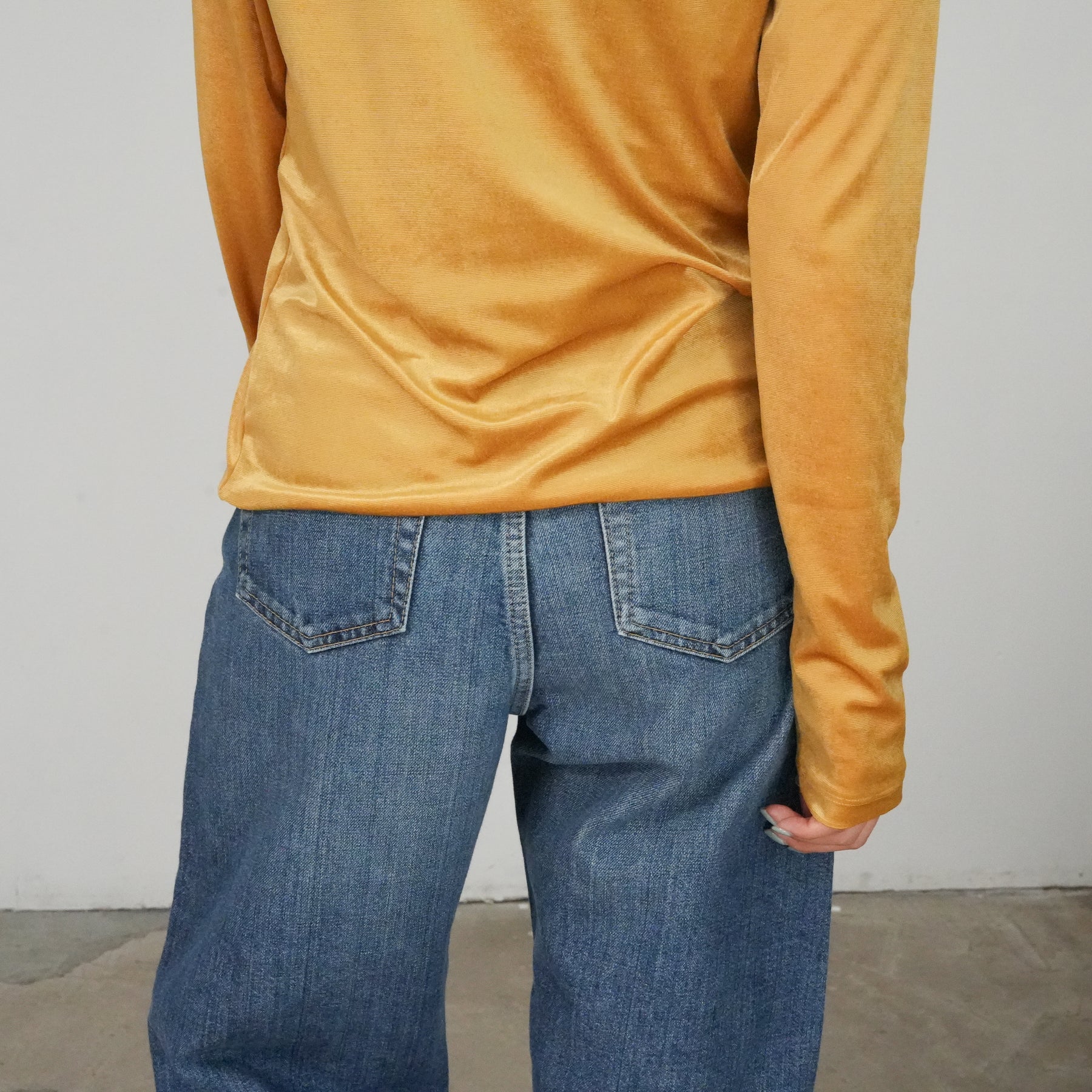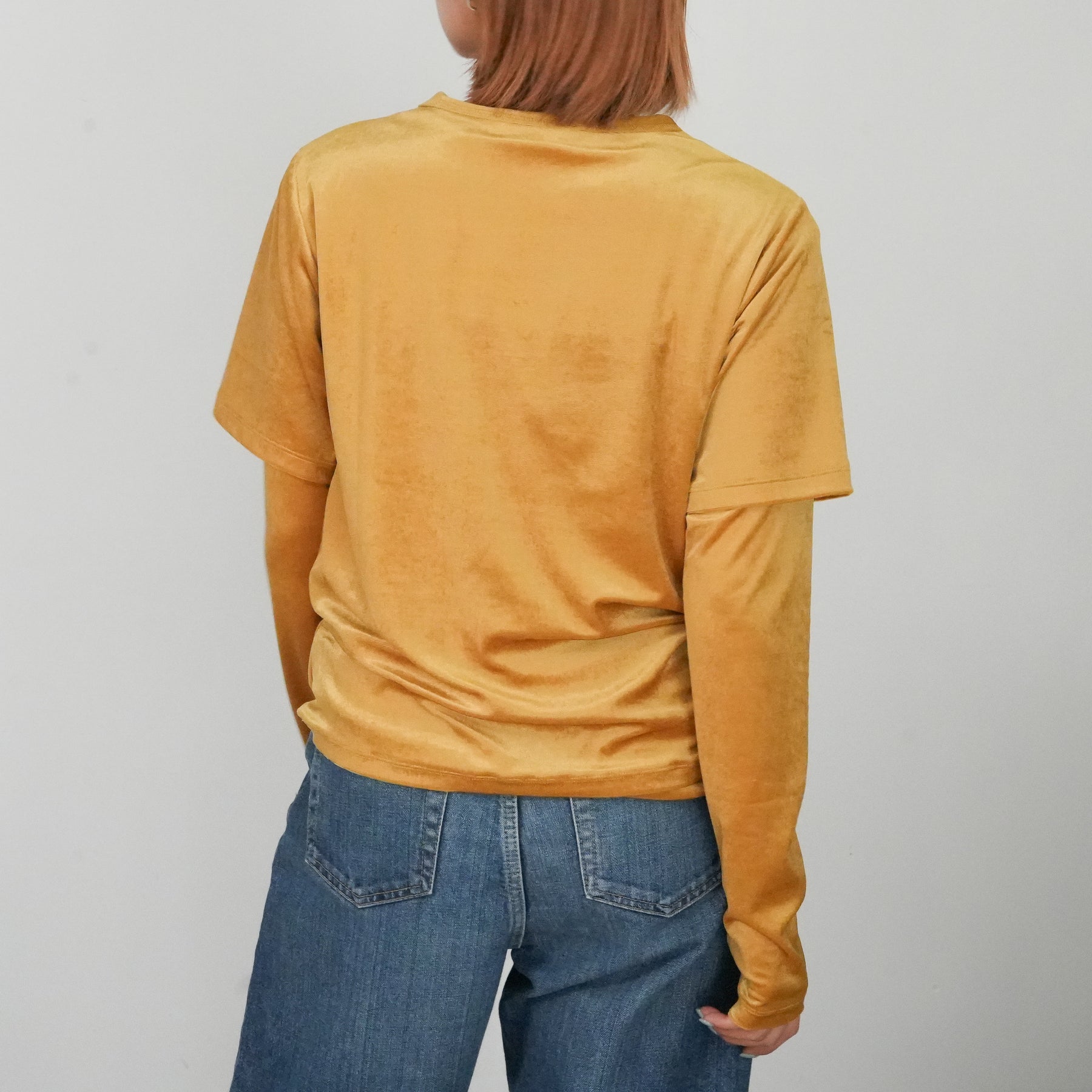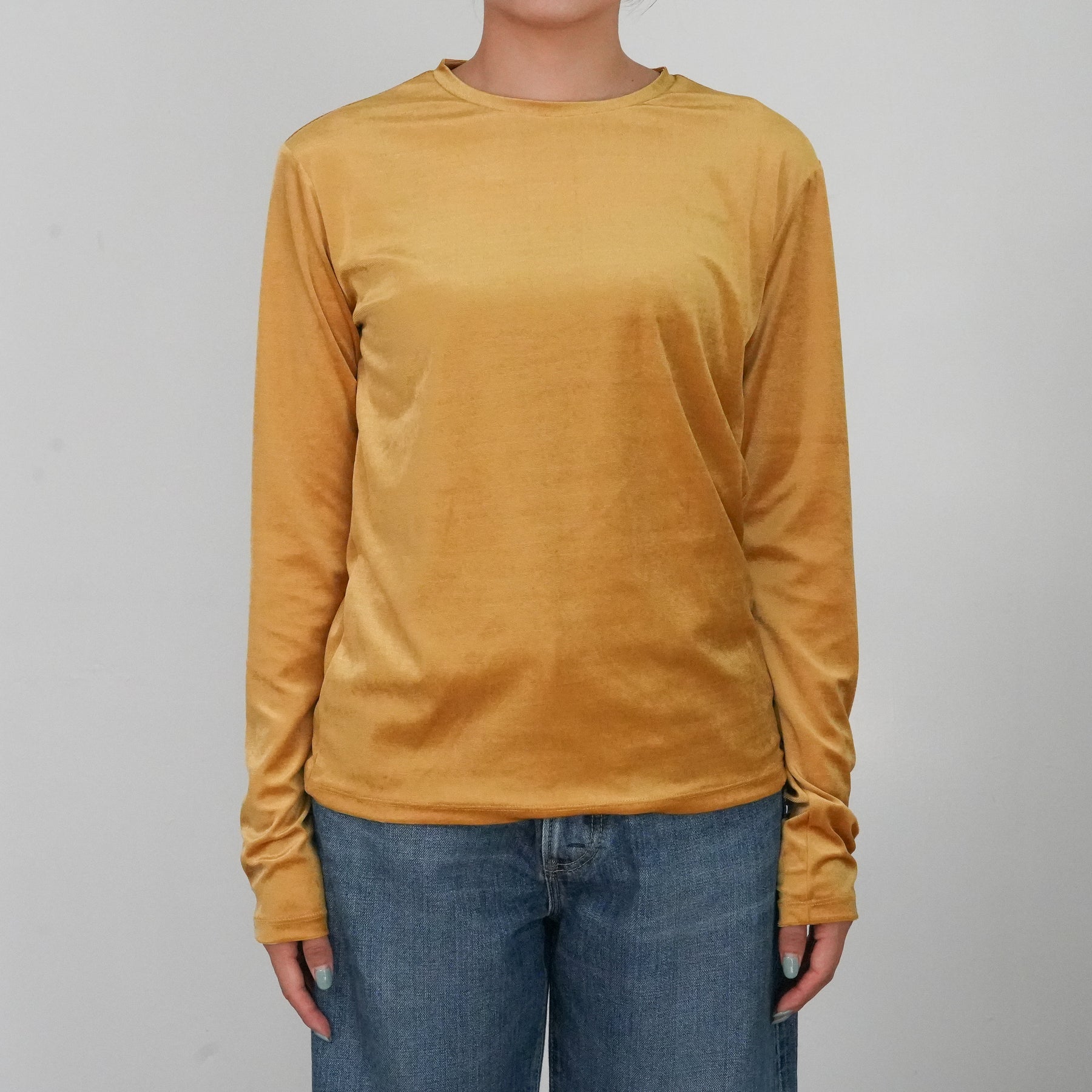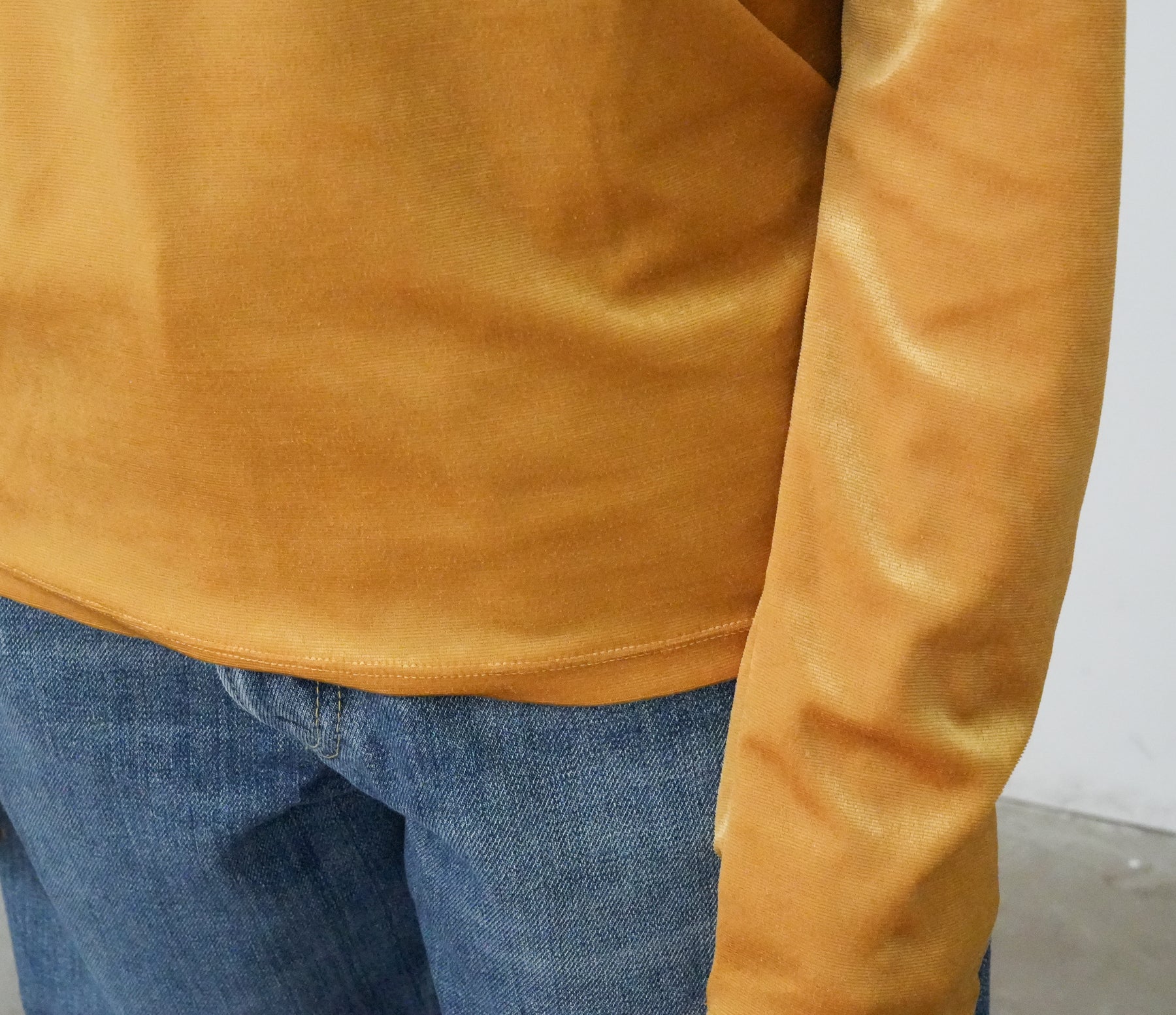 光沢感とドレープ性の高いトリアセテート素材のベロア生地を使用した長袖Tシャツ。