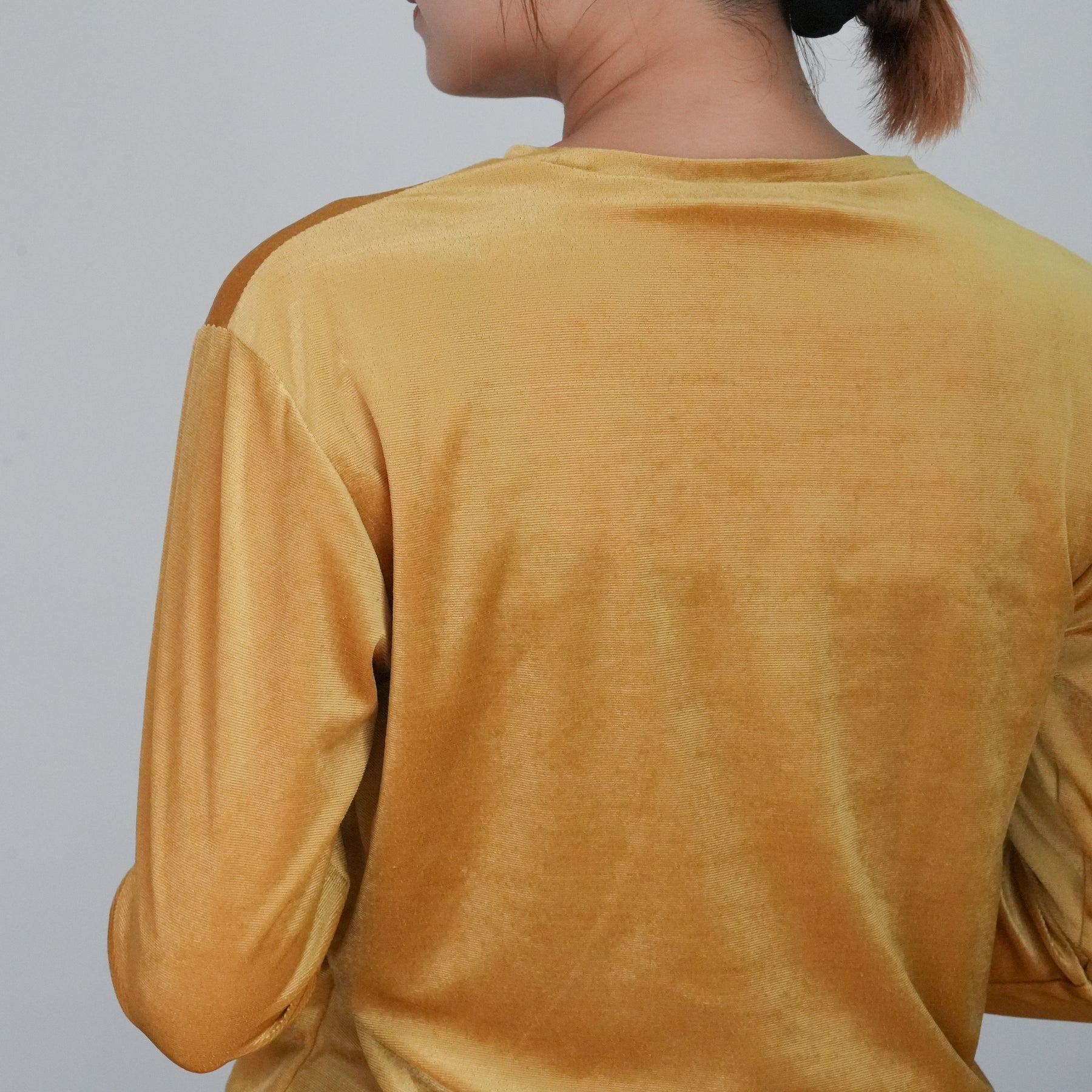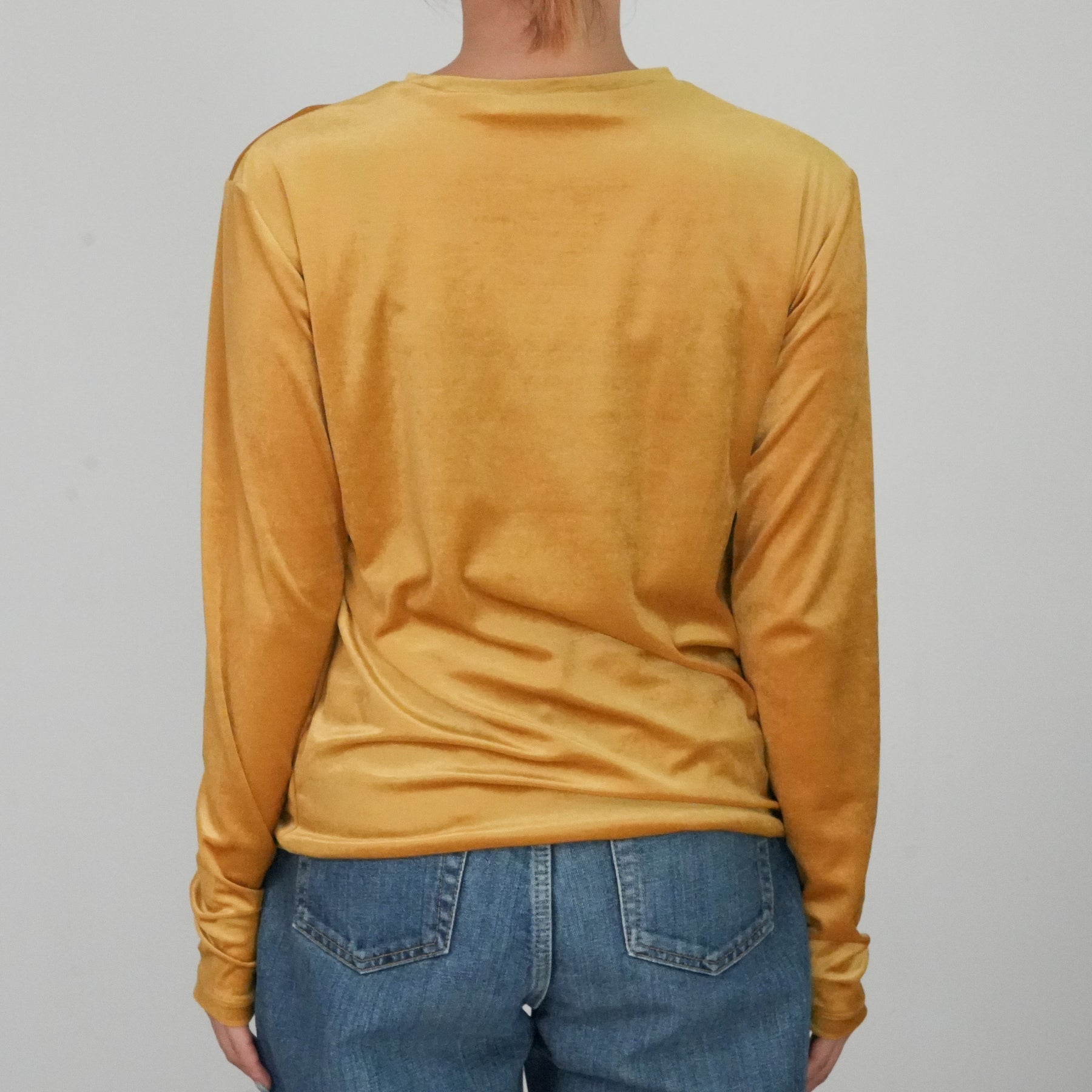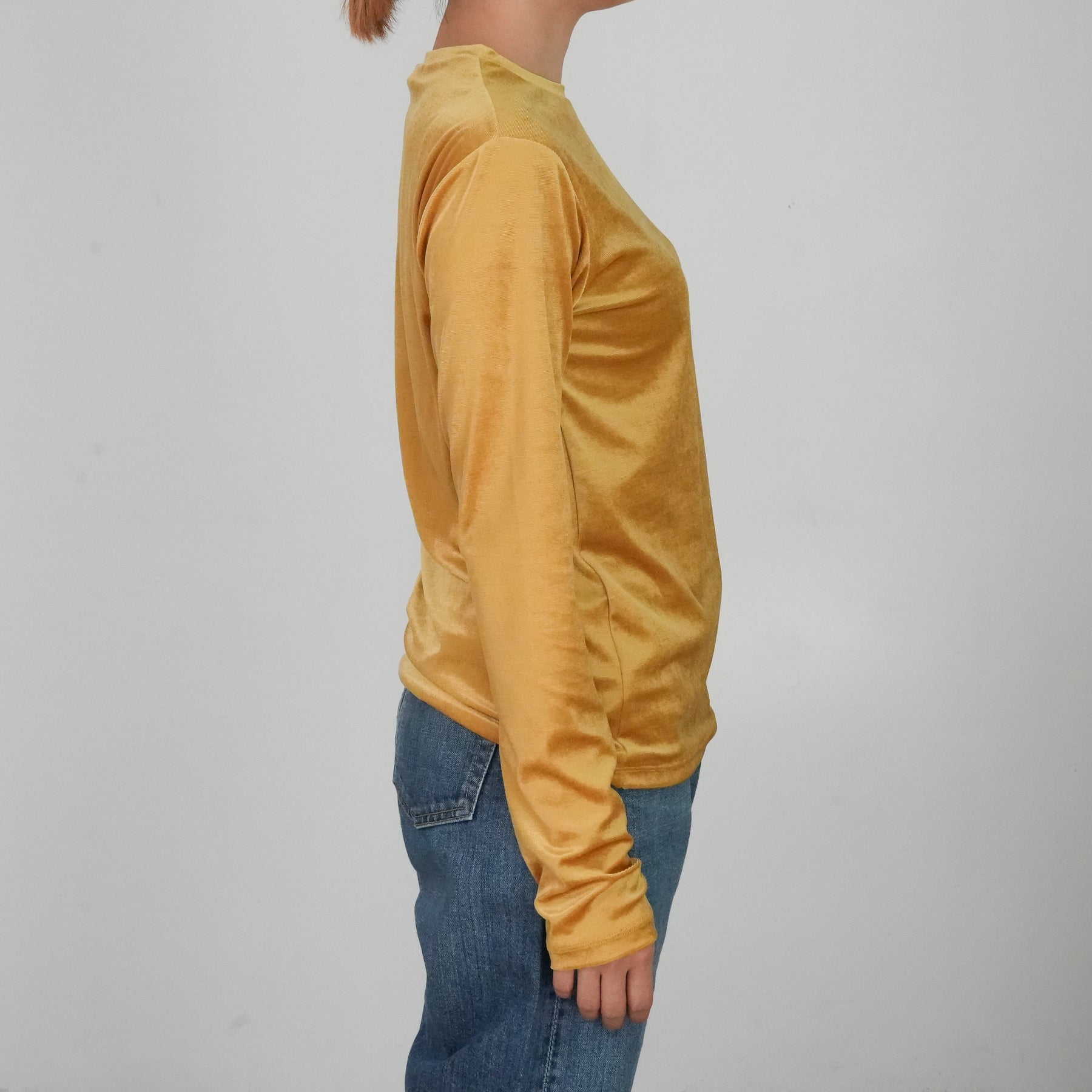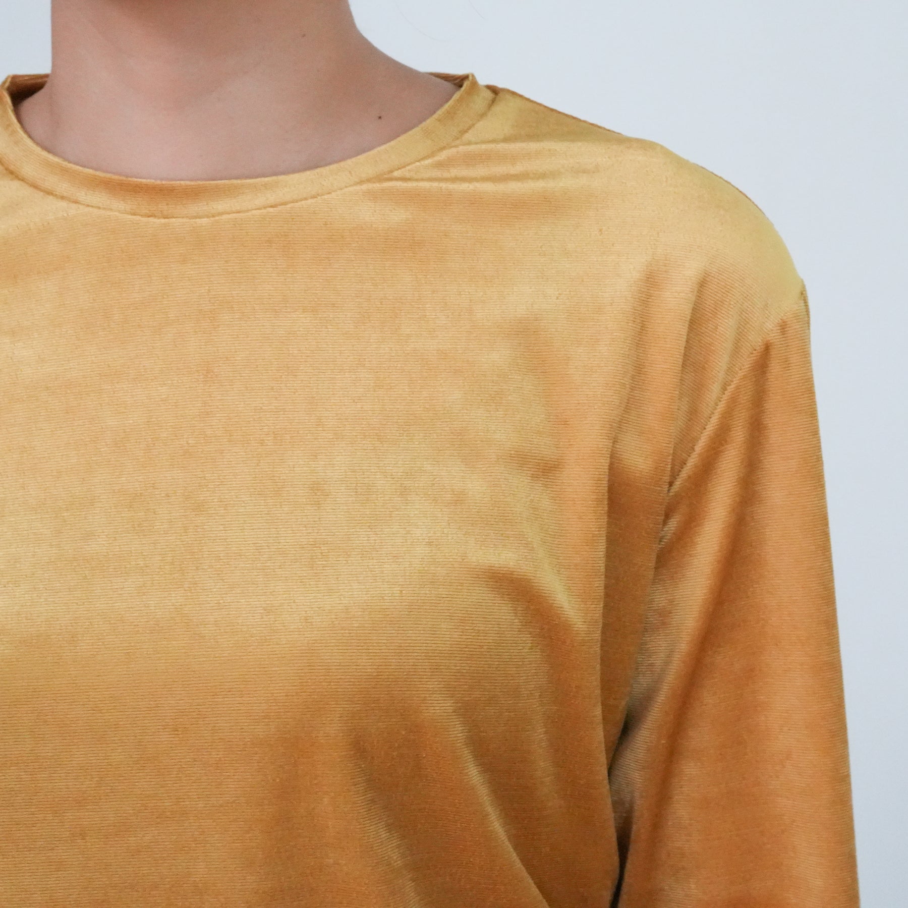 光沢感とドレープ性の高いトリアセテート素材のベロア生地を使用した長袖Tシャツ。