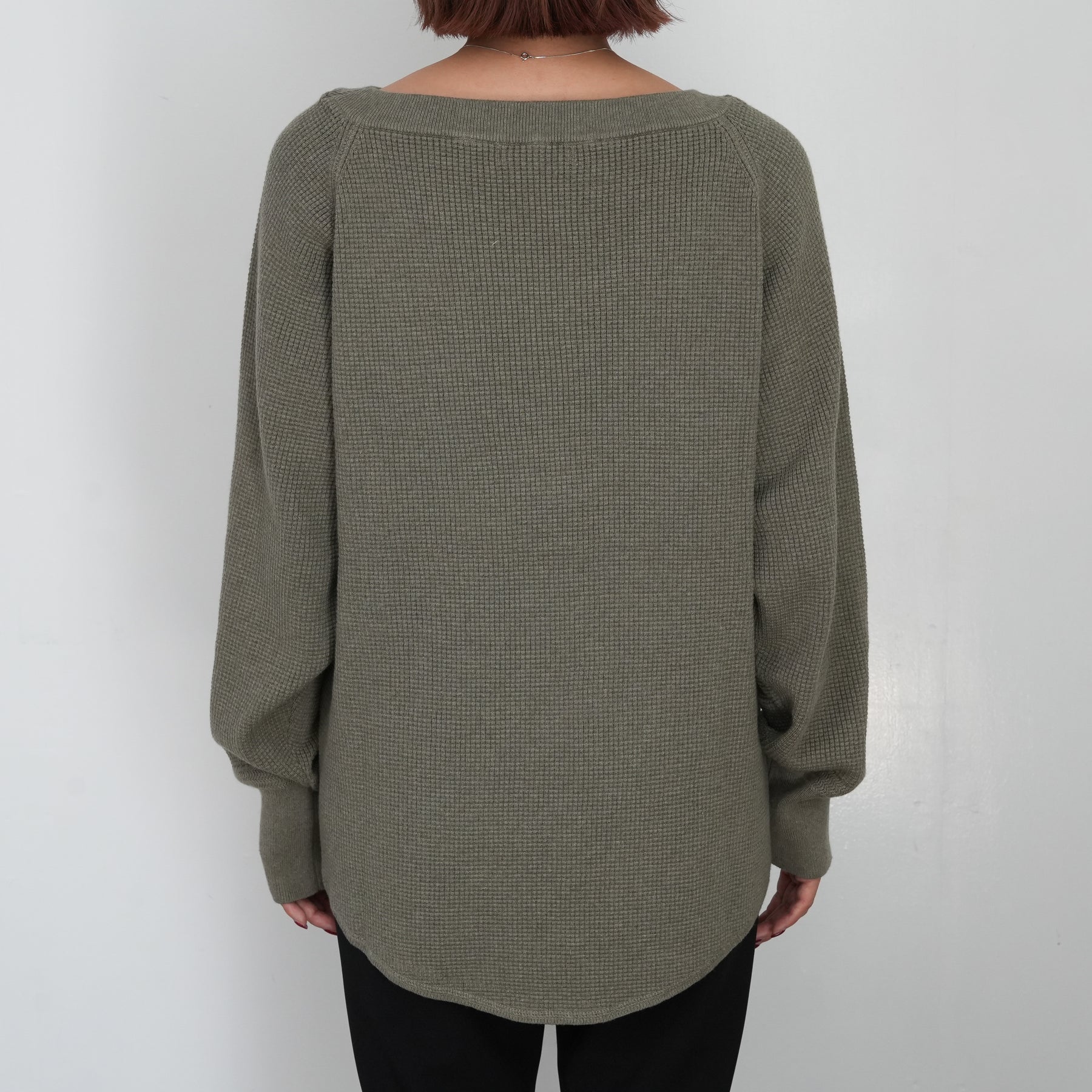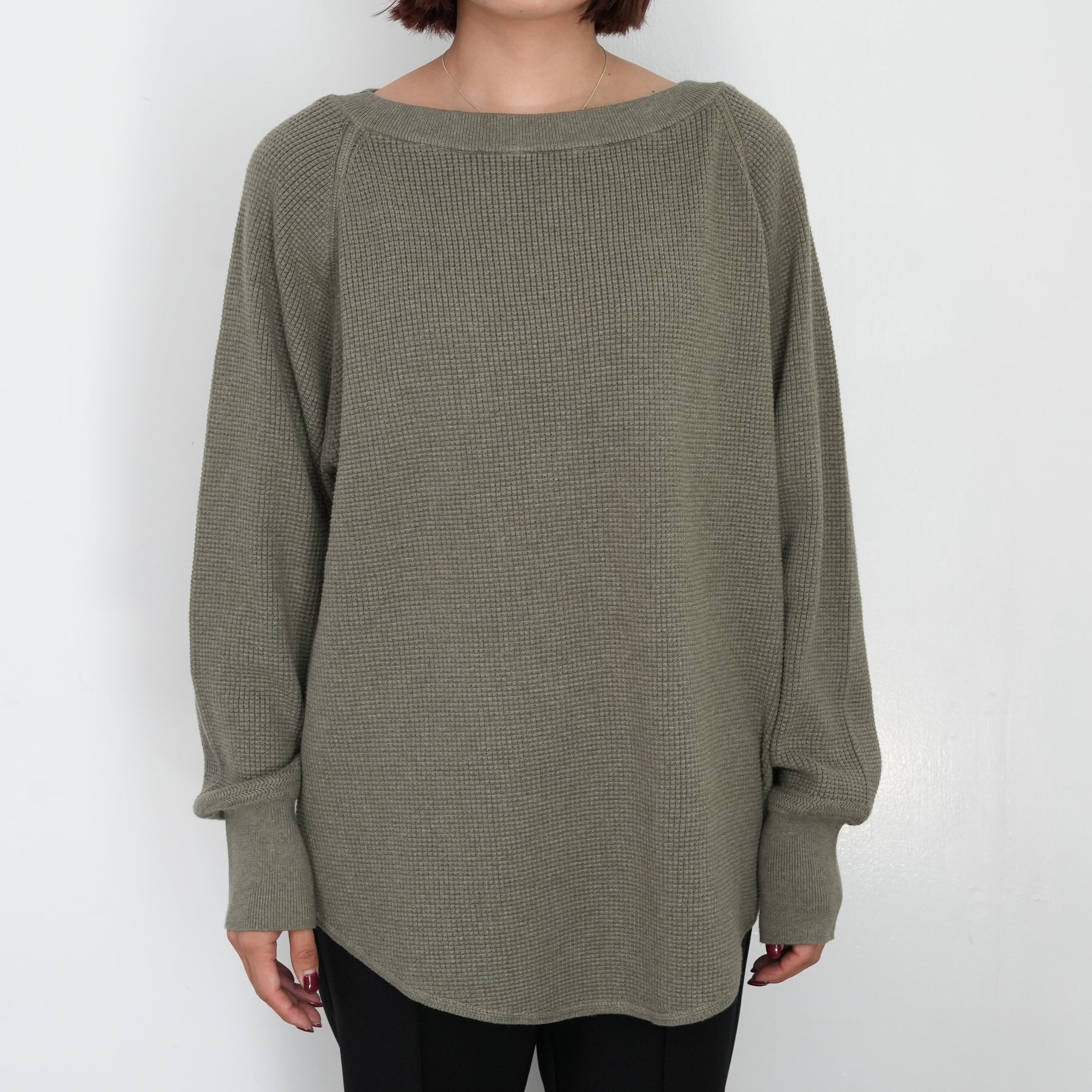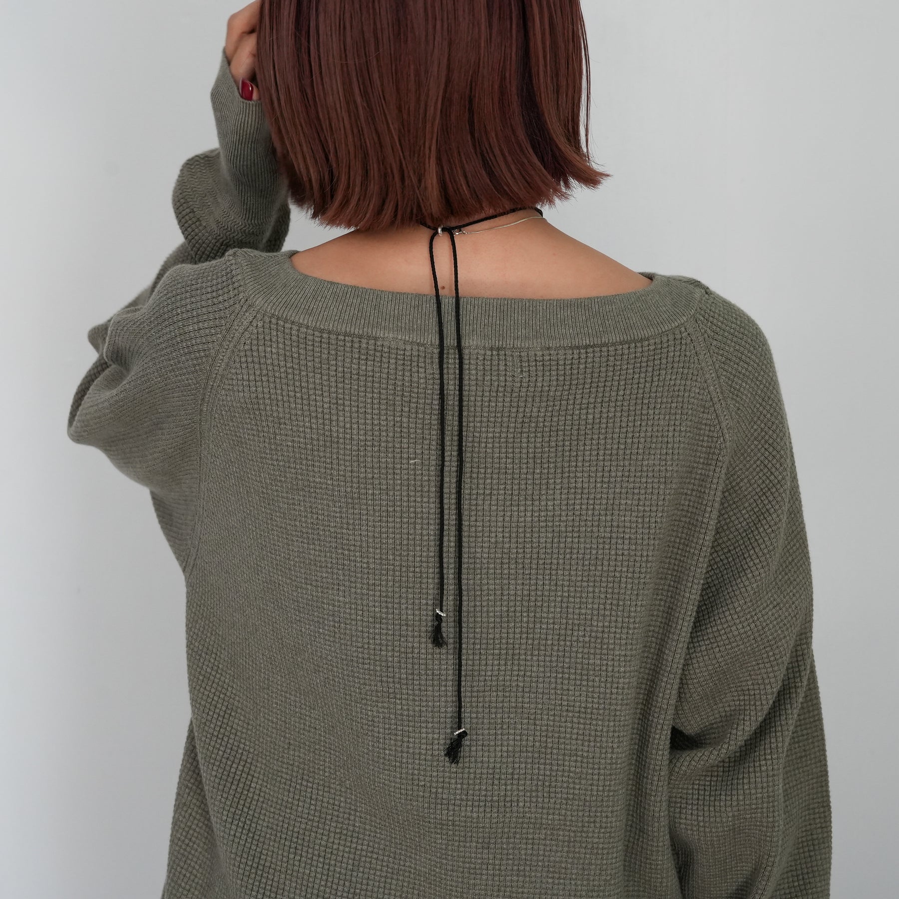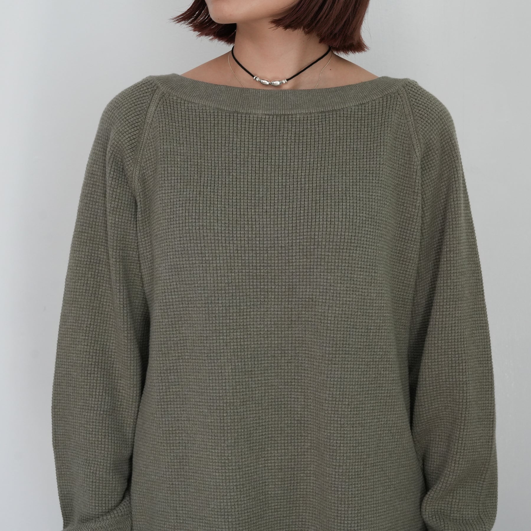 身頃をワッフル編みにし、さらに襟ぐりをボートネック風に仕上げ、