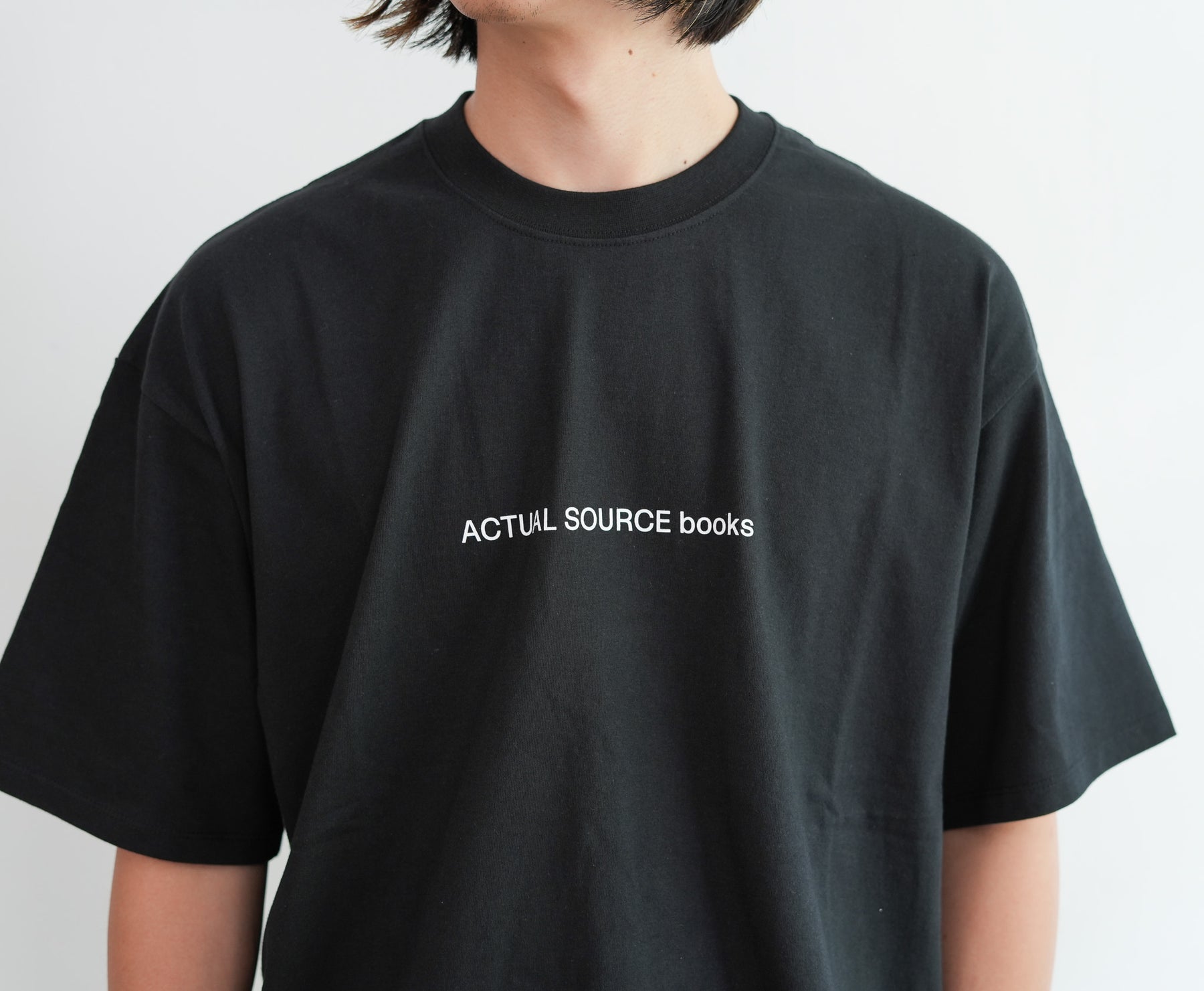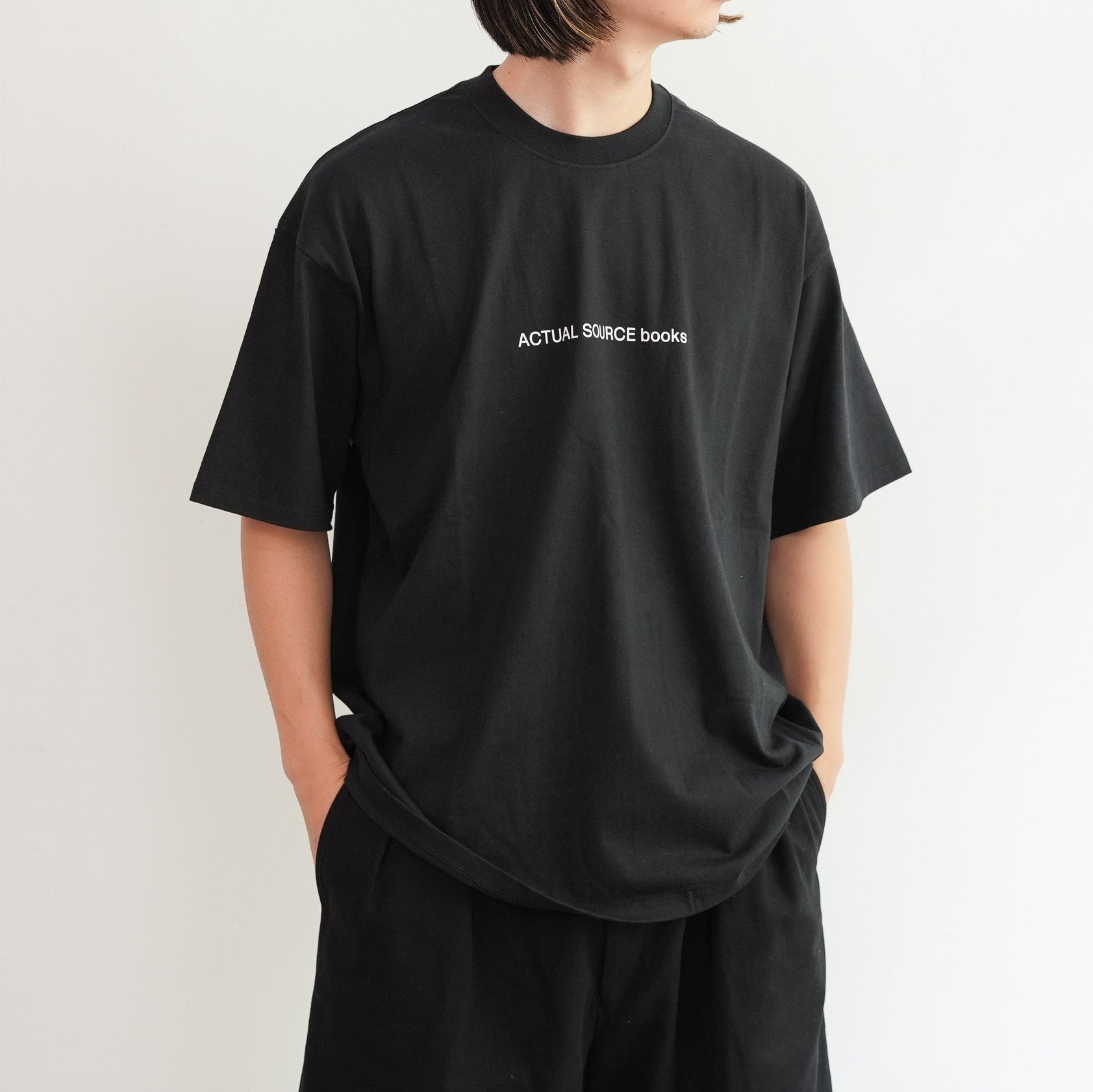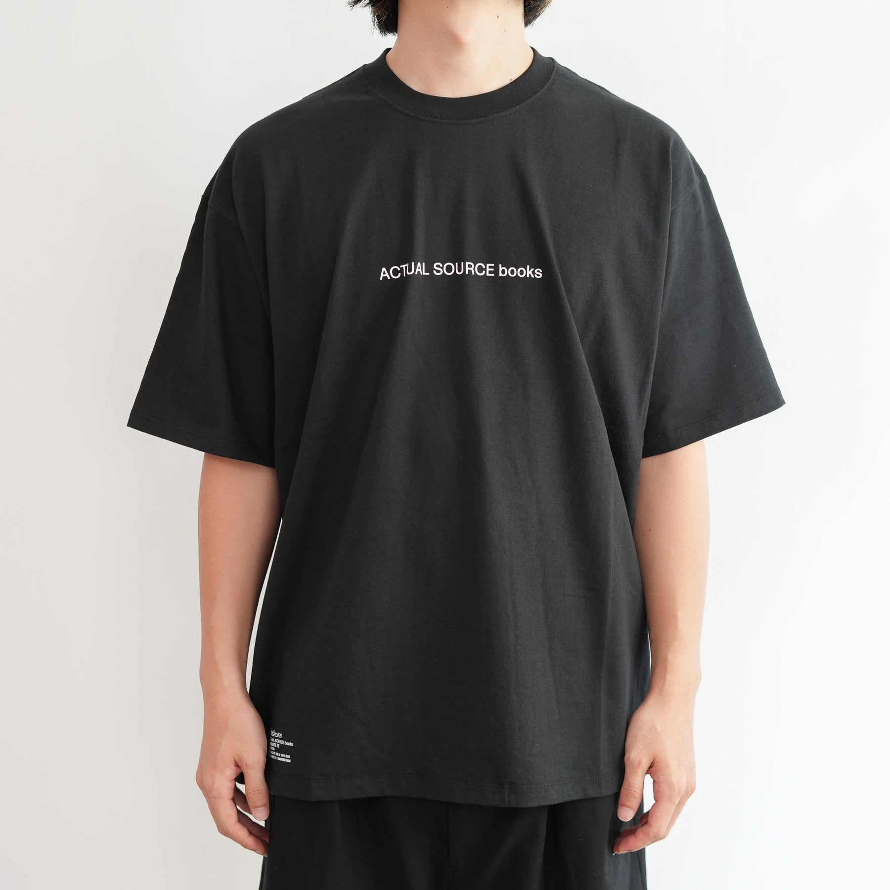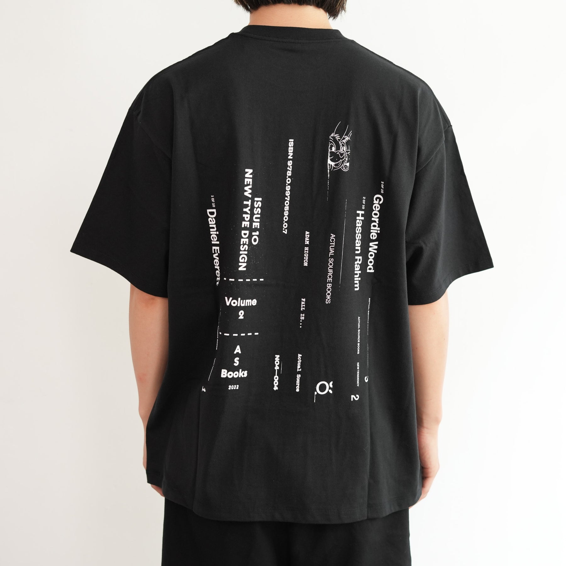 出版やアート、アパレルまで横断的に活動するデザインスタジオ『Actual Source』とのコラボレーションによるカプセルコレクション。彼らのルーツである出版カルチャーを象徴するグラフィックを背面にプリントしました。書籍の背表紙や刊行情報を積み重ねたようなレイアウトは、まさに“BOOK STACK”を思わせるデザイン。タイポグラフィと記号を組み合わせた独特の構図は、シンプルなホワイトTシャツに知的でアートフルなニュアンスを与えています。ドロップショルダーによるオーバーサイズシルエットで、リラックス感のある着心地。1枚で主役としても、ジャケットやシャツのインナーとしてもスタイリングを引き立てる一着です。