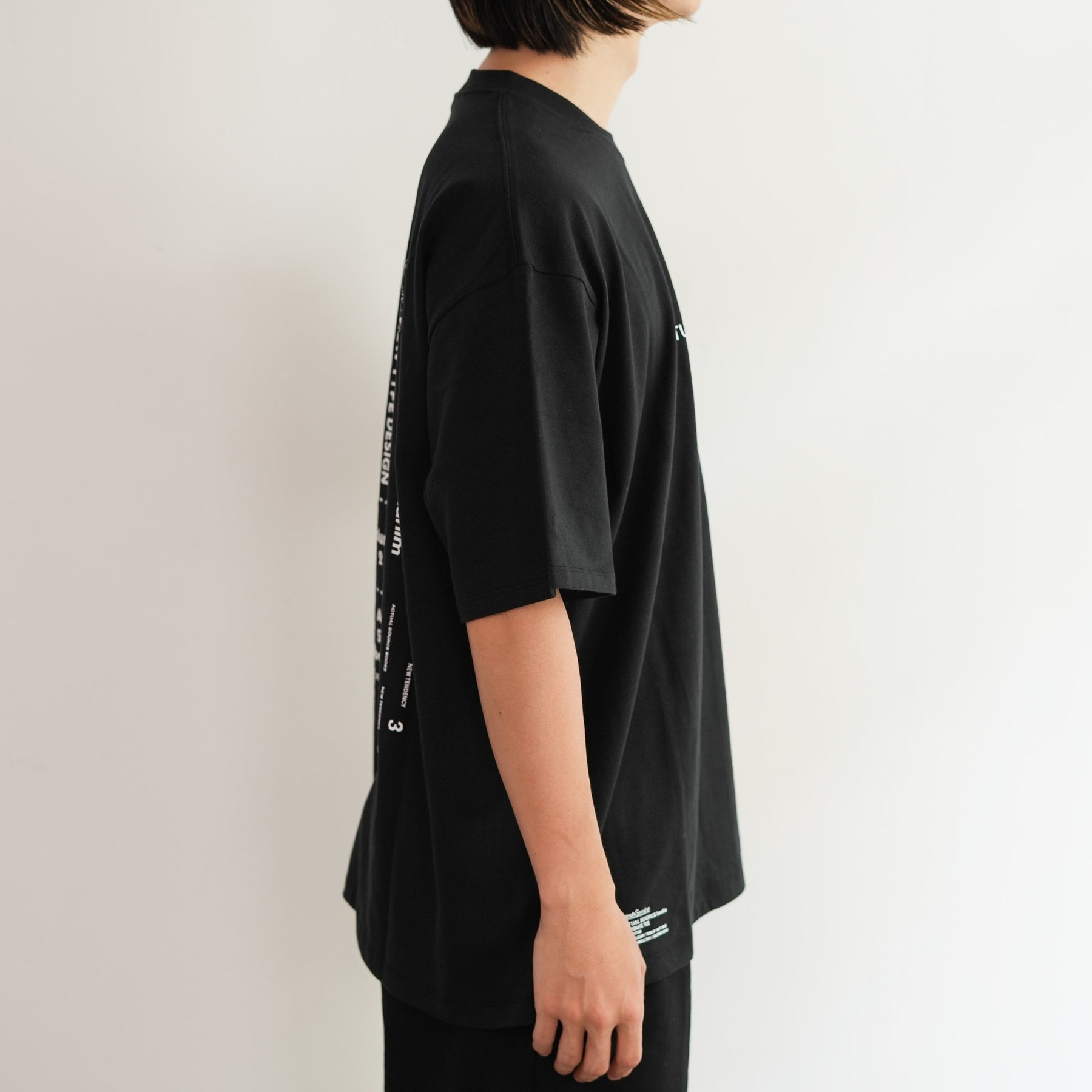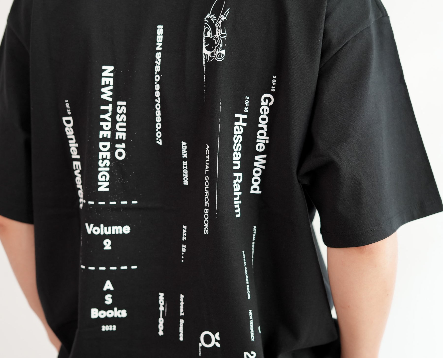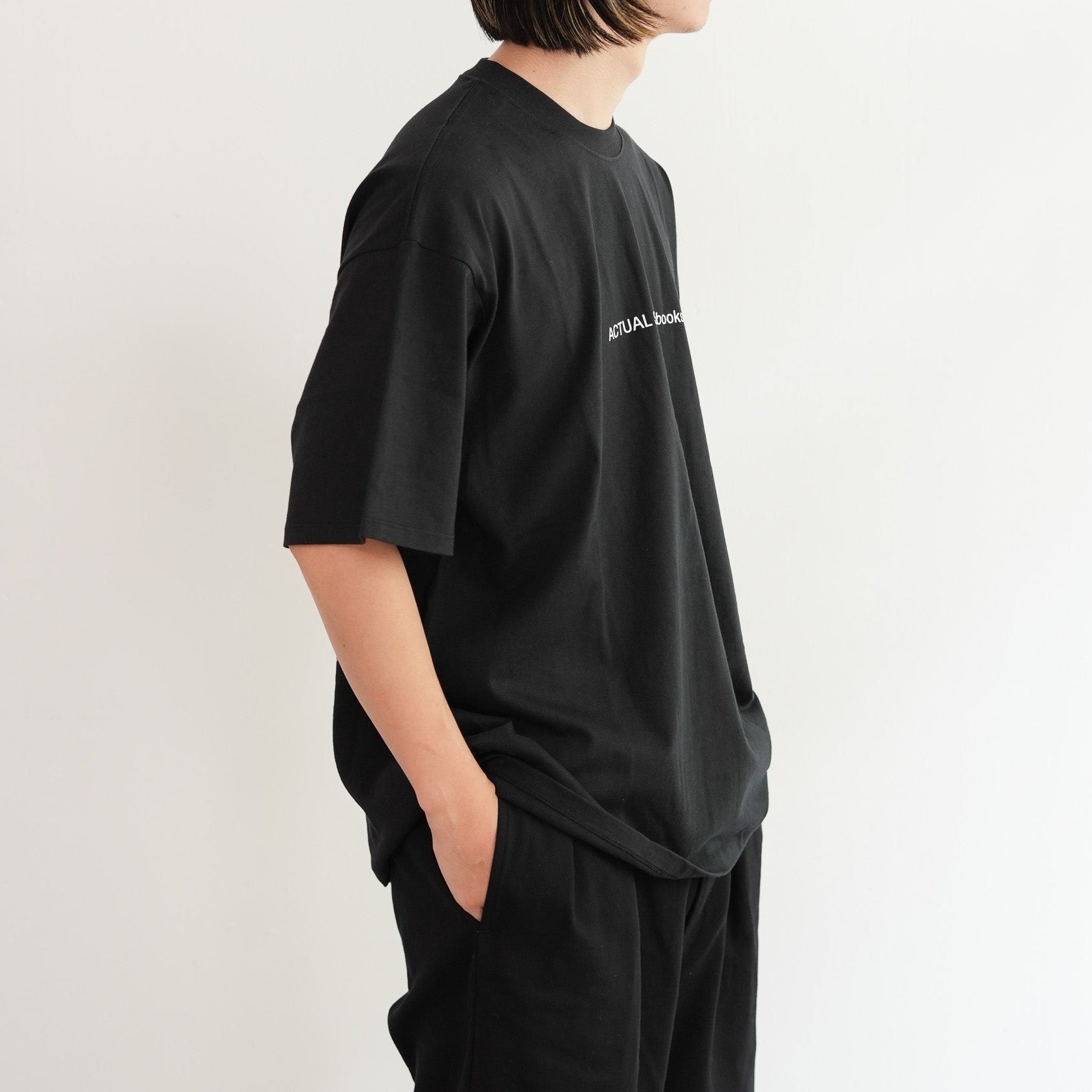 出版やアート、アパレルまで横断的に活動するデザインスタジオ『Actual Source』とのコラボレーションによるカプセルコレクション。彼らのルーツである出版カルチャーを象徴するグラフィックを背面にプリントしました。書籍の背表紙や刊行情報を積み重ねたようなレイアウトは、まさに“BOOK STACK”を思わせるデザイン。タイポグラフィと記号を組み合わせた独特の構図は、シンプルなホワイトTシャツに知的でアートフルなニュアンスを与えています。ドロップショルダーによるオーバーサイズシルエットで、リラックス感のある着心地。1枚で主役としても、ジャケットやシャツのインナーとしてもスタイリングを引き立てる一着です。