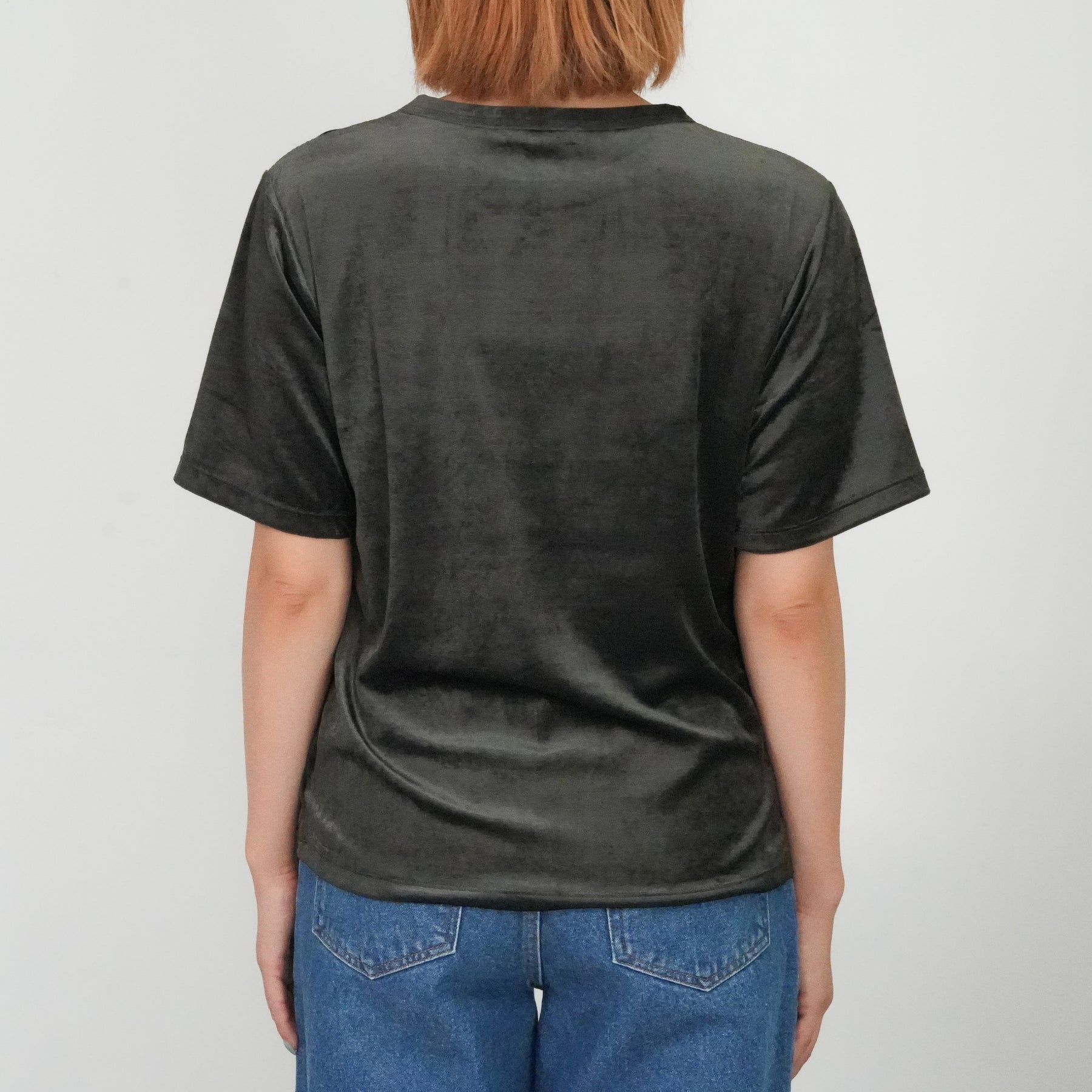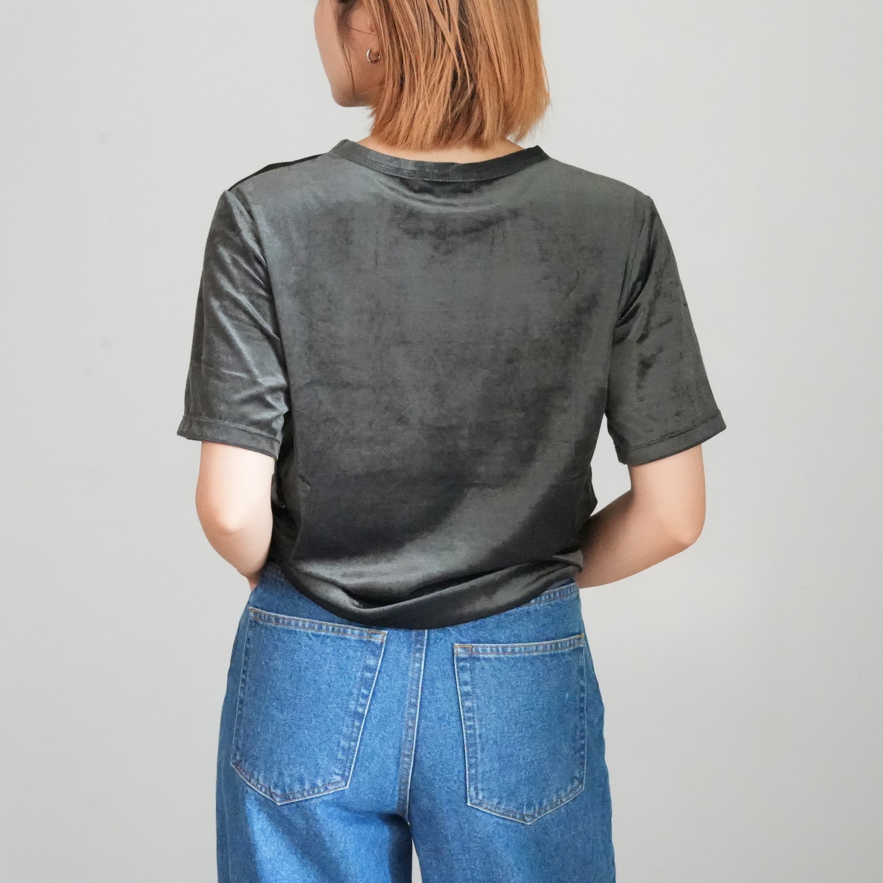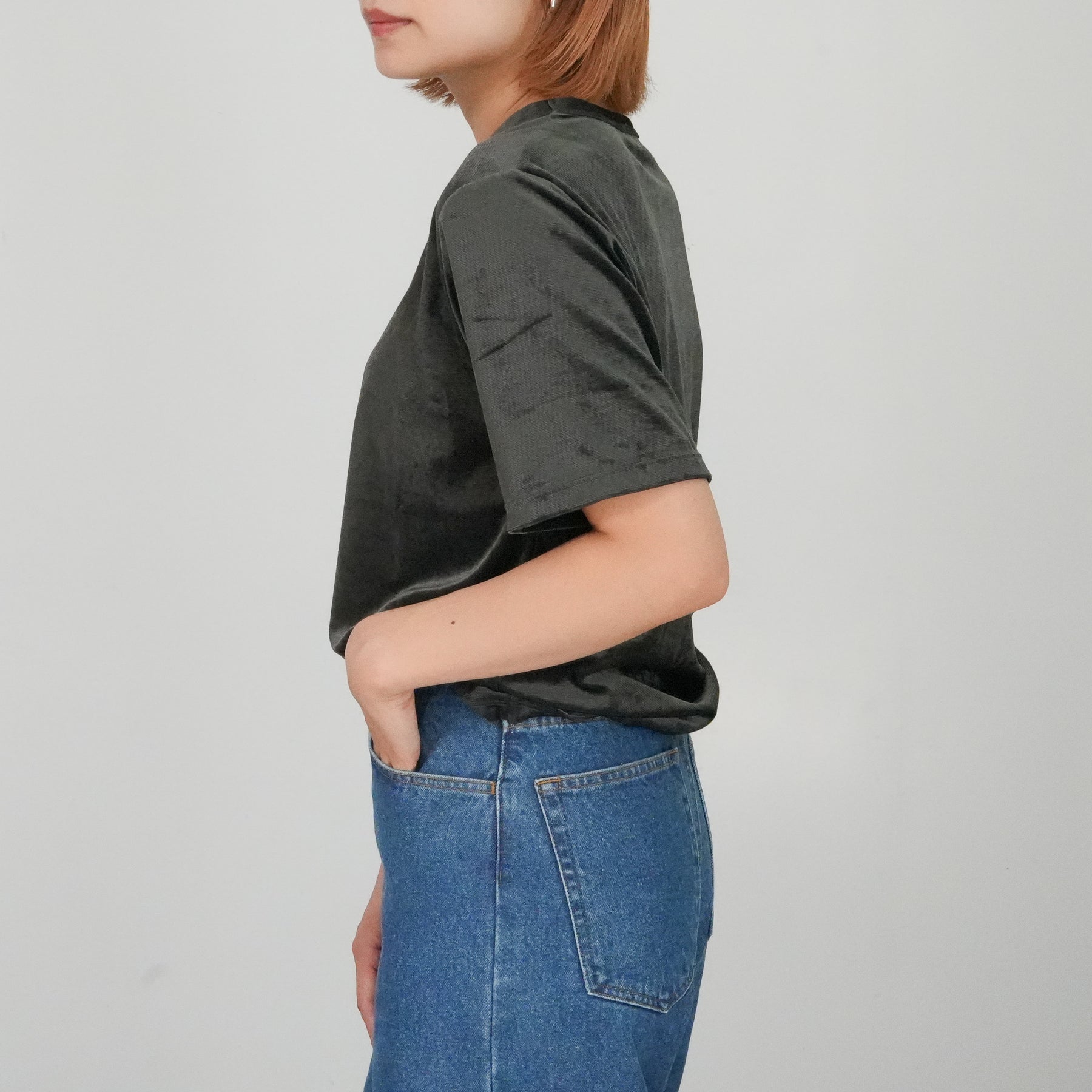 光沢感とドレープ性の高いトリアセテート素材のベロア生地を使用した半袖Tシャツ。 生地の表面が細いボーダーになっているのでメランジ調な見え方になり、大人っぽい上品な光沢感が特徴です。同素材のVELOUR LONG SLEEVE TEEとのレイヤードもオススメです。