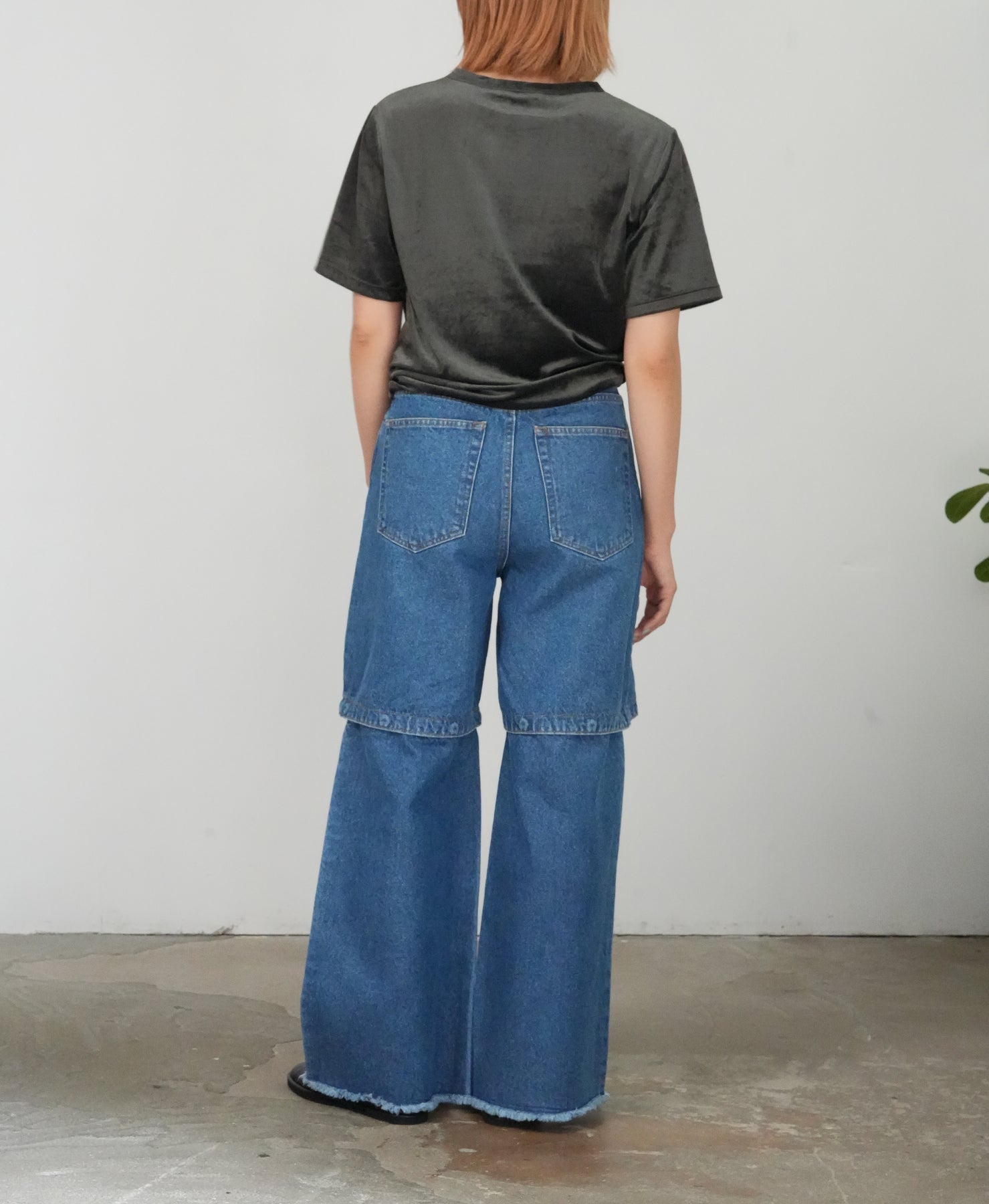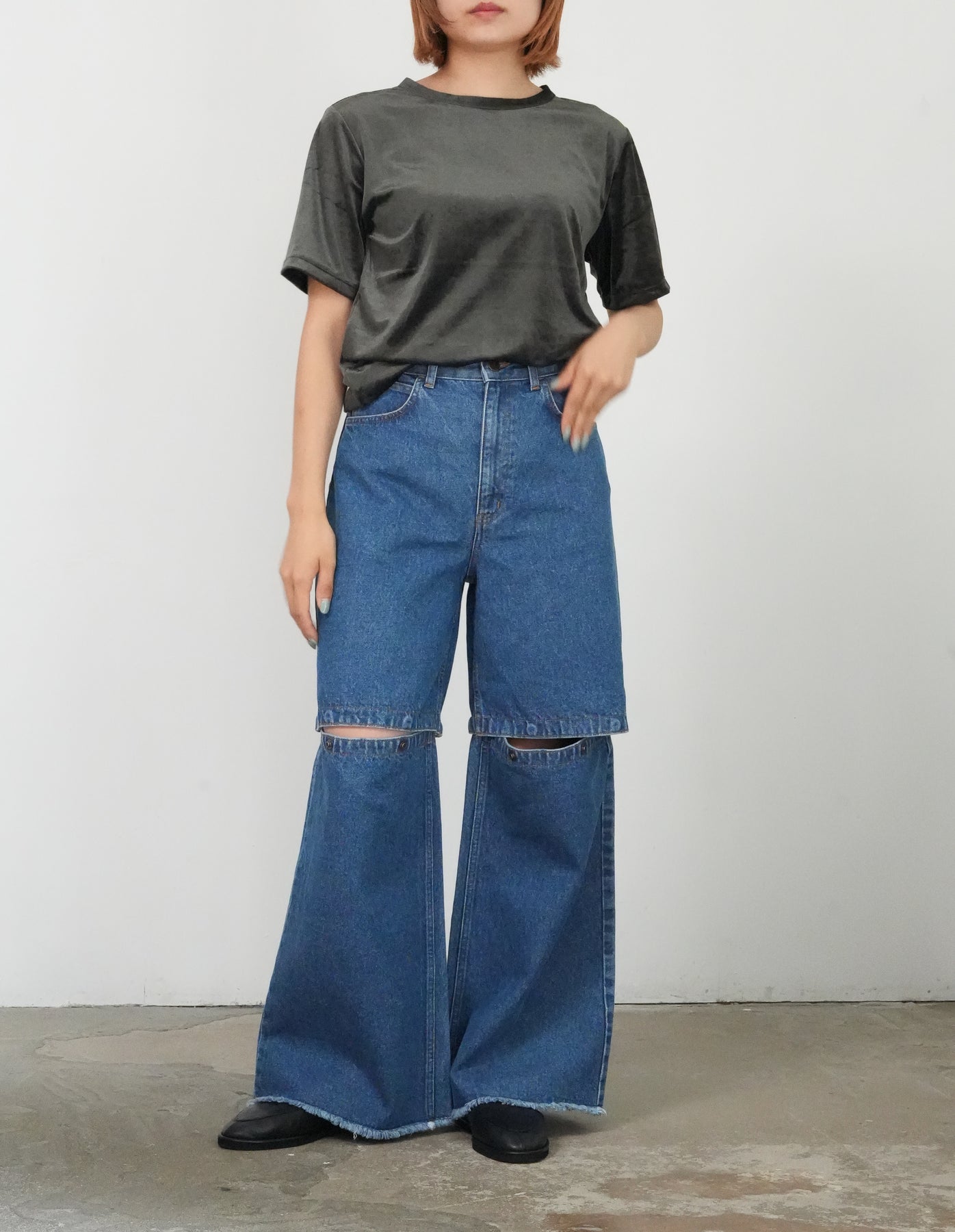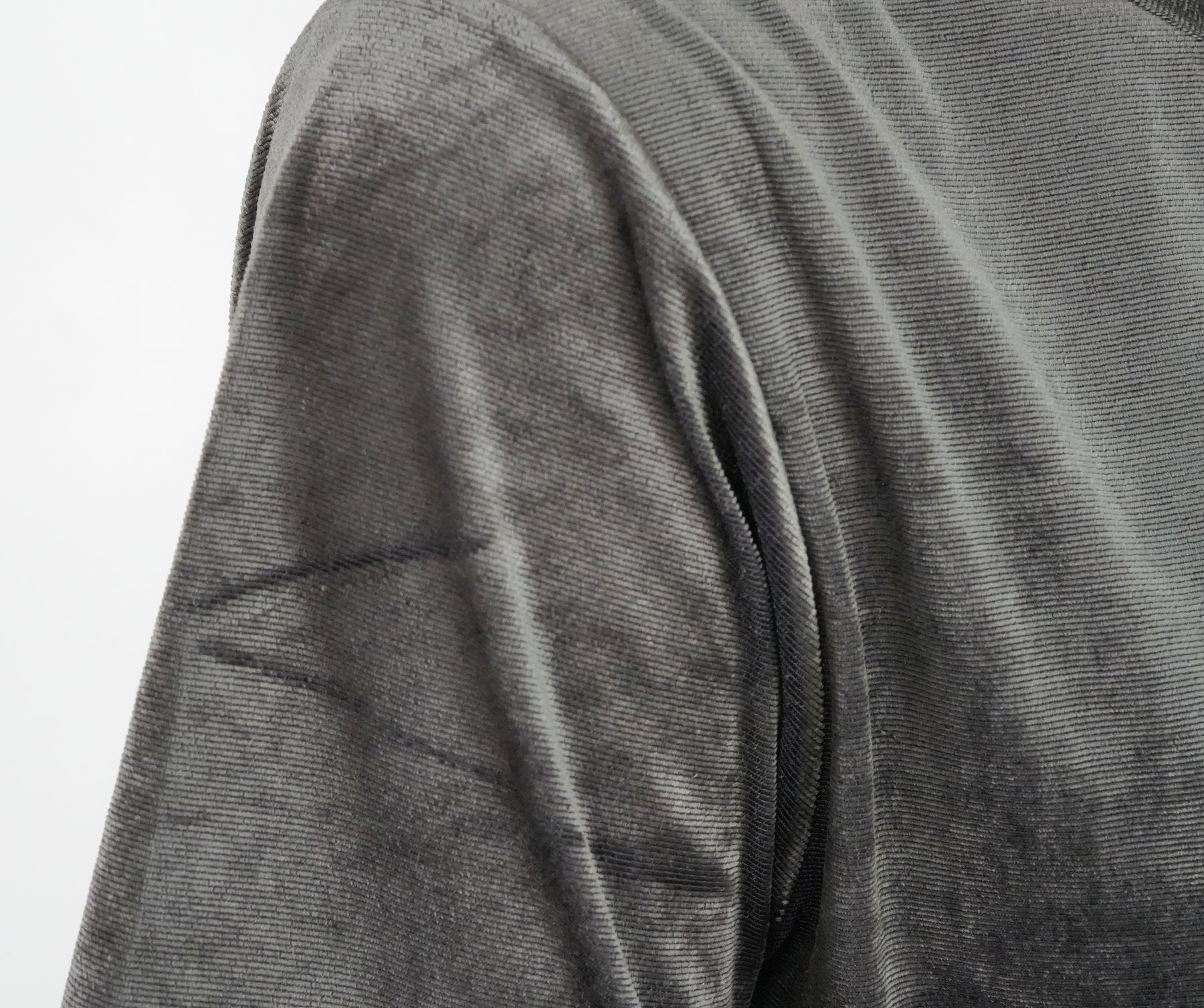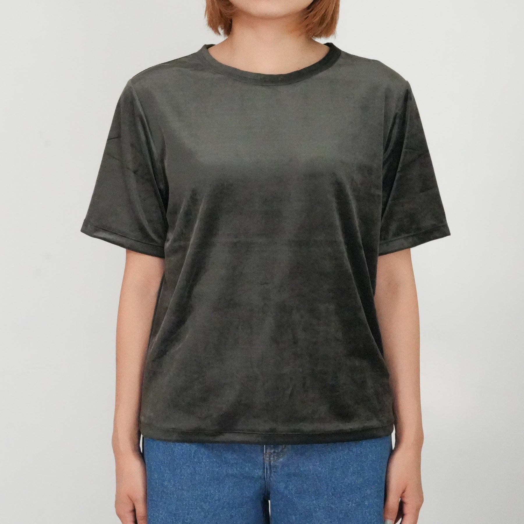光沢感とドレープ性の高いトリアセテート素材のベロア生地を使用した半袖Tシャツ。 生地の表面が細いボーダーになっているのでメランジ調な見え方になり、大人っぽい上品な光沢感が特徴です。同素材のVELOUR LONG SLEEVE TEEとのレイヤードもオススメです。