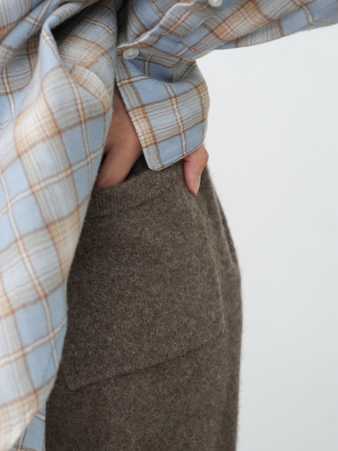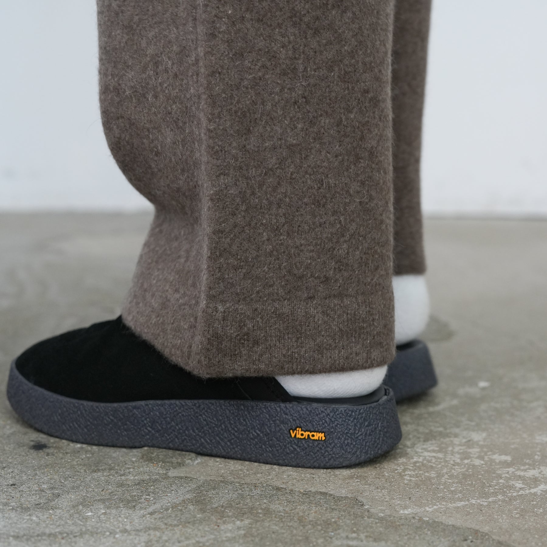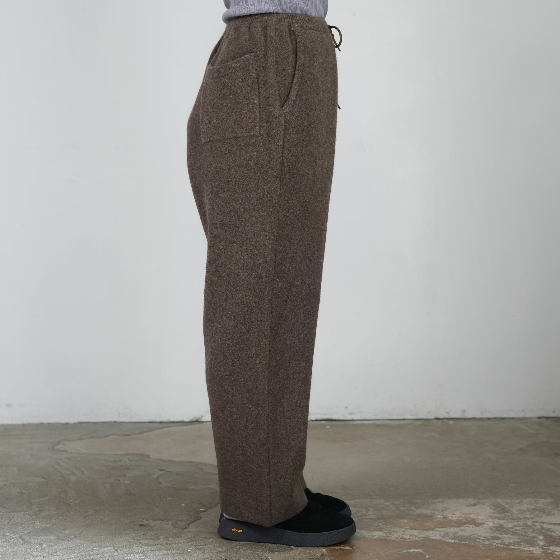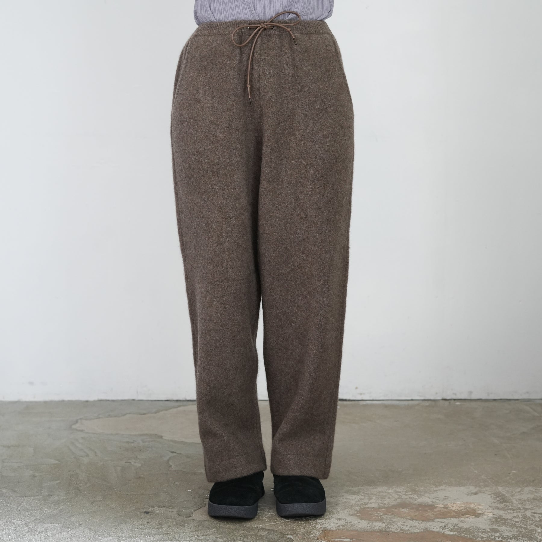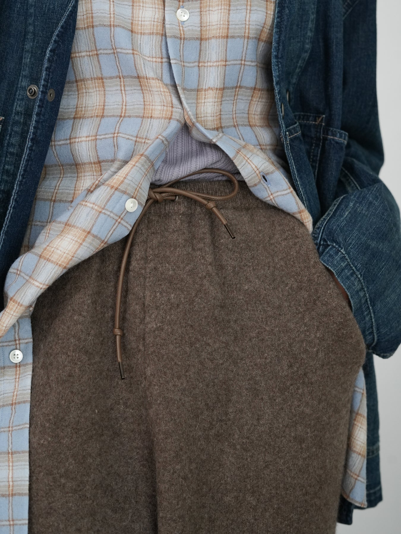 毛色の違うフェイクレザーのコードでドローストリングを配置。