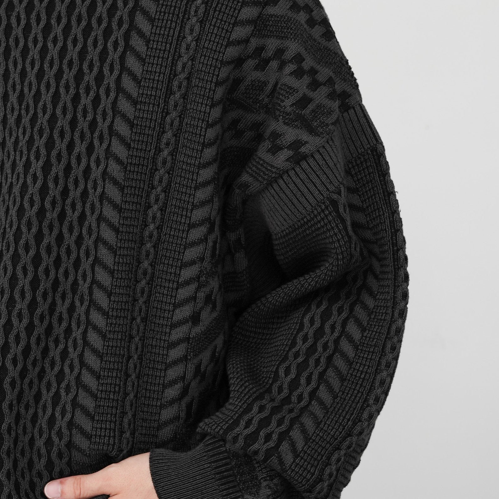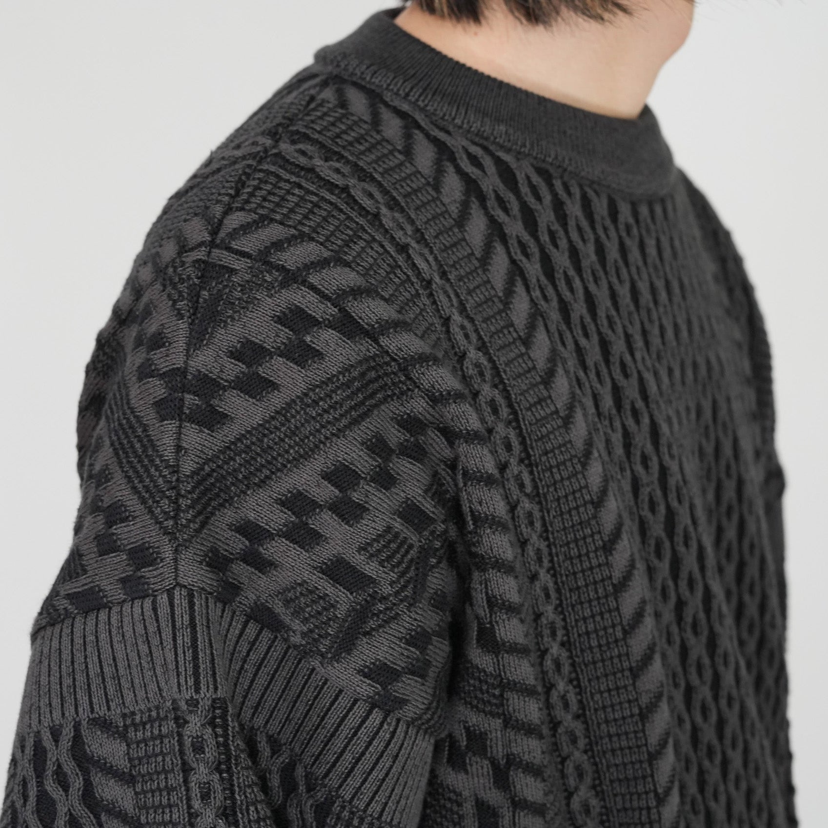 身頃中央のケーブル柄で厚い雲を表し、身頃横の斜線とケーブル柄で雪雷を表し、身頃脇の斜めに入る柄で激しく吹き付ける雪を表現しています。