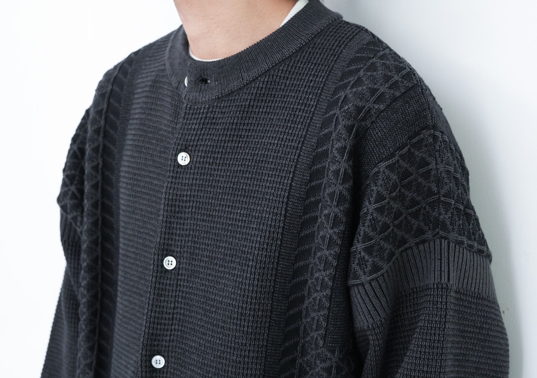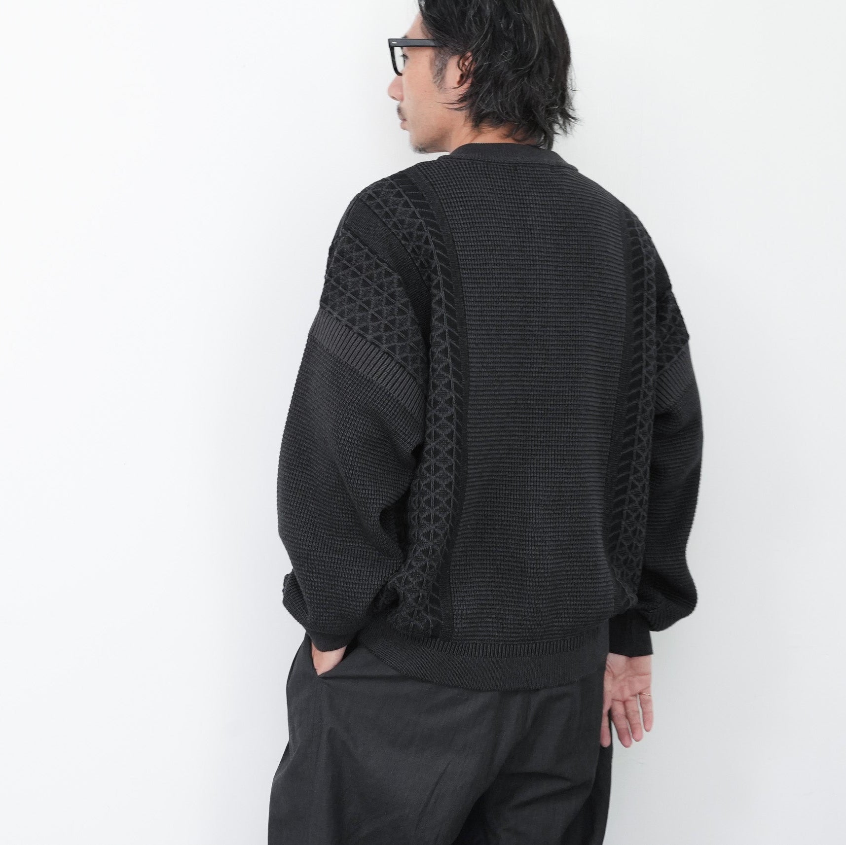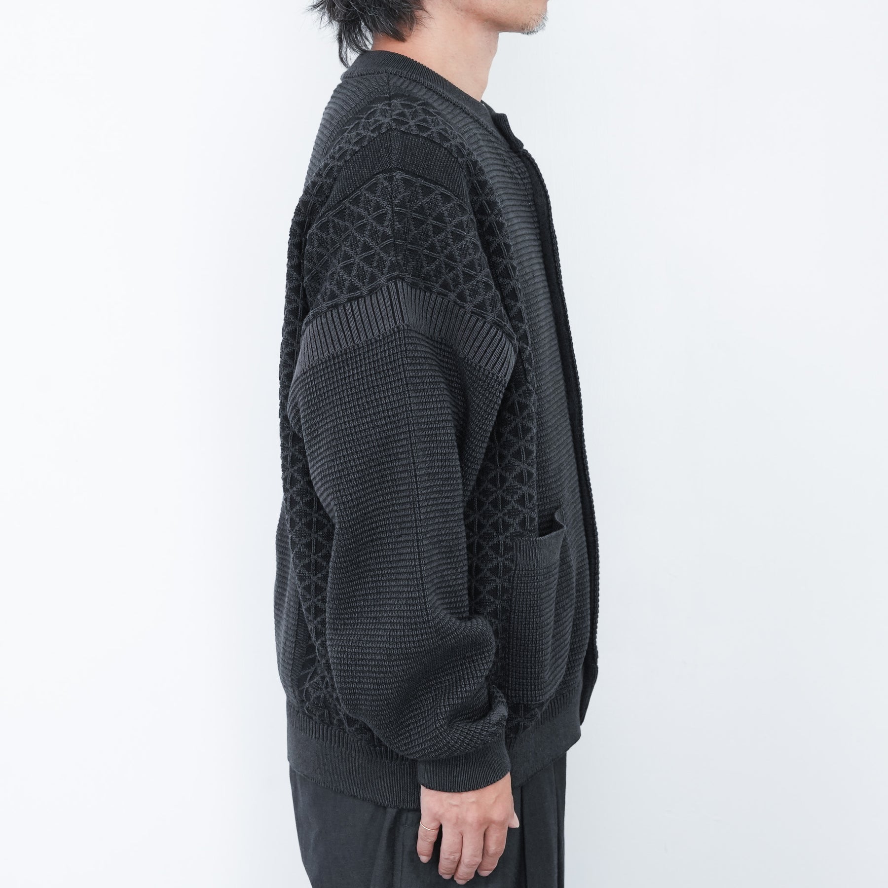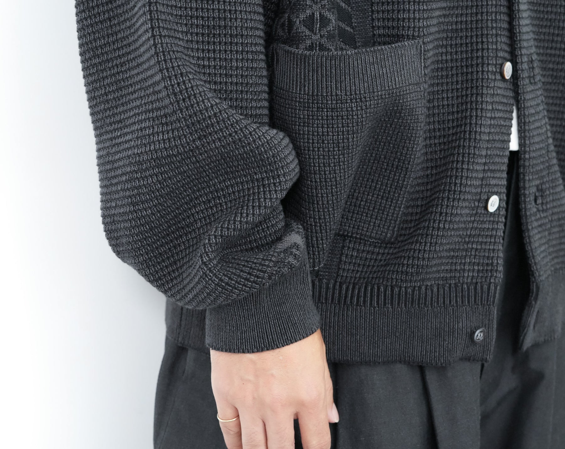 身頃脇の柄は雪の結晶を表し、身頃中央を袖のワッフル柄で雪に包まれた田畑や家を表しています。表側と裏側の糸色に濃淡をつけることで奥行きを出し、雪がゆっくりと積もっていく様を表現しています。