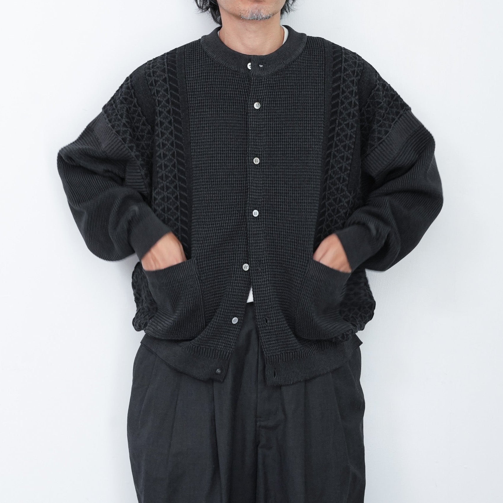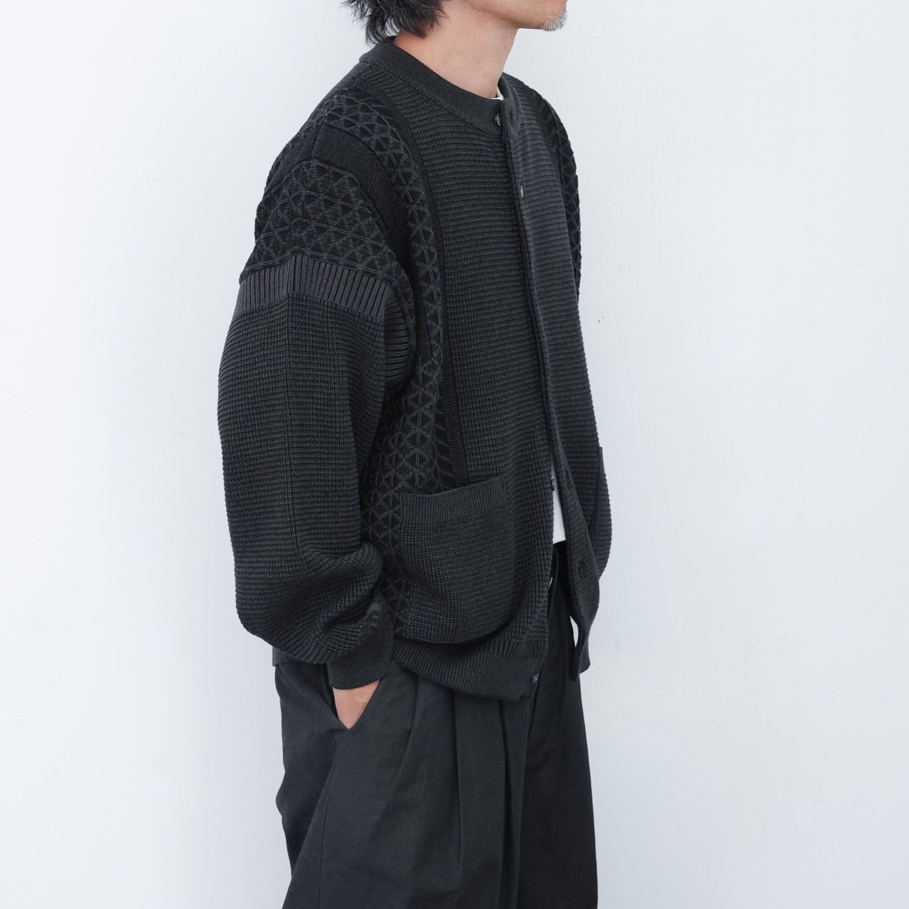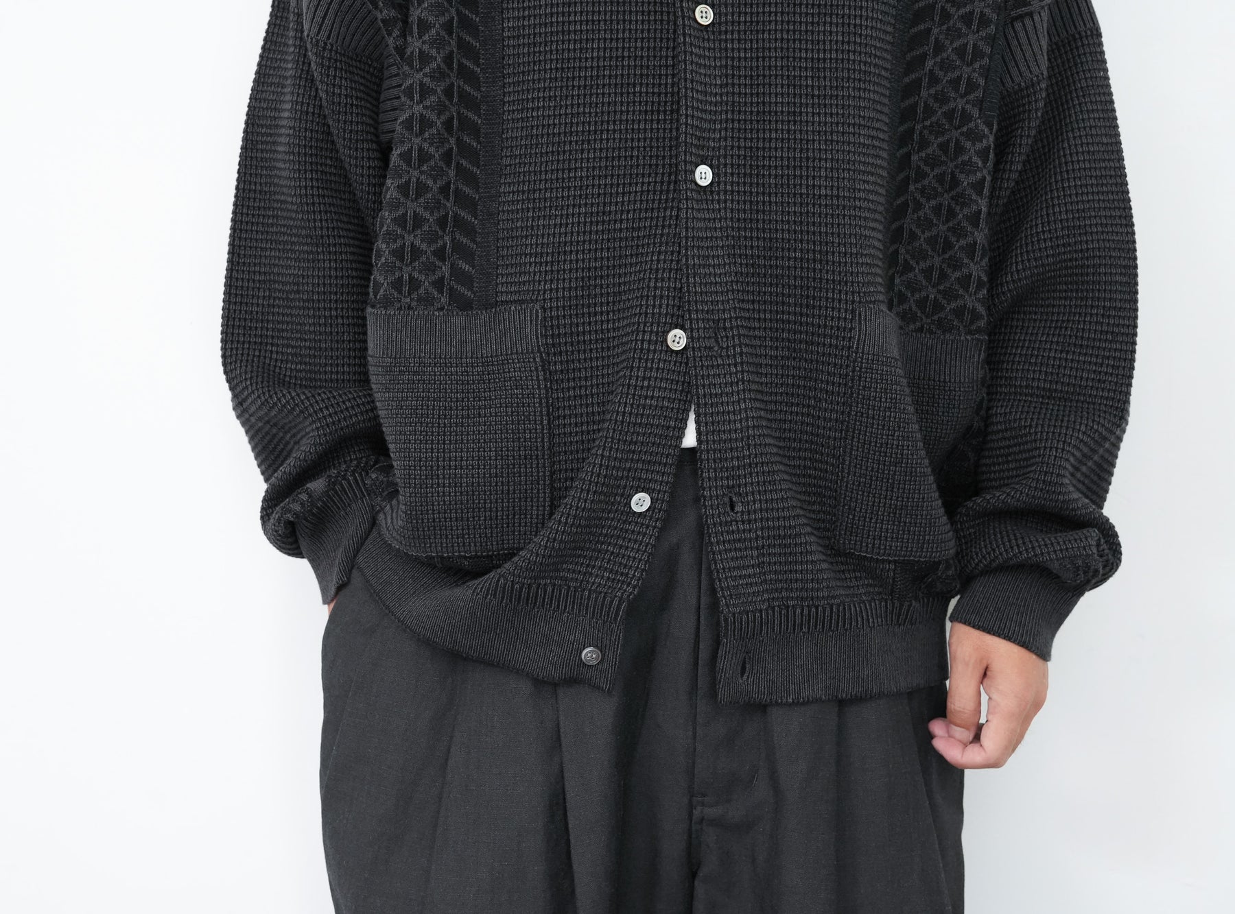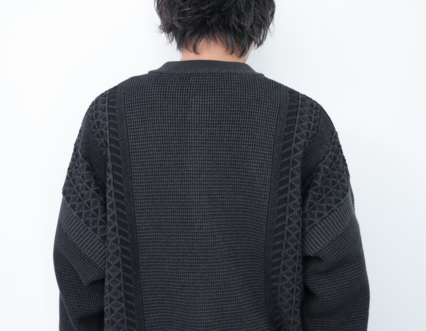 身頃脇の柄は雪の結晶を表し、身頃中央を袖のワッフル柄で雪に包まれた田畑や家を表しています。表側と裏側の糸色に濃淡をつけることで奥行きを出し、雪がゆっくりと積もっていく様を表現しています。