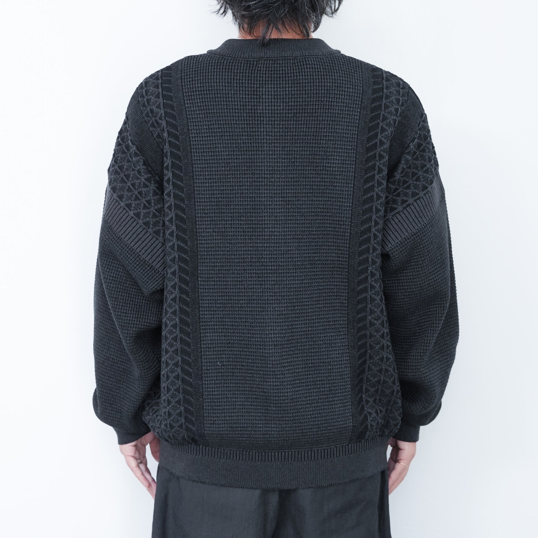 プレーティング編みと言われる表日側と裏日側で異なる糸を編む技法を使用し、表と裏で糸の色を変えて、2色で編むことで奥行きのある表情に仕上げました。