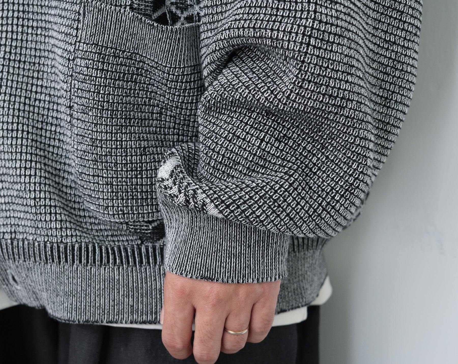 身頃脇の柄は雪の結晶を表し、身頃中央を袖のワッフル柄で雪に包まれた田畑や家を表しています。表側と裏側の糸色に濃淡をつけることで奥行きを出し、雪がゆっくりと積もっていく様を表現しています。