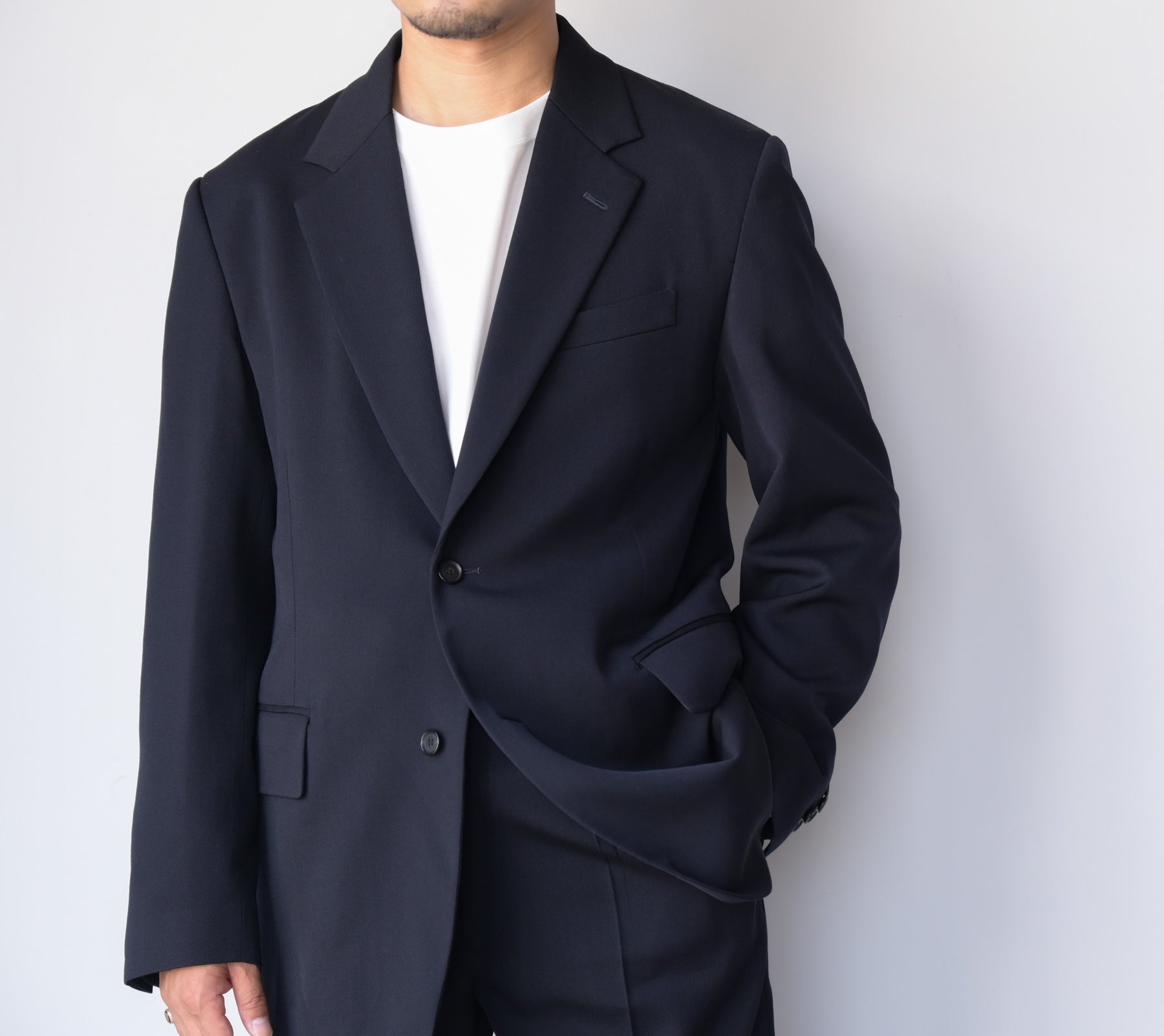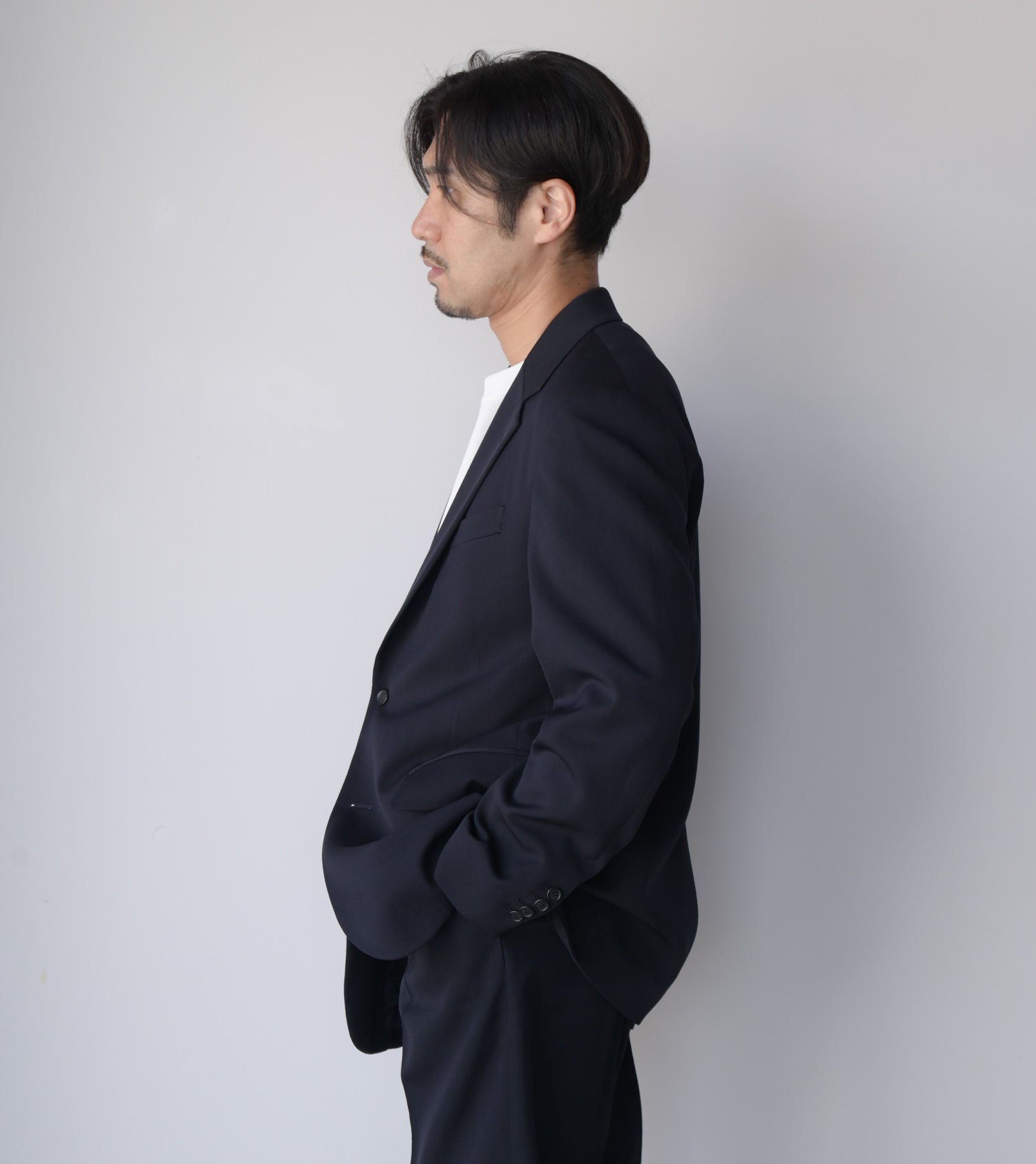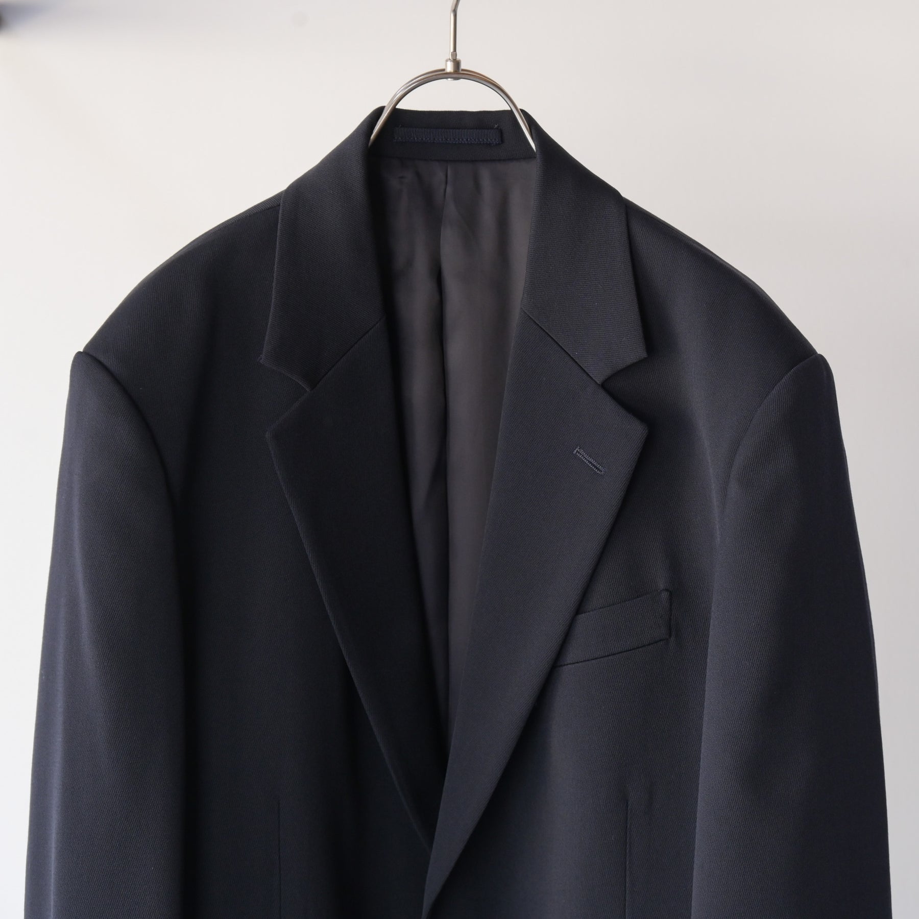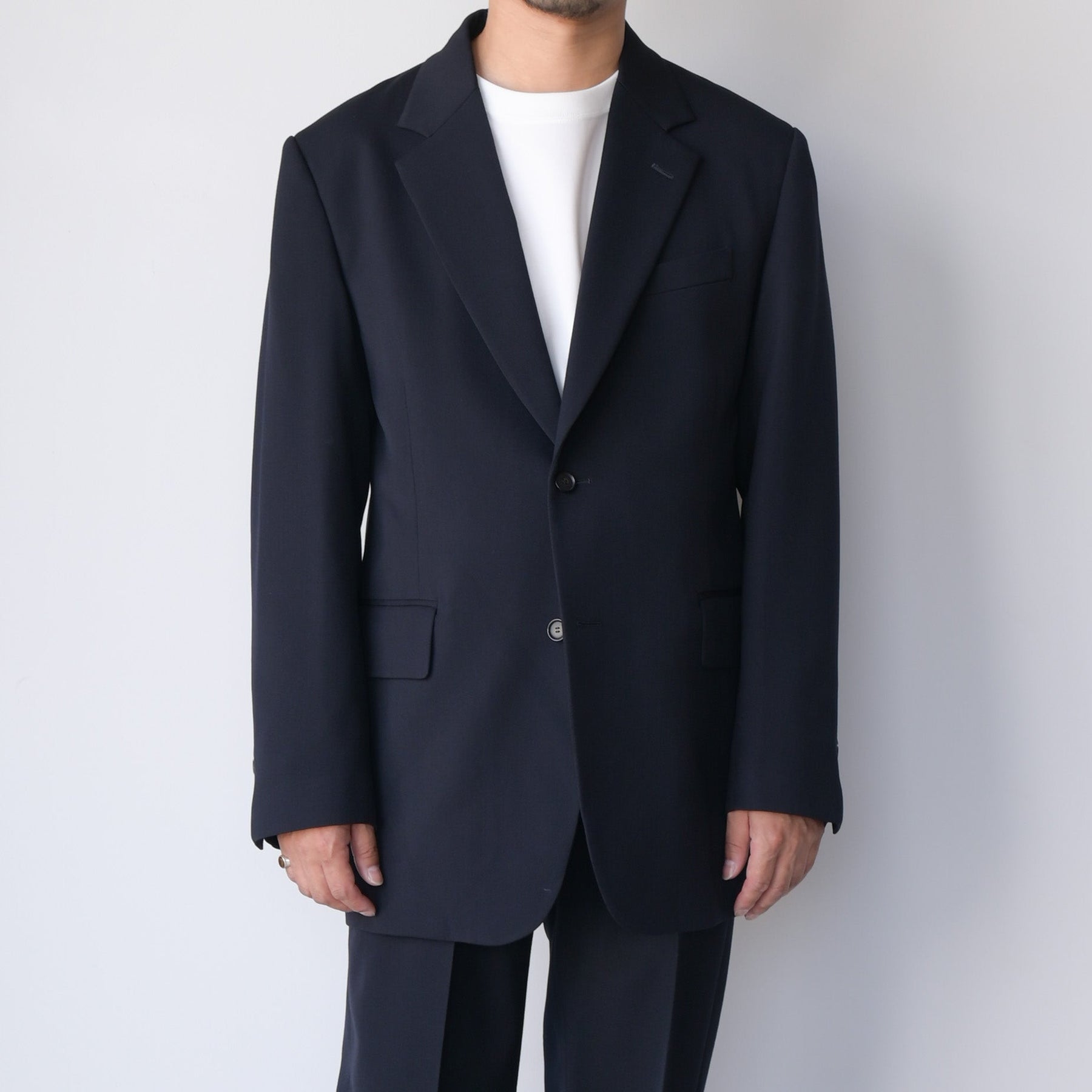 撚りを工夫した細番手のウールを綾目が太く丈夫なトリコチン組織にすることで、肉感がありながら落ち感のある素材に仕上げました。ゆったりしたシルエットのテーラードジャケットです。