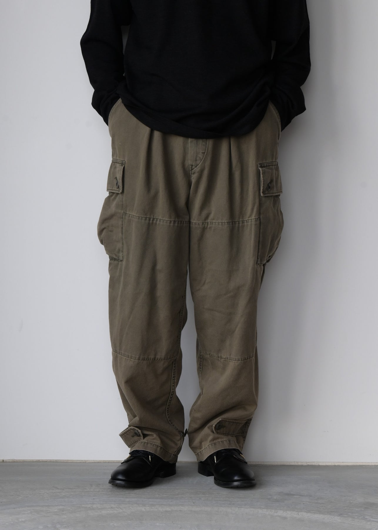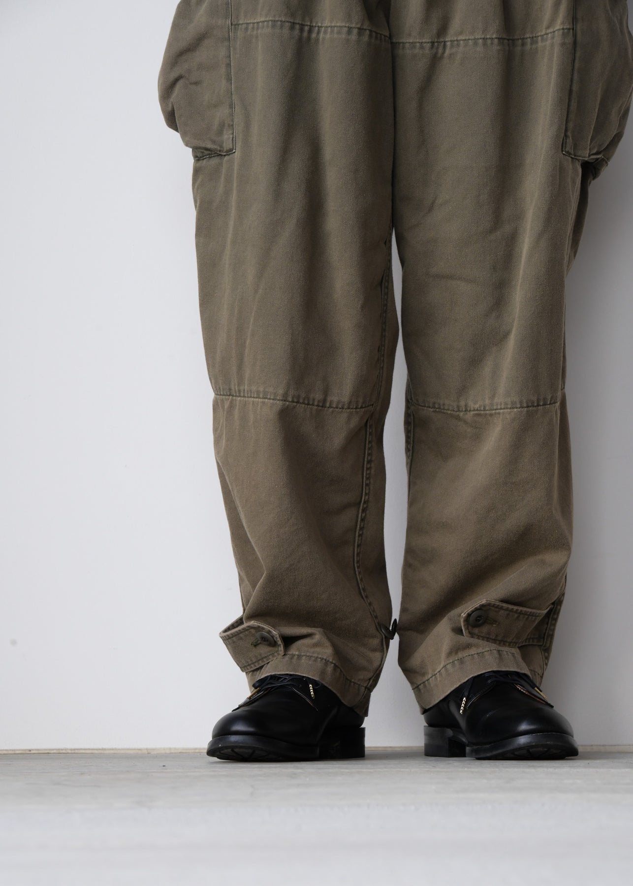 上品なコットンツイルに顔料を乗せ、特殊な洗い加工で独特なユーズド感を表現しました。裾アジャスターでシルエットが変えられます。