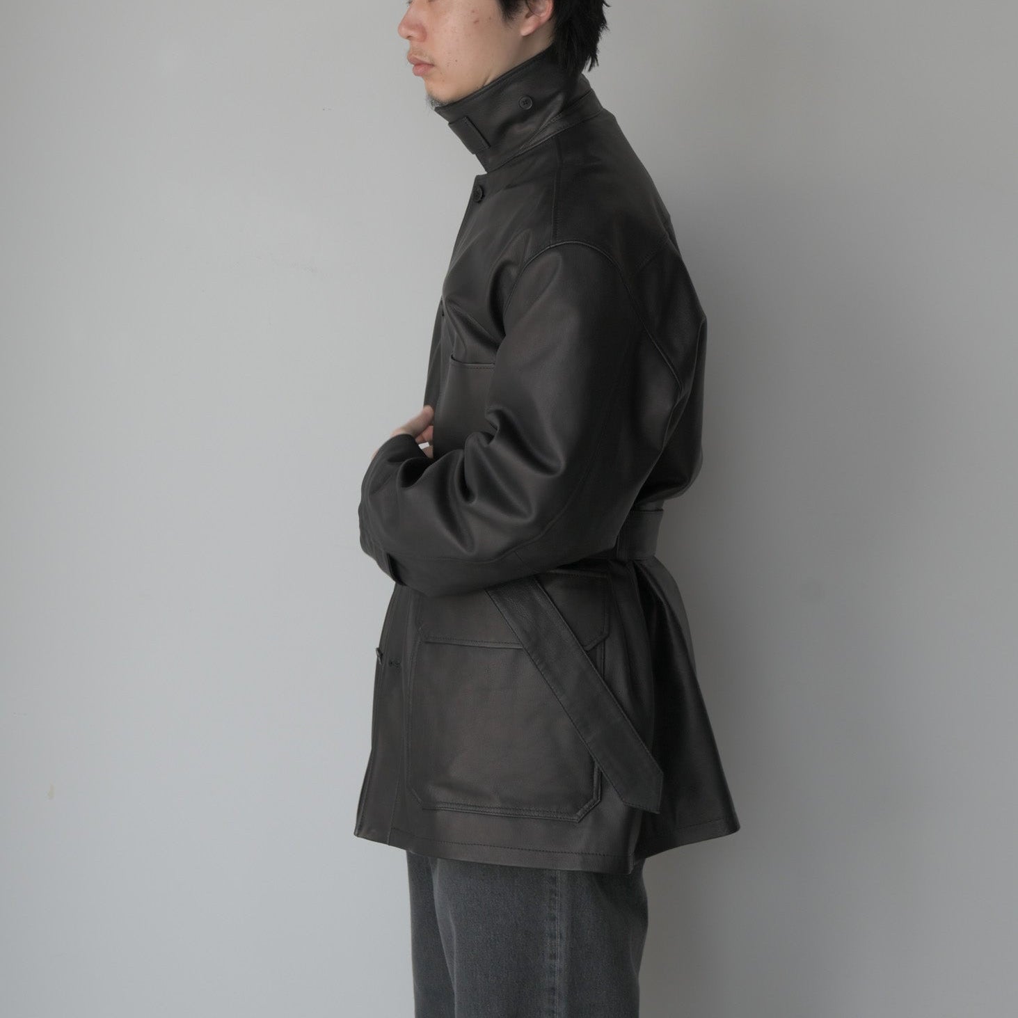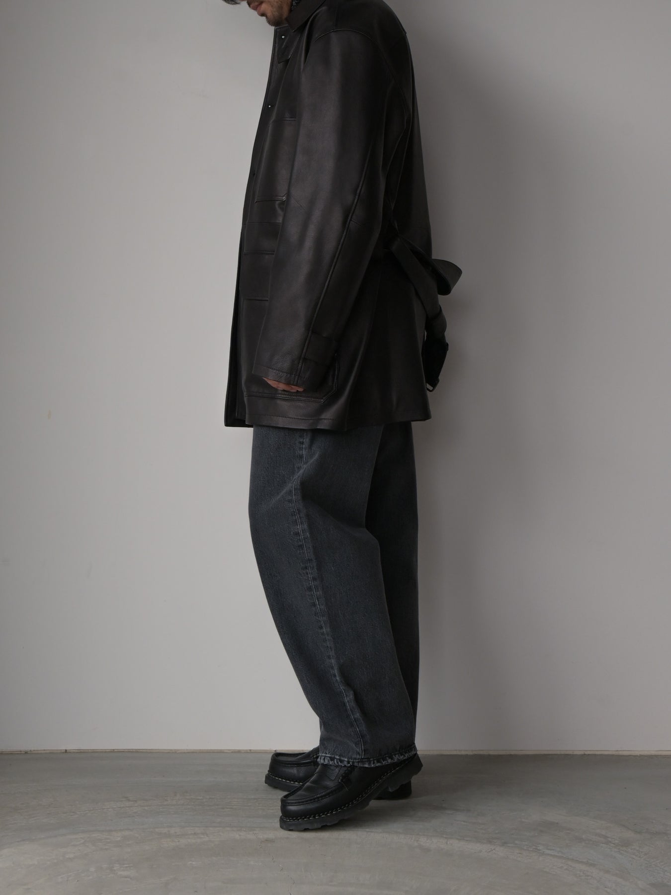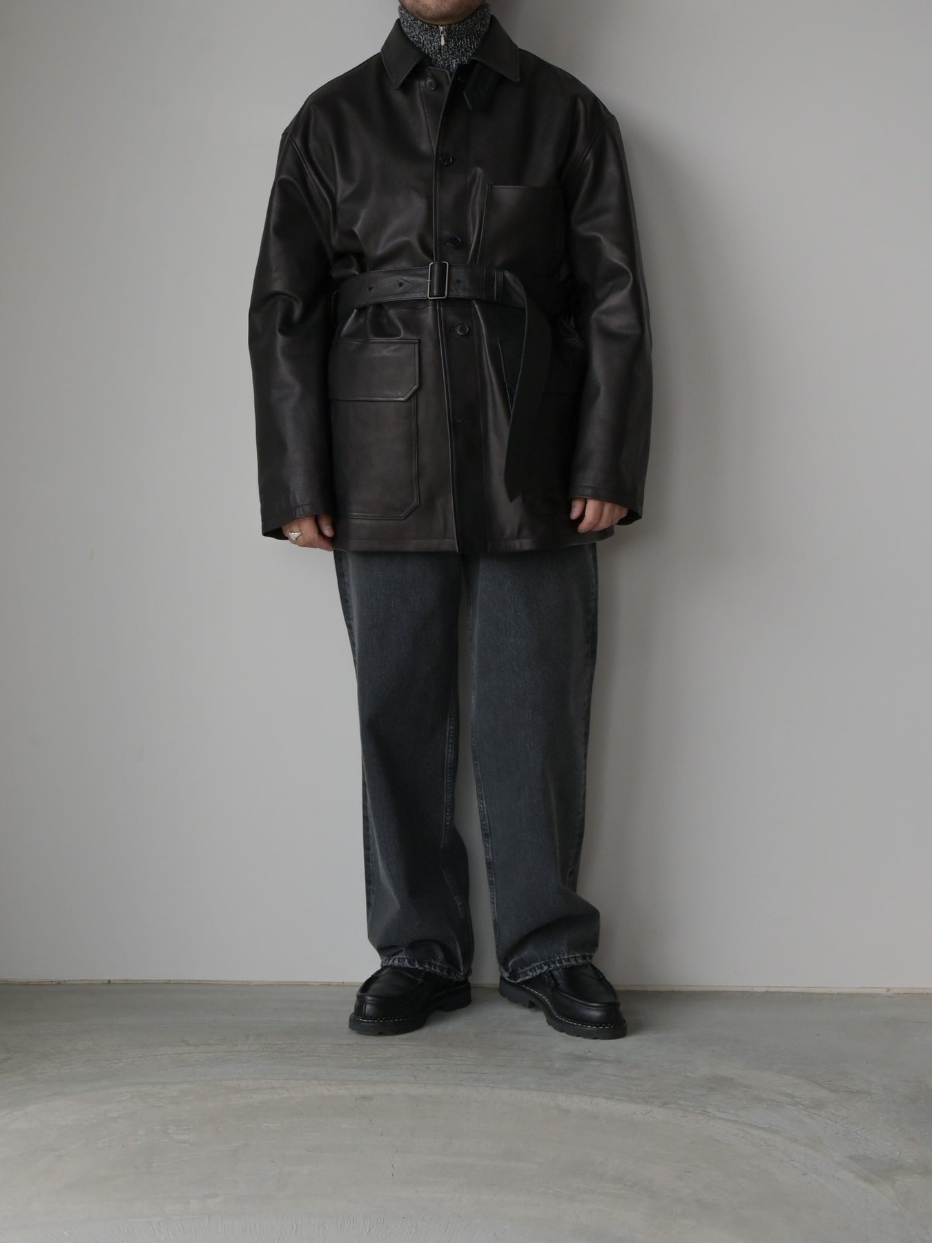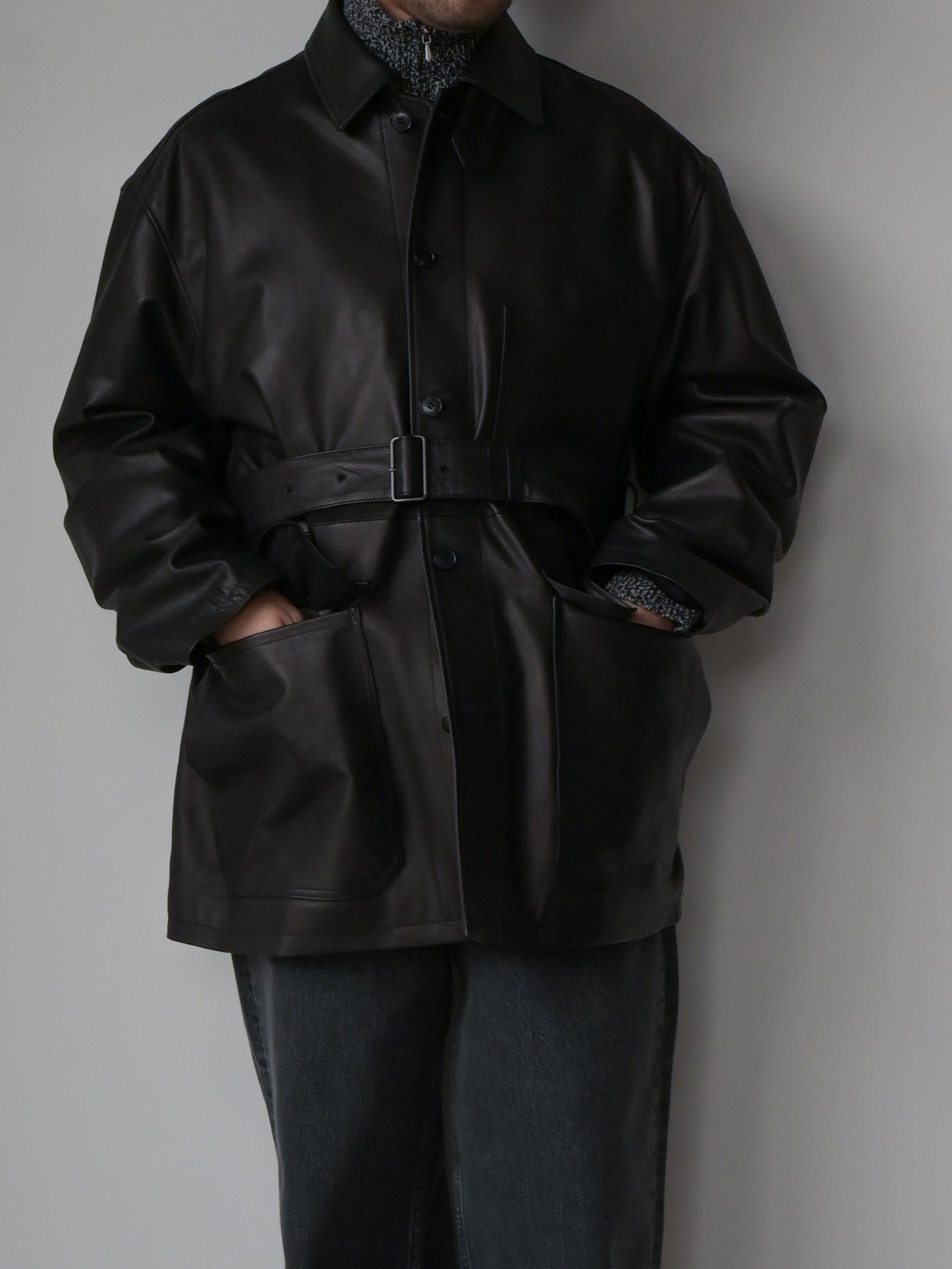 染料による染色で色付けで赤みのブラックを表現。表面に顔料を使用しない、天然革本来のシボ感とエイジングを楽しめる革で絹ヅレのような音が特徴の皮です。カバーオールのベルトを付けたデザインで、ハーフコートの様な着方が出来るとても軽いアウターです。