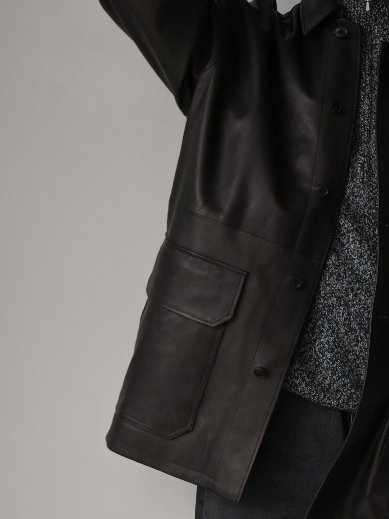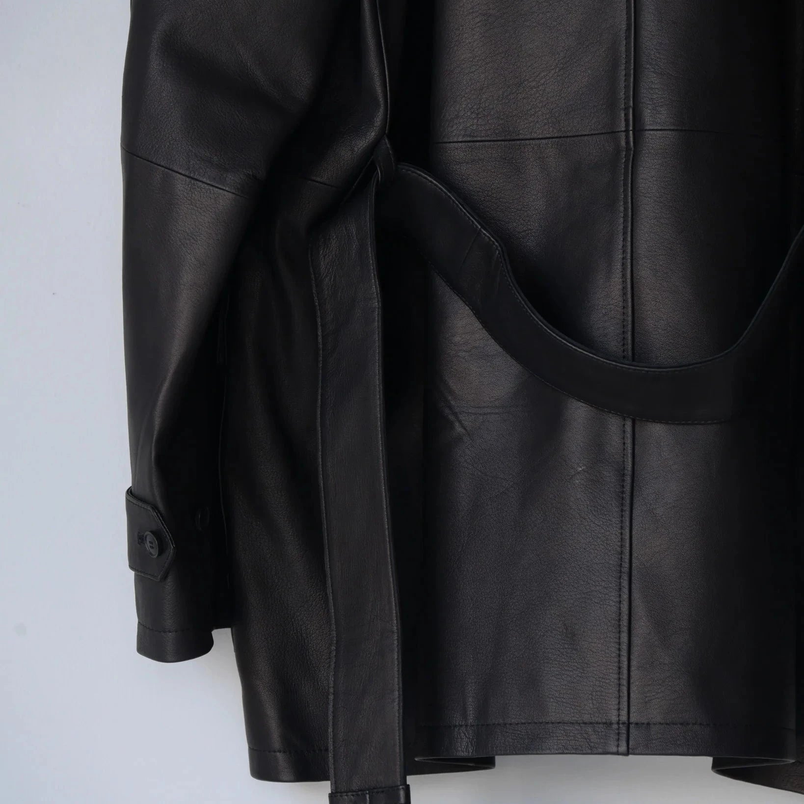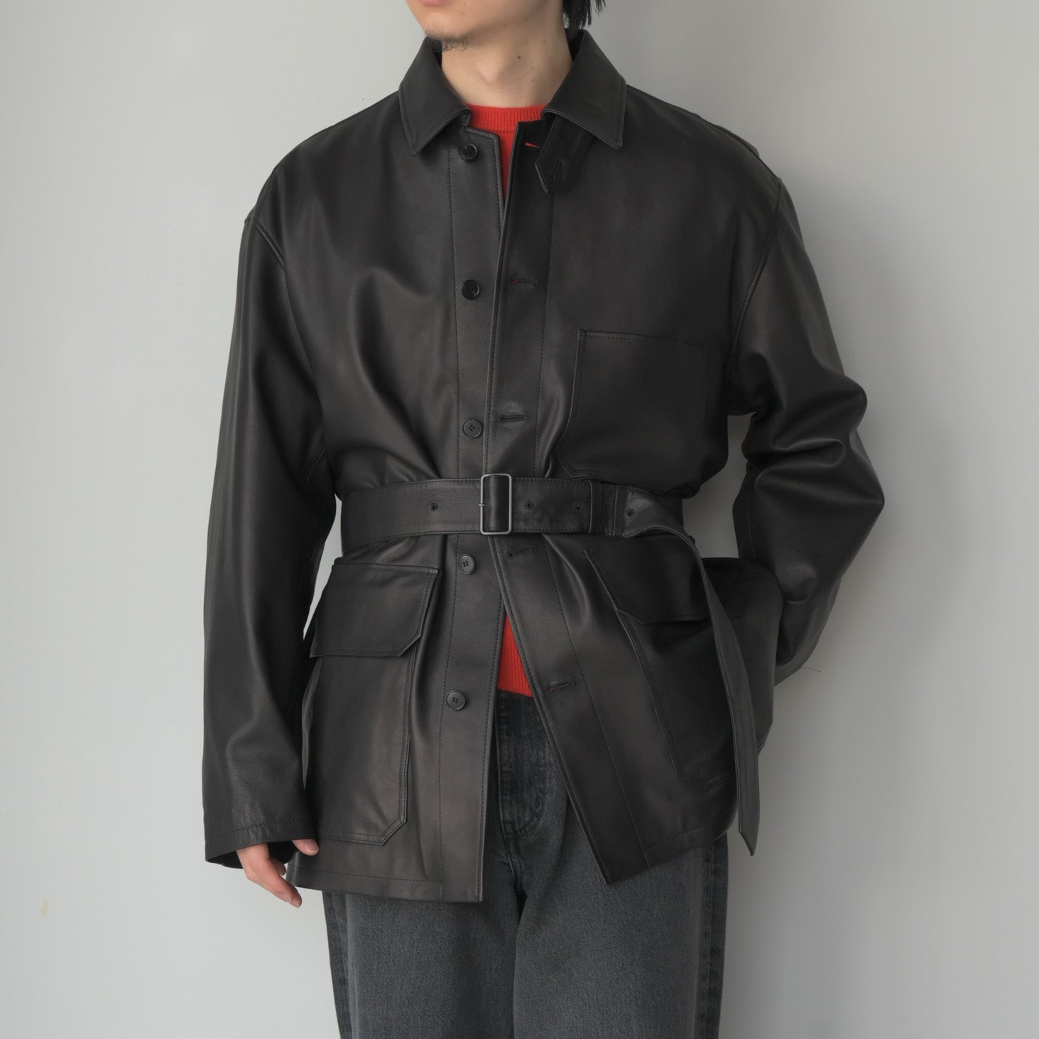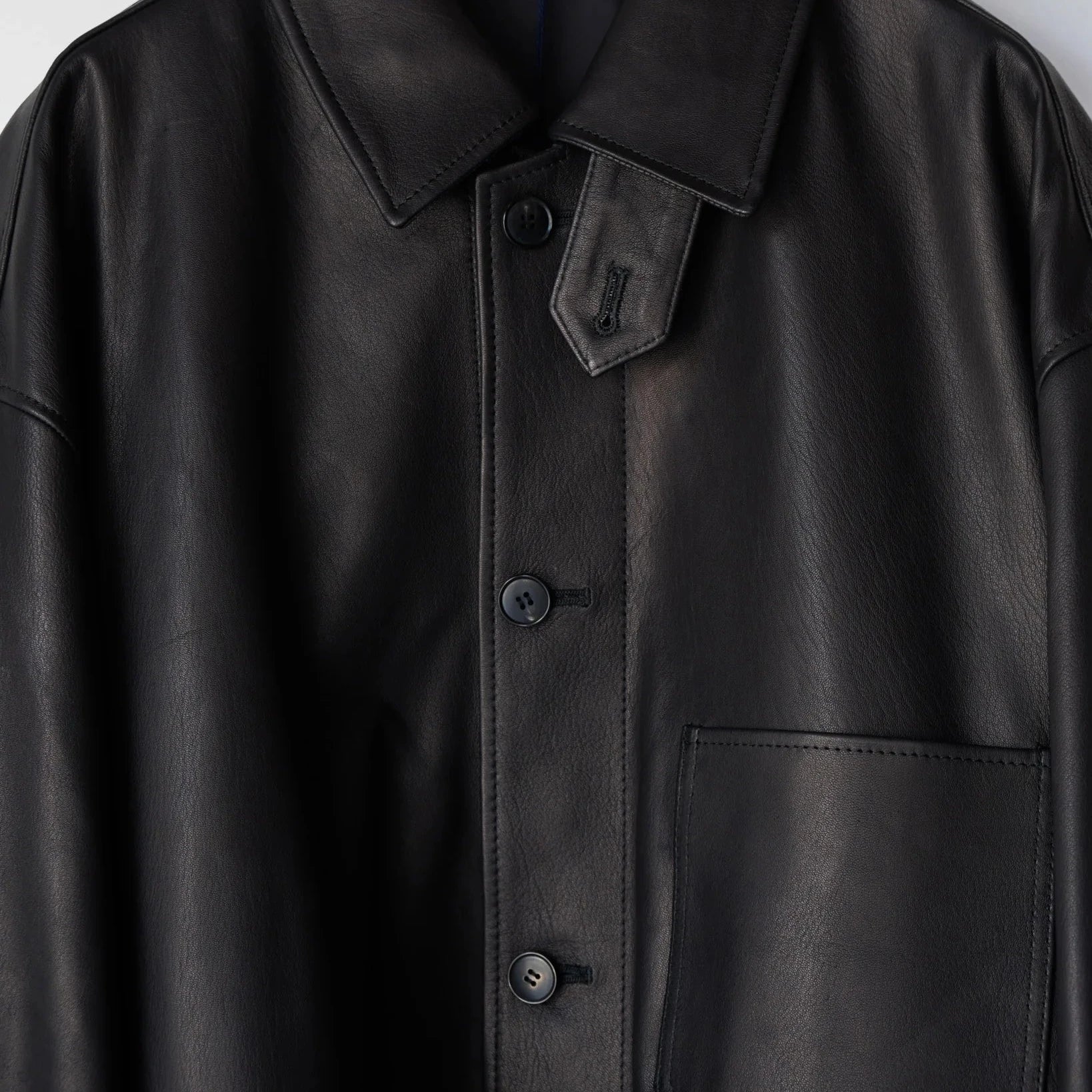 染料による染色で色付けで赤みのブラックを表現。表面に顔料を使用しない、天然革本来のシボ感とエイジングを楽しめる革で絹ヅレのような音が特徴の皮です。カバーオールのベルトを付けたデザインで、ハーフコートの様な着方が出来るとても軽いアウターです。