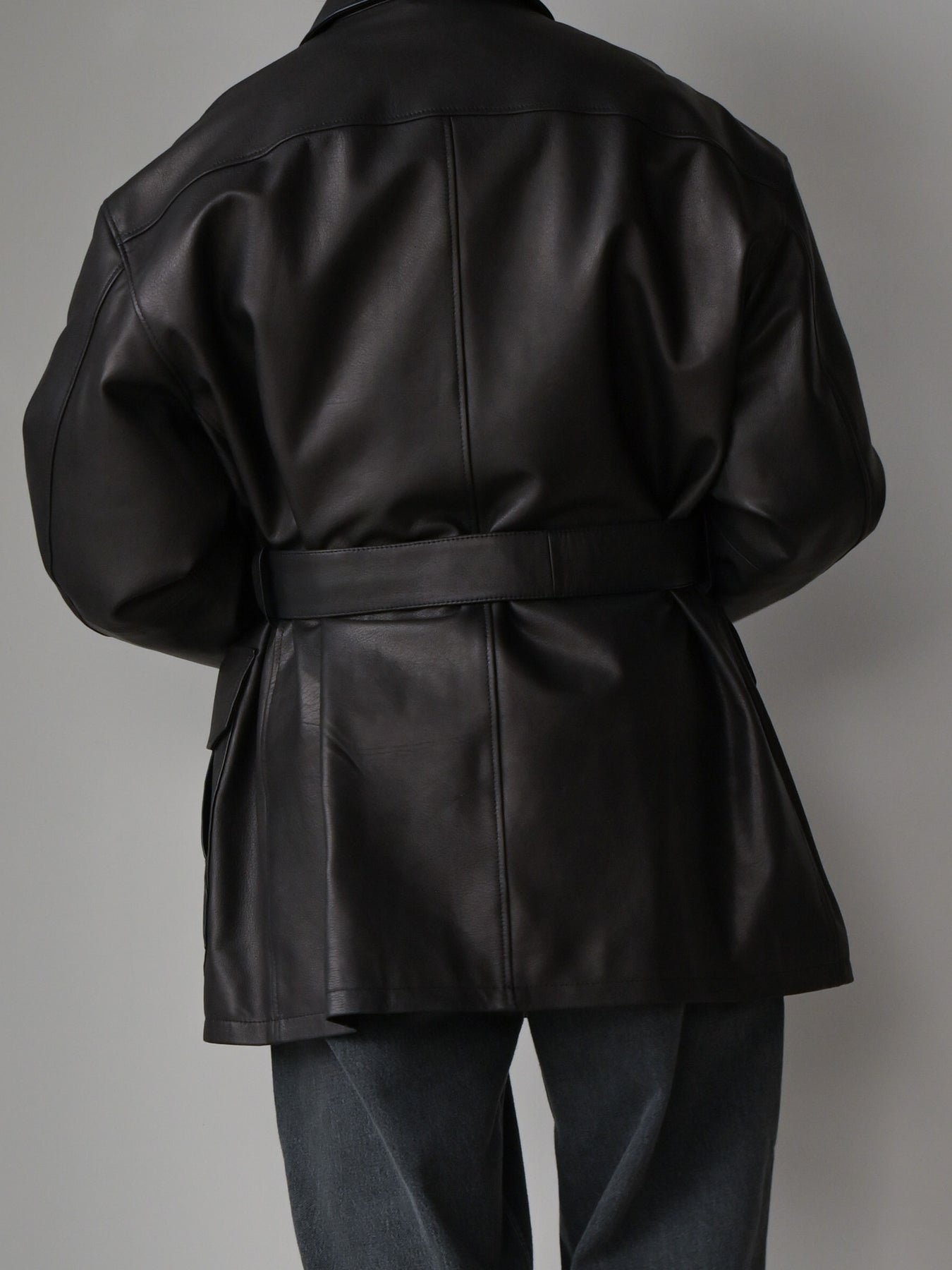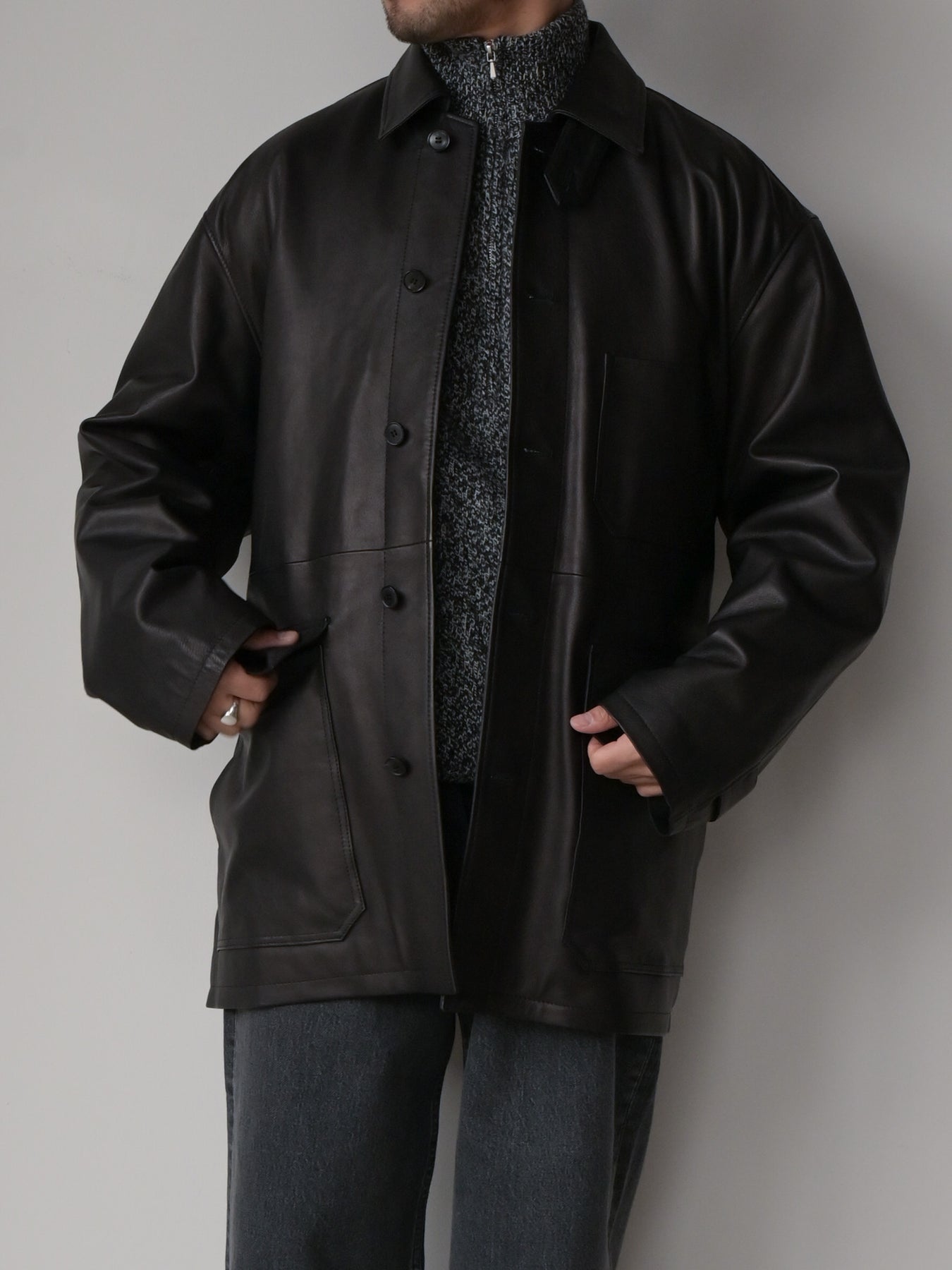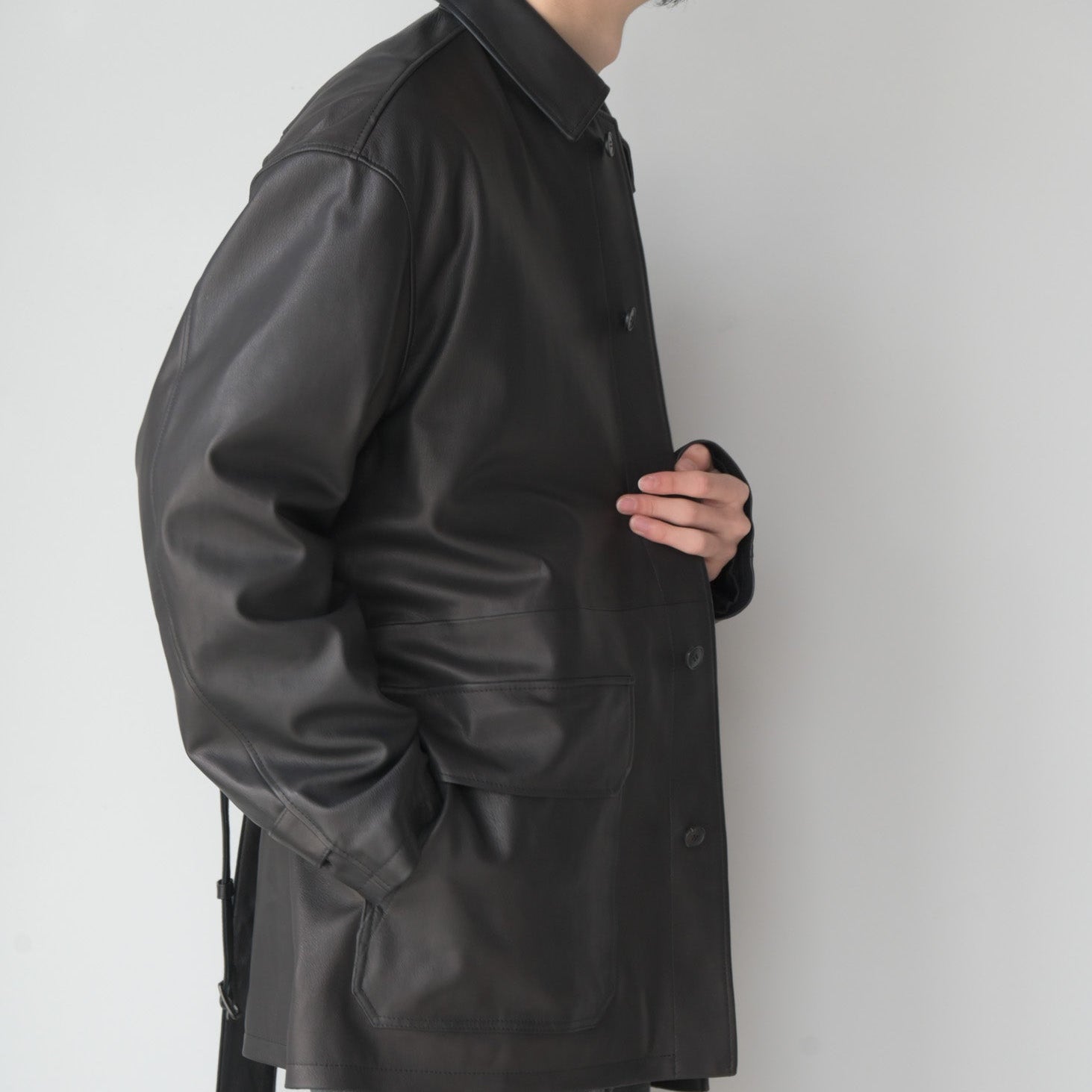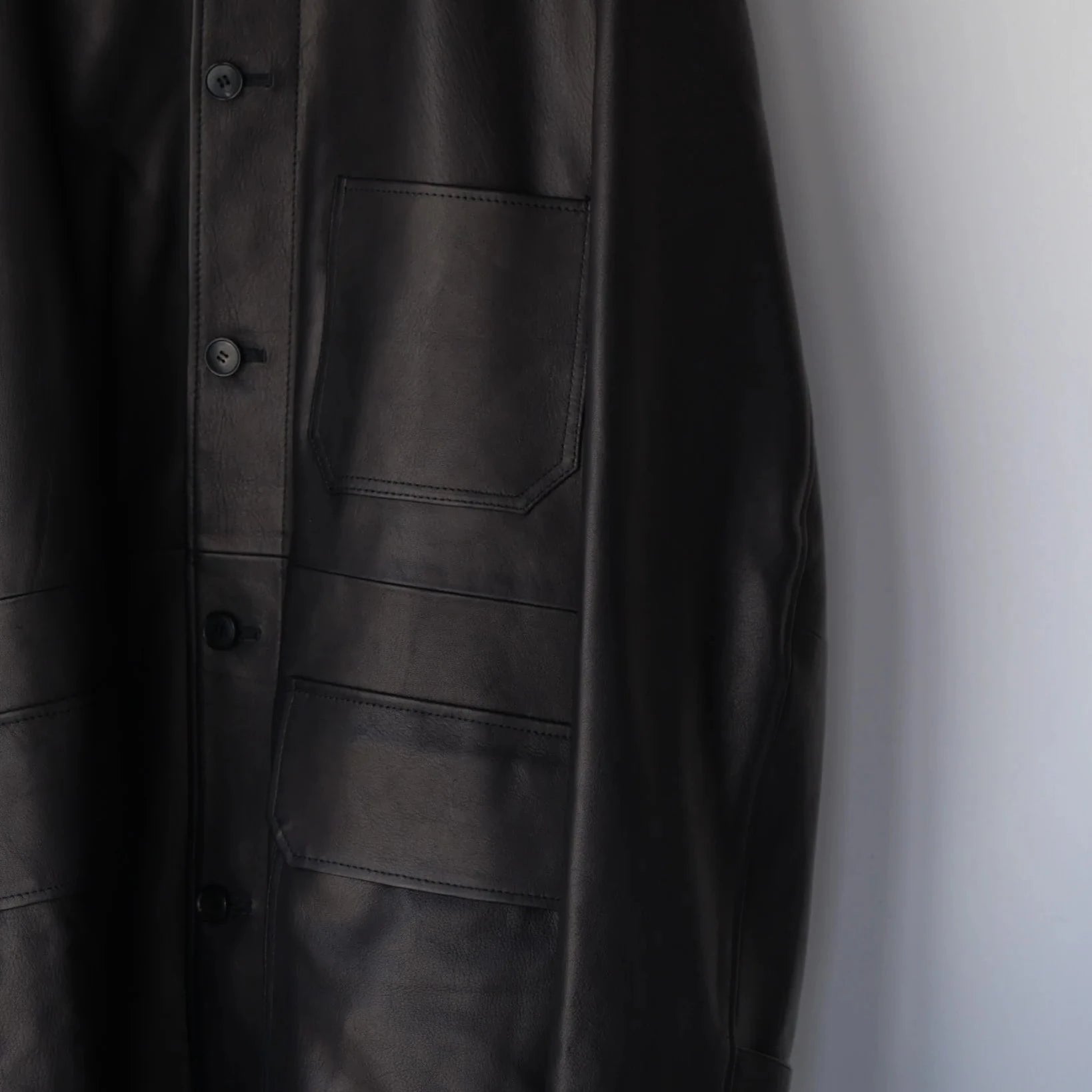 染料による染色で色付けで赤みのブラックを表現。表面に顔料を使用しない、天然革本来のシボ感とエイジングを楽しめる革で絹ヅレのような音が特徴の皮です。カバーオールのベルトを付けたデザインで、ハーフコートの様な着方が出来るとても軽いアウターです。