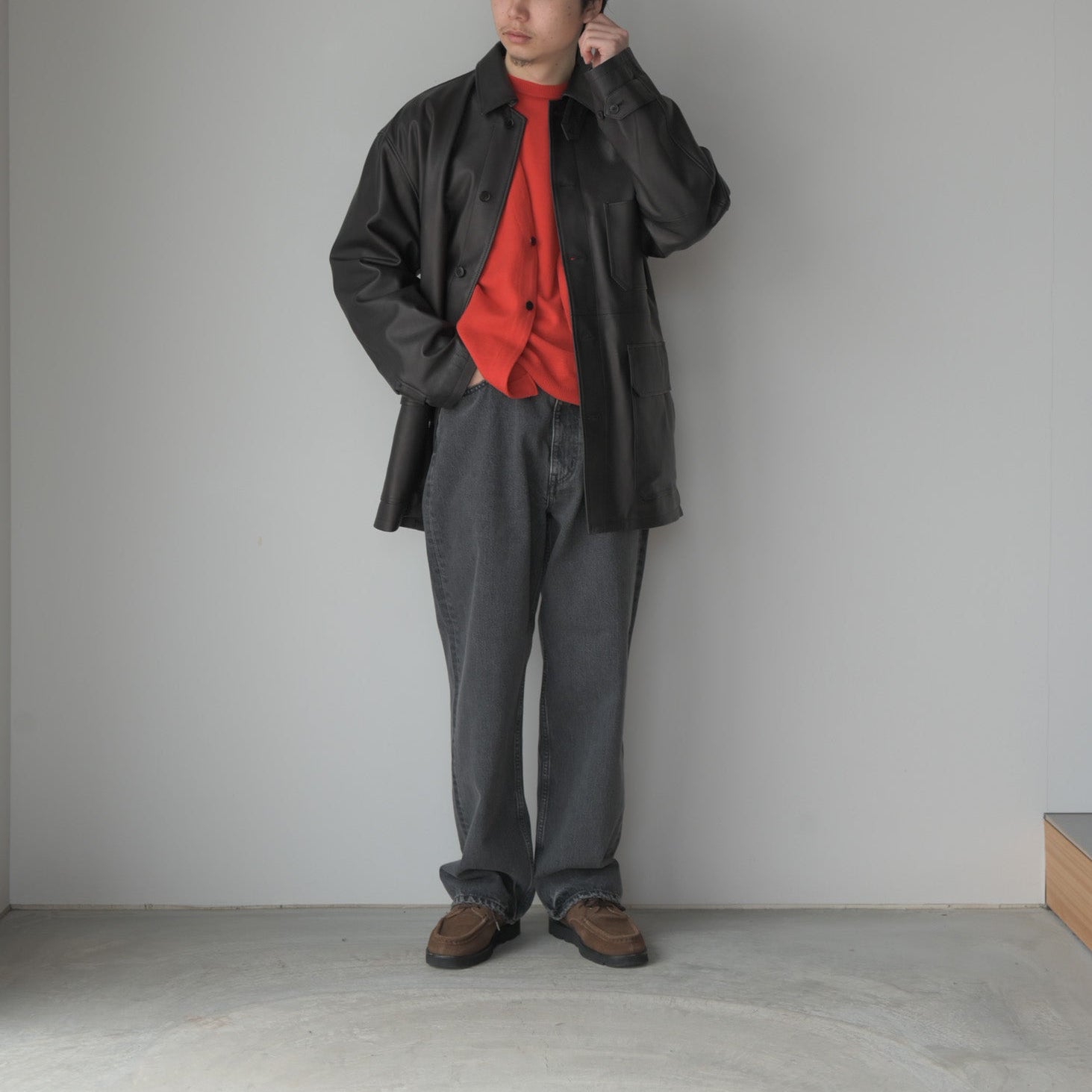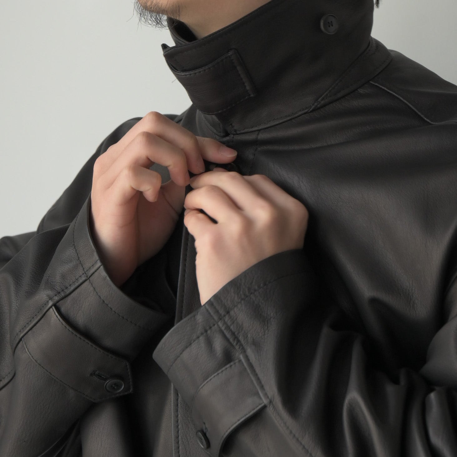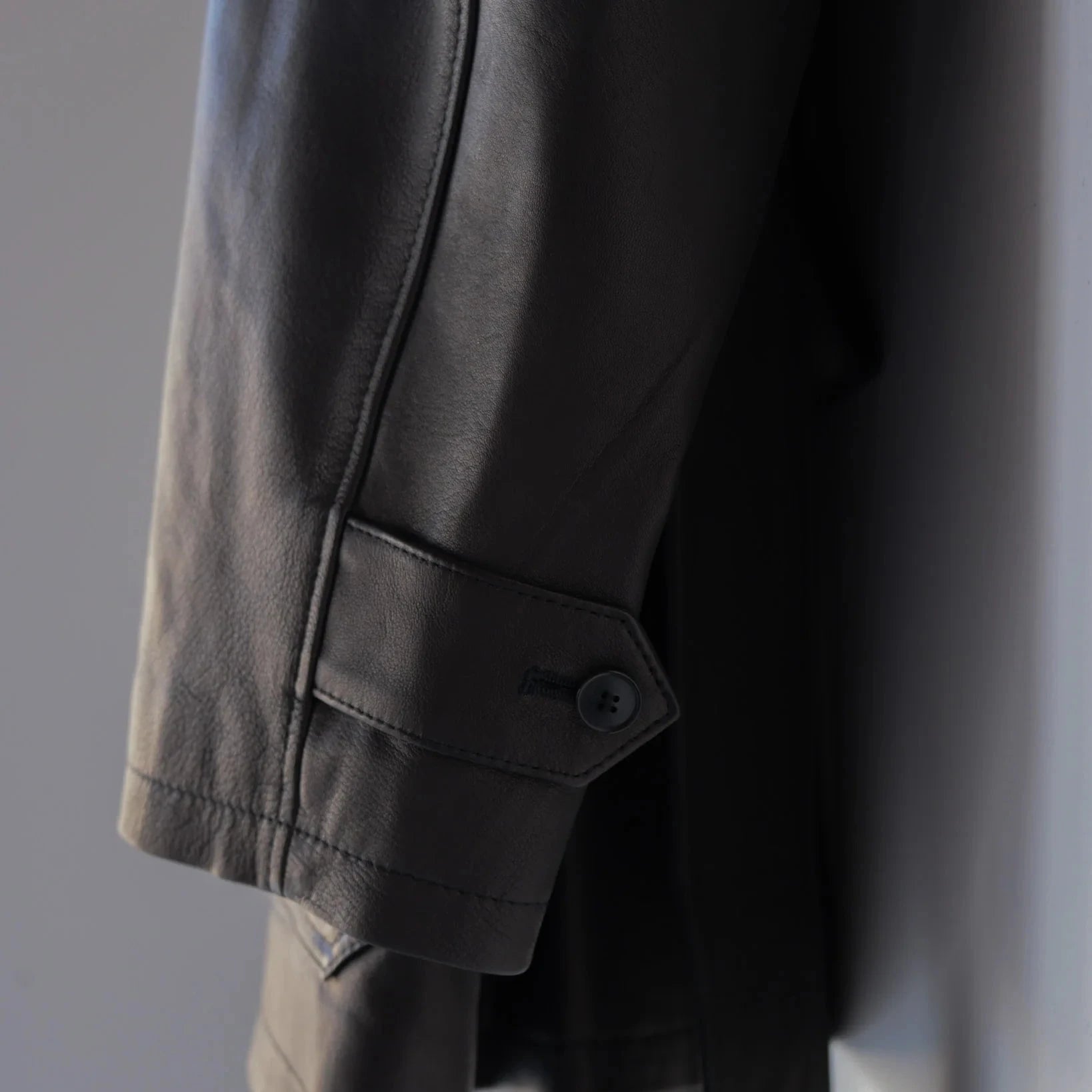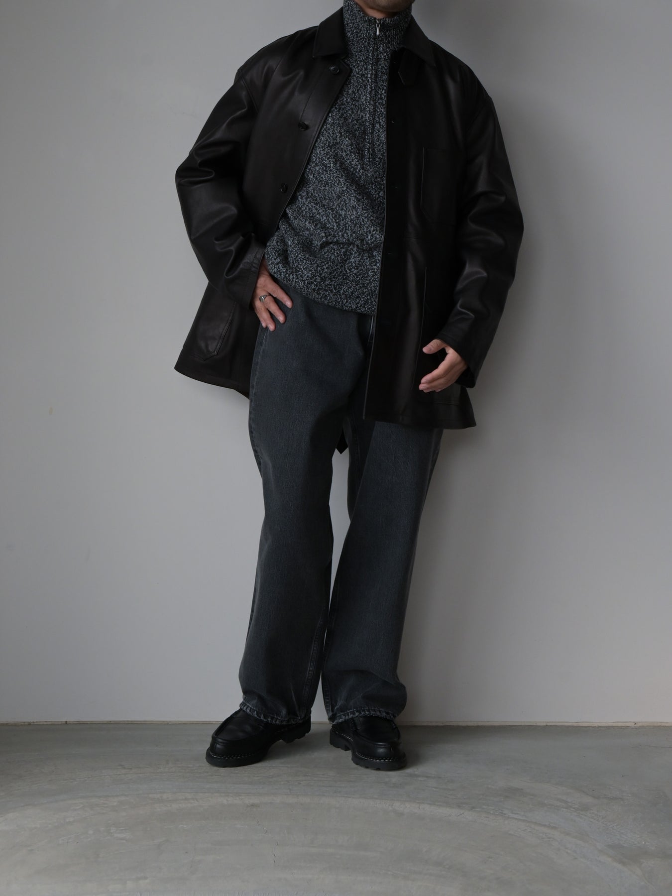 染料による染色で色付けで赤みのブラックを表現。表面に顔料を使用しない、天然革本来のシボ感とエイジングを楽しめる革で絹ヅレのような音が特徴の皮です。カバーオールのベルトを付けたデザインで、ハーフコートの様な着方が出来るとても軽いアウターです。