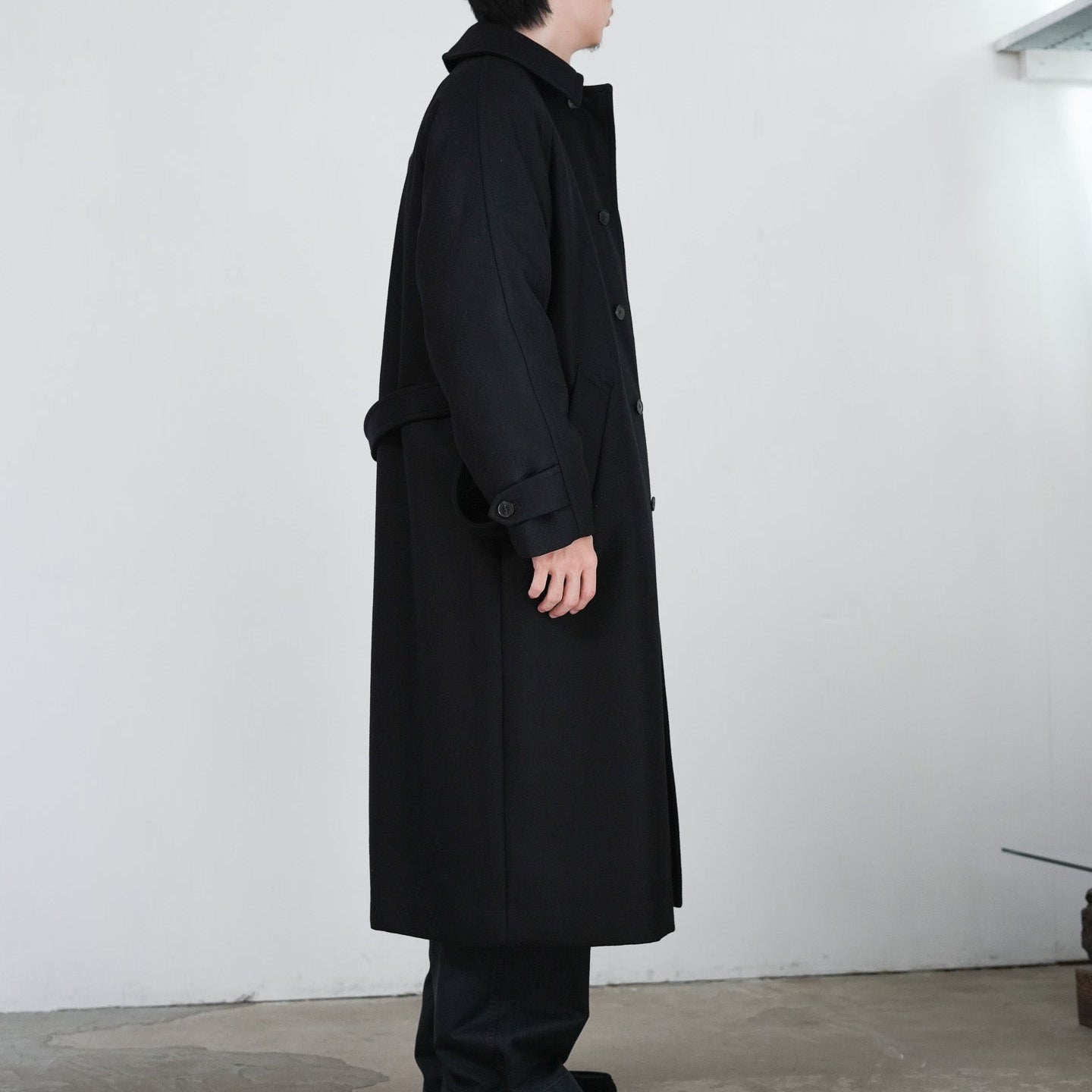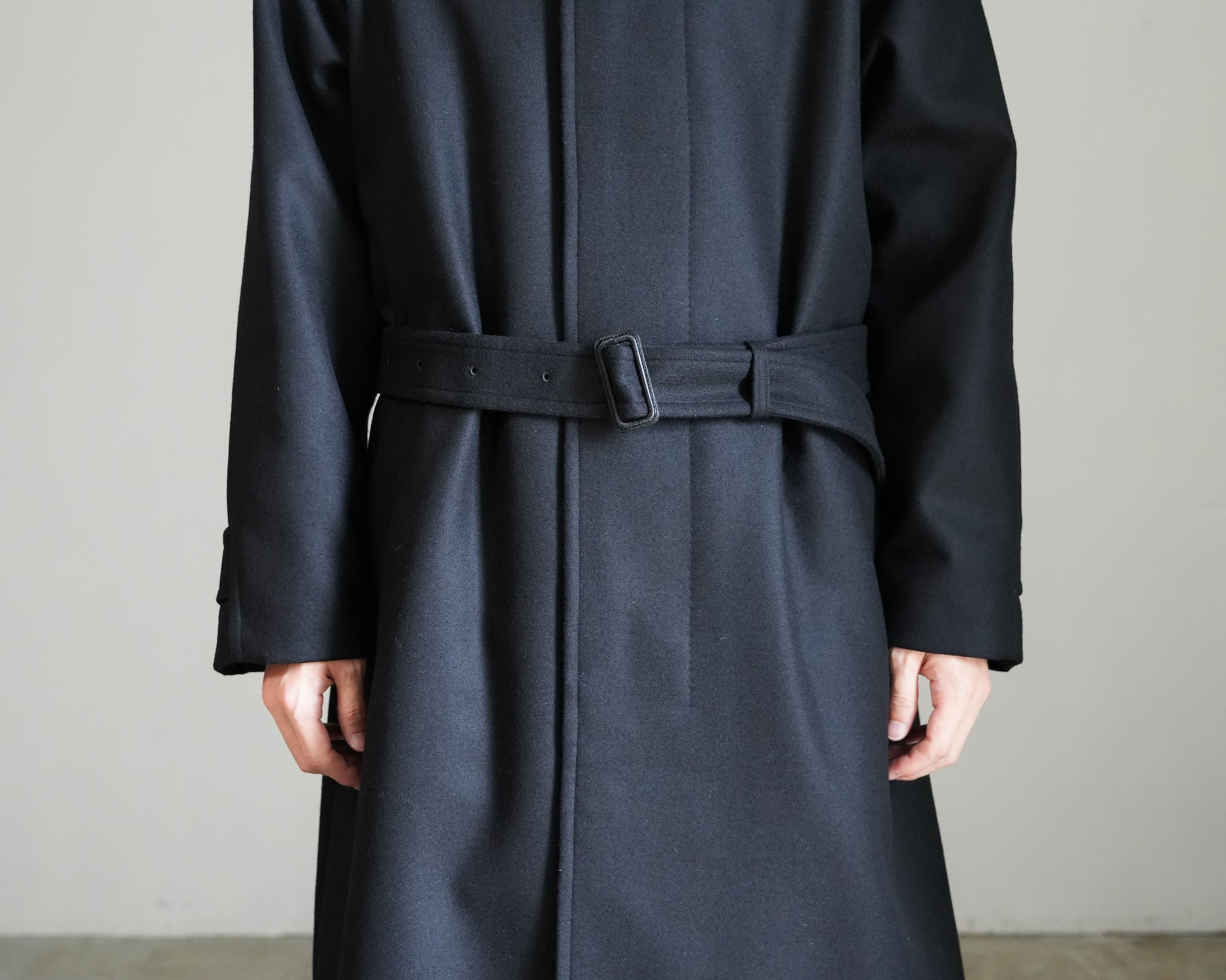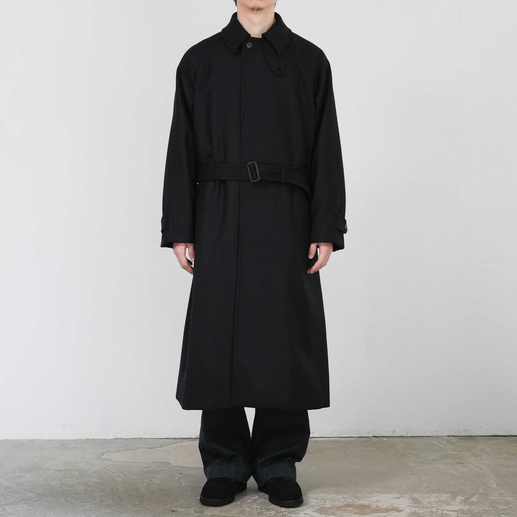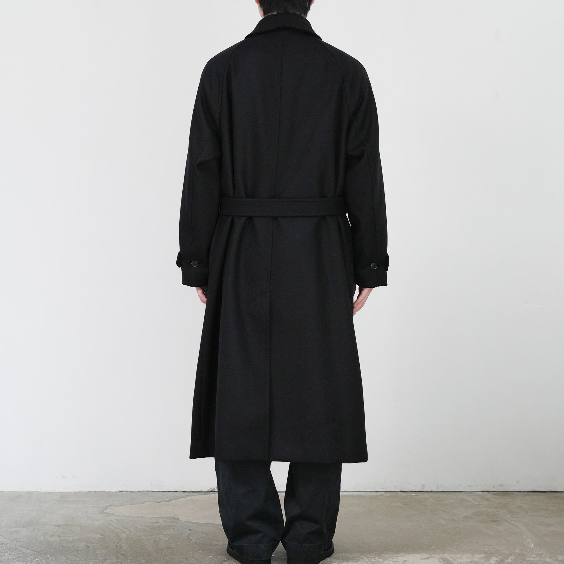 SUPER100'S原料を使い高密度に織り上げた梳毛ダブルクロスです。厚みを抑え高密度に織り、抗ピリング加工を行っています。チンタブ付きのゆったりしたロングコートです。