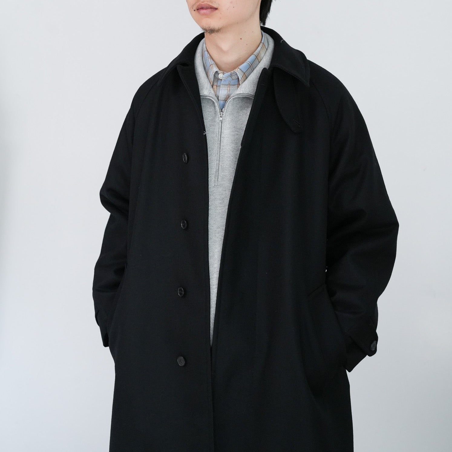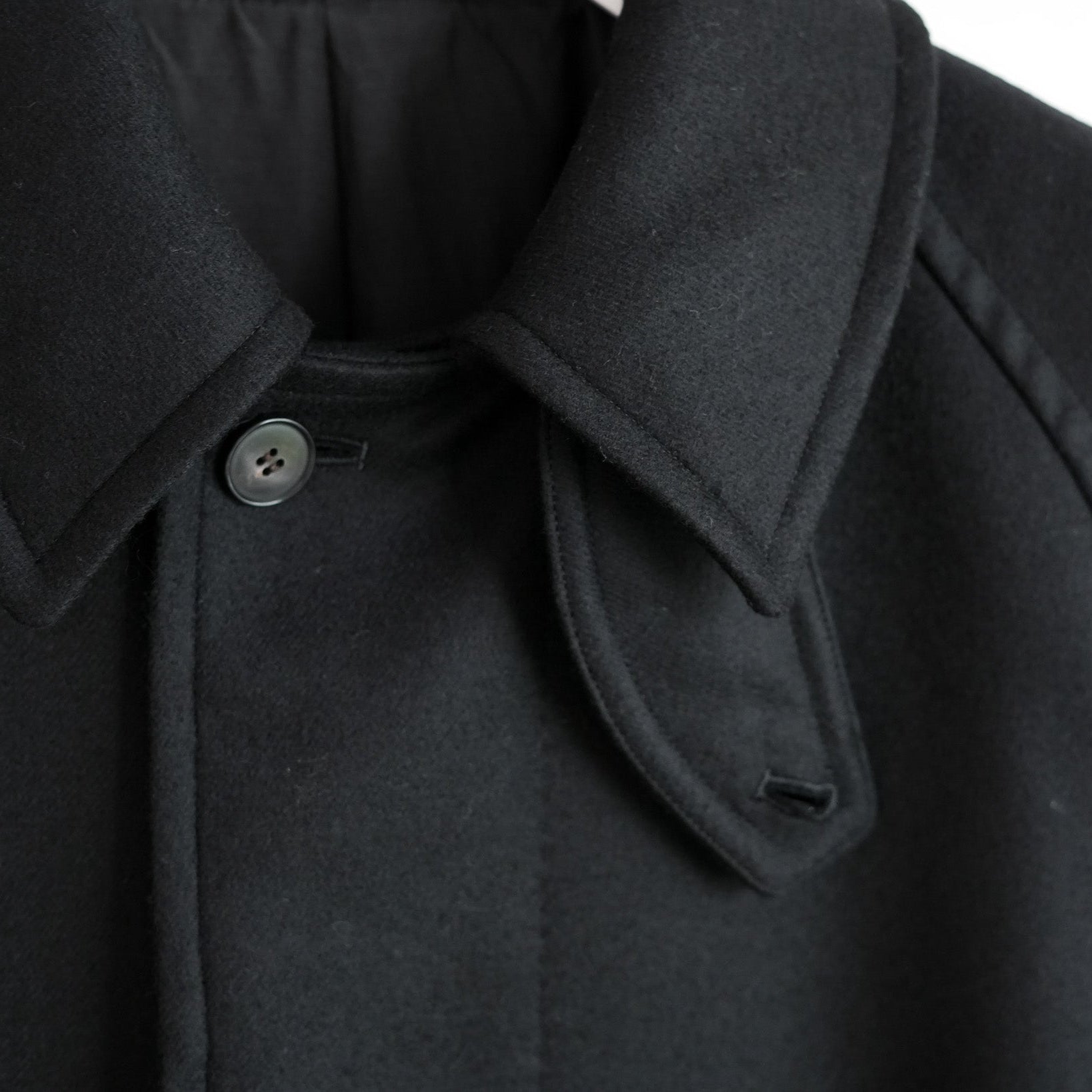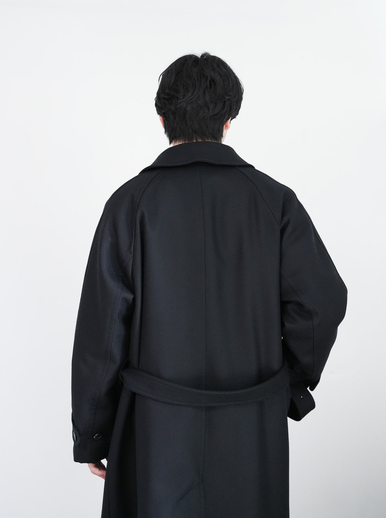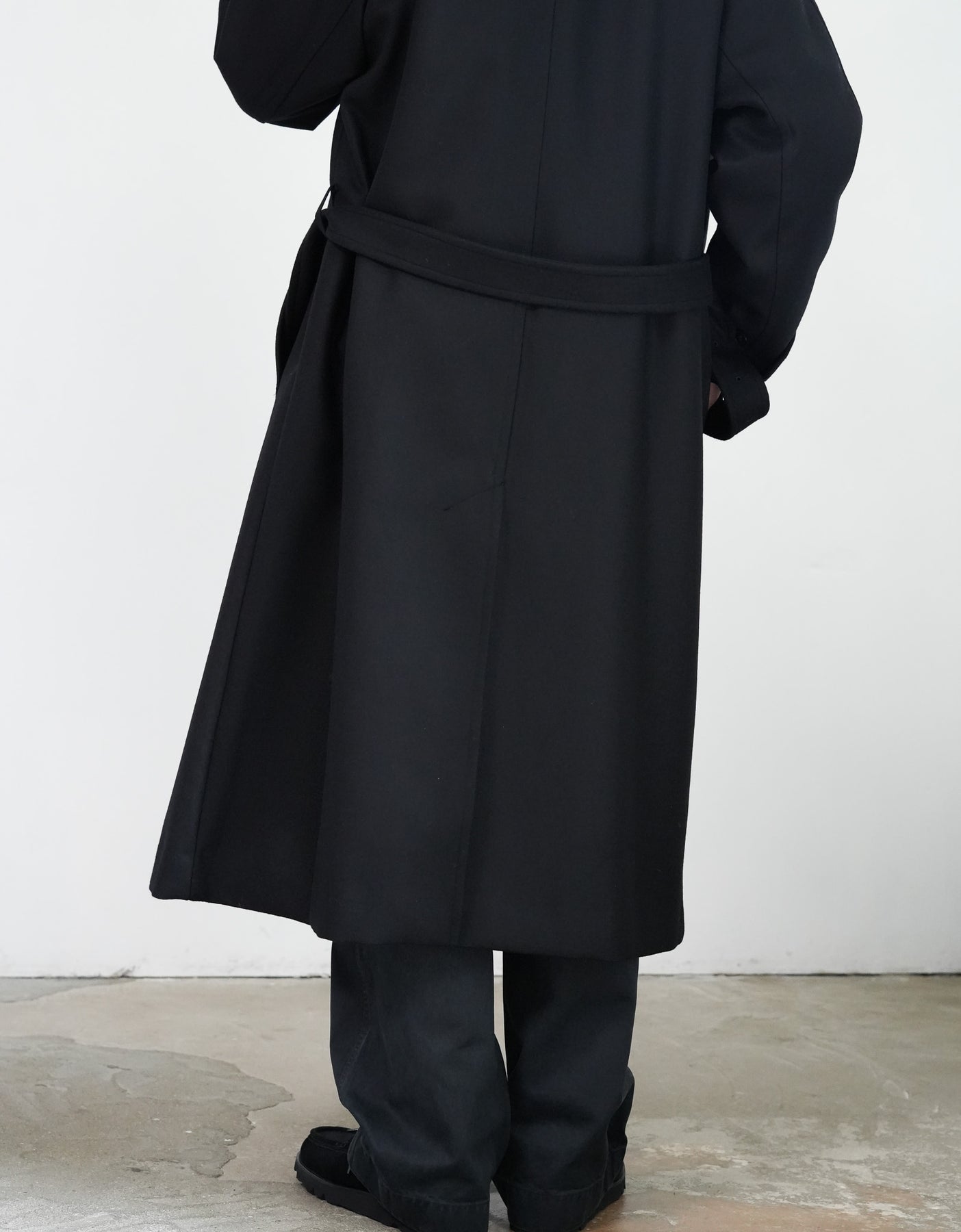 SUPER100'S原料を使い高密度に織り上げた梳毛ダブルクロスです。厚みを抑え高密度に織り、抗ピリング加工を行っています。チンタブ付きのゆったりしたロングコートです。